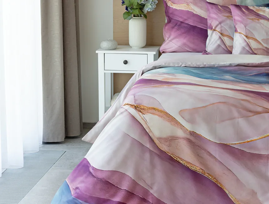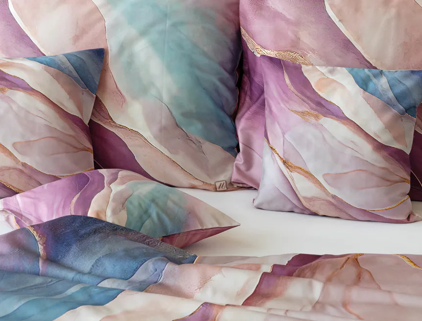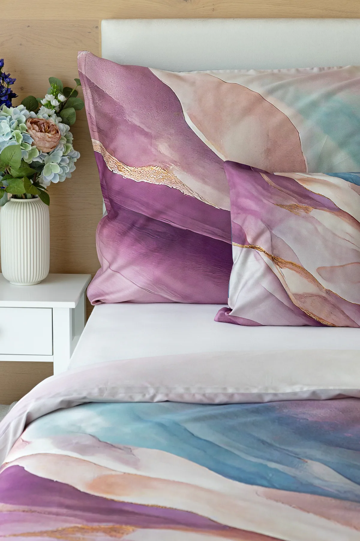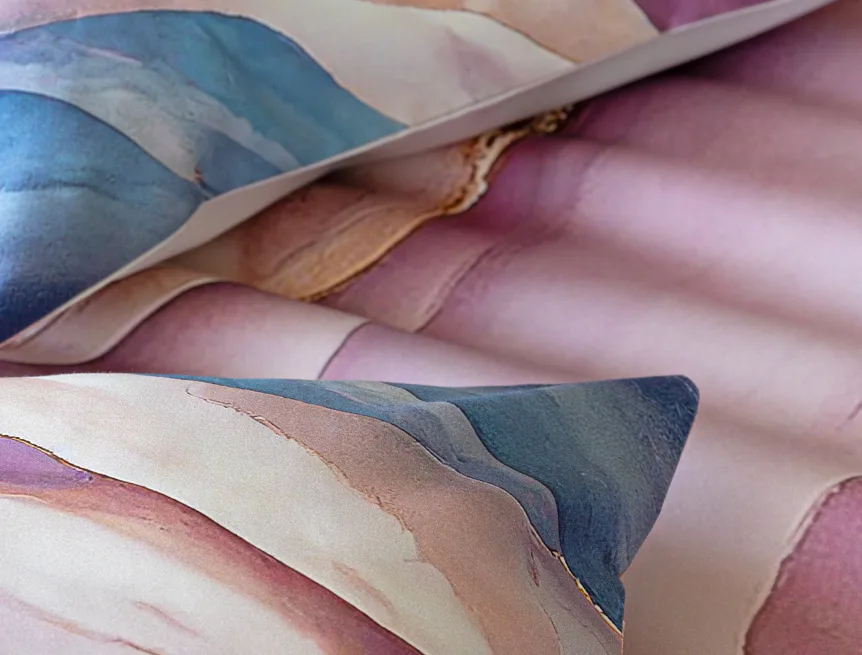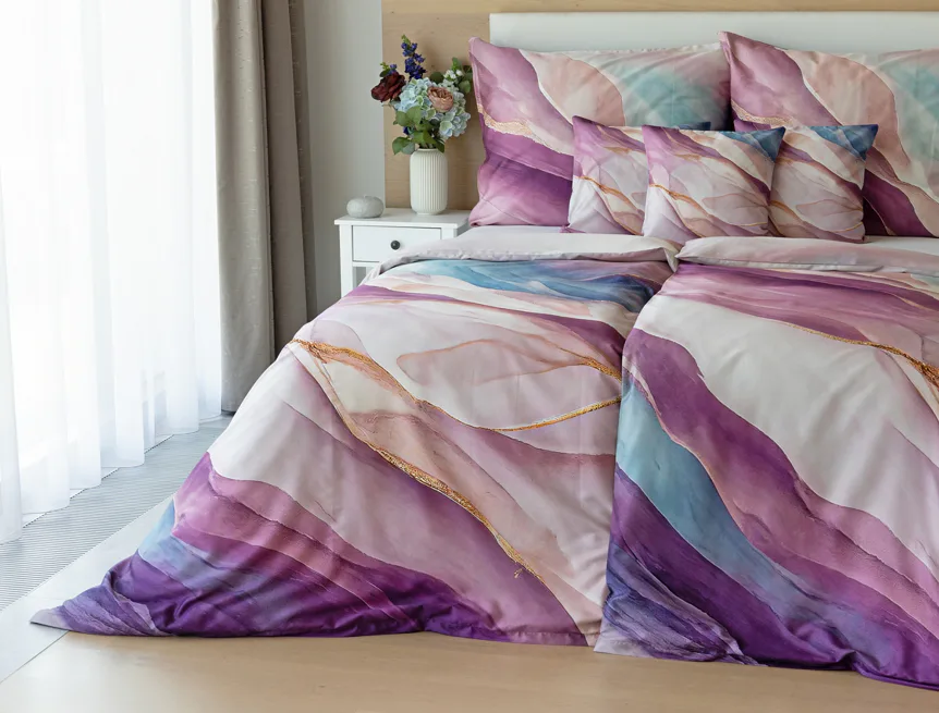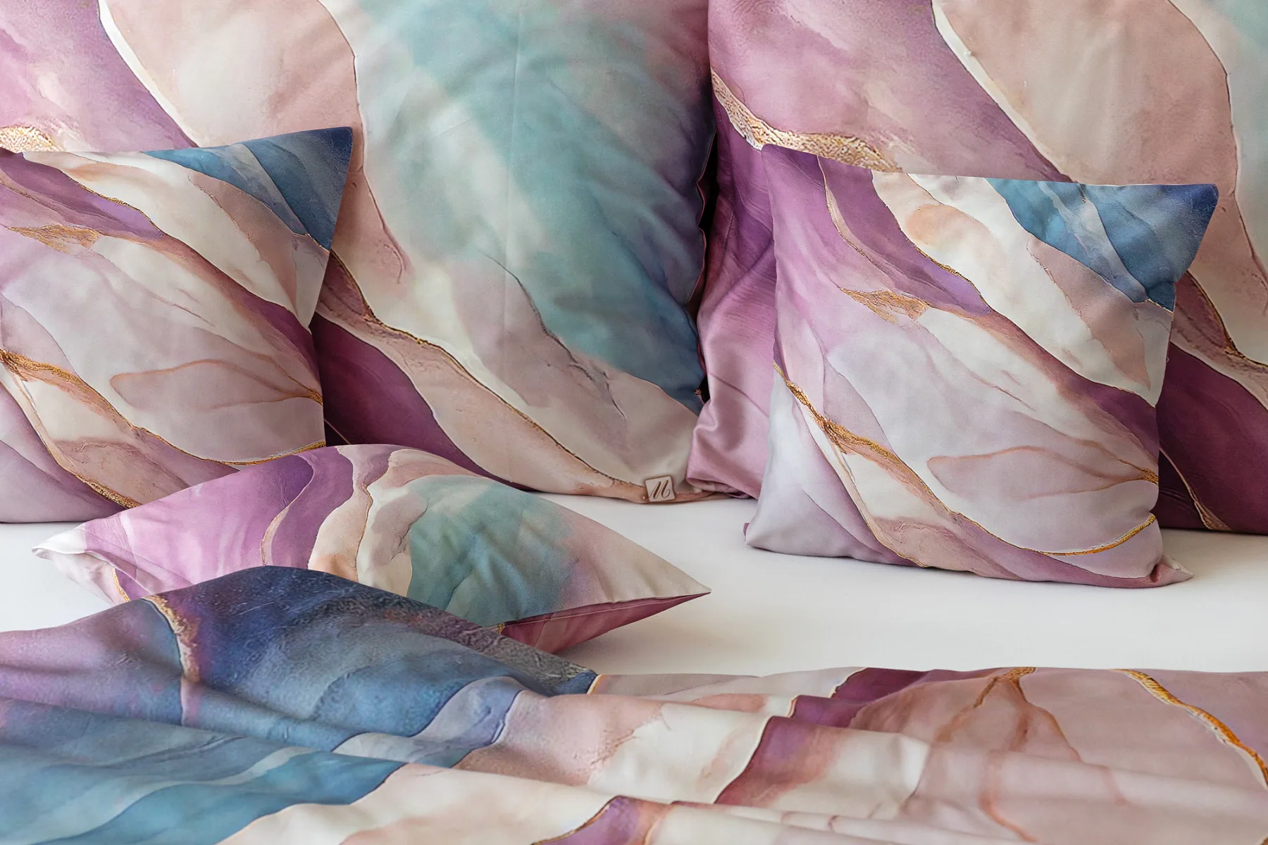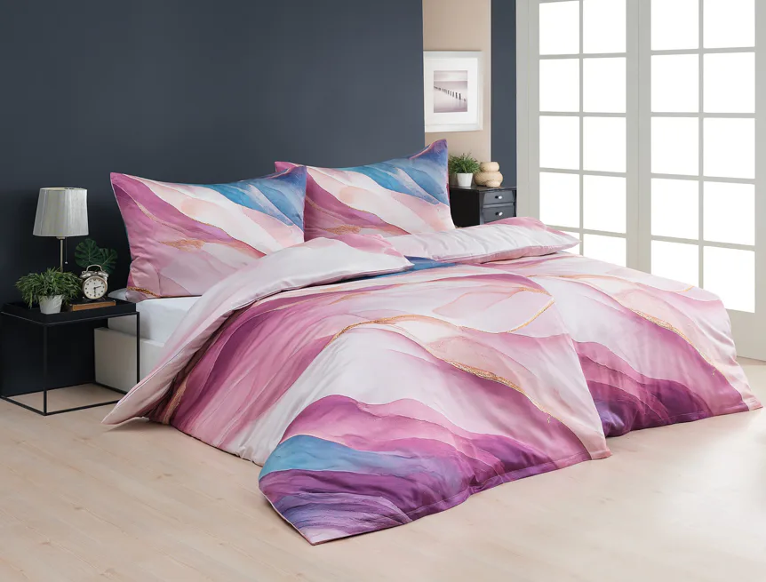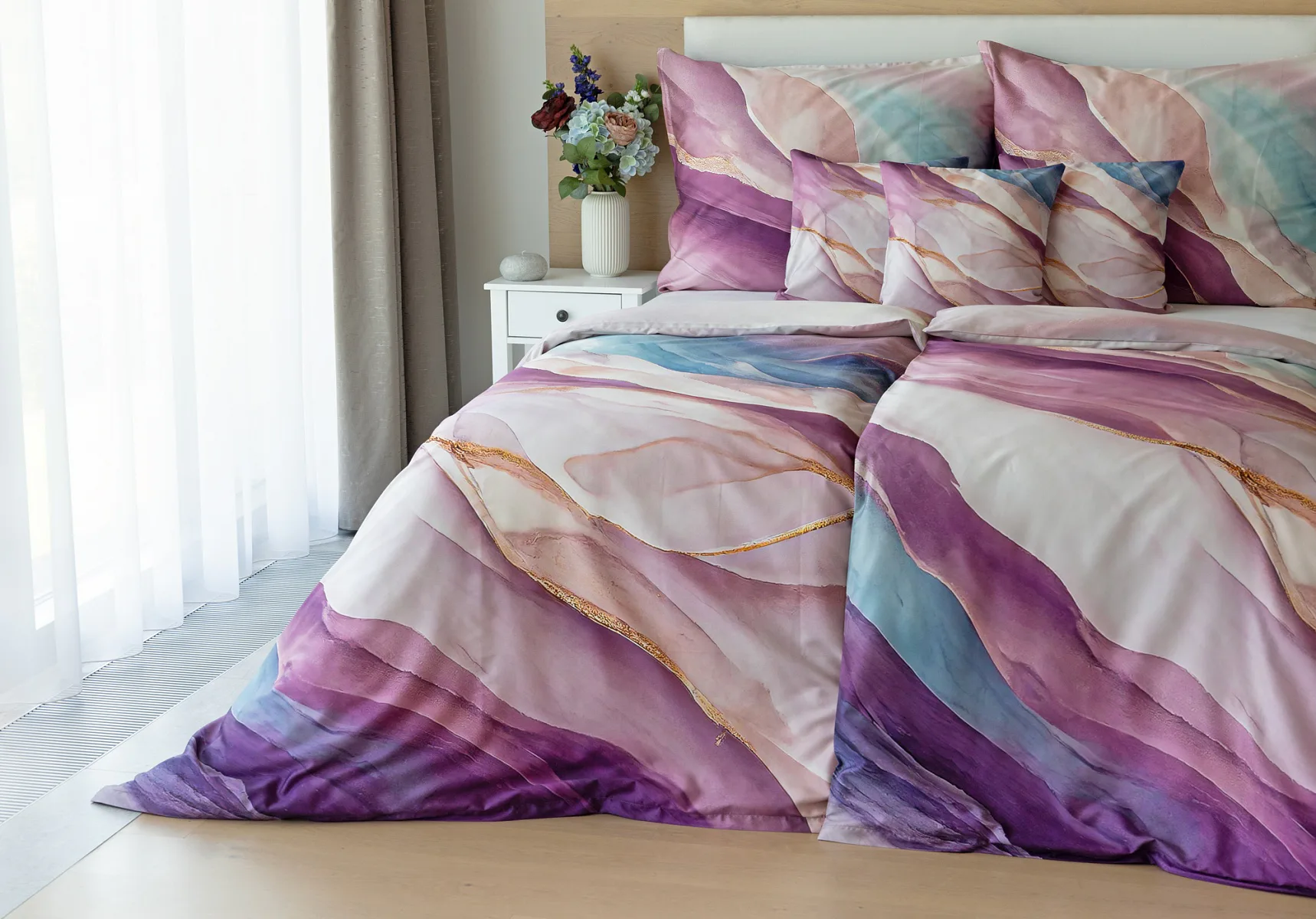 Saténové povlečení Dionna si vás získá na první pohled. Vychutnejte si dokonalé souznění pudrových, růžových, fialových a modrých tónů v tomto extravagantním vzoru. O váš pohodlný spánek se postará...