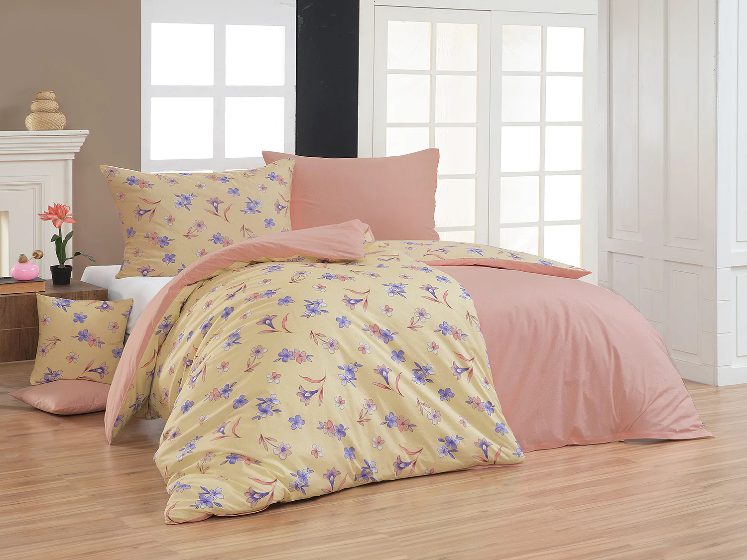 Bavlněné ložní povlečení Elia vnese do vaší ložnice svěžest a pozitivní atmosféru. Jemné kvítky v paletě fialových a růžových tónů na žlutém podkladu zdobí vrchní stranu povlečení. Spodní strana nabízí příjemný kontrast v podobě drobných bílých puntíků na růžovém podkladu.