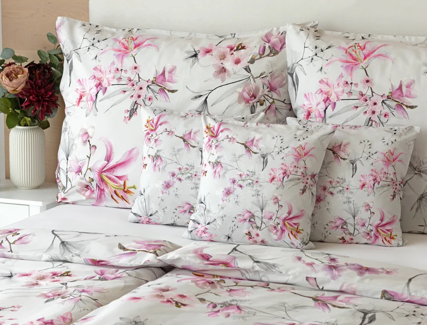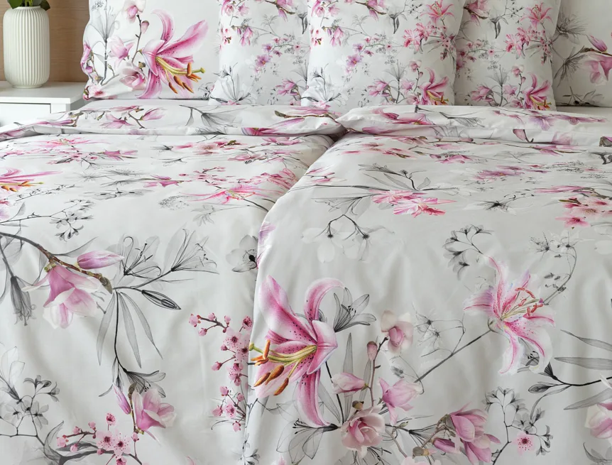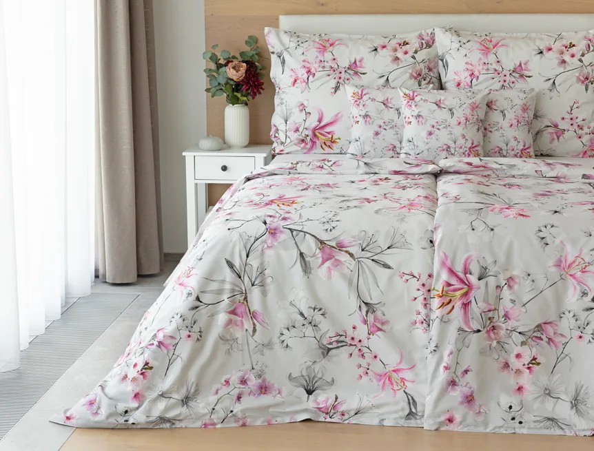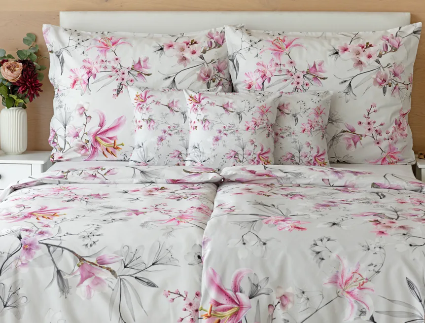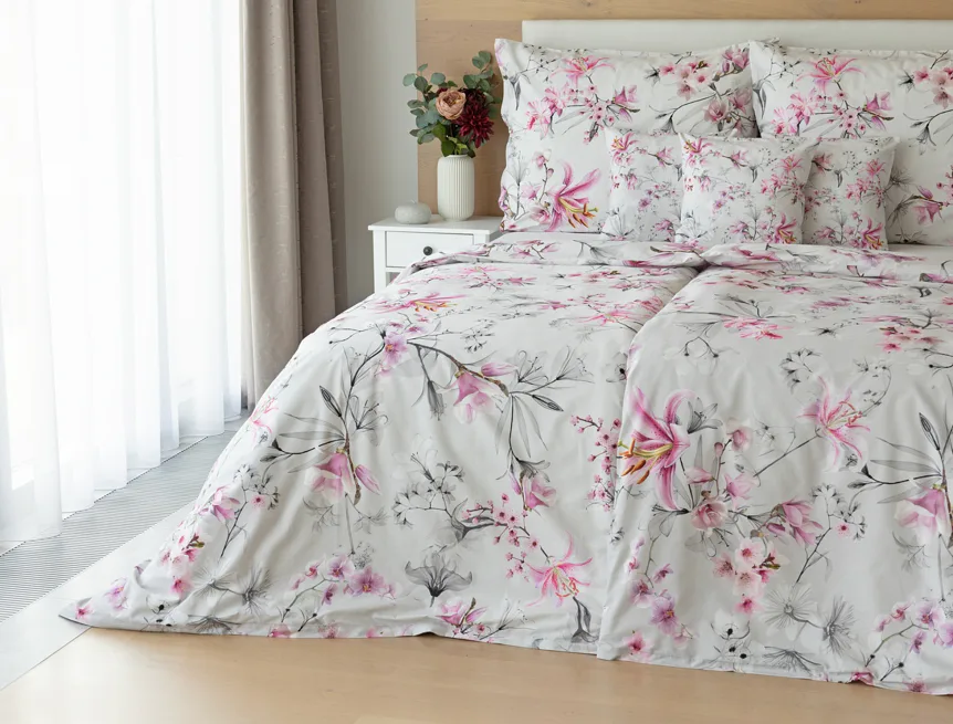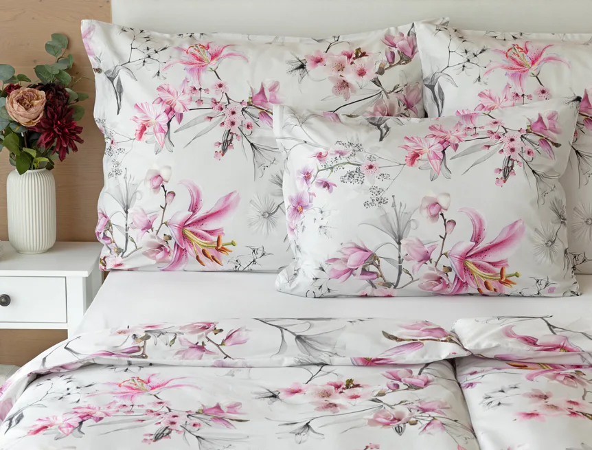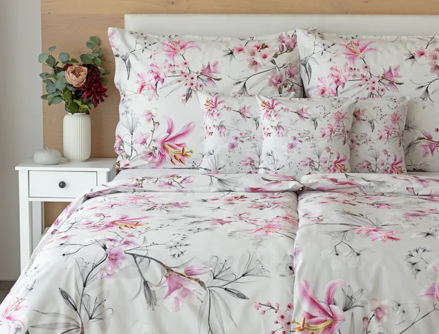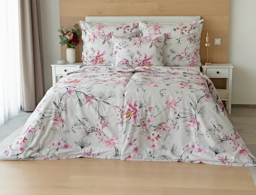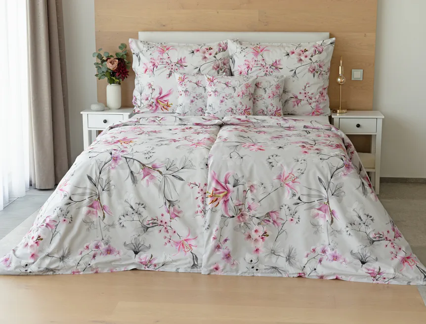 Obklopte se jemností a elegancí s bavlněným povlečením Elisse. Okouzlující vzor kombinuje květy exotických orchidejí a něžných lilií v růžovofialových tónech na světle šedém podkladu. Povlečení je vyrobeno ze 100% prvotřídní bavlny a přináší nejen estetickou hodnotu, ale i výjimečný komfort.