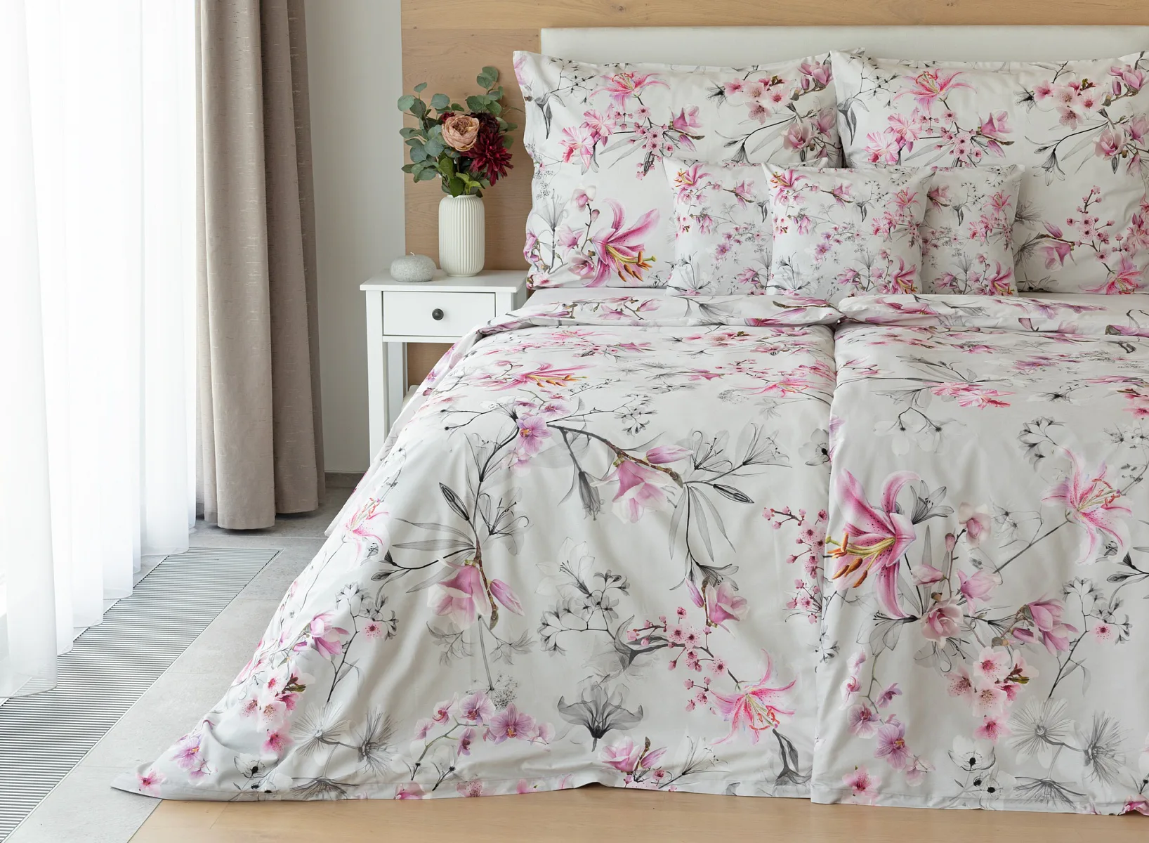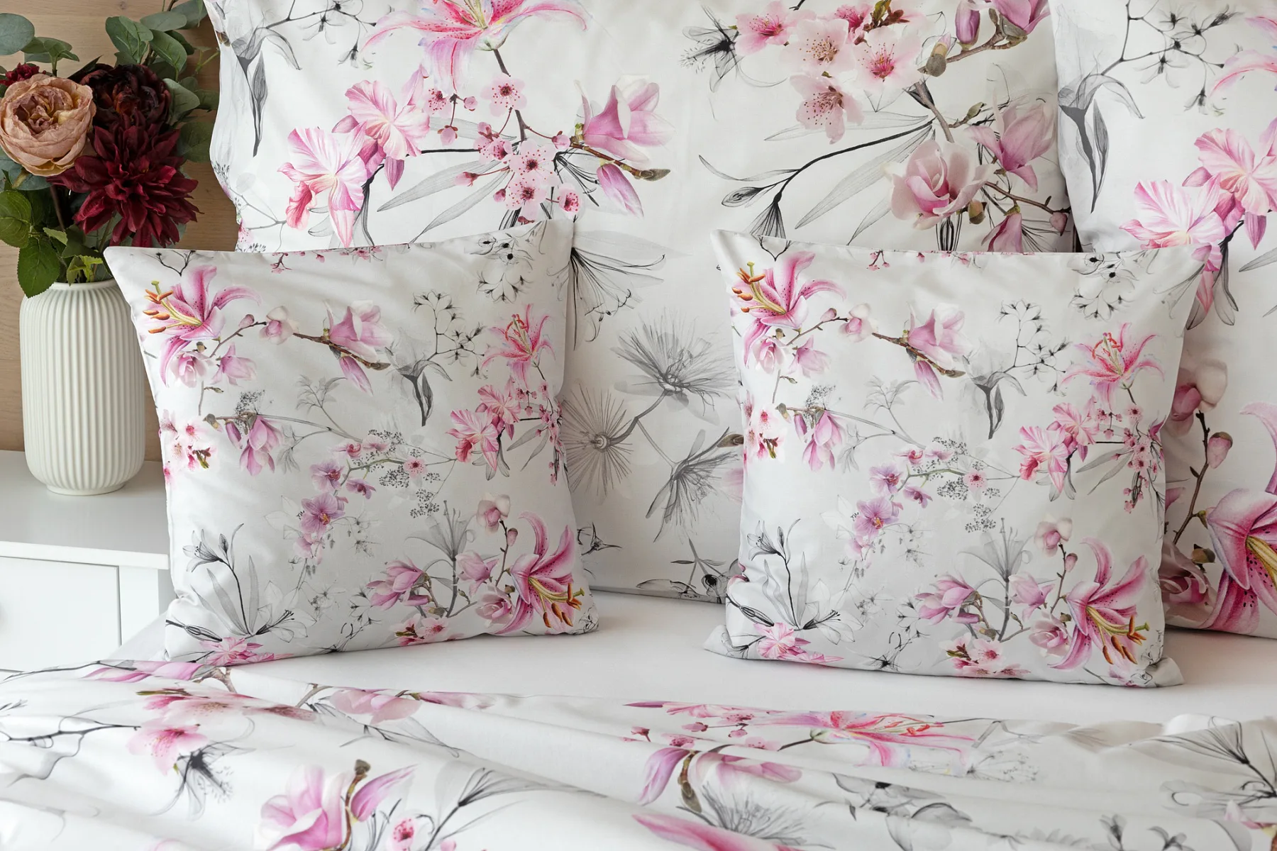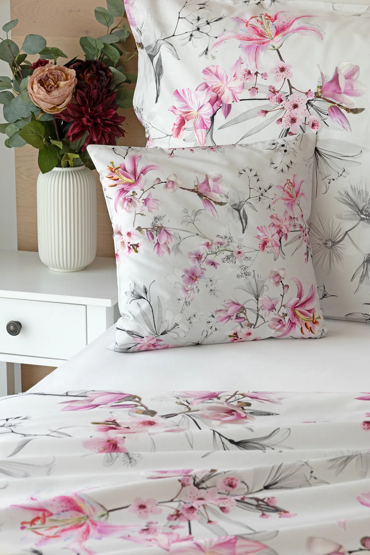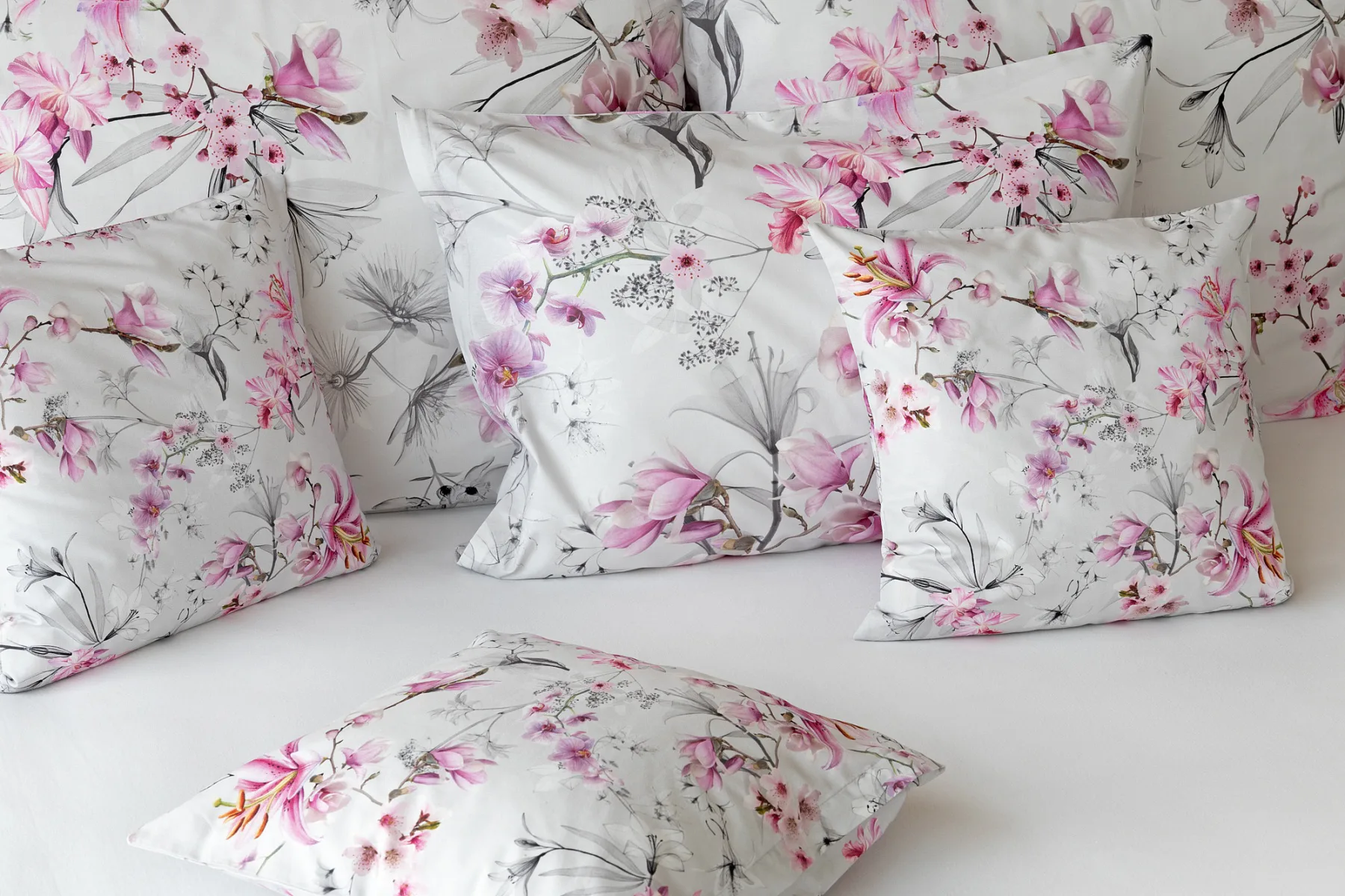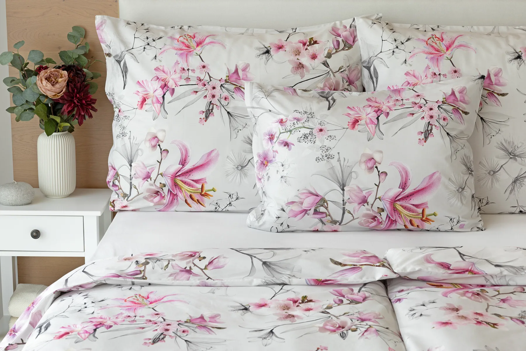 Obklopte se jemností a elegancí s bavlněným povlečením Elisse. Okouzlující vzor kombinuje květy exotických orchidejí a něžných lilií v růžovofialových tónech na světle šedém podkladu. Povlečení je vyrobeno ze 100% prvotřídní bavlny a přináší nejen estetickou hodnotu, ale i výjimečný komfort.