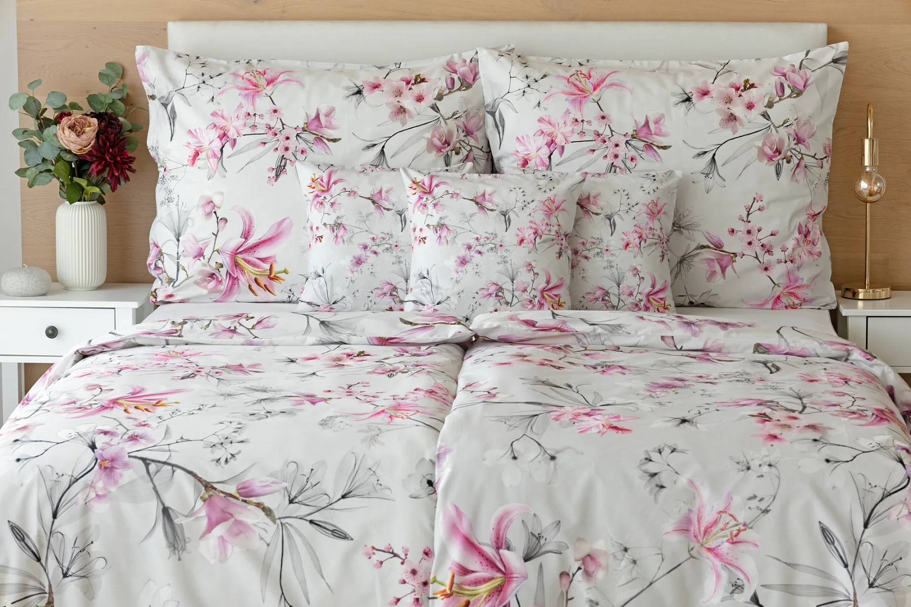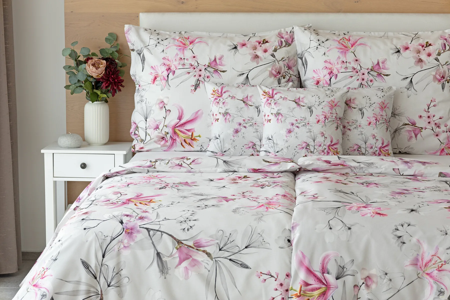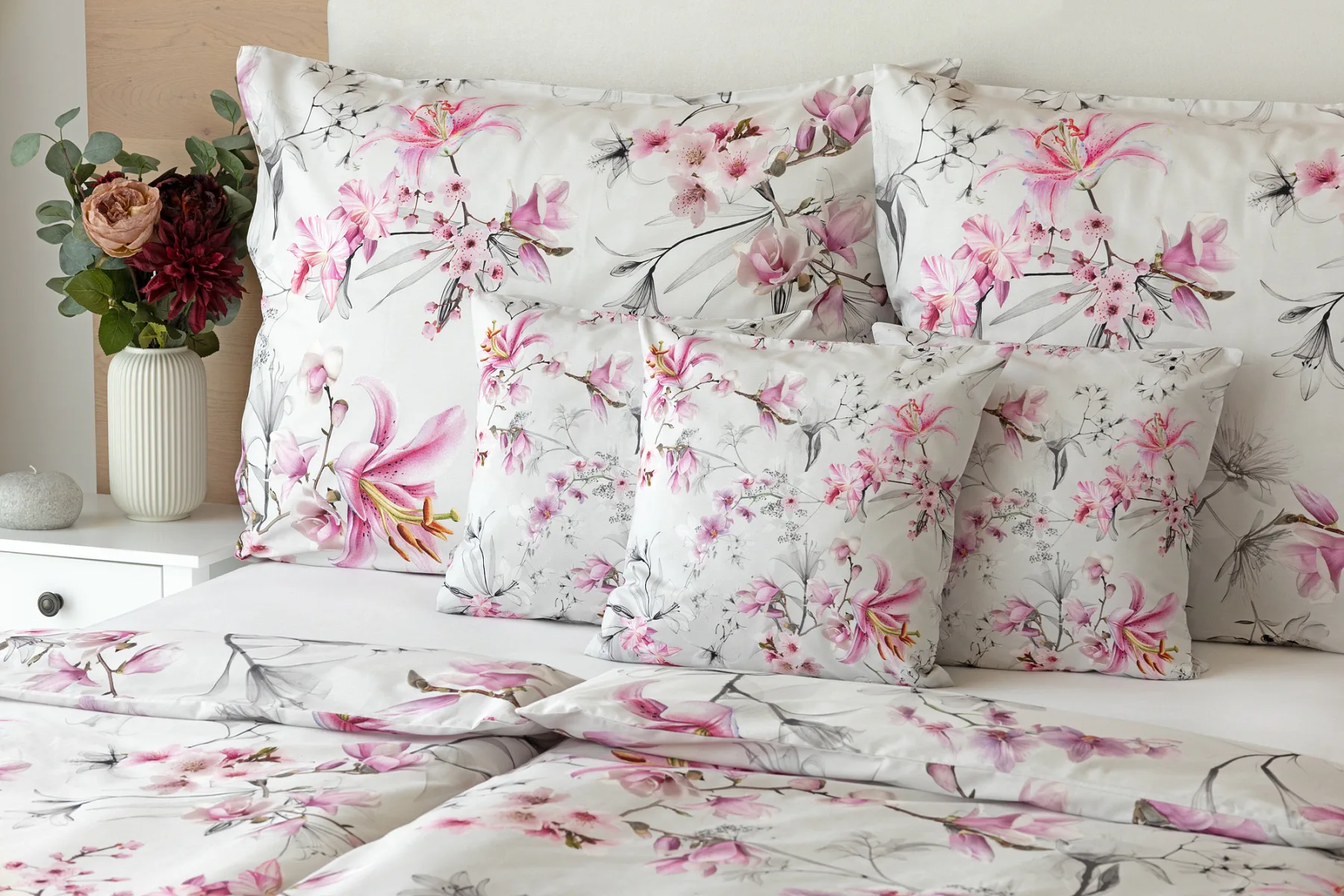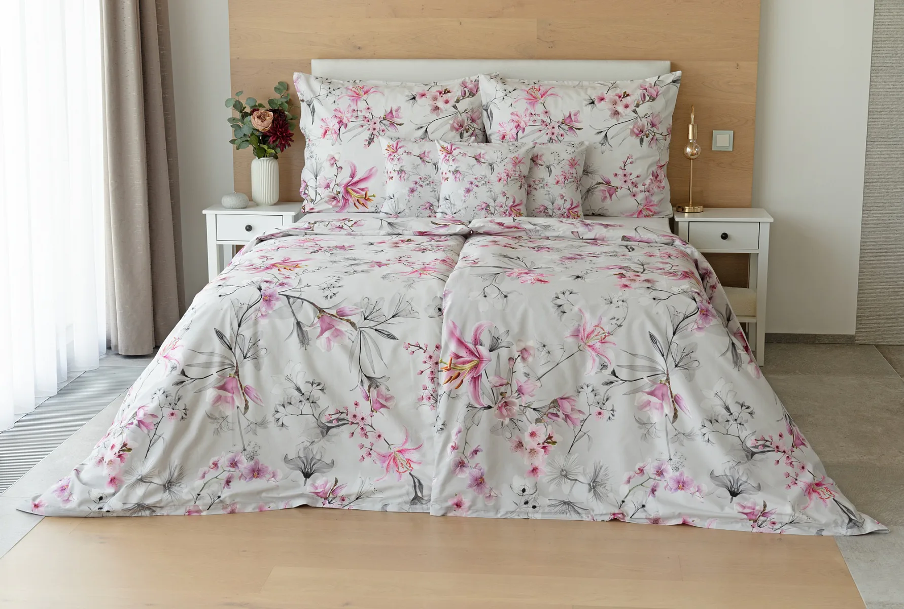 Obklopte se jemností a elegancí s bavlněným povlečením Elisse. Okouzlující vzor kombinuje květy exotických orchidejí a něžných lilií v růžovofialových tónech na světle šedém podkladu. Povlečení je vyrobeno ze 100% prvotřídní bavlny a přináší nejen estetickou hodnotu, ale i výjimečný komfort.