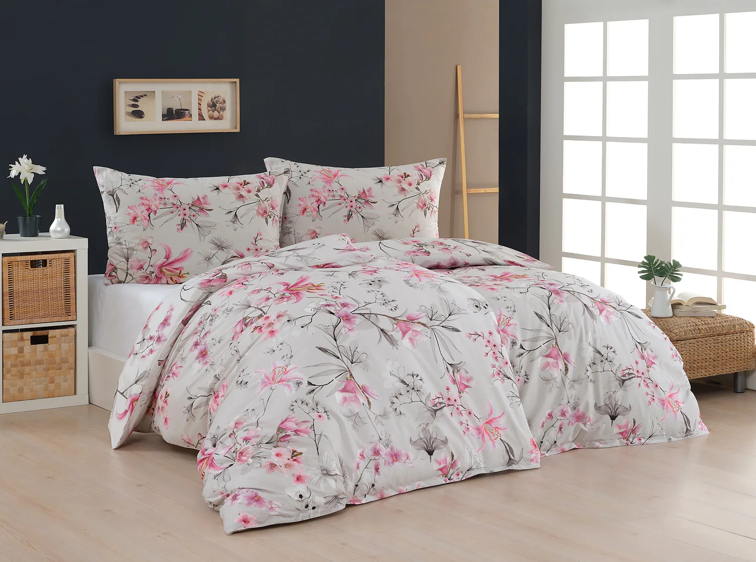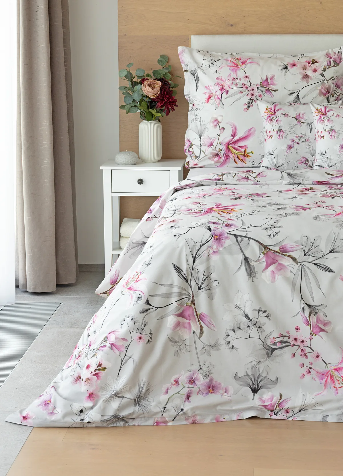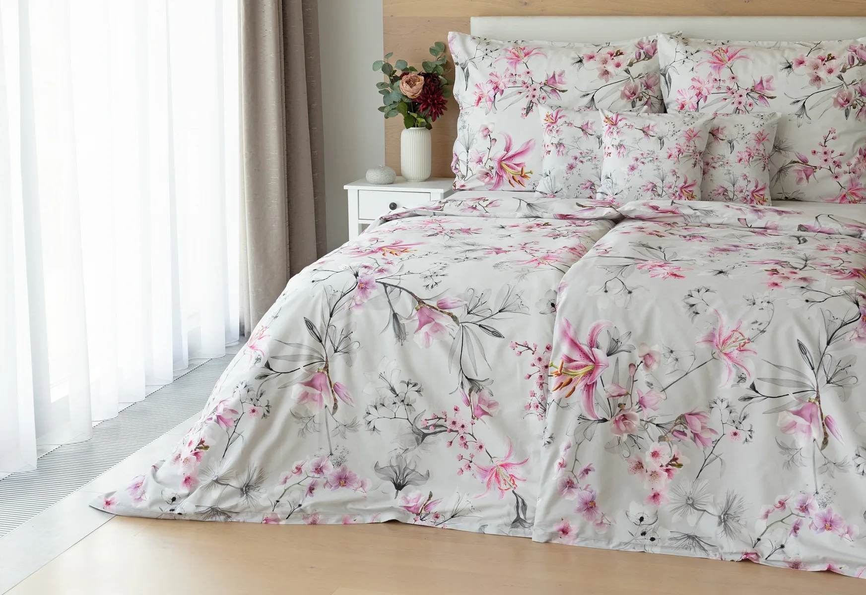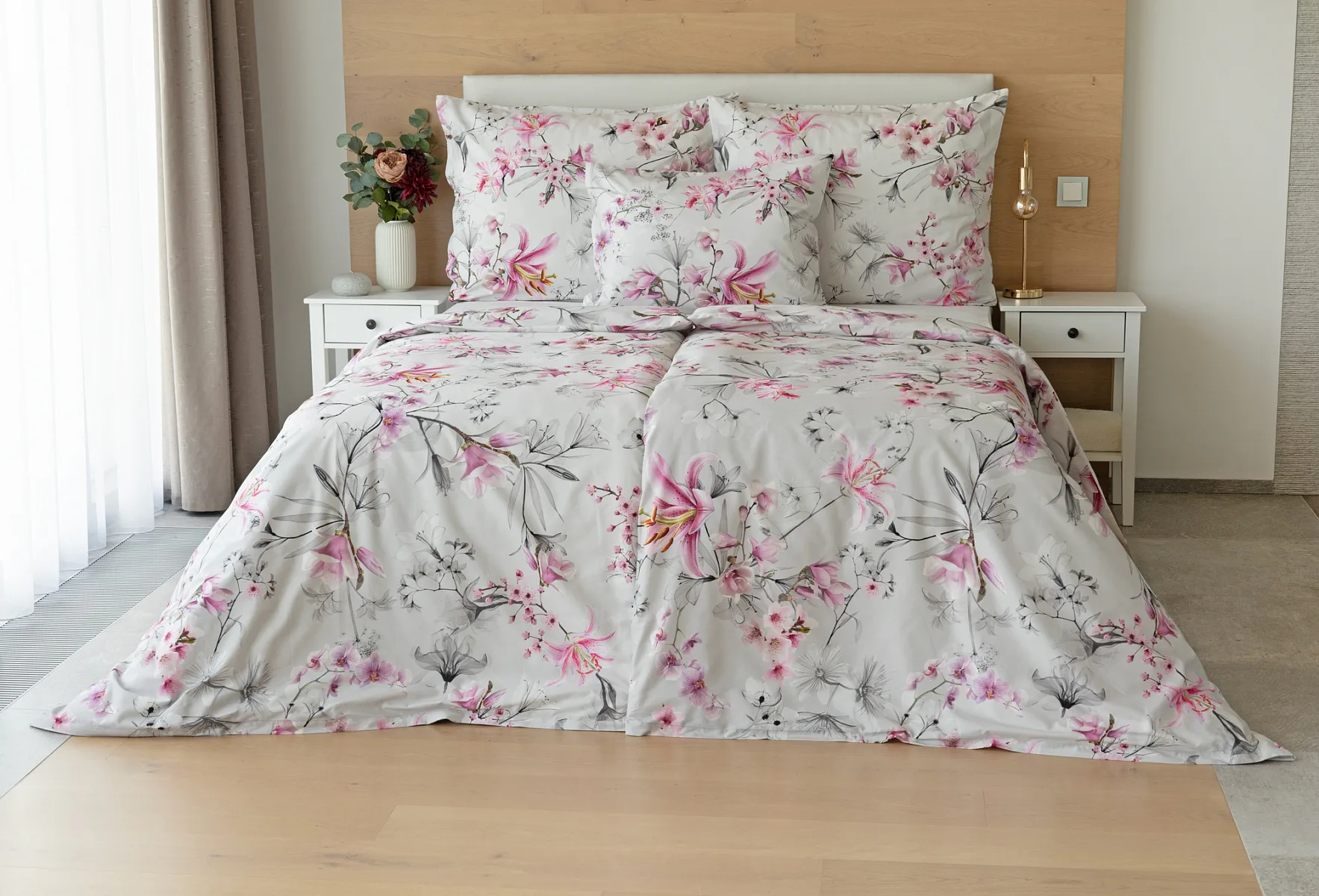 Obklopte se jemností a elegancí s bavlněným povlečením Elisse. Okouzlující vzor kombinuje květy exotických orchidejí a něžných lilií v růžovofialových tónech na světle šedém podkladu. Povlečení je vyrobeno ze 100% prvotřídní bavlny a přináší nejen estetickou hodnotu, ale i výjimečný komfort.