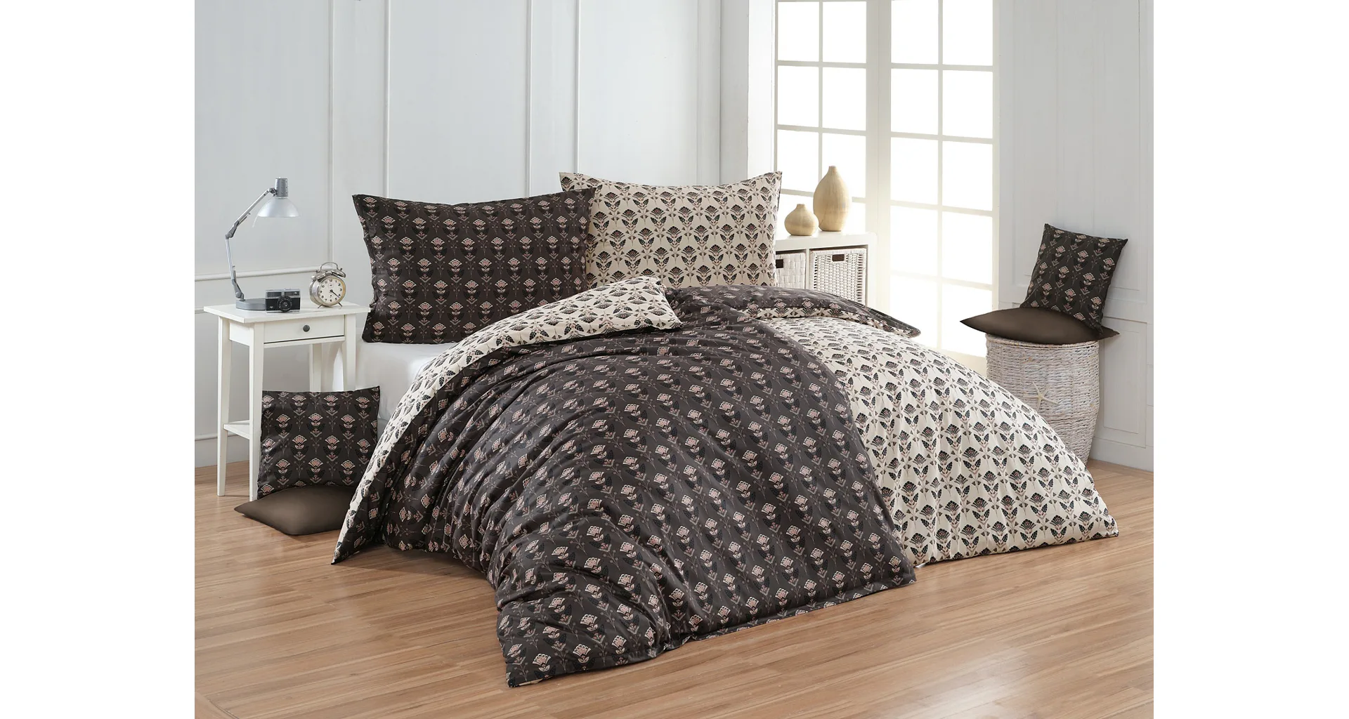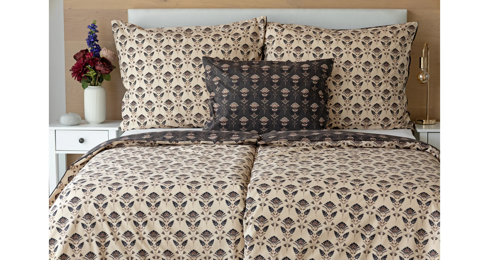 Nalaďte se na podzimní atmosféru s hřejivými barvami a vychutnejte si hravé stlaní s ložním povlečením Ellinor. Oblíbené oboustranné provedení vám umožní experimentovat a vaše ložice může být každý den originální. Elegantní vějířový vzor vyniká z jedné strany na béžovém podkladu, zadní strana je laděná do tlumeného tmavě hnědého tónu.