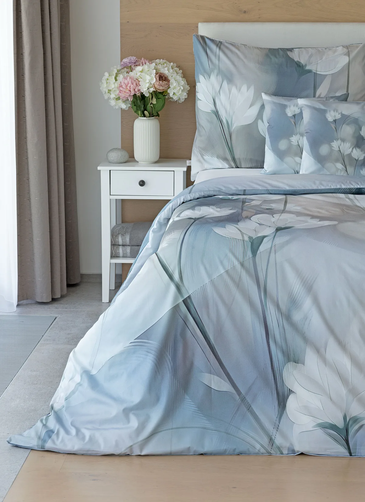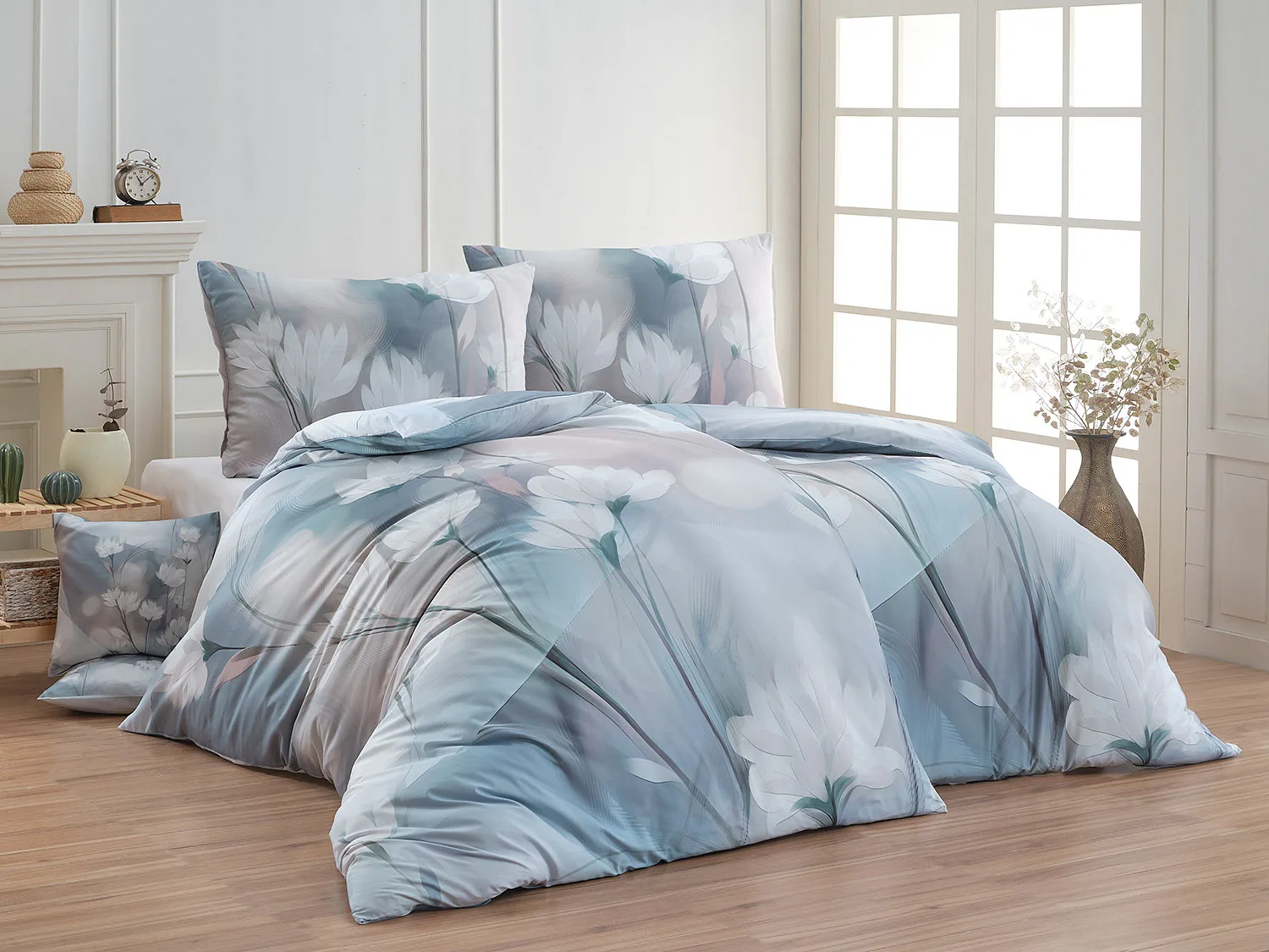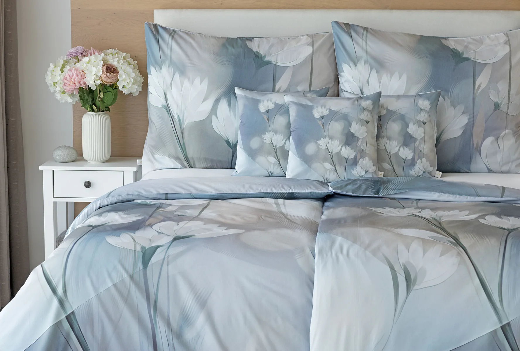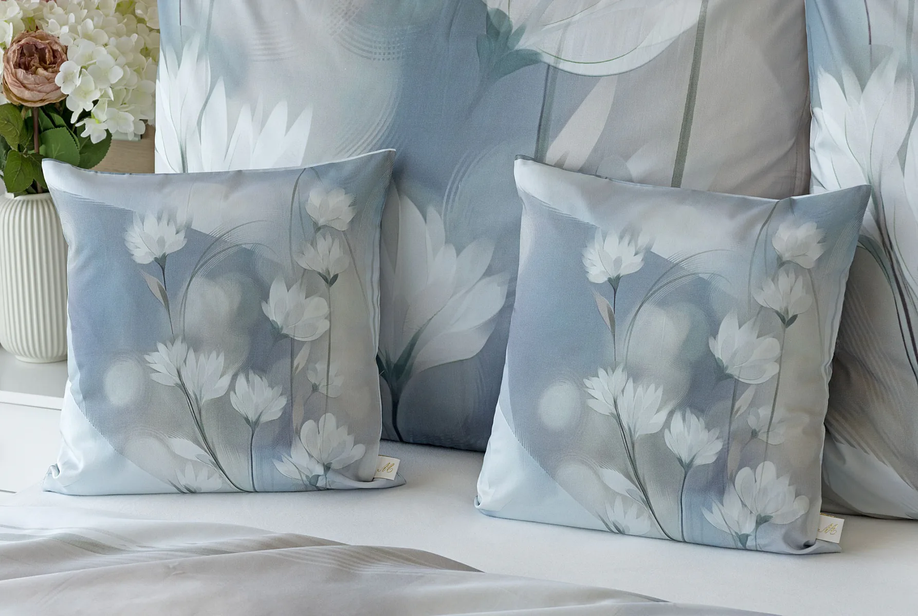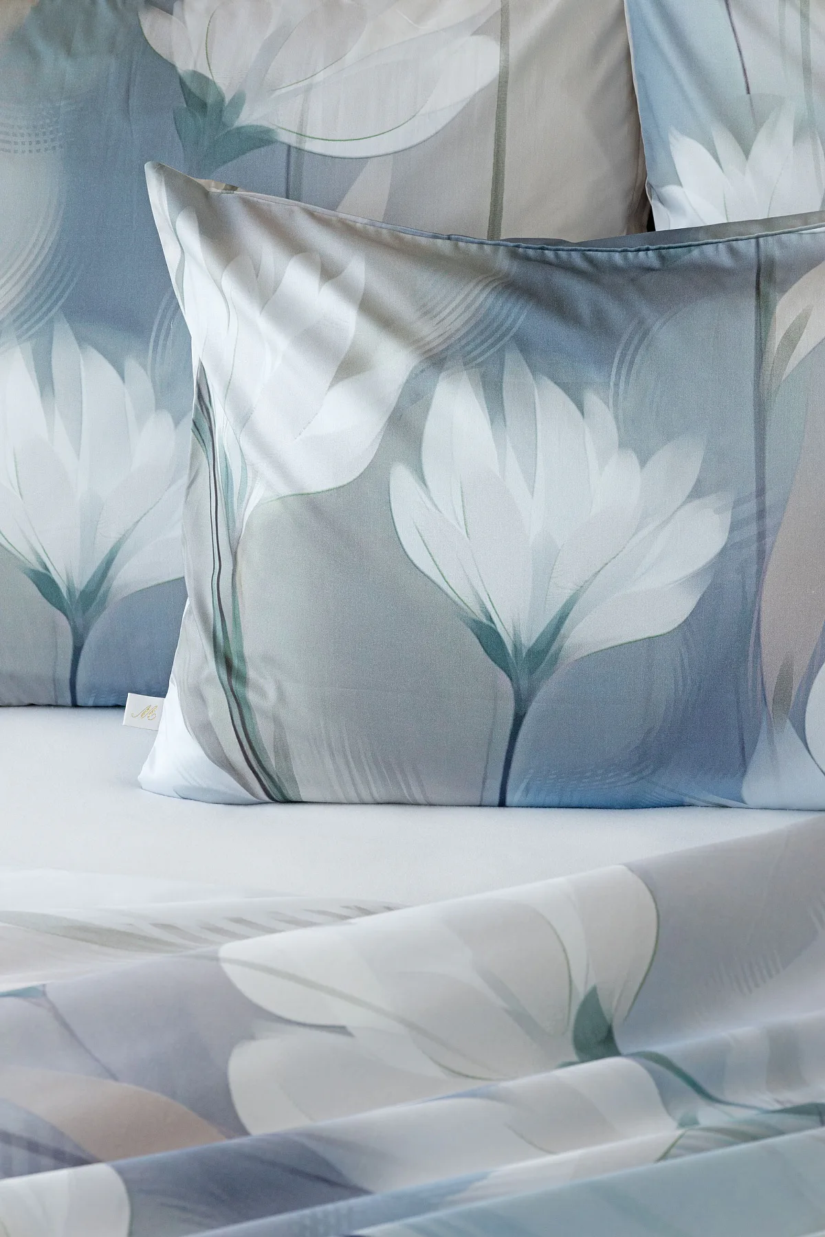 Vzoru Eloise dominuje atraktivní florální motiv v paletě modrých a tlumených pudrových tónů. Povlak na polštář i na přikrývku je z obou stran stejný, vrchní stranu povlaku na polštář zdobí malé logo "M" v pravém dolním rohu. Povlečení je opatřeno komfortním zipovým uzávěrem.