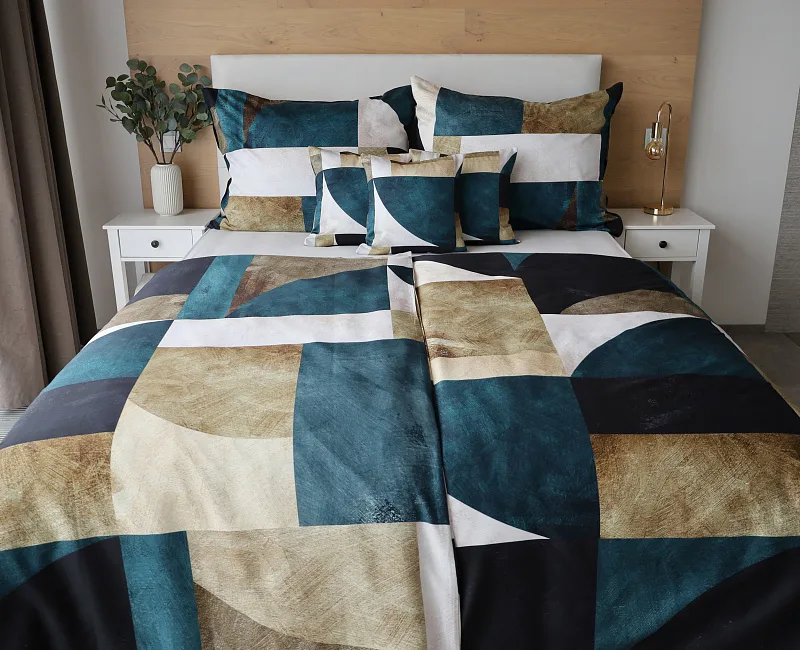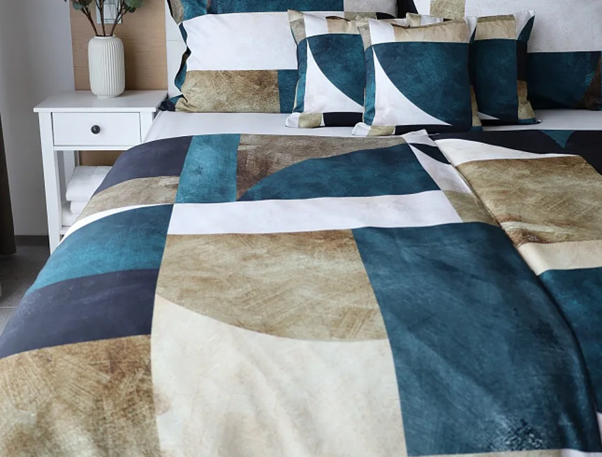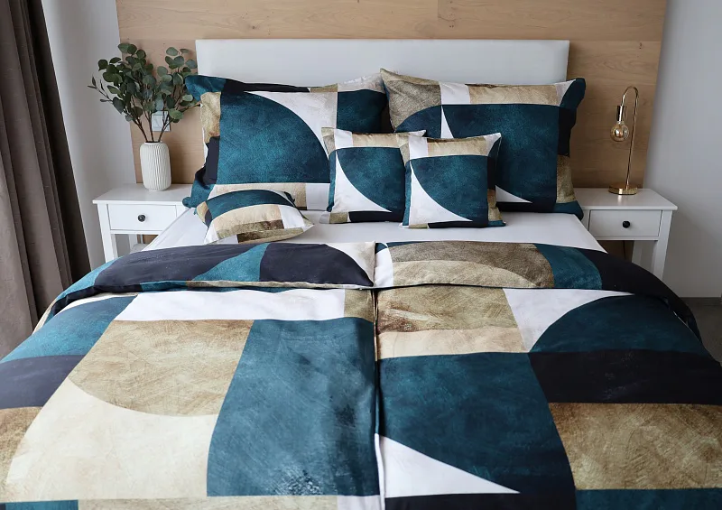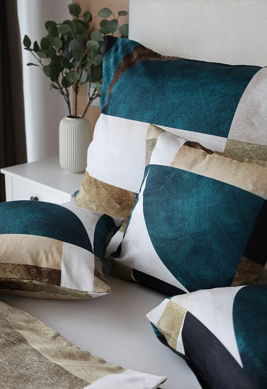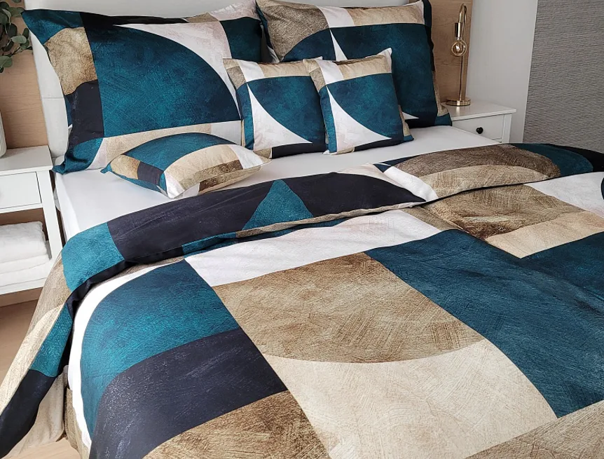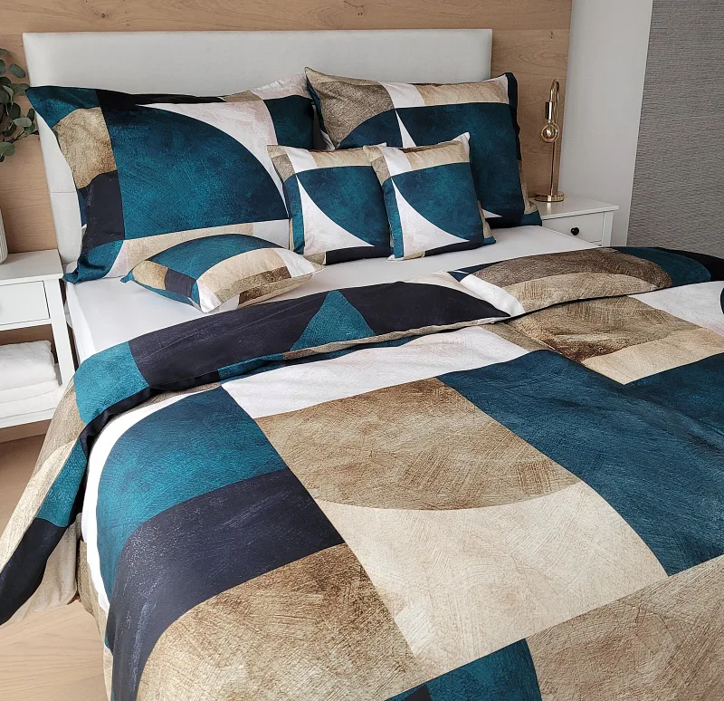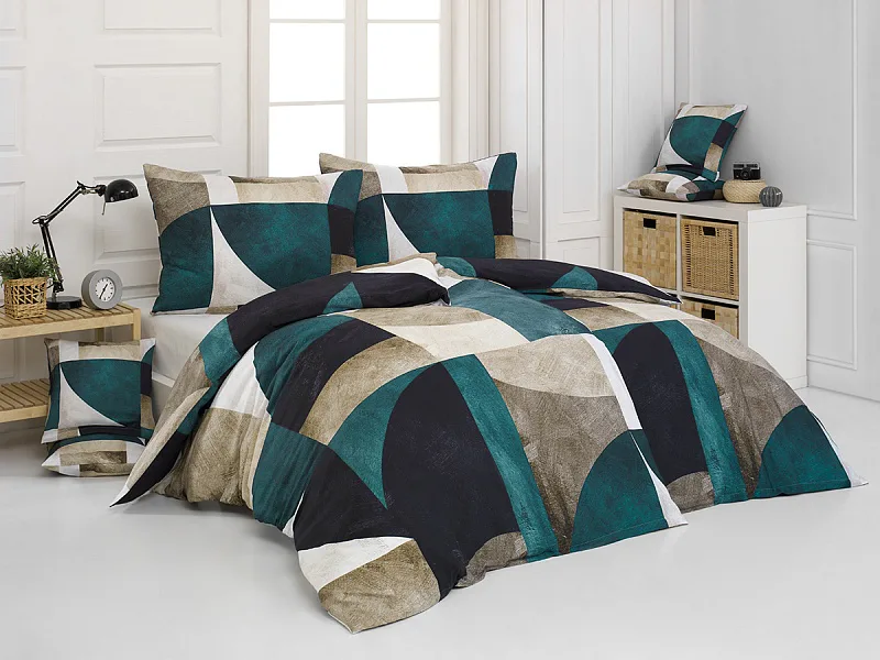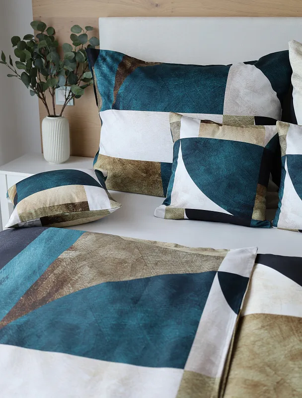 Potřebujete vyladit moderní ložnici k dokonalosti? Vsaďte na ložní povlečení Enzo. Abstraktní geometrický vzor kombinuje atraktivní odstíny zelenomodré, kávově hnědé a krémové barvy. Struktura potisku nese typické prvky umělecké malby, které jsou zachyceny v precizním detailu díky nejmodernější digitální technologii tisku.