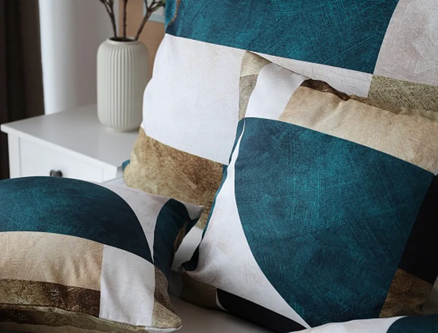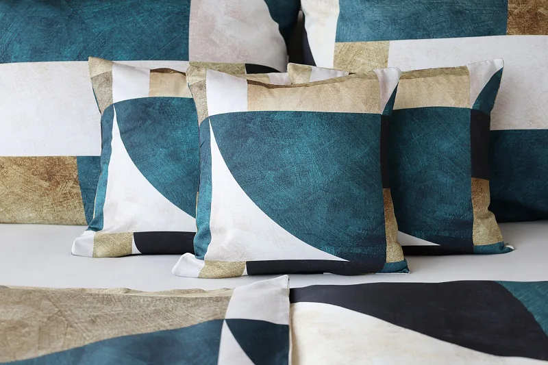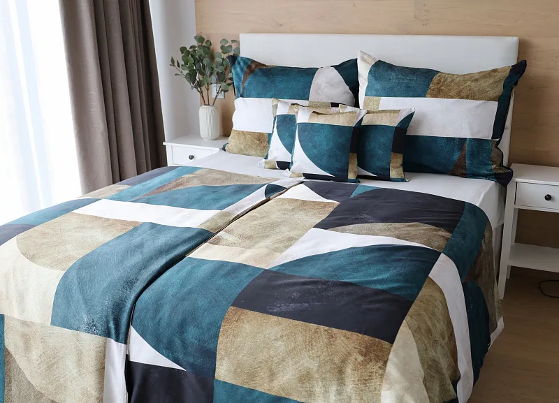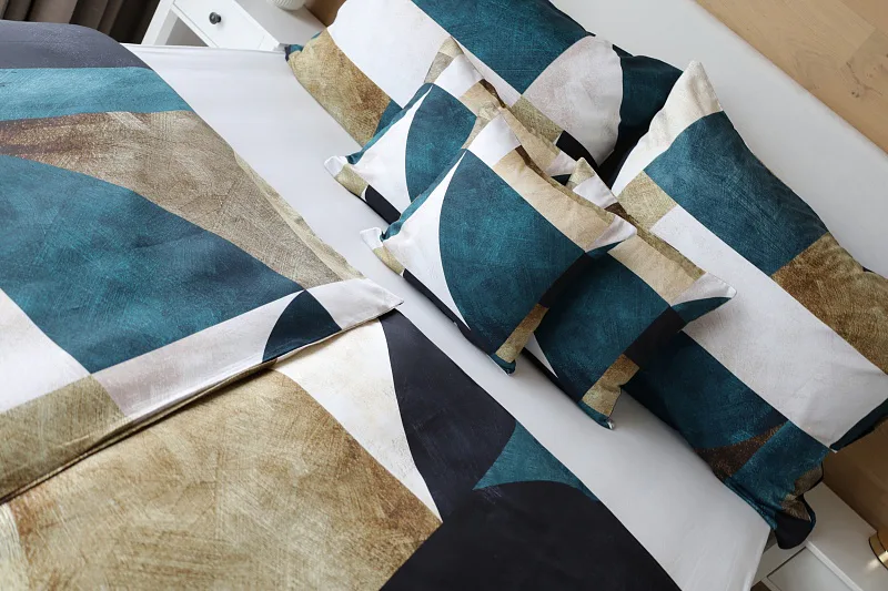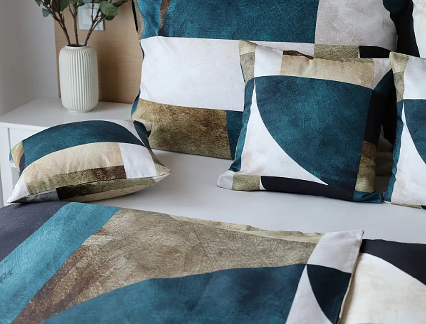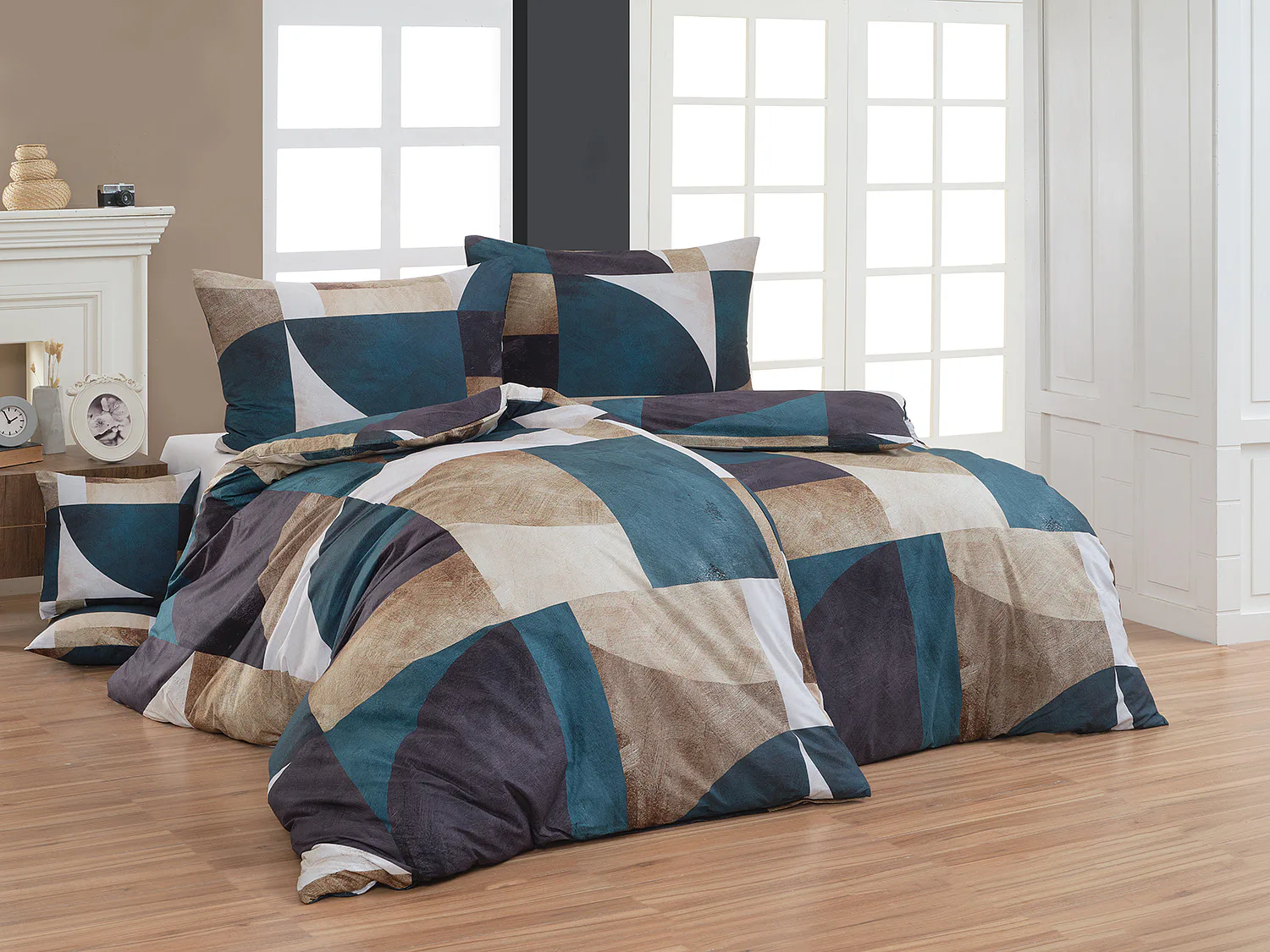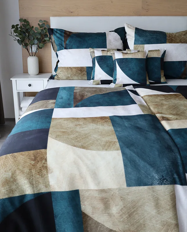 Potřebujete vyladit moderní ložnici k dokonalosti? Vsaďte na ložní povlečení Enzo. Abstraktní geometrický vzor kombinuje atraktivní odstíny zelenomodré, kávově hnědé a krémové barvy. Struktura potisku nese typické prvky umělecké malby, které jsou zachyceny v precizním detailu díky nejmodernější digitální technologii tisku.