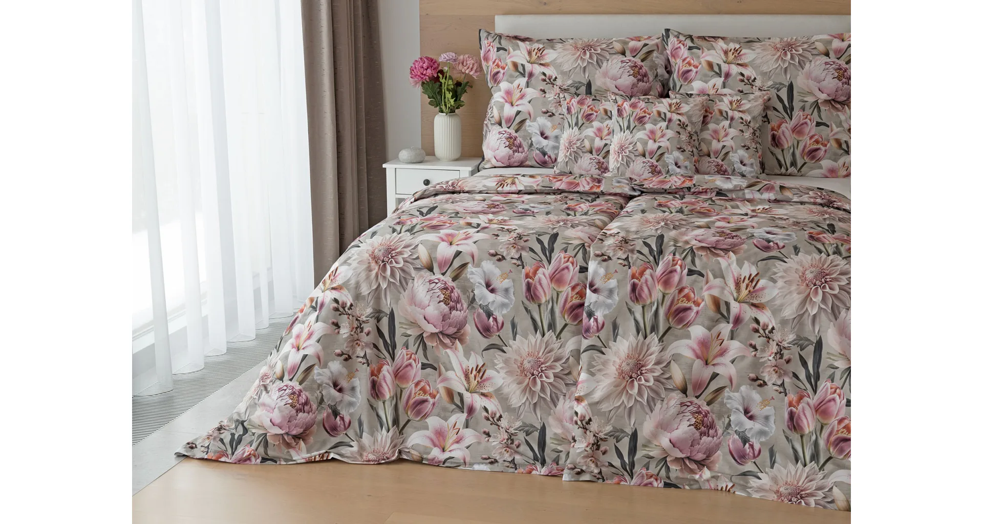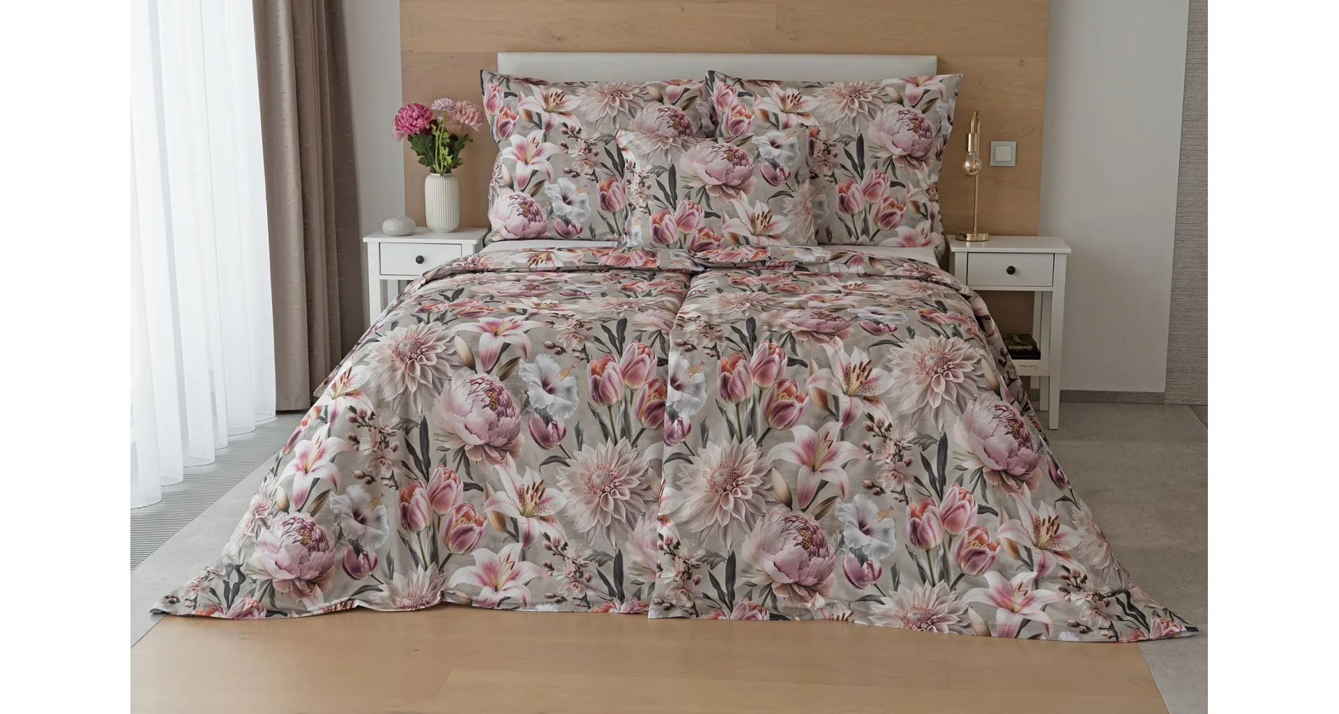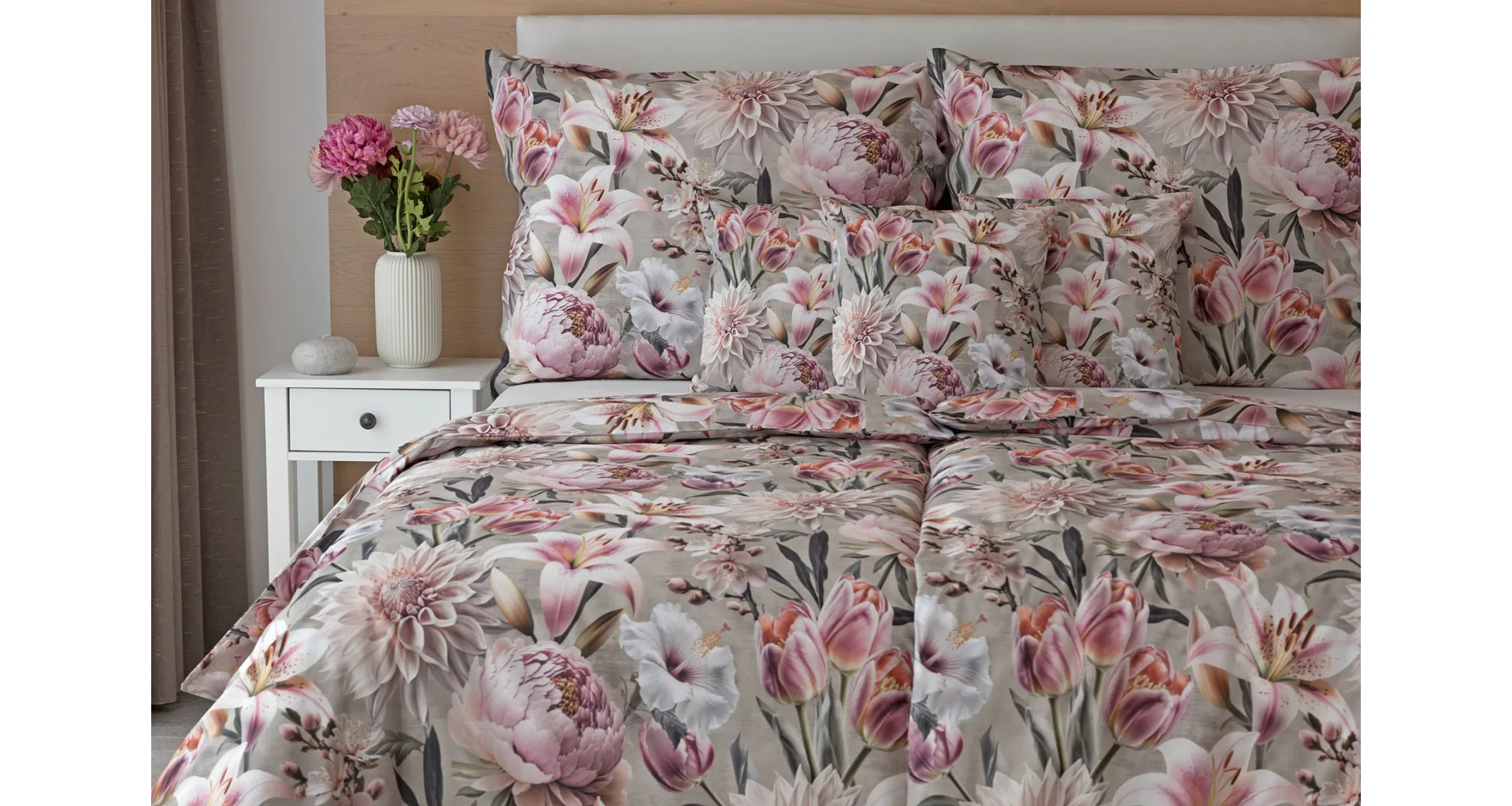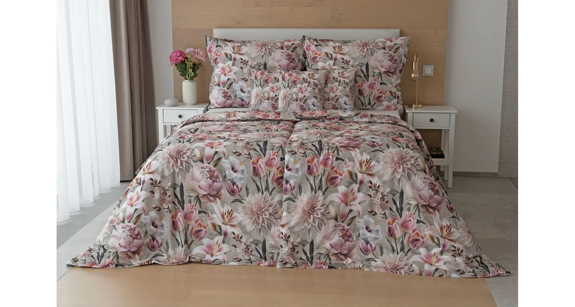 Květinovou symfonii rozehrává bavlněné povlečení Estel, se kterým vaše ložnice zazáří. Pestrobarevné květy na tlumeném světle fialovém podkladu vynikají v precizním detailu díky nejmodernější digitální tiskové technologii.