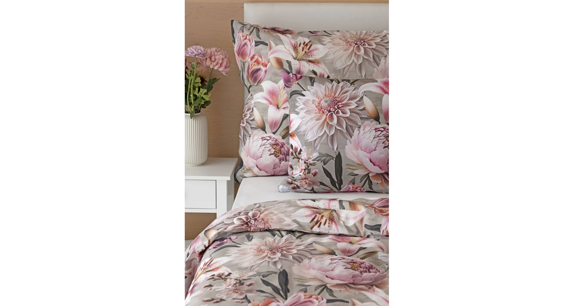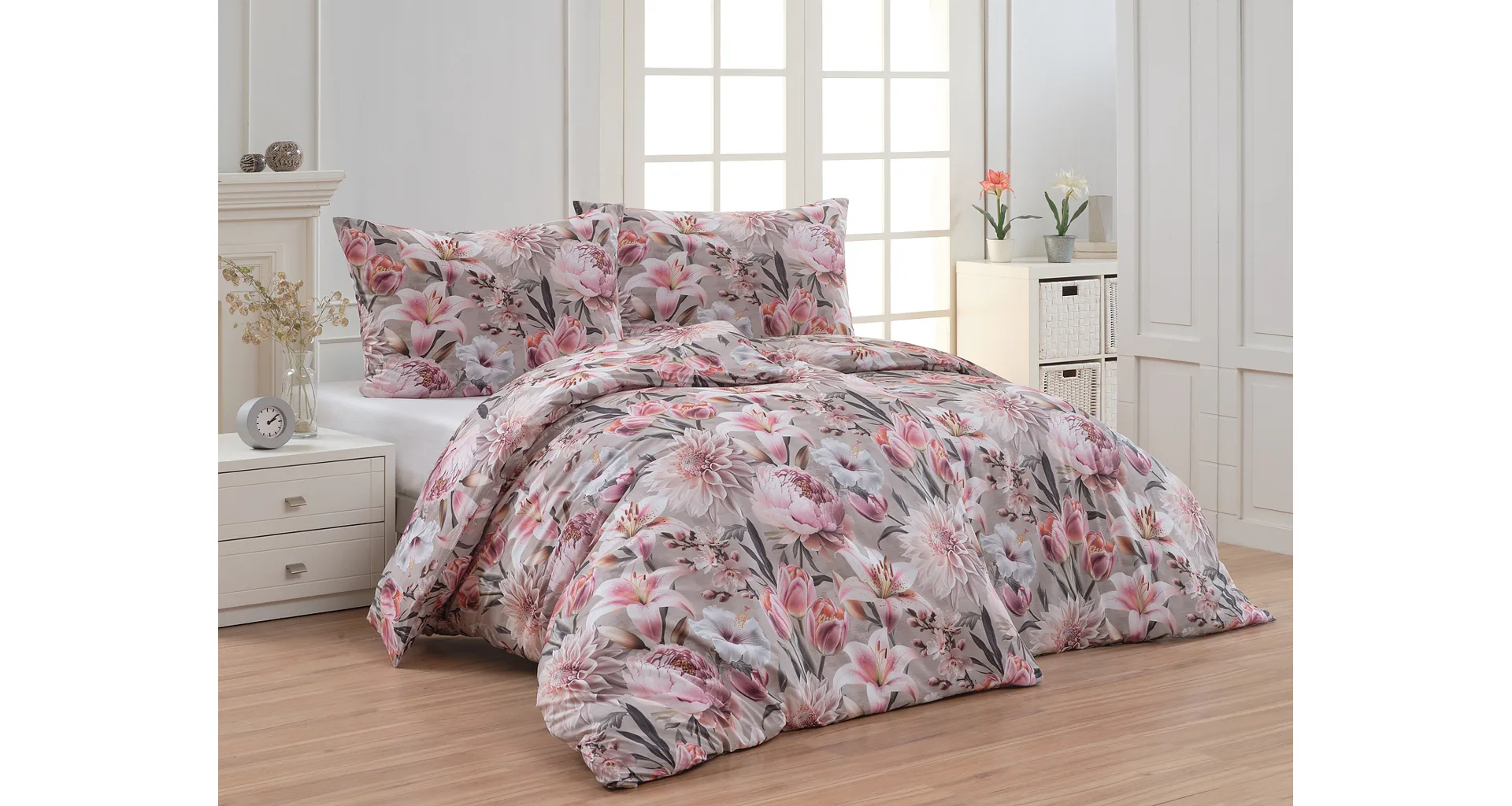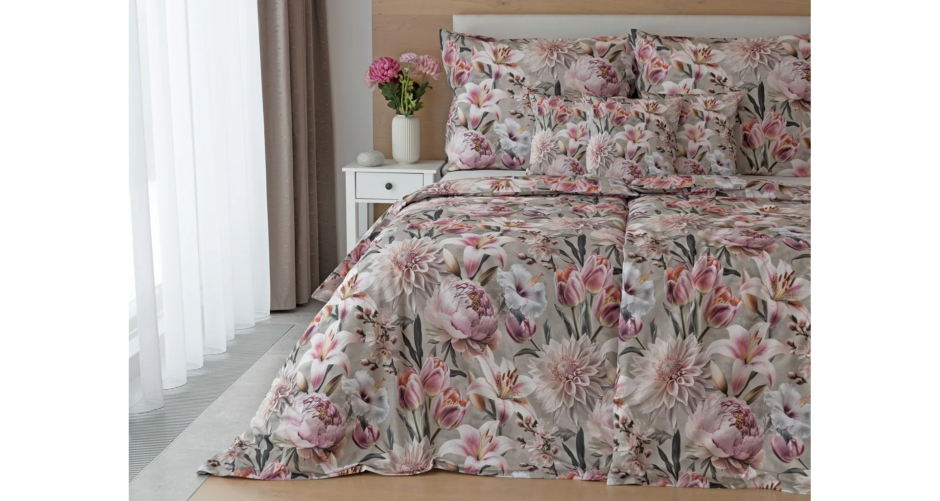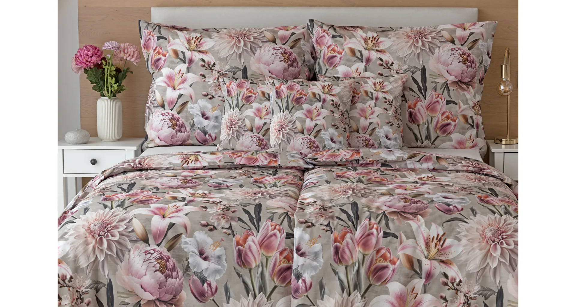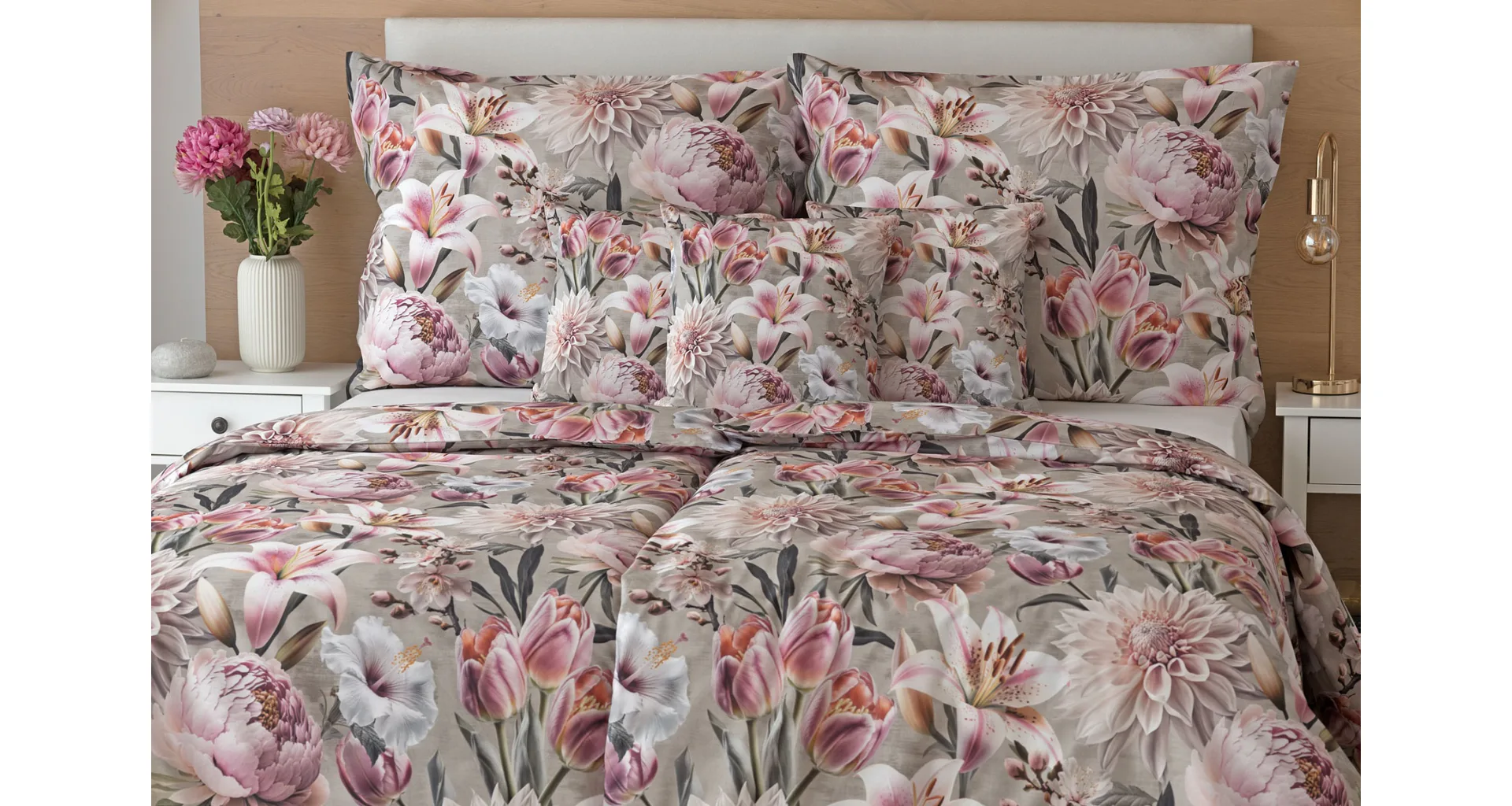 Květinovou symfonii rozehrává bavlněné povlečení Estel, se kterým vaše ložnice zazáří. Pestrobarevné květy na tlumeném světle fialovém podkladu vynikají v precizním detailu díky nejmodernější digitální tiskové technologii.
