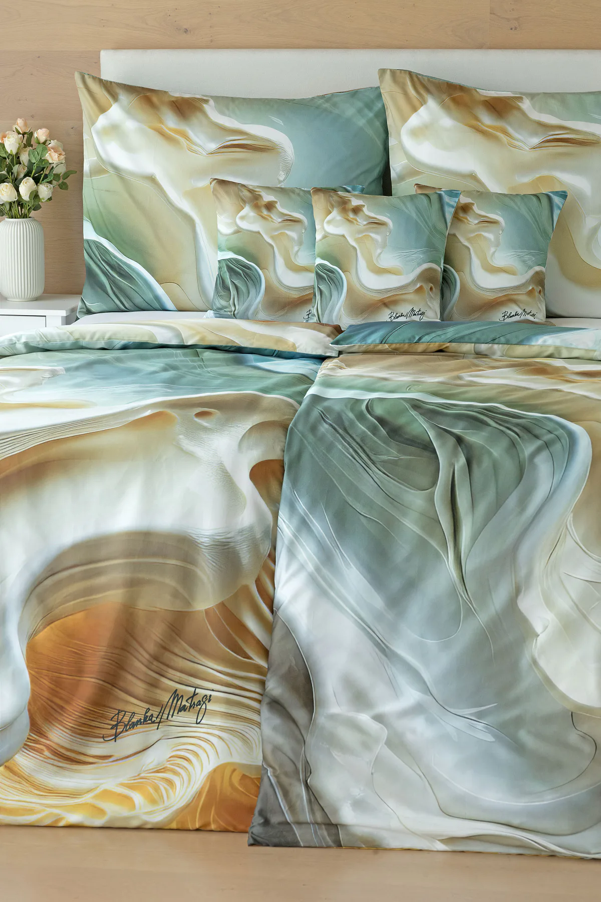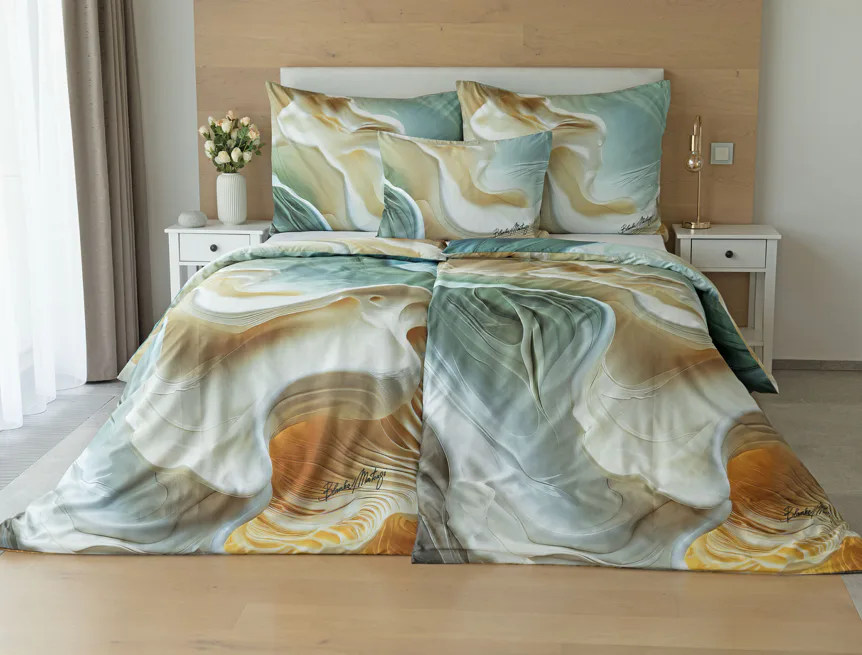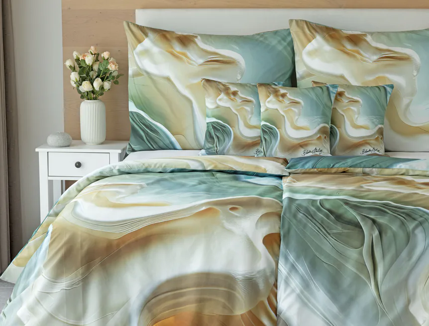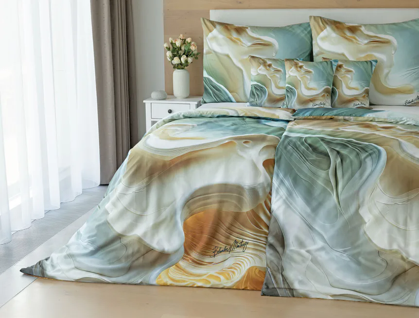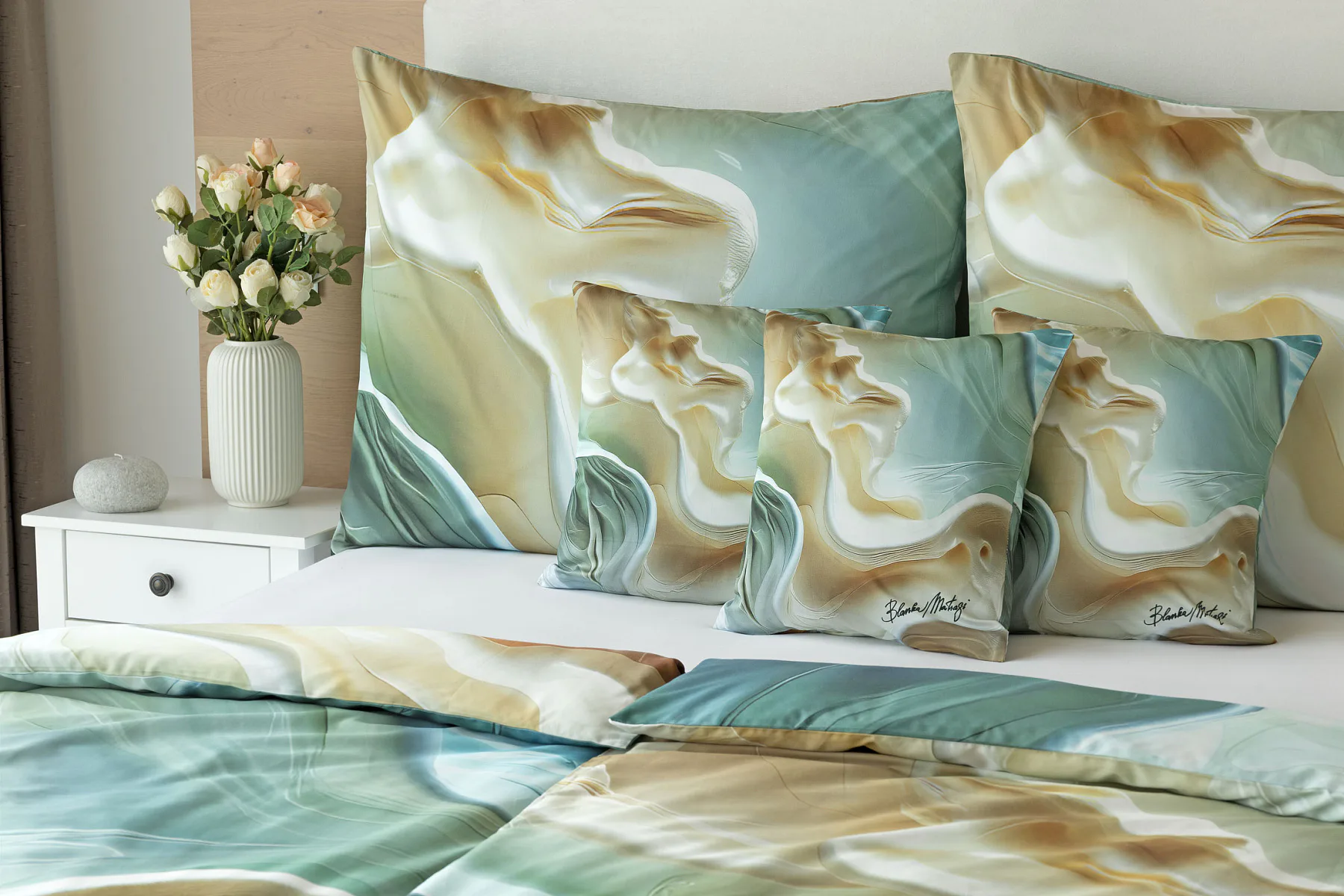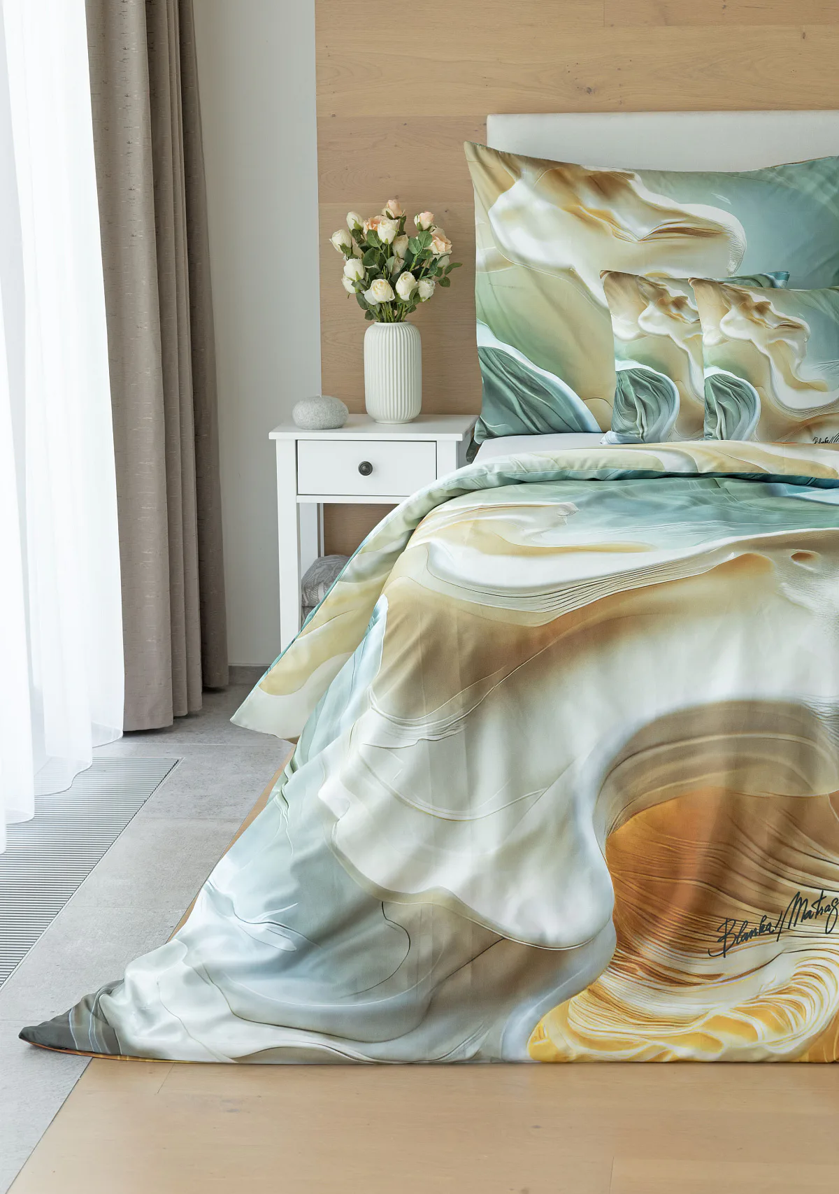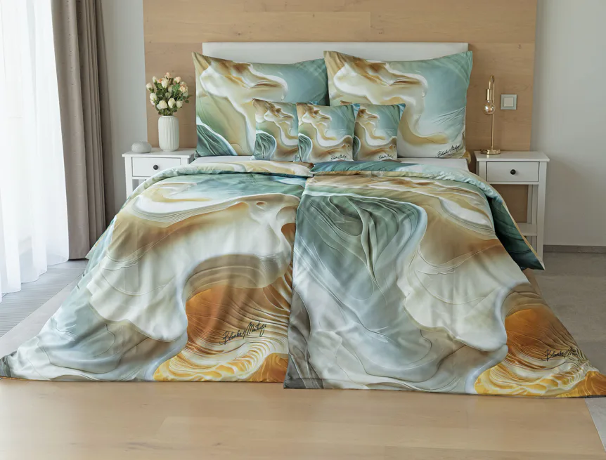 V tomto autorském digitálně zpracovaném motivu se harmonicky prolínají krémové, béžové a mátově zelené odstíny, zvýrazněné zářivým jantarovým tónem. Nejmodernější digitální tisk zajišťuje věrný detail přesně dle autorčina záměru, motiv je z obou stran povlečení stejný.