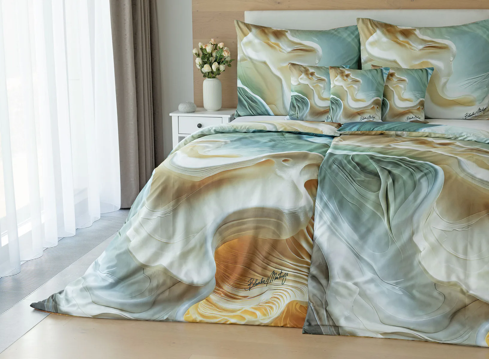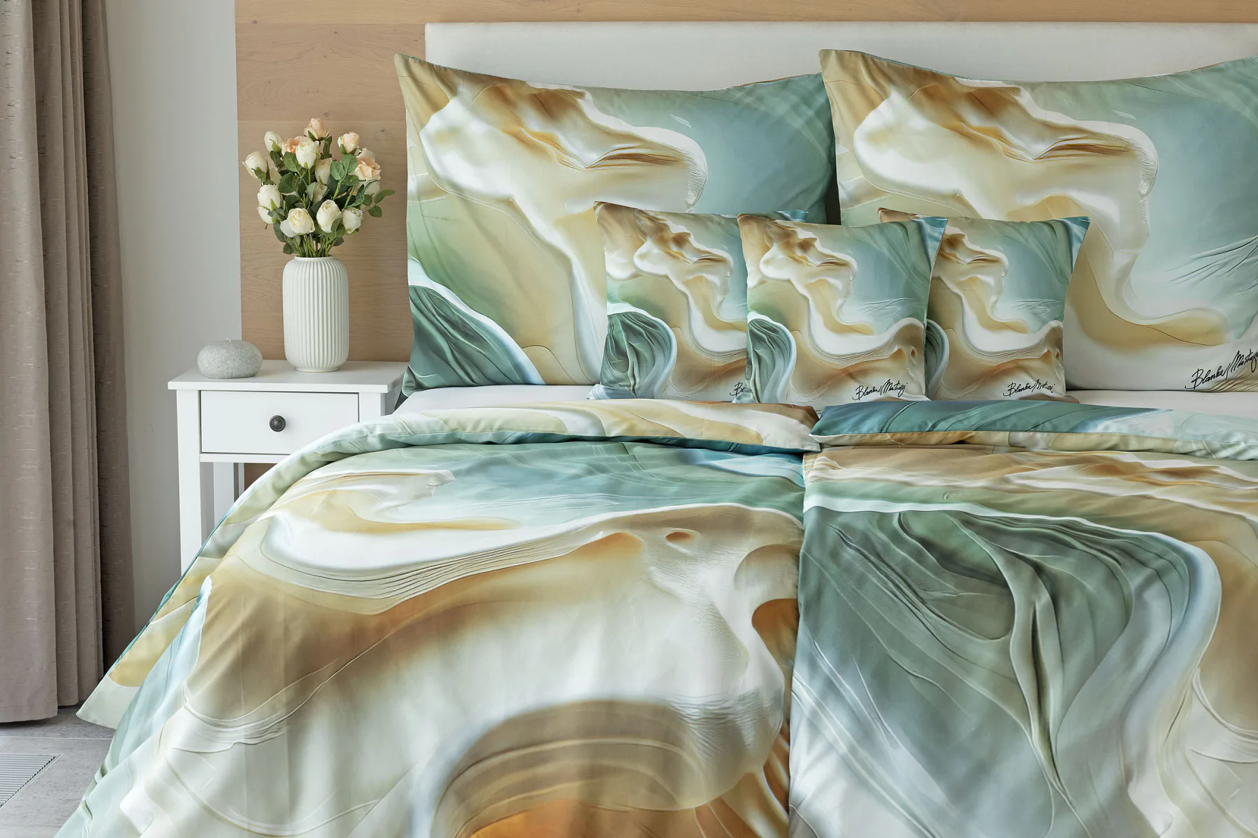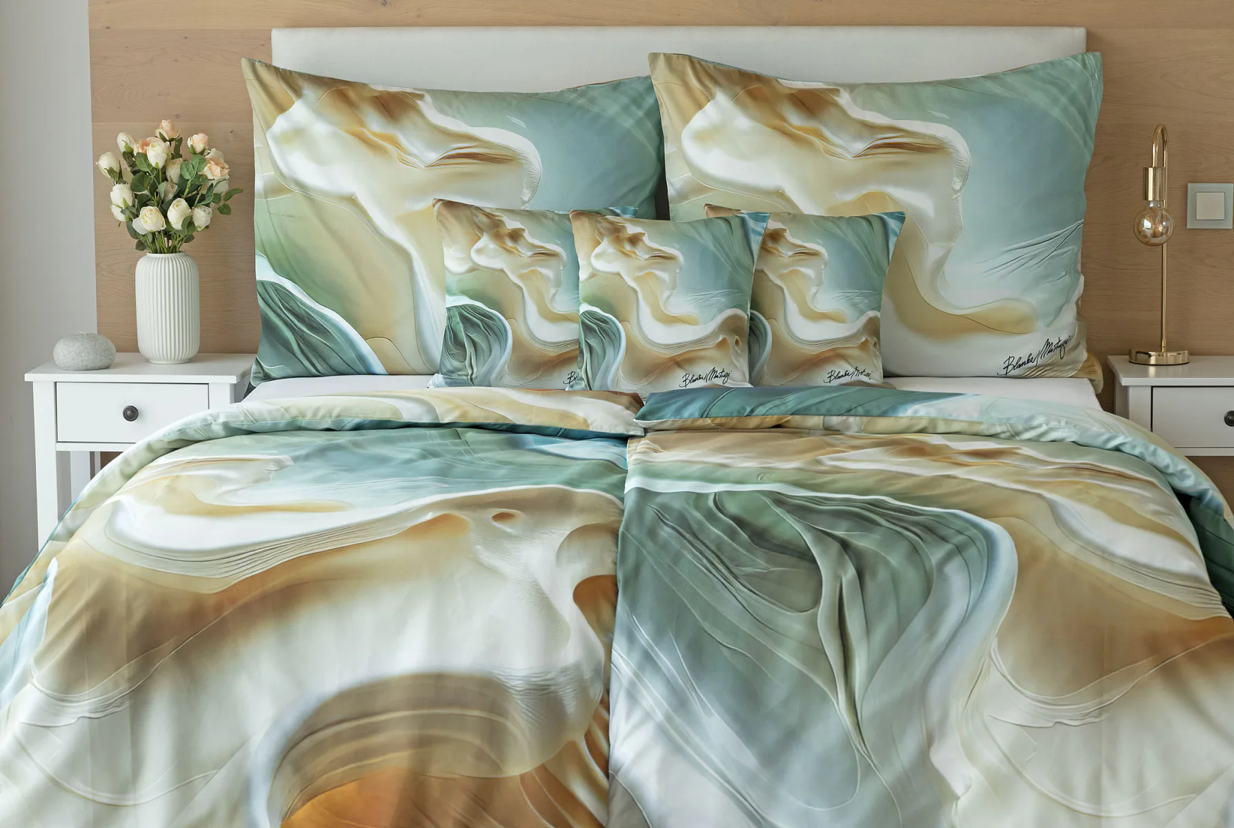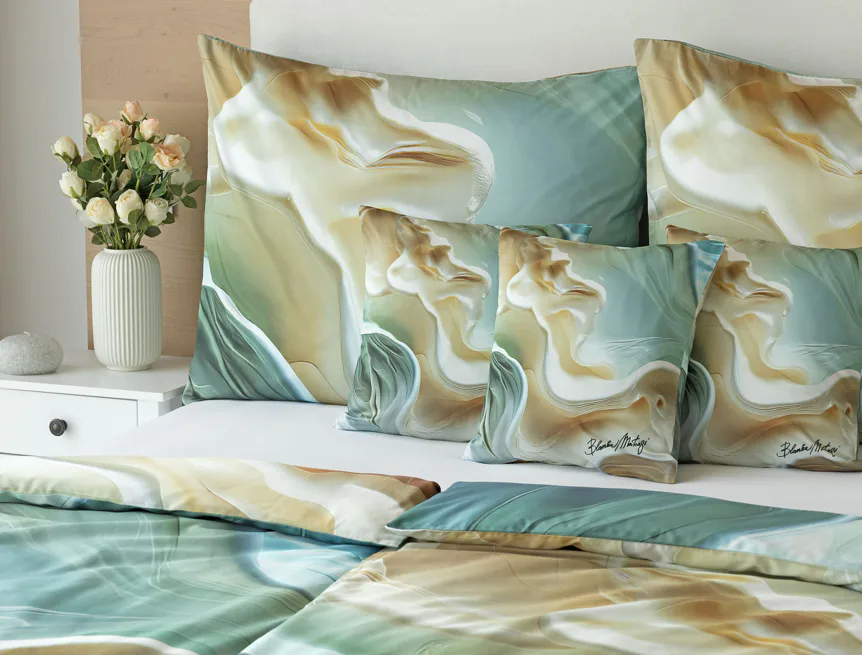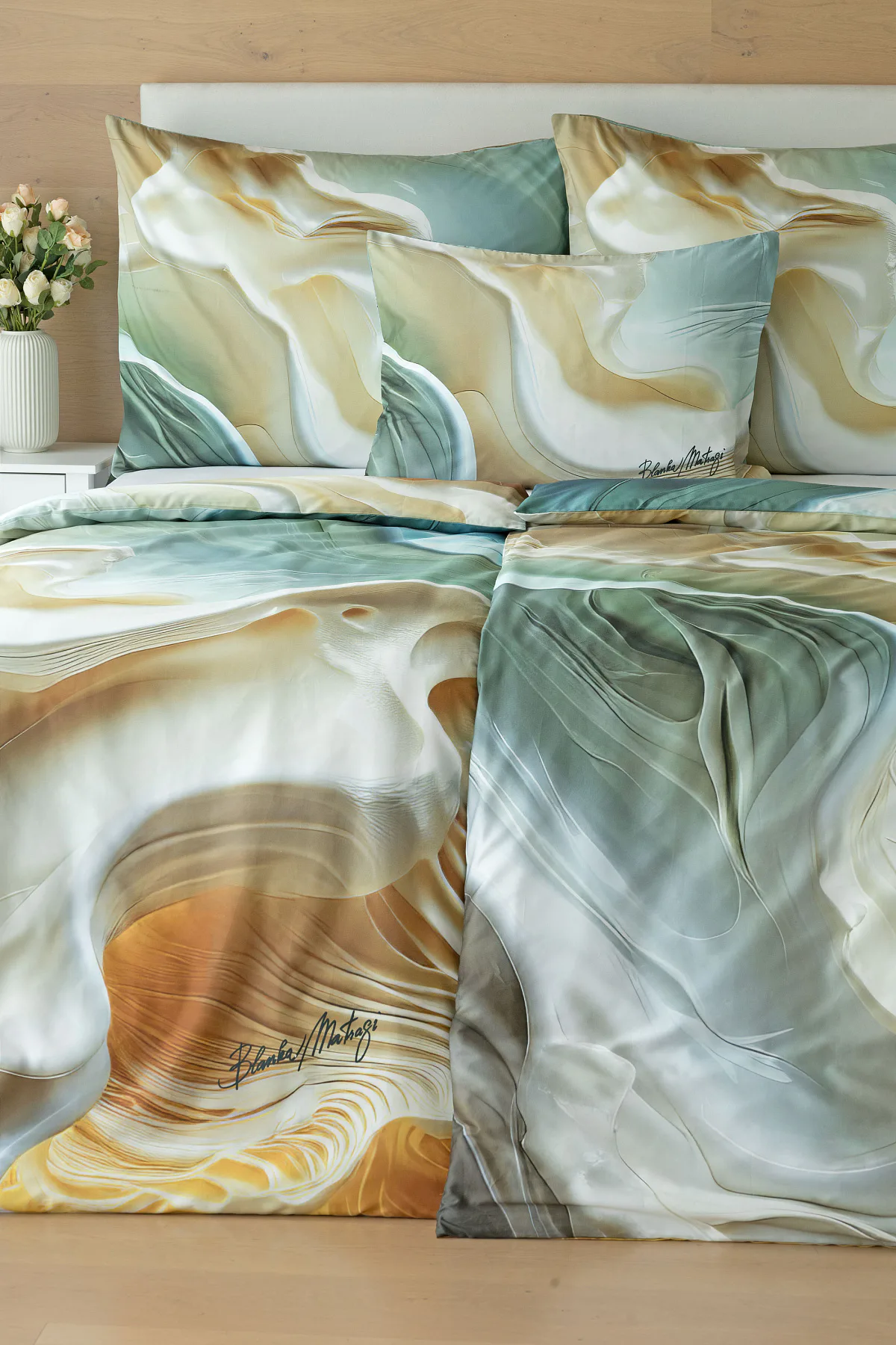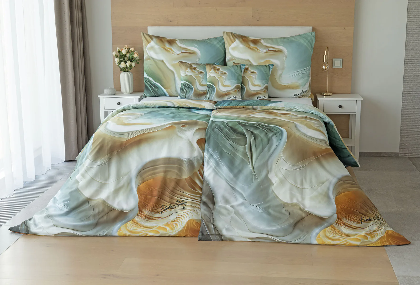 V tomto autorském digitálně zpracovaném motivu se harmonicky prolínají krémové, béžové a mátově zelené odstíny, zvýrazněné zářivým jantarovým tónem. Nejmodernější digitální tisk zajišťuje věrný detail přesně dle autorčina záměru, motiv je z obou stran povlečení stejný.