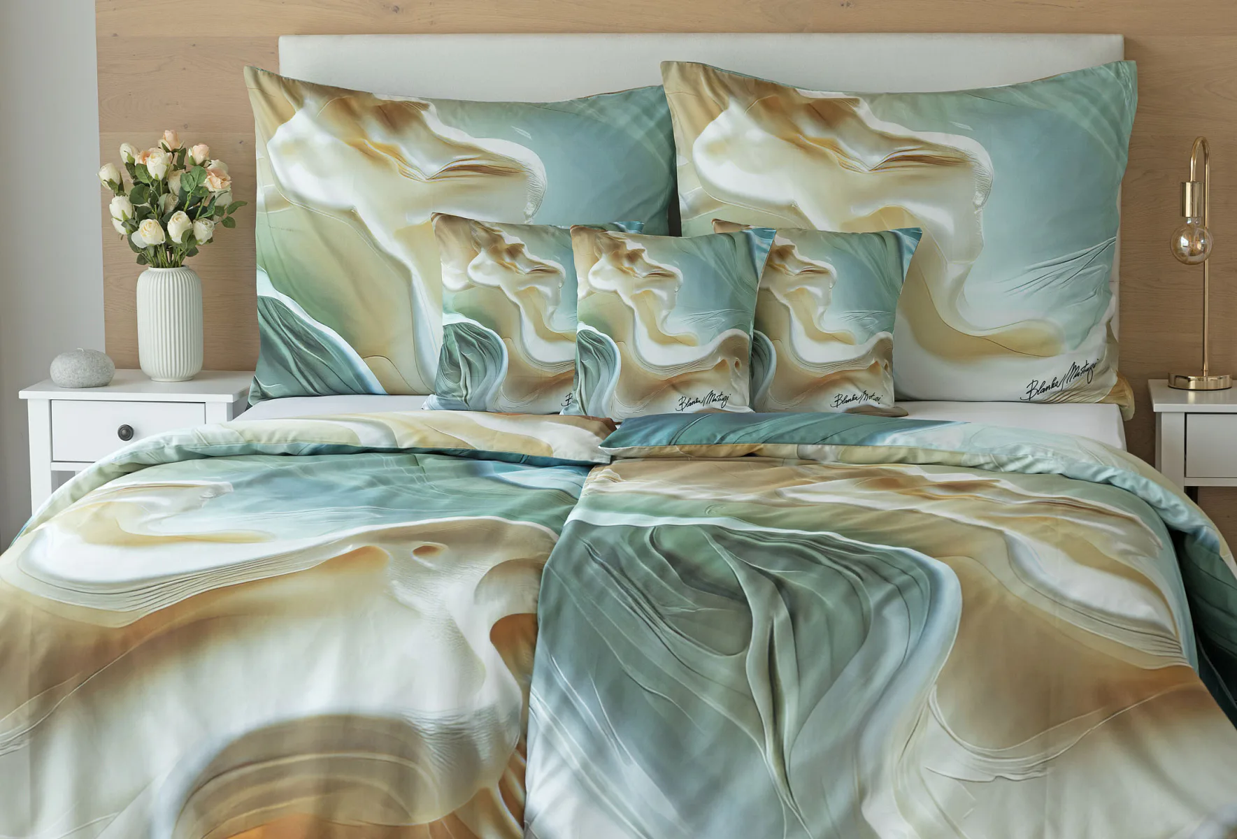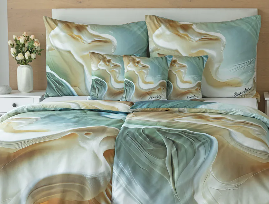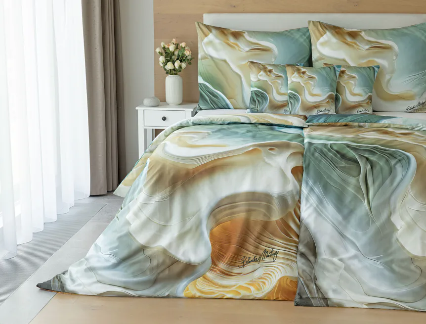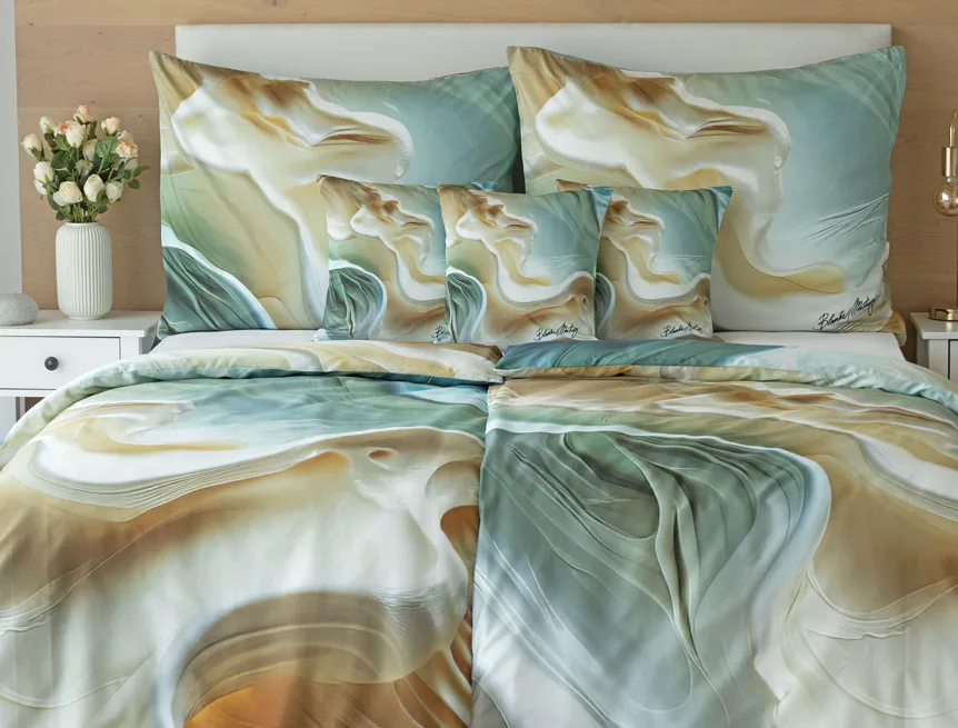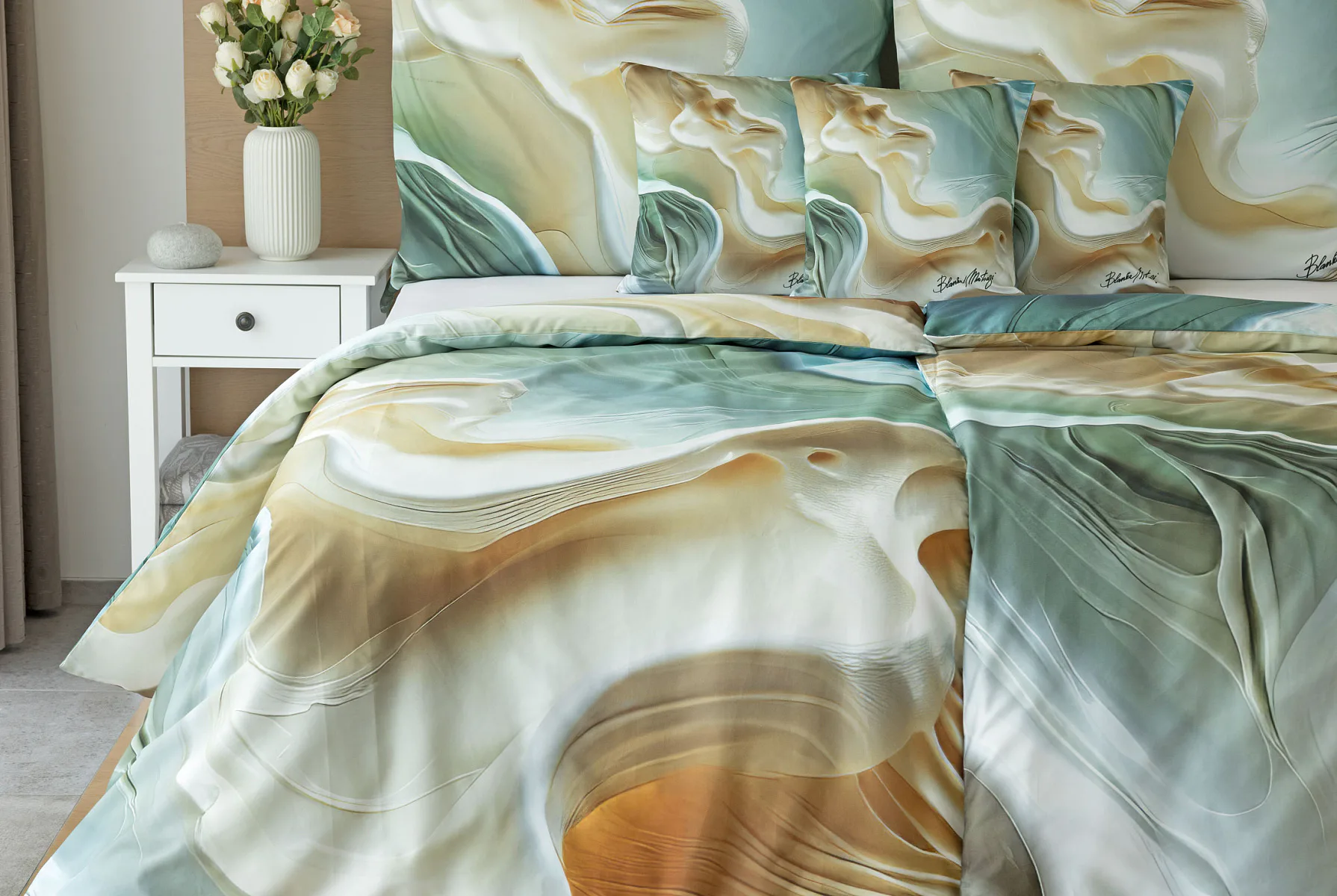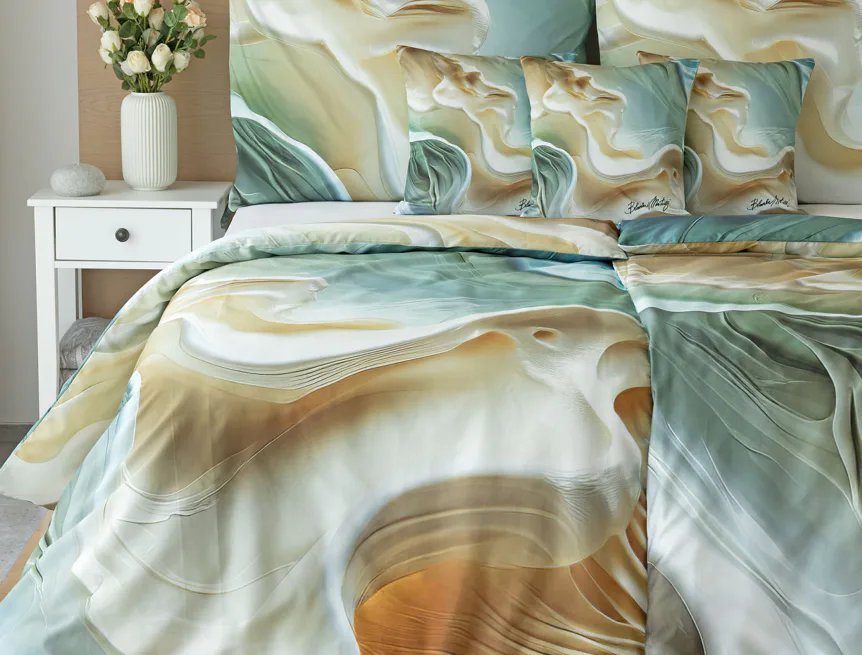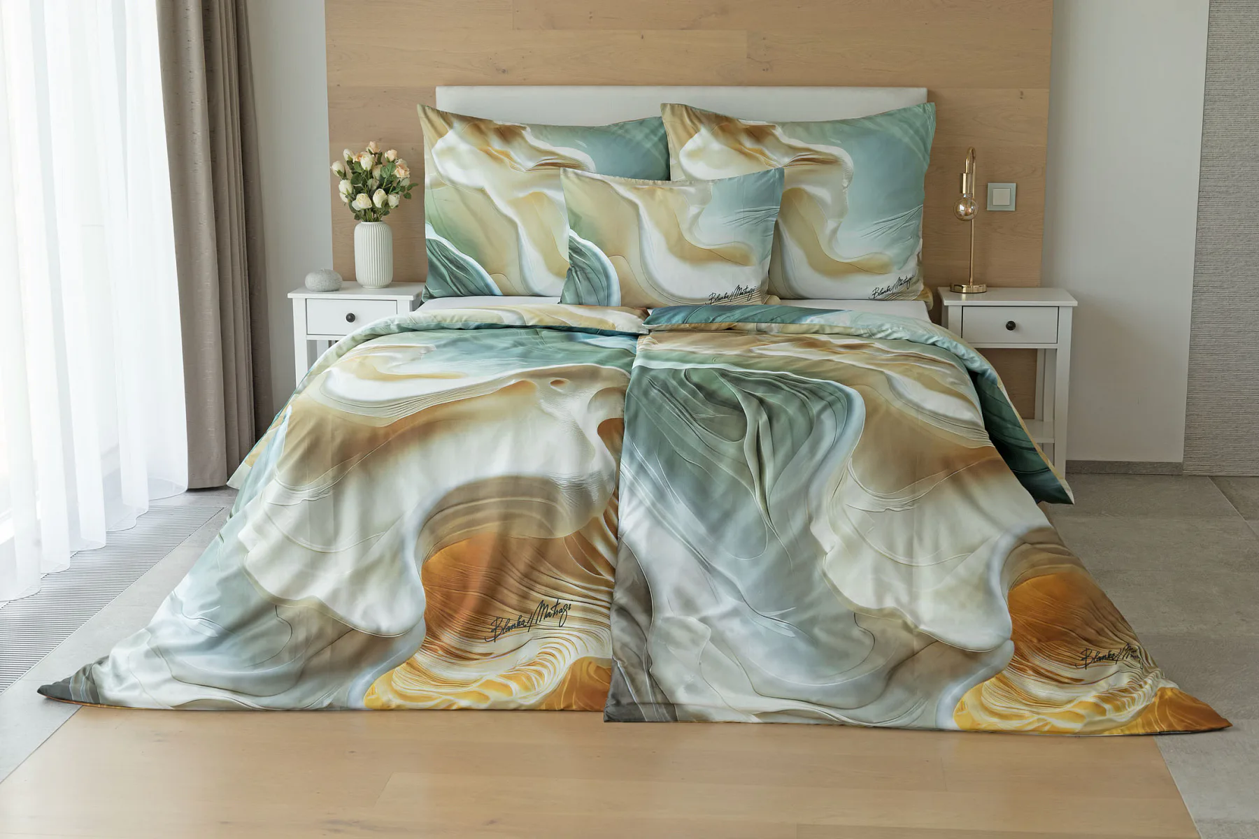 V tomto autorském digitálně zpracovaném motivu se harmonicky prolínají krémové, béžové a mátově zelené odstíny, zvýrazněné zářivým jantarovým tónem. Nejmodernější digitální tisk zajišťuje věrný detail přesně dle autorčina záměru, motiv je z obou stran povlečení stejný.