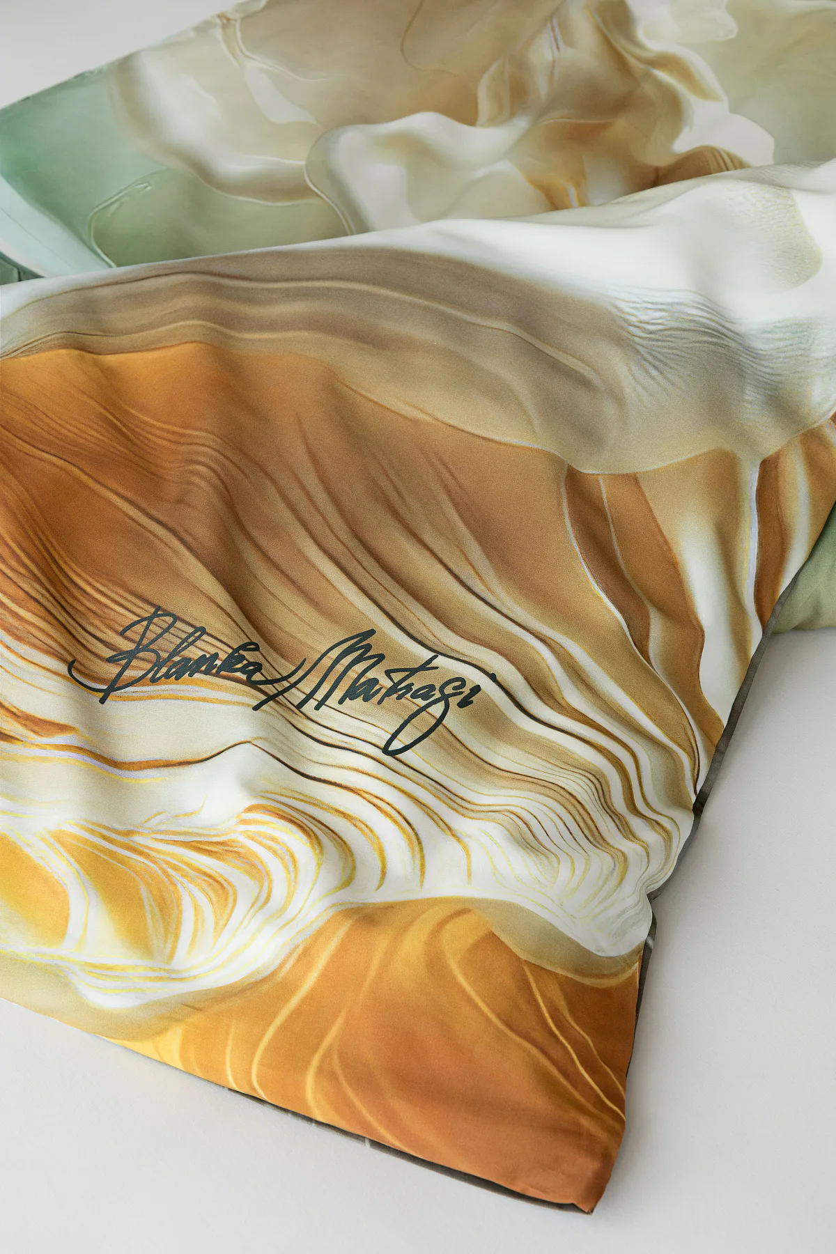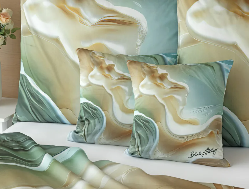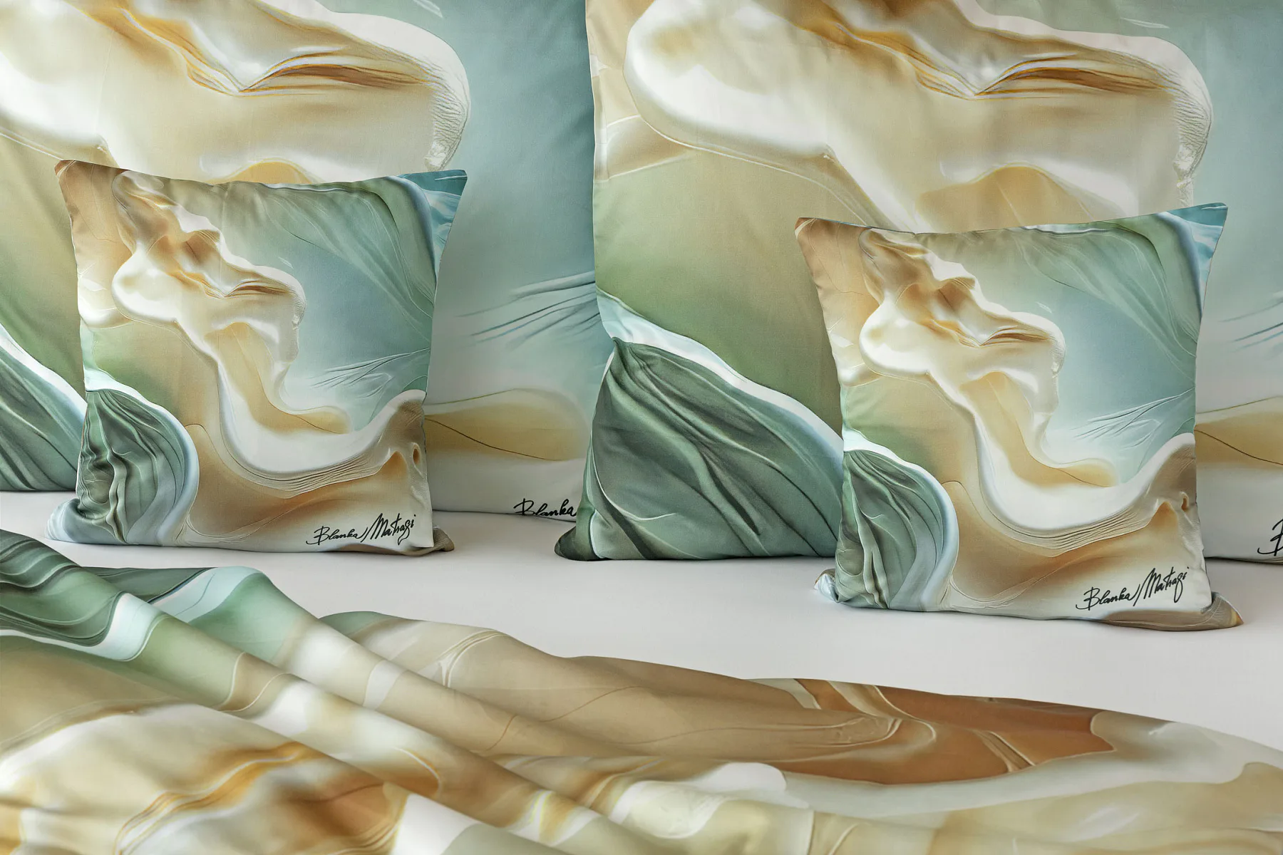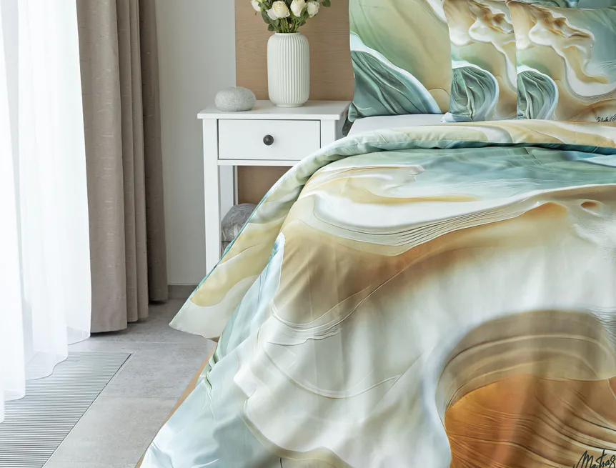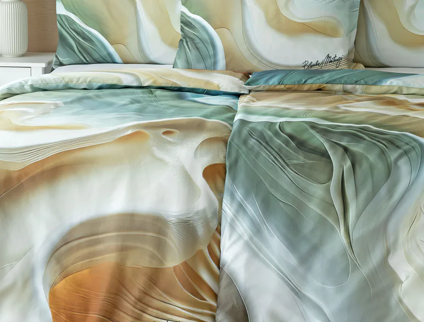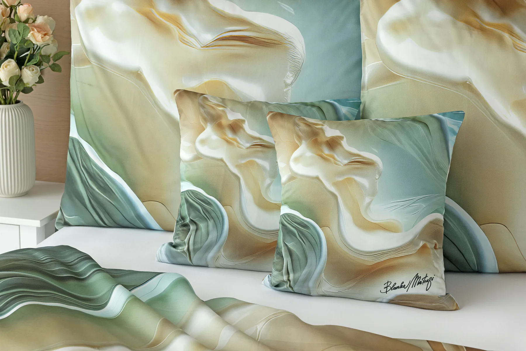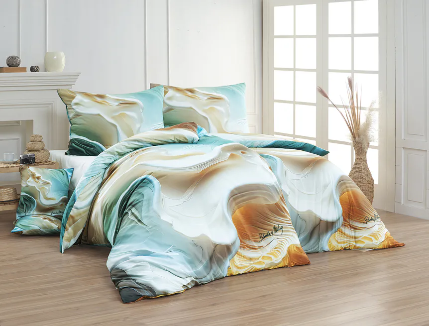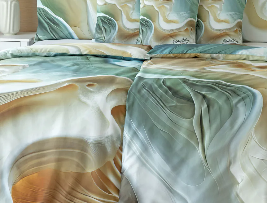 V tomto autorském digitálně zpracovaném motivu se harmonicky prolínají krémové, béžové a mátově zelené odstíny, zvýrazněné zářivým jantarovým tónem. Nejmodernější digitální tisk zajišťuje věrný detail přesně dle autorčina záměru, motiv je z obou stran povlečení stejný.