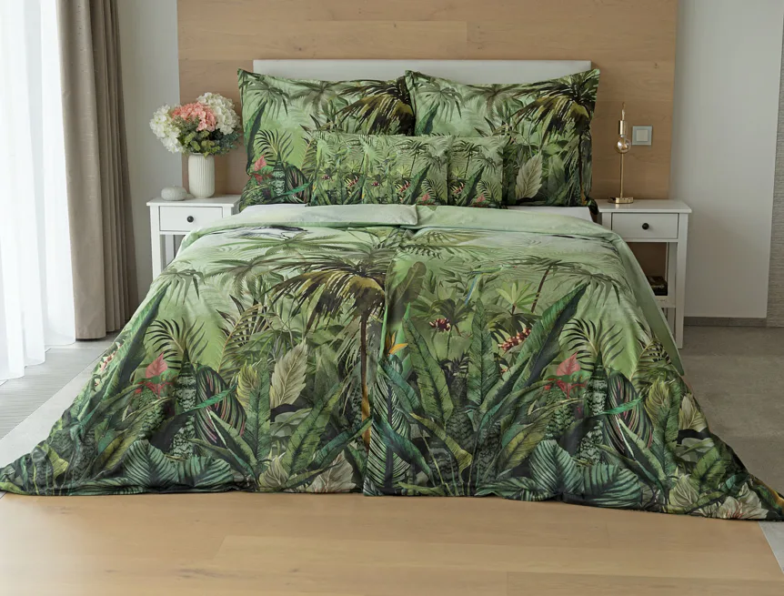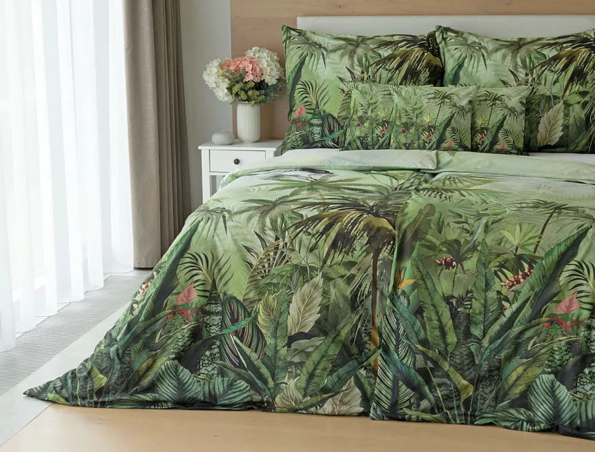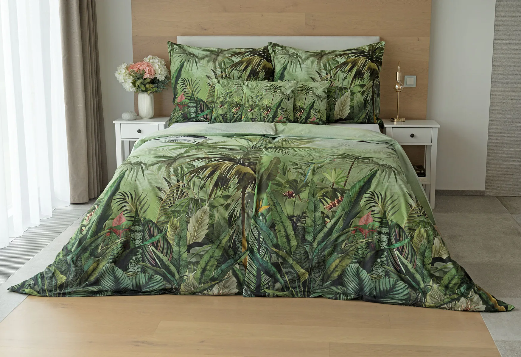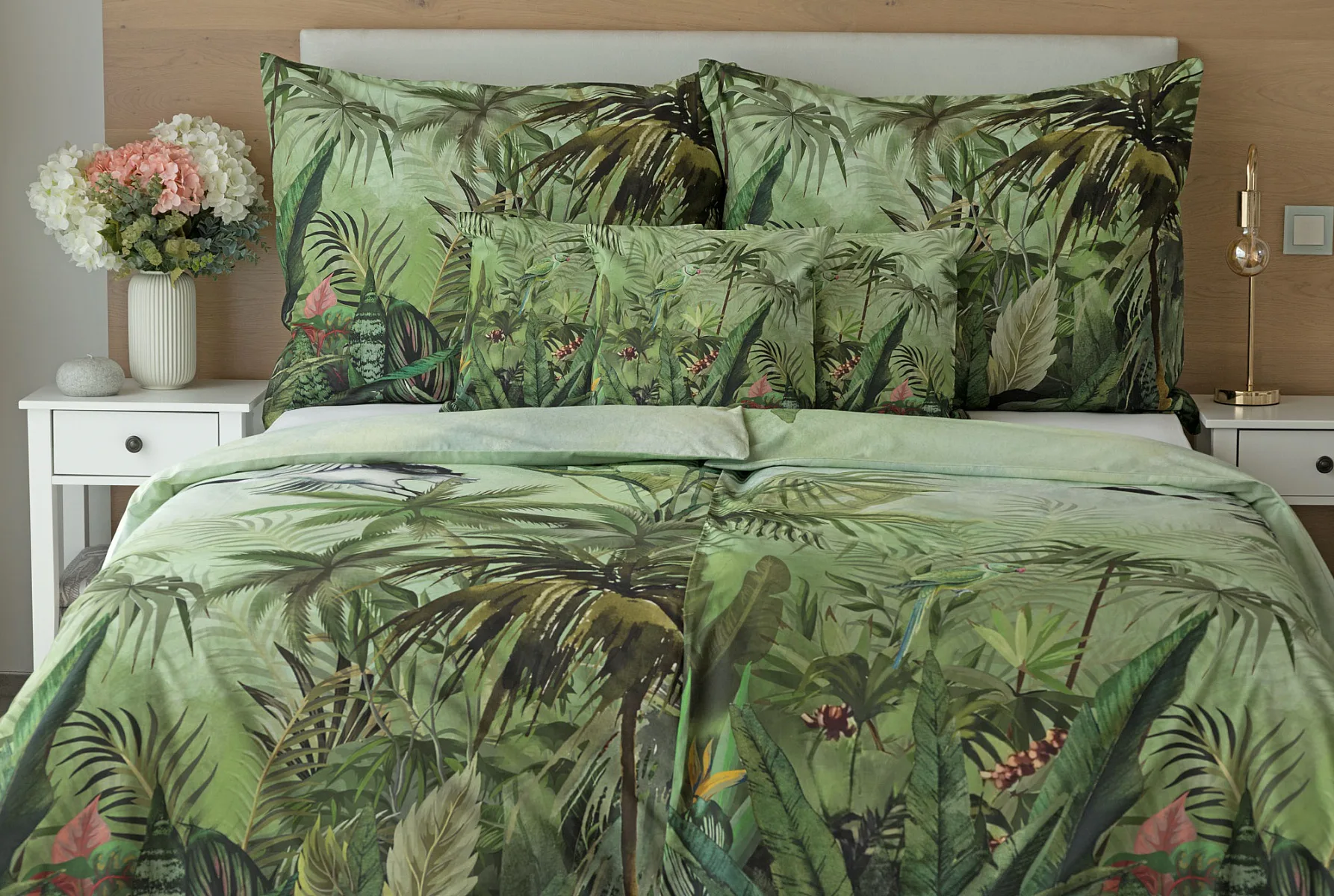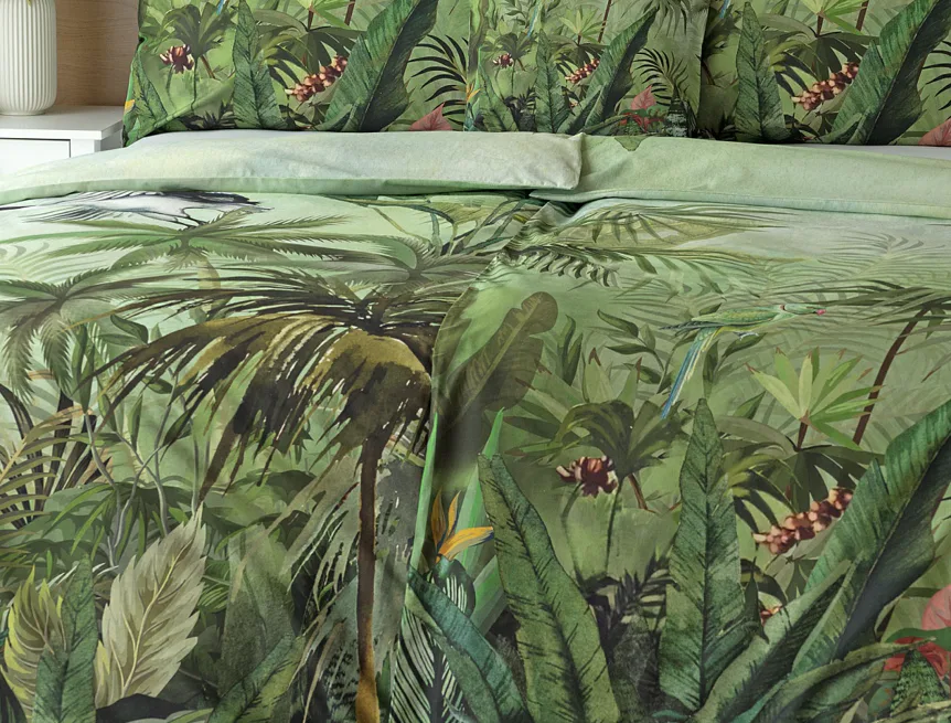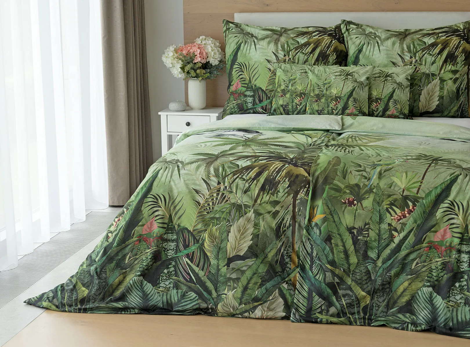 Pokud zrovna nejste na dovolené, nic si z toho nedělejte. S ložním povlečením Exotica si můžete vytvořit vlastní oázu svěžesti a pohody doma v ložnici. Exotický motiv v pestré paletě zelených tónů vyzařuje pozitivní energii, se kterou se budete probouzet do krásných letních dnů.