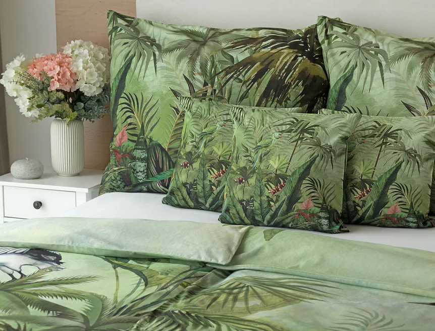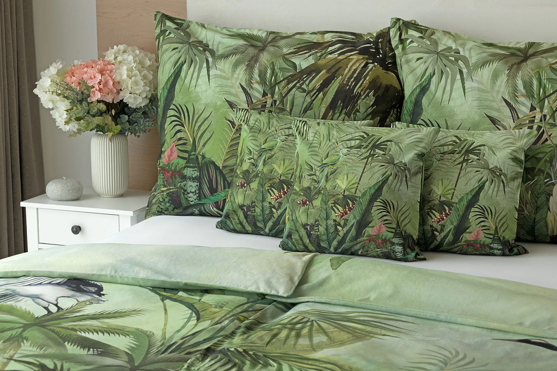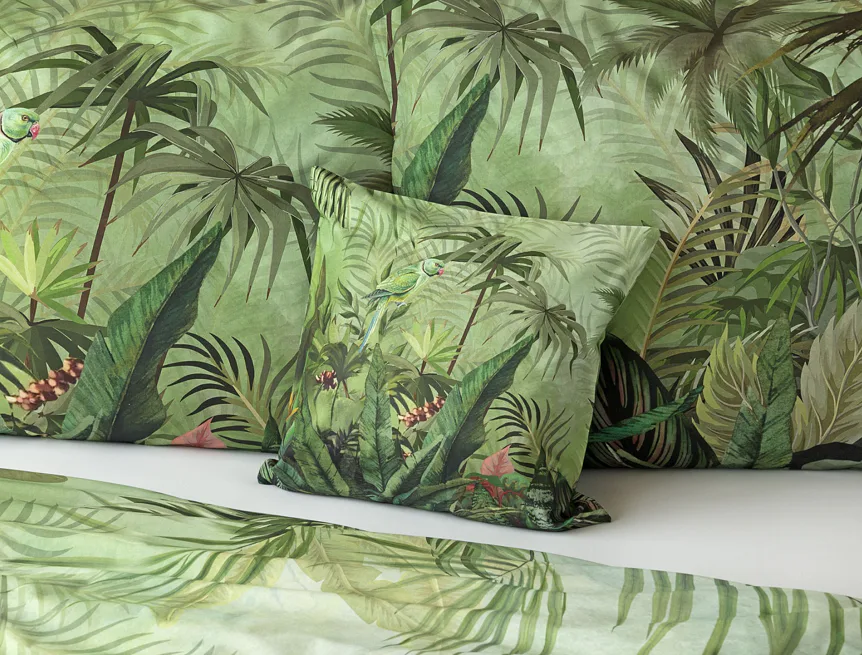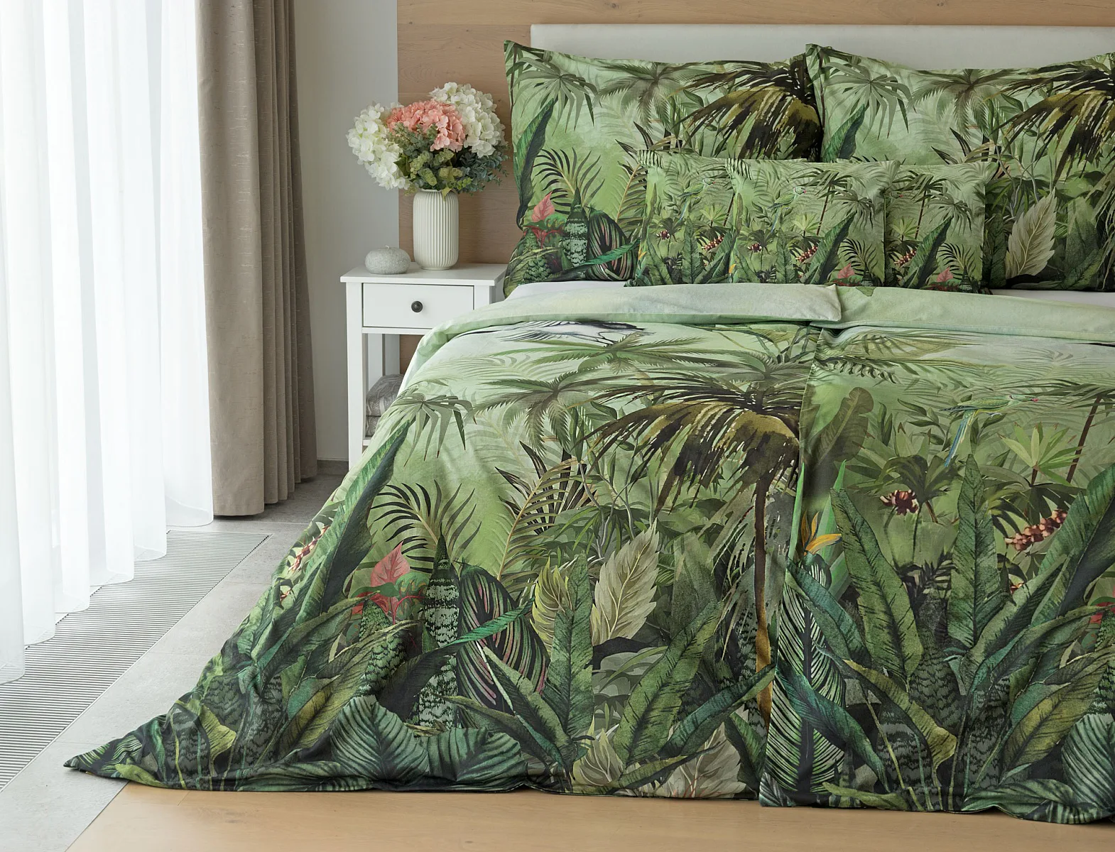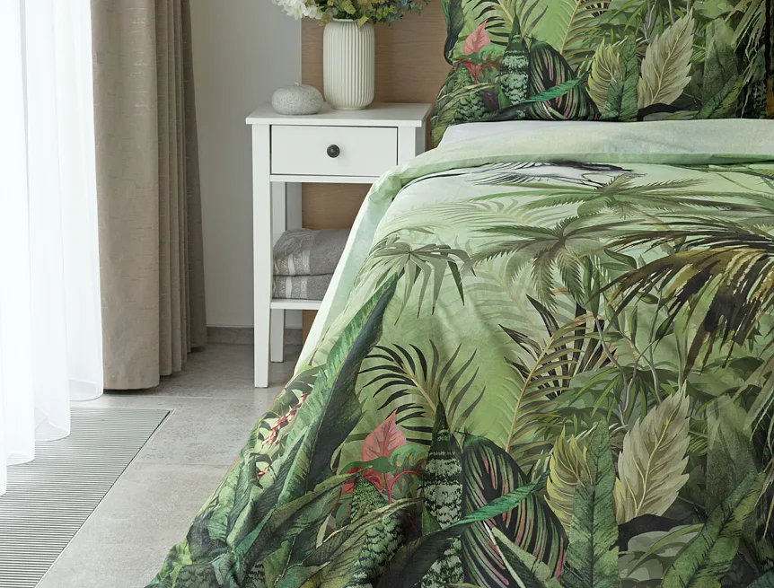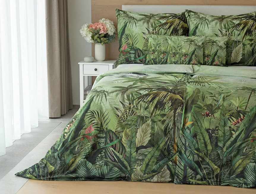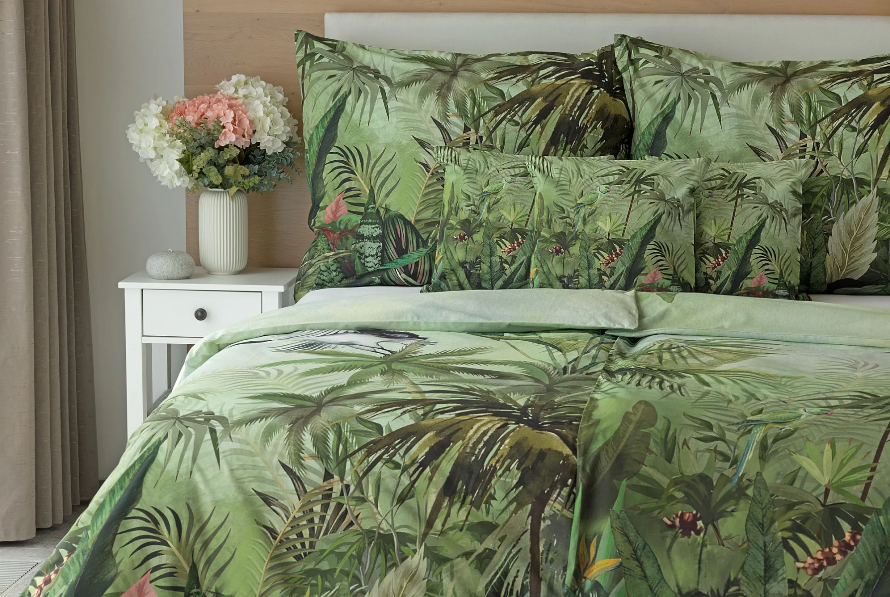 Pokud zrovna nejste na dovolené, nic si z toho nedělejte. S ložním povlečením Exotica si můžete vytvořit vlastní oázu svěžesti a pohody doma v ložnici. Exotický motiv v pestré paletě zelených tónů vyzařuje pozitivní energii, se kterou se budete probouzet do krásných letních dnů.