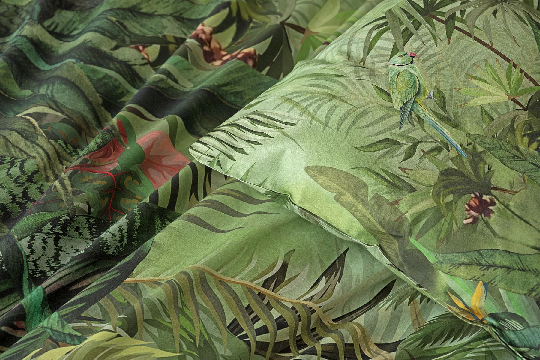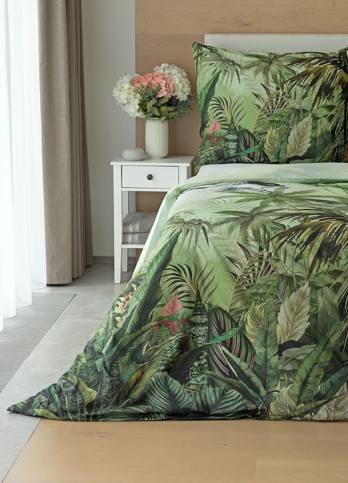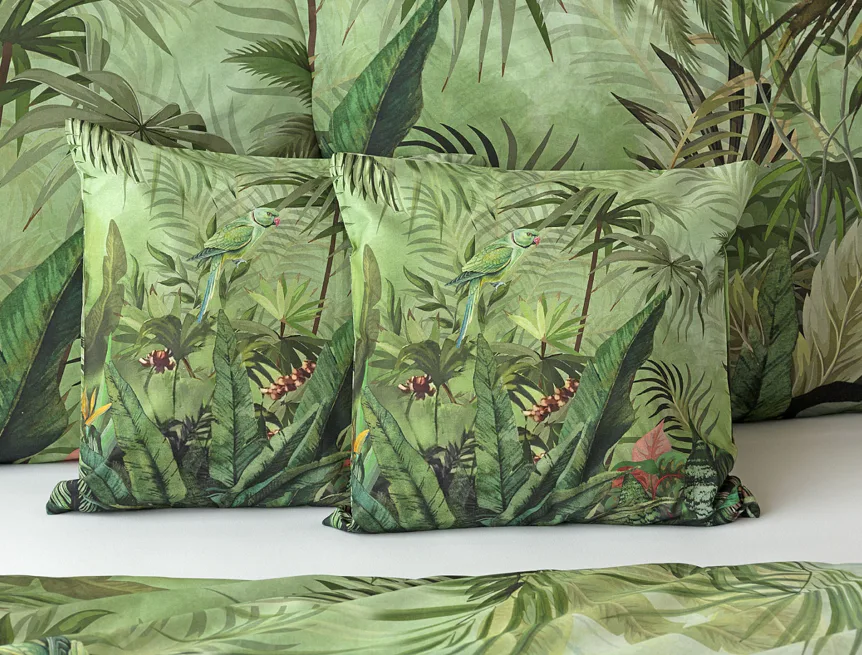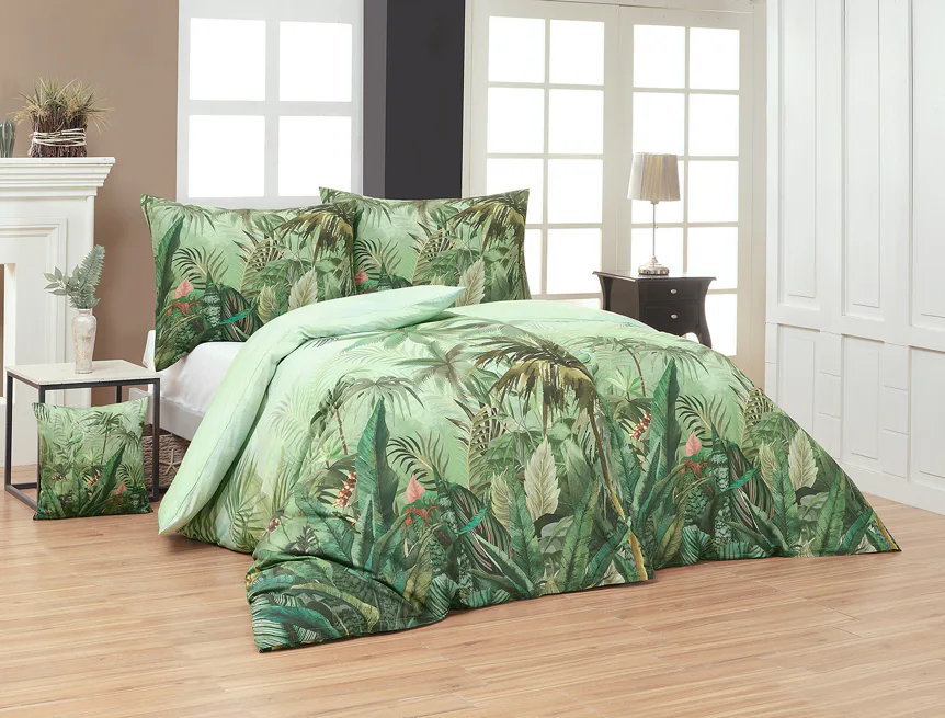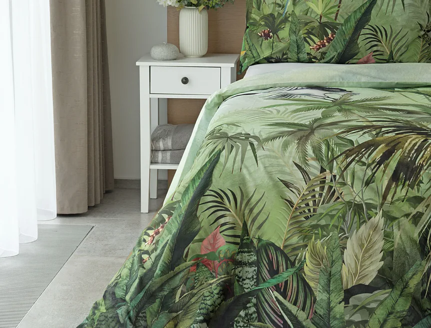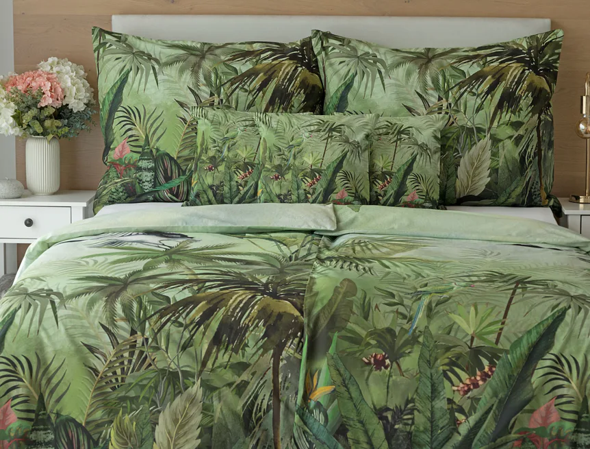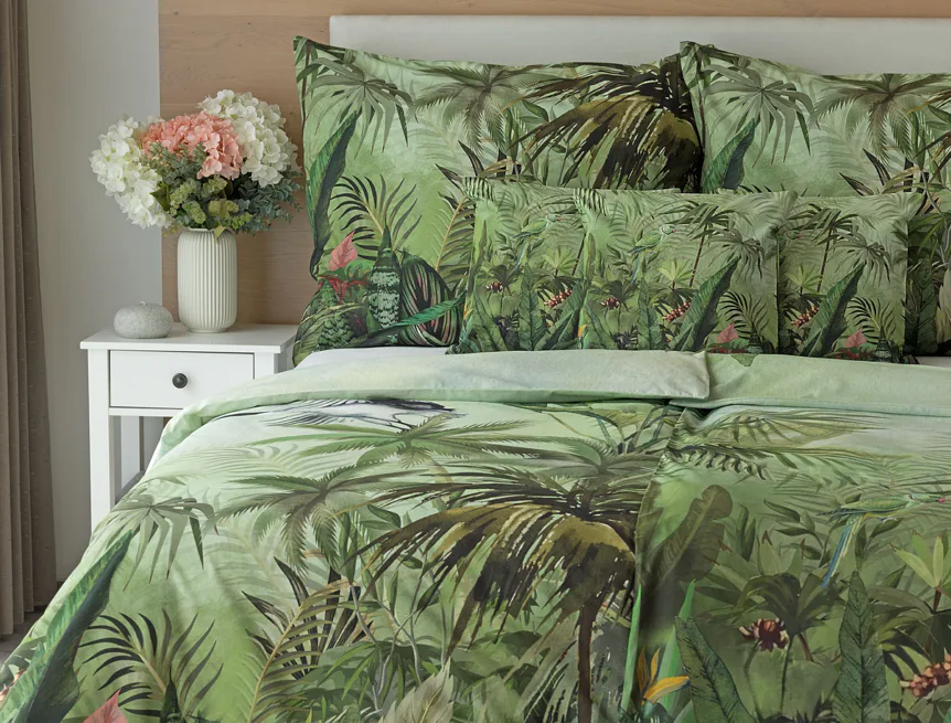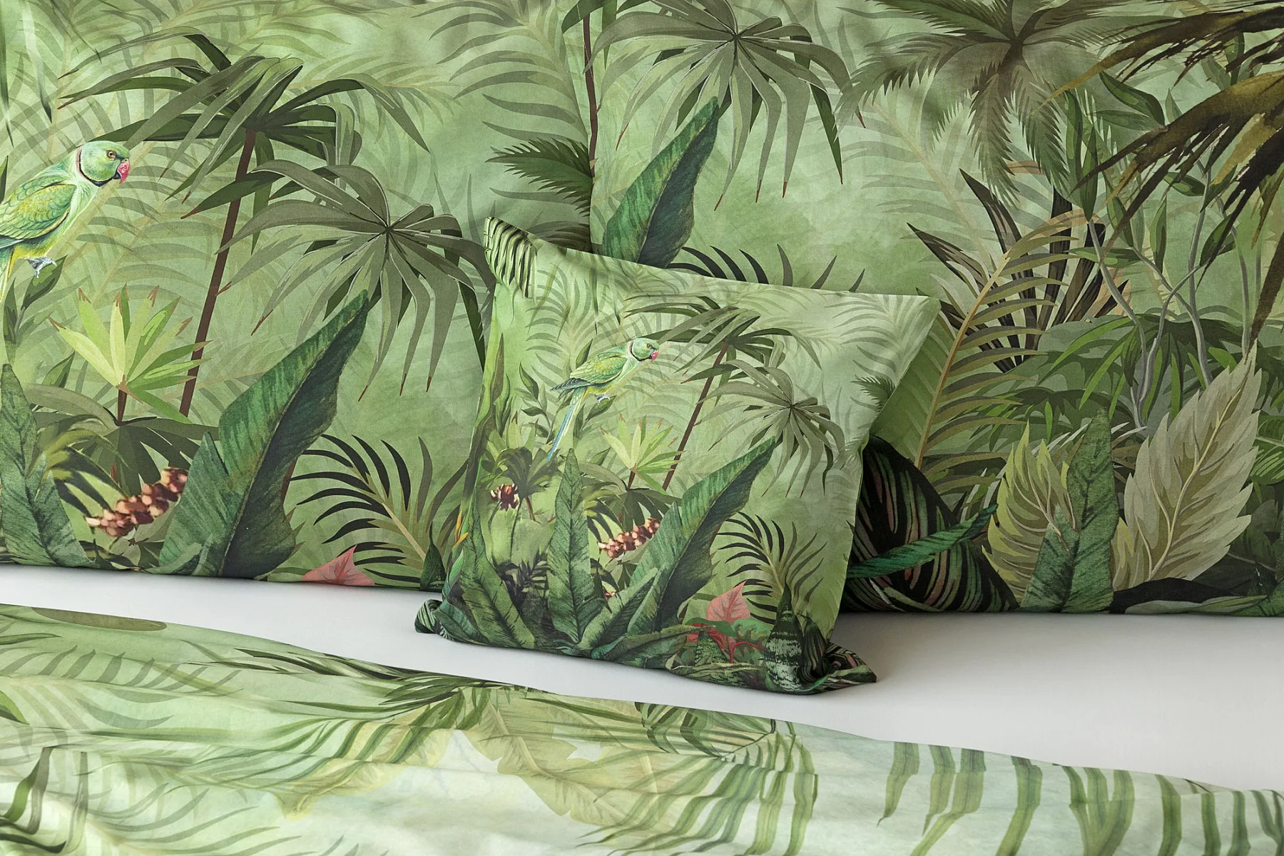 Pokud zrovna nejste na dovolené, nic si z toho nedělejte. S ložním povlečením Exotica si můžete vytvořit vlastní oázu svěžesti a pohody doma v ložnici. Exotický motiv v pestré paletě zelených tónů vyzařuje pozitivní energii, se kterou se budete probouzet do krásných letních dnů.