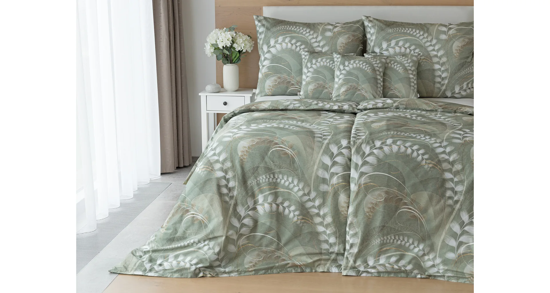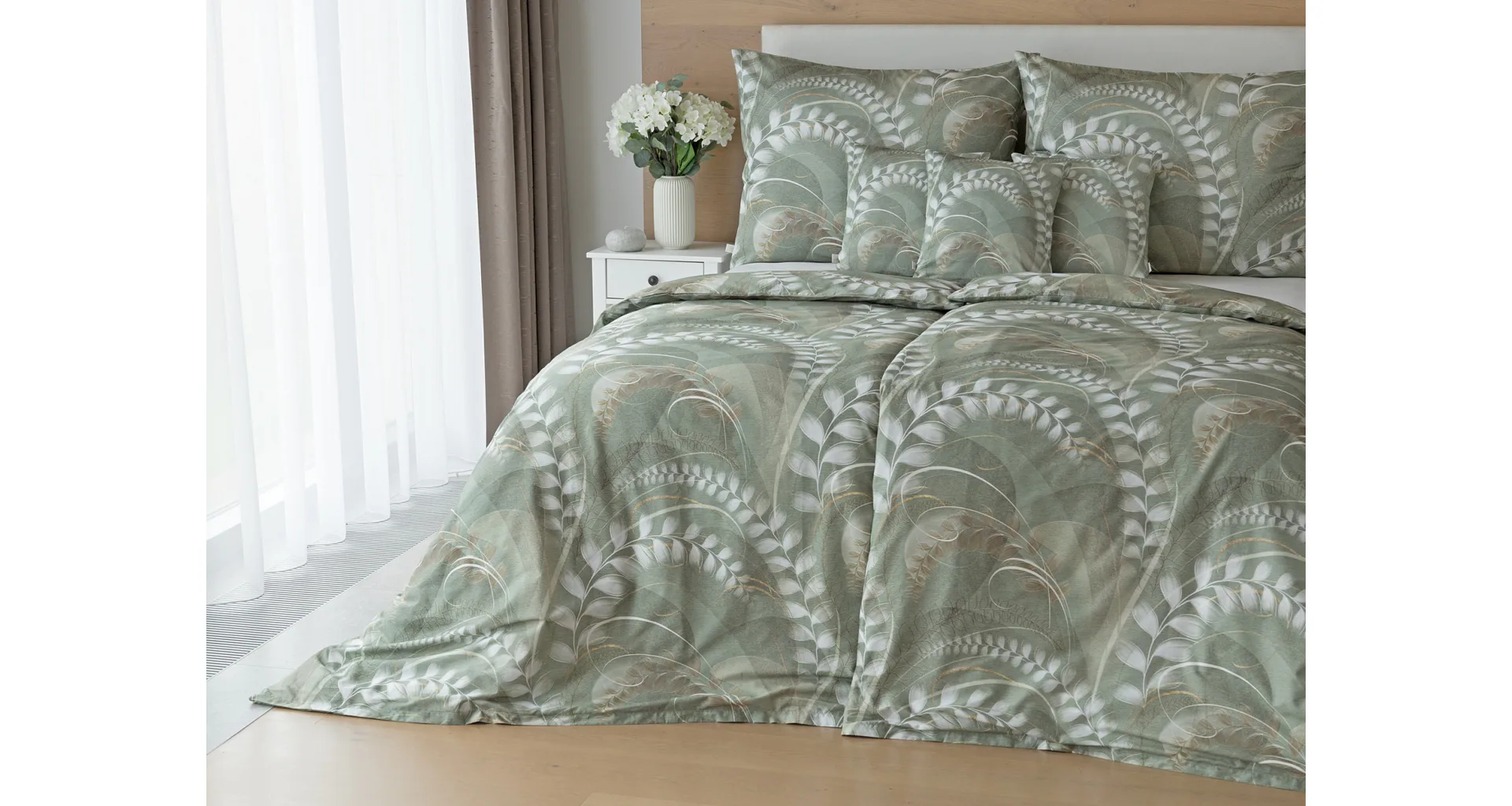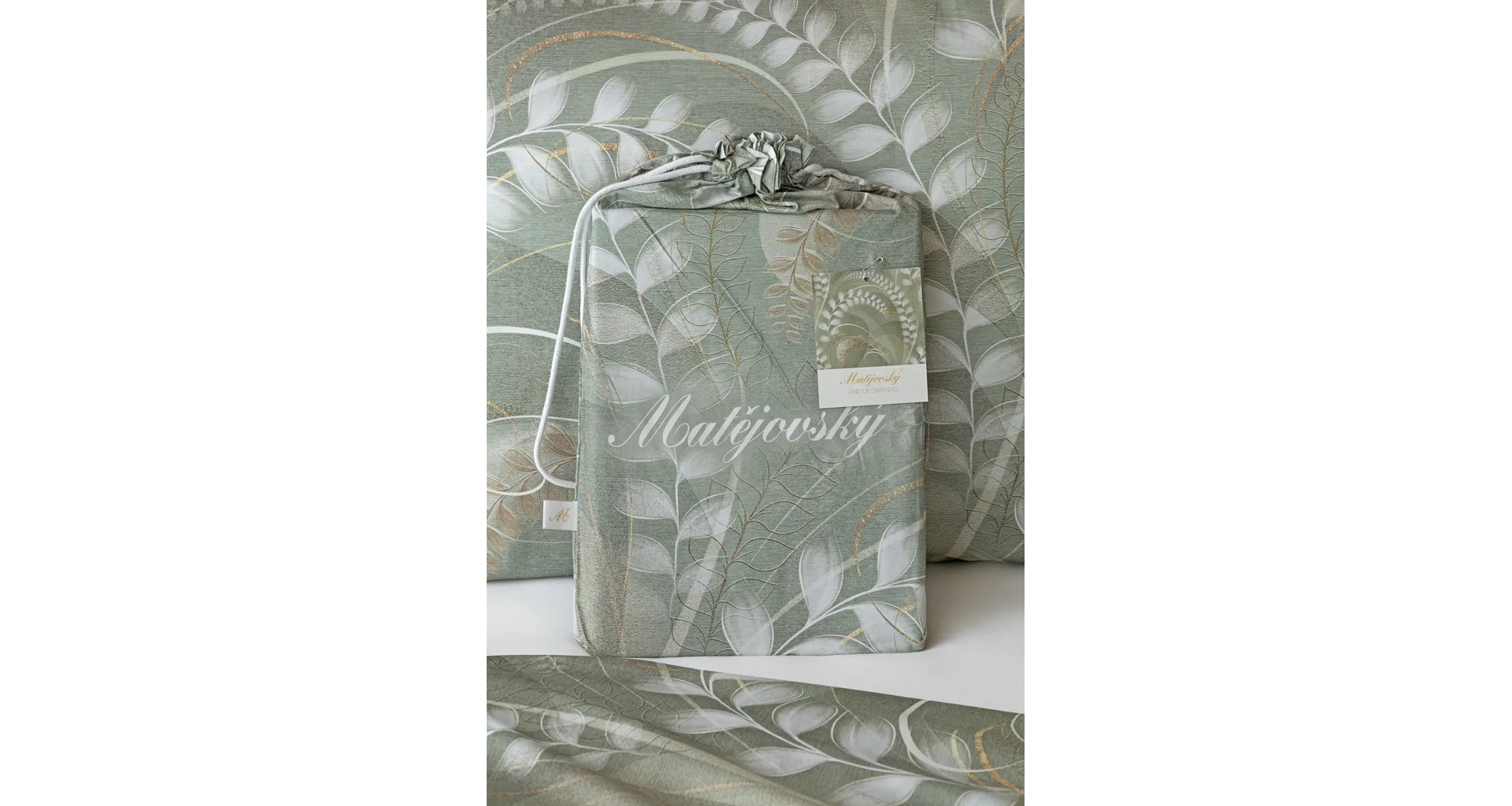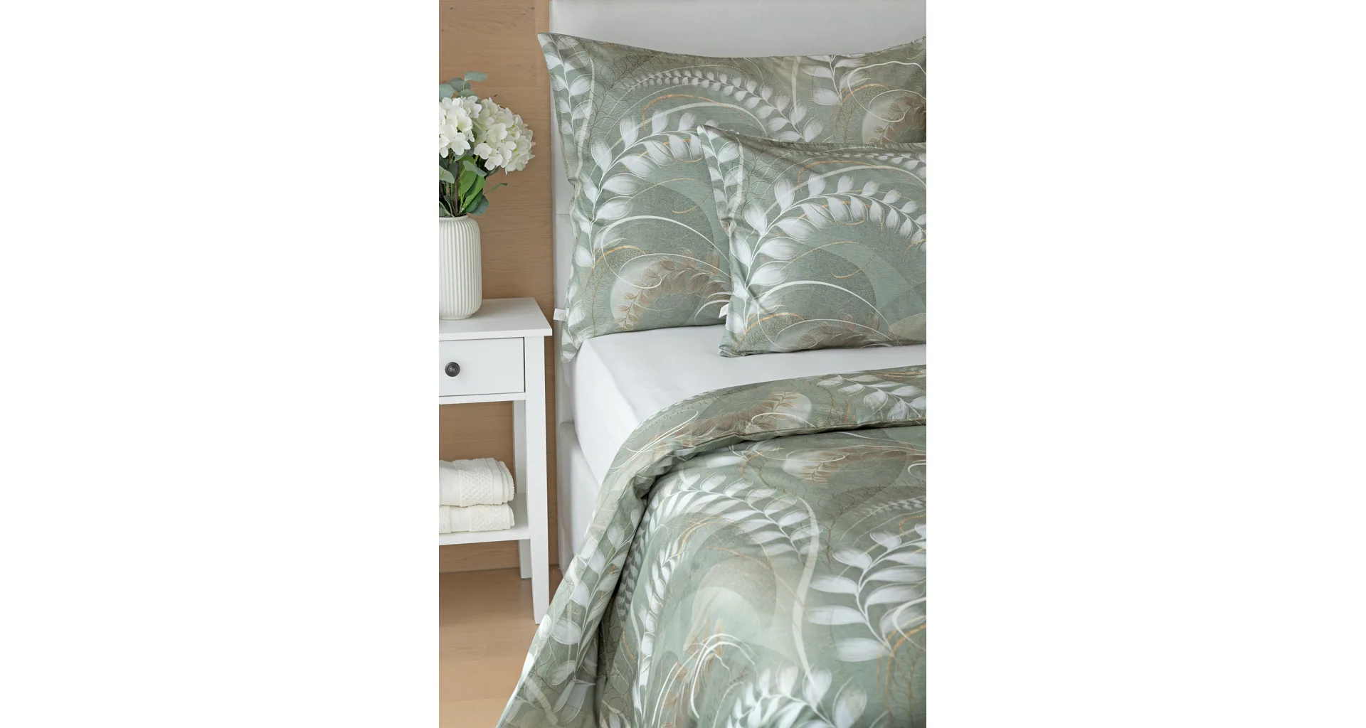Vzor Ezra zdobí elegantní florální motiv v paletě krémových a zlatohnědých tónů na tlumeném zelenošedém podkladu. Povlak na polštář i na přikrývku je z obou stran stejný, povlečení je opatřeno komfortním zipovým uzávěrem.