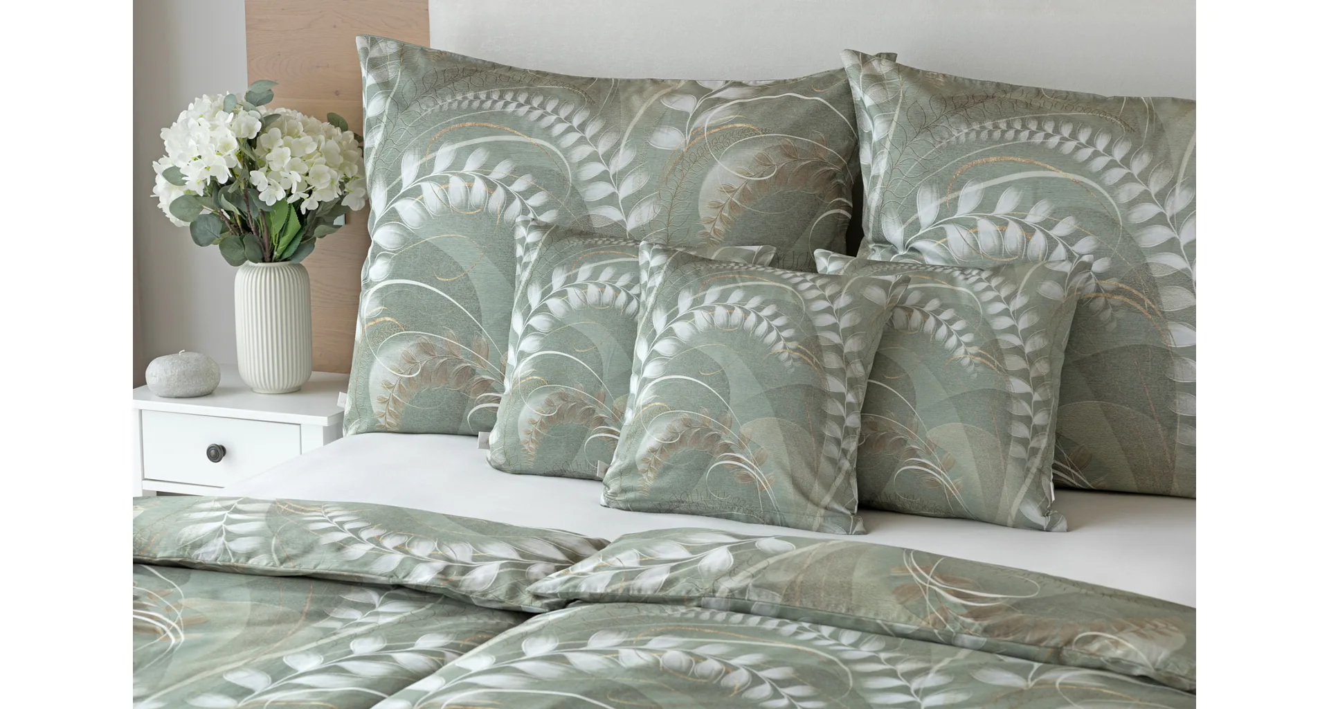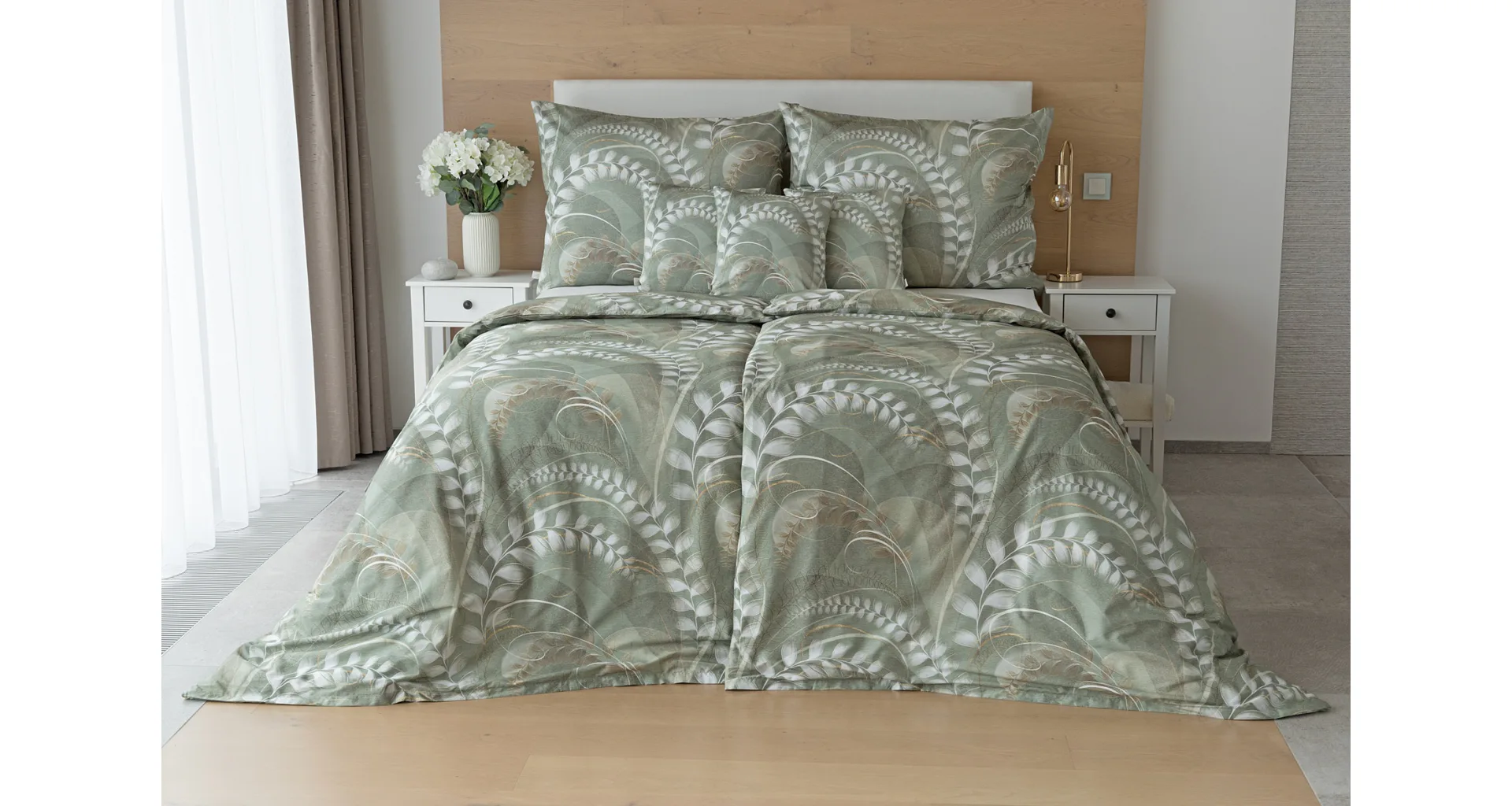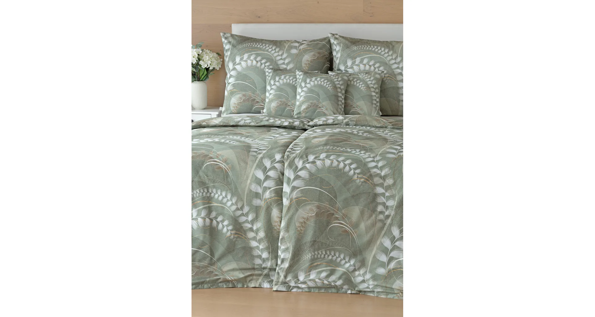 Vzor Ezra zdobí elegantní florální motiv v paletě krémových a zlatohnědých tónů na tlumeném zelenošedém podkladu. Povlak na polštář i na přikrývku je z obou stran stejný, povlečení je opatřeno komfortním zipovým uzávěrem.