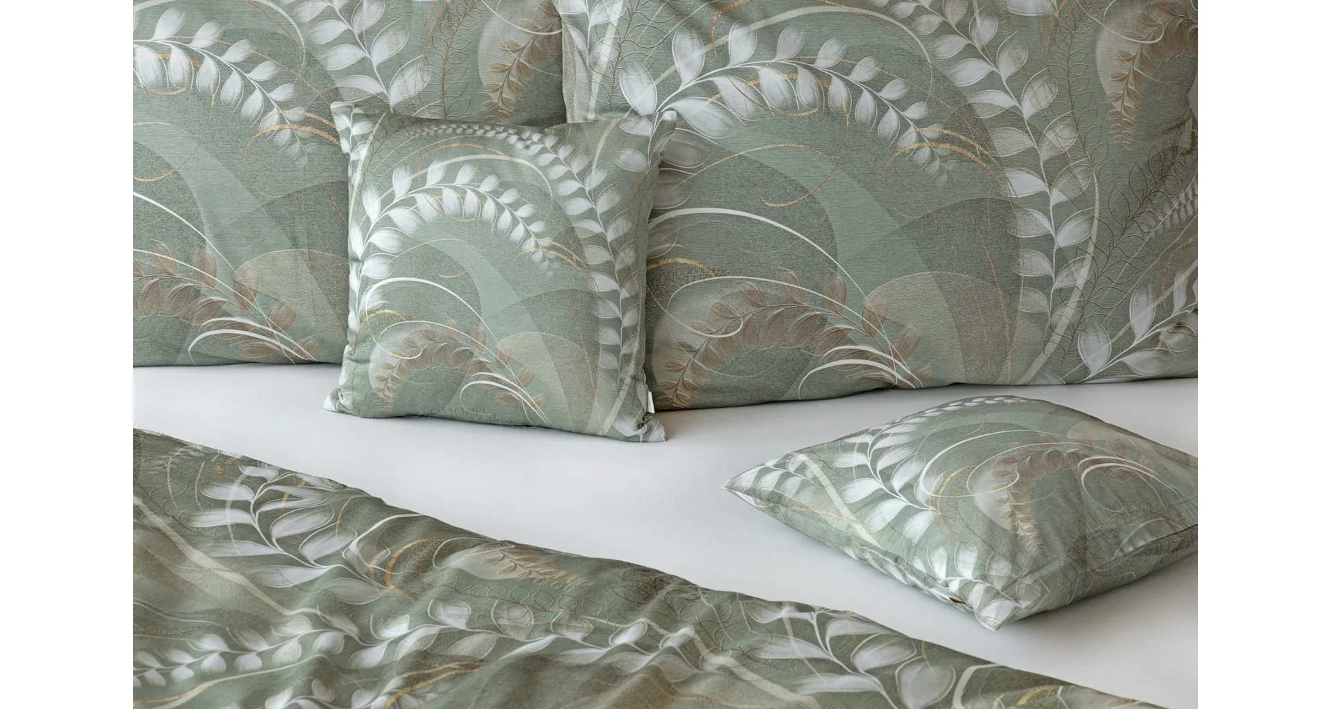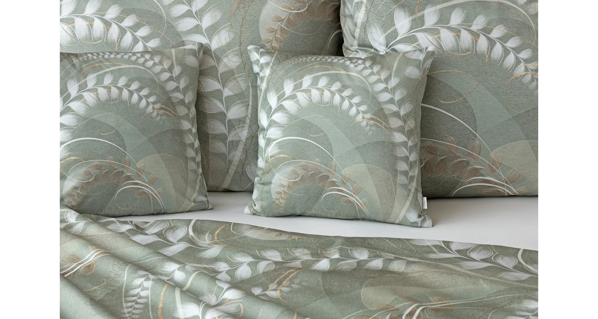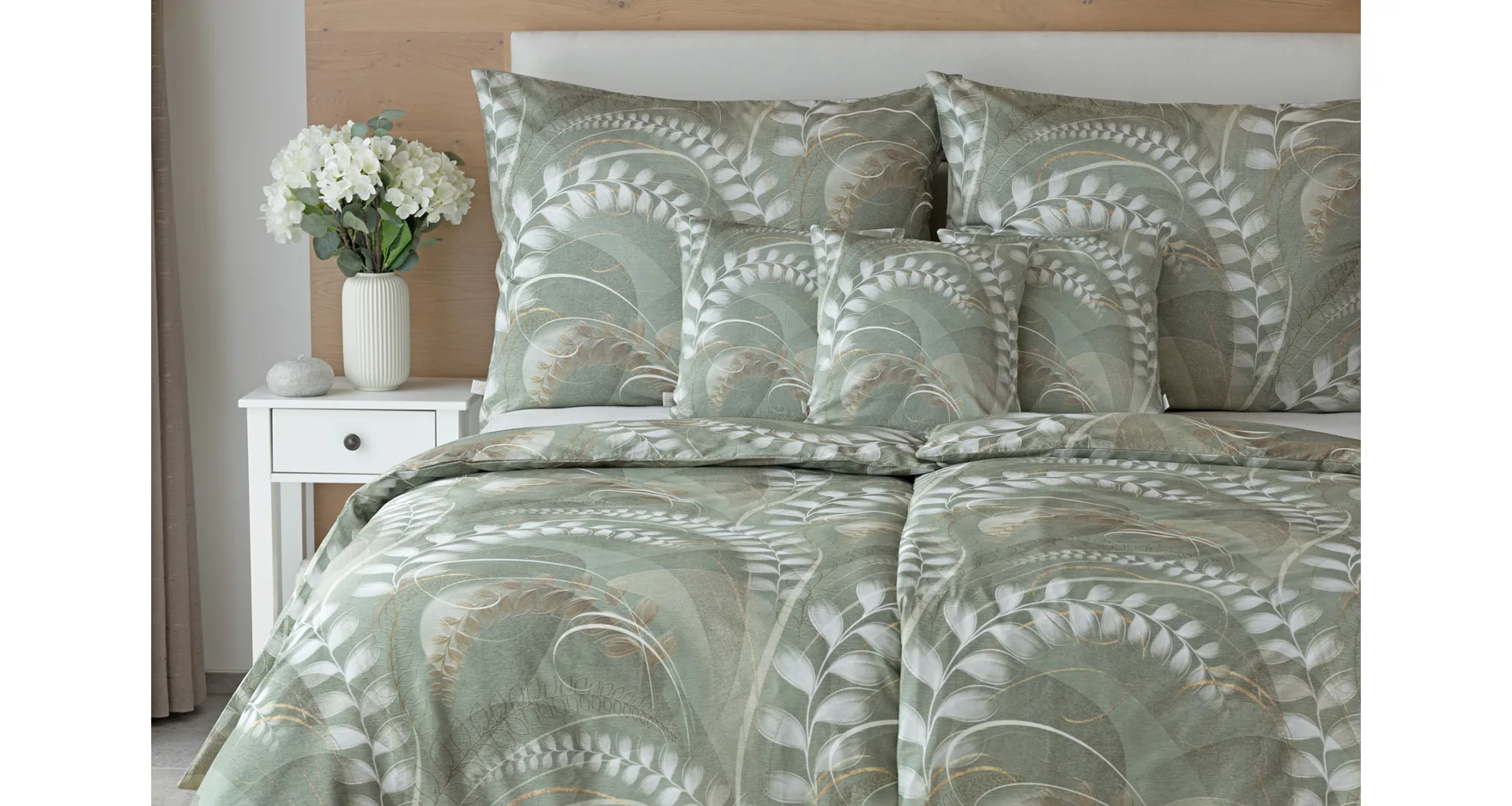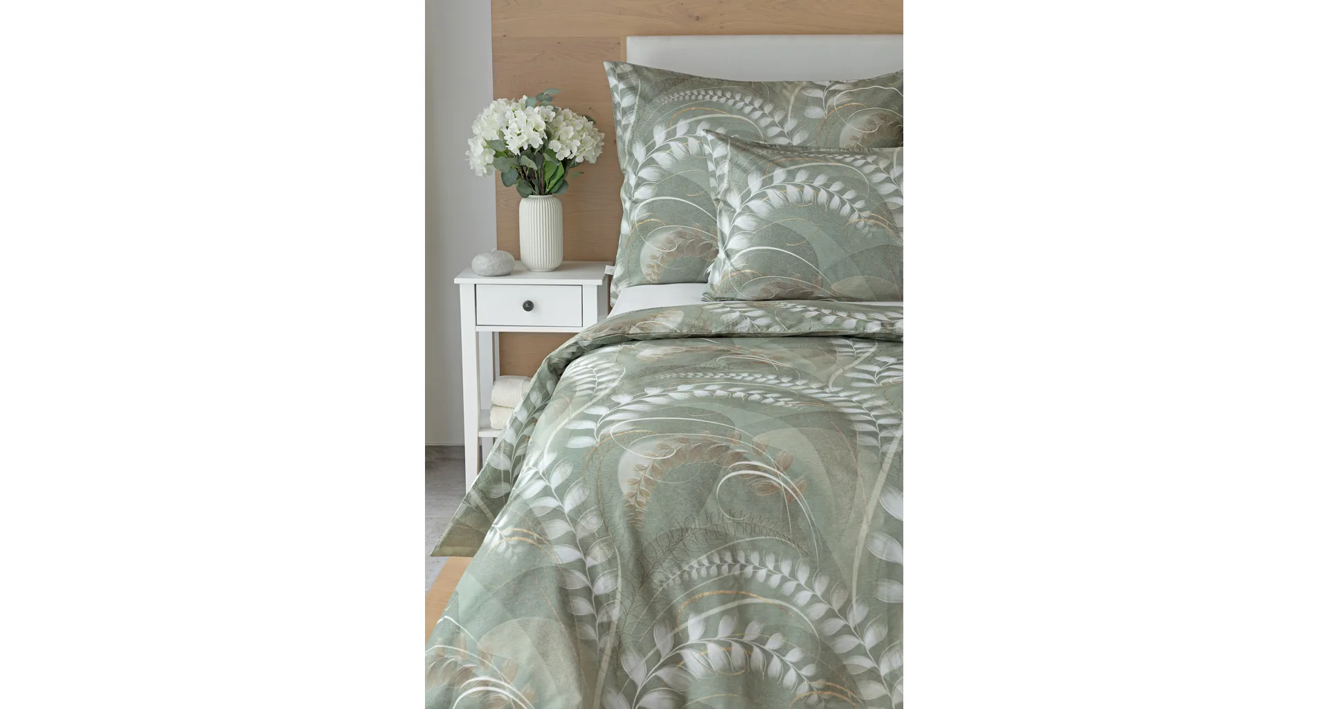 Vzor Ezra zdobí elegantní florální motiv v paletě krémových a zlatohnědých tónů na tlumeném zelenošedém podkladu. Povlak na polštář i na přikrývku je z obou stran stejný, povlečení je opatřeno komfortním zipovým uzávěrem.