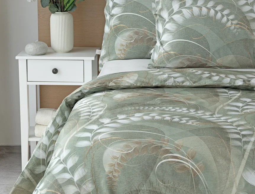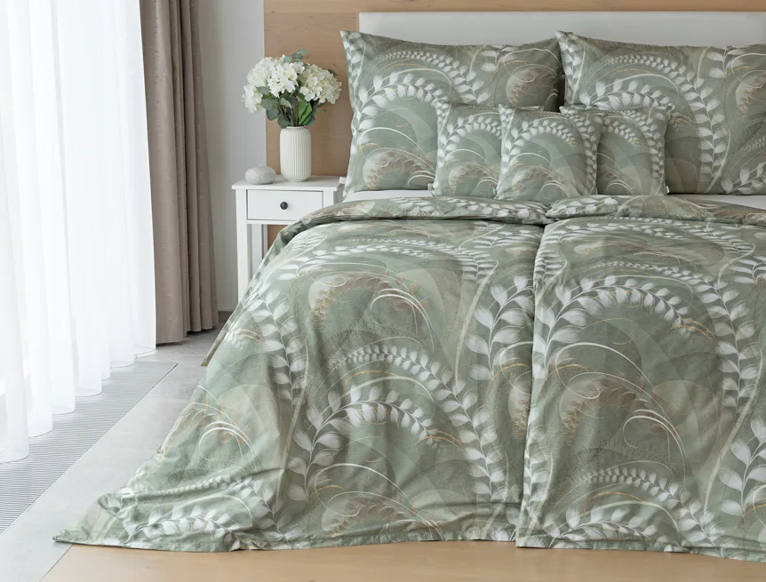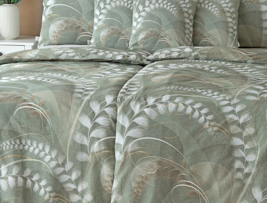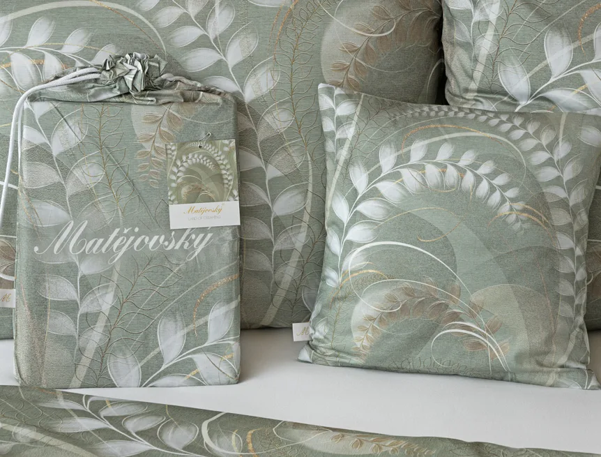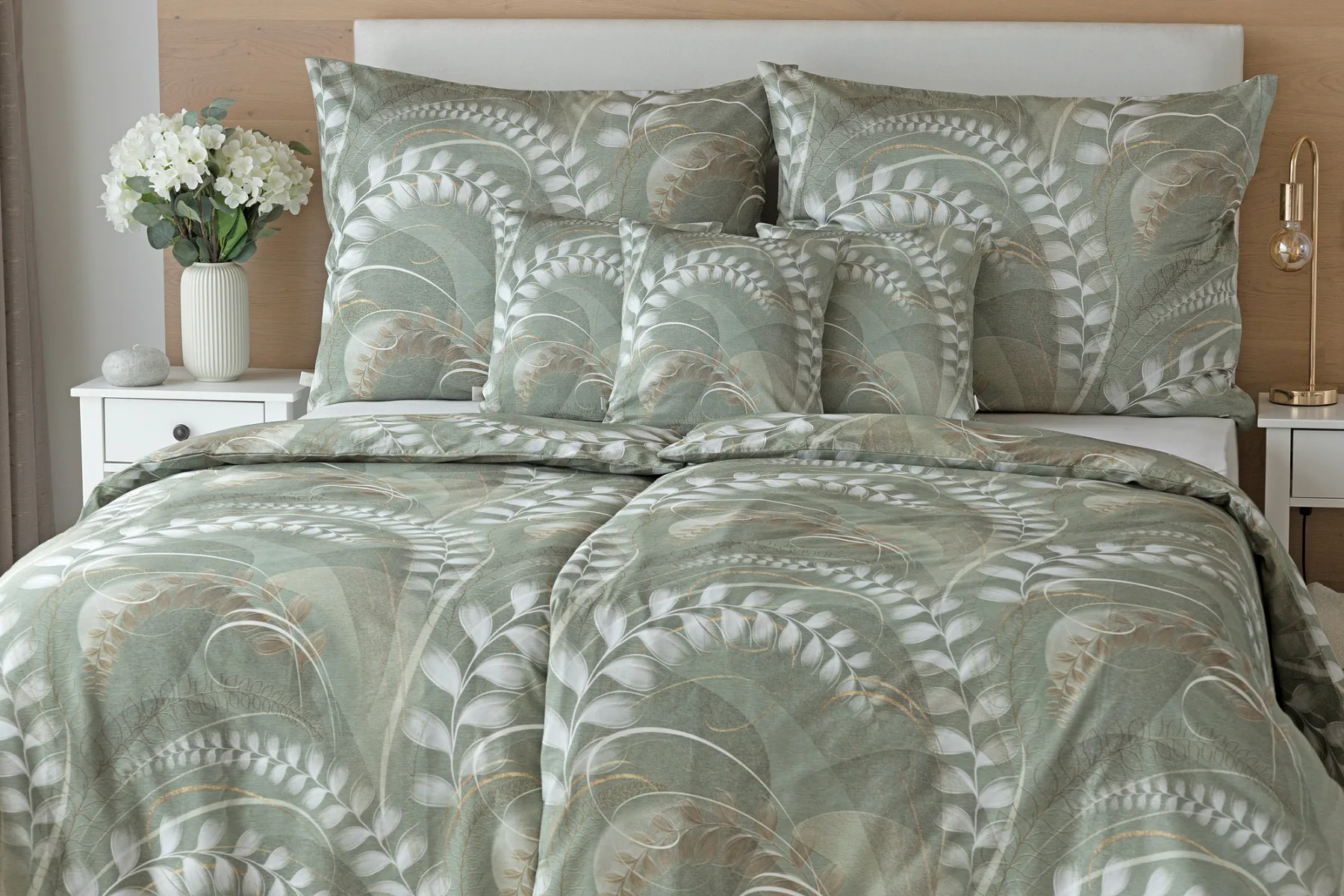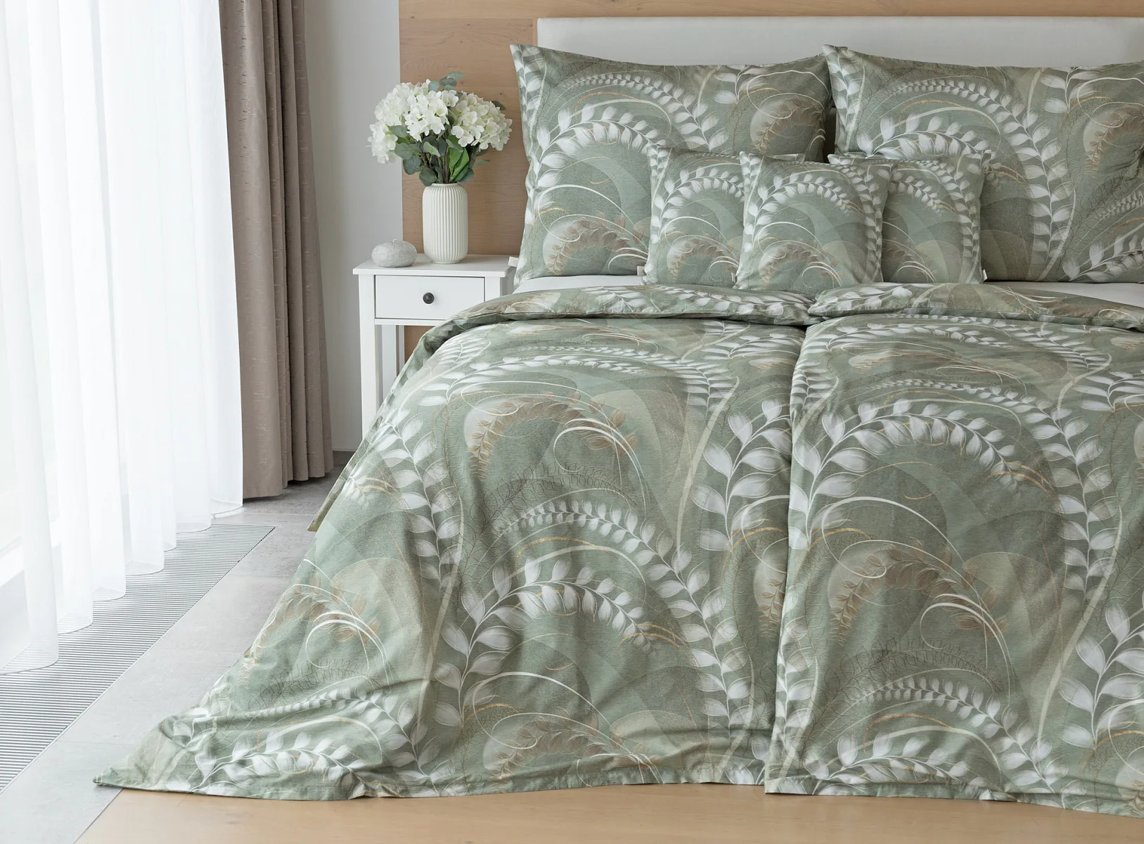 Vzor Ezra zdobí elegantní florální motiv v paletě krémových a zlatohnědých tónů na tlumeném zelenošedém podkladu. Povlak na polštář i na přikrývku je z obou stran stejný, povlečení je opatřeno komfortním zipovým uzávěrem.