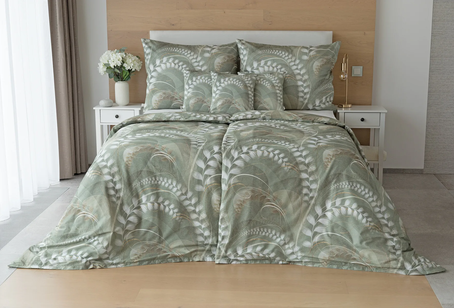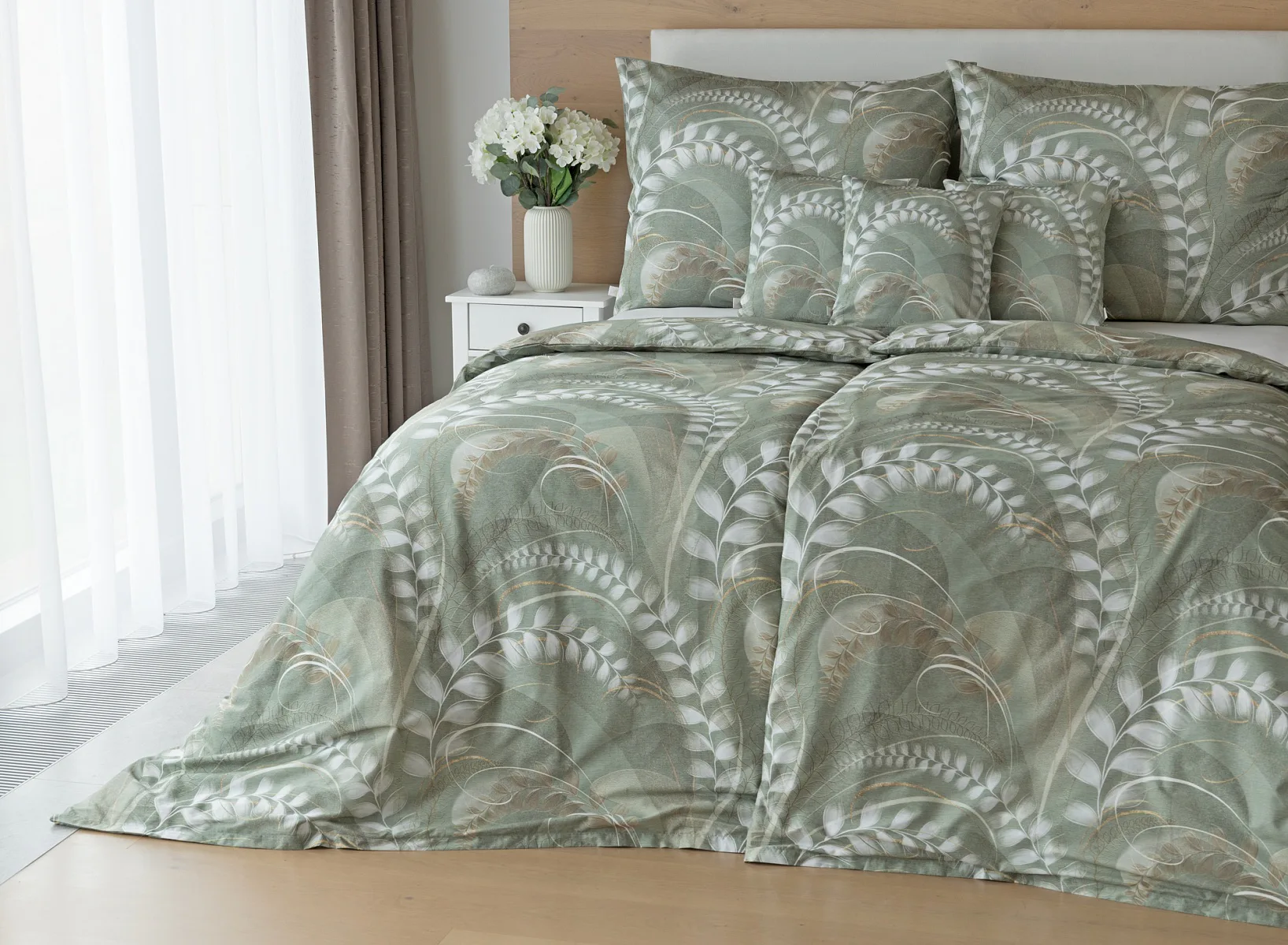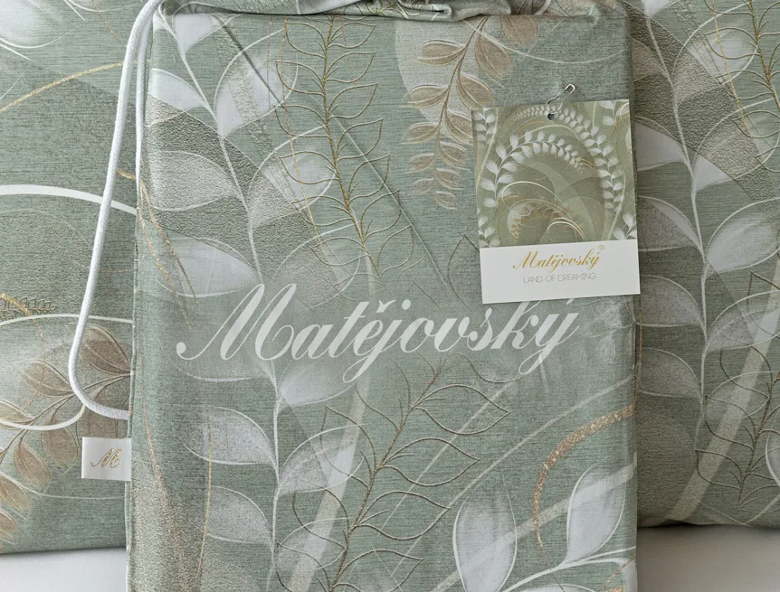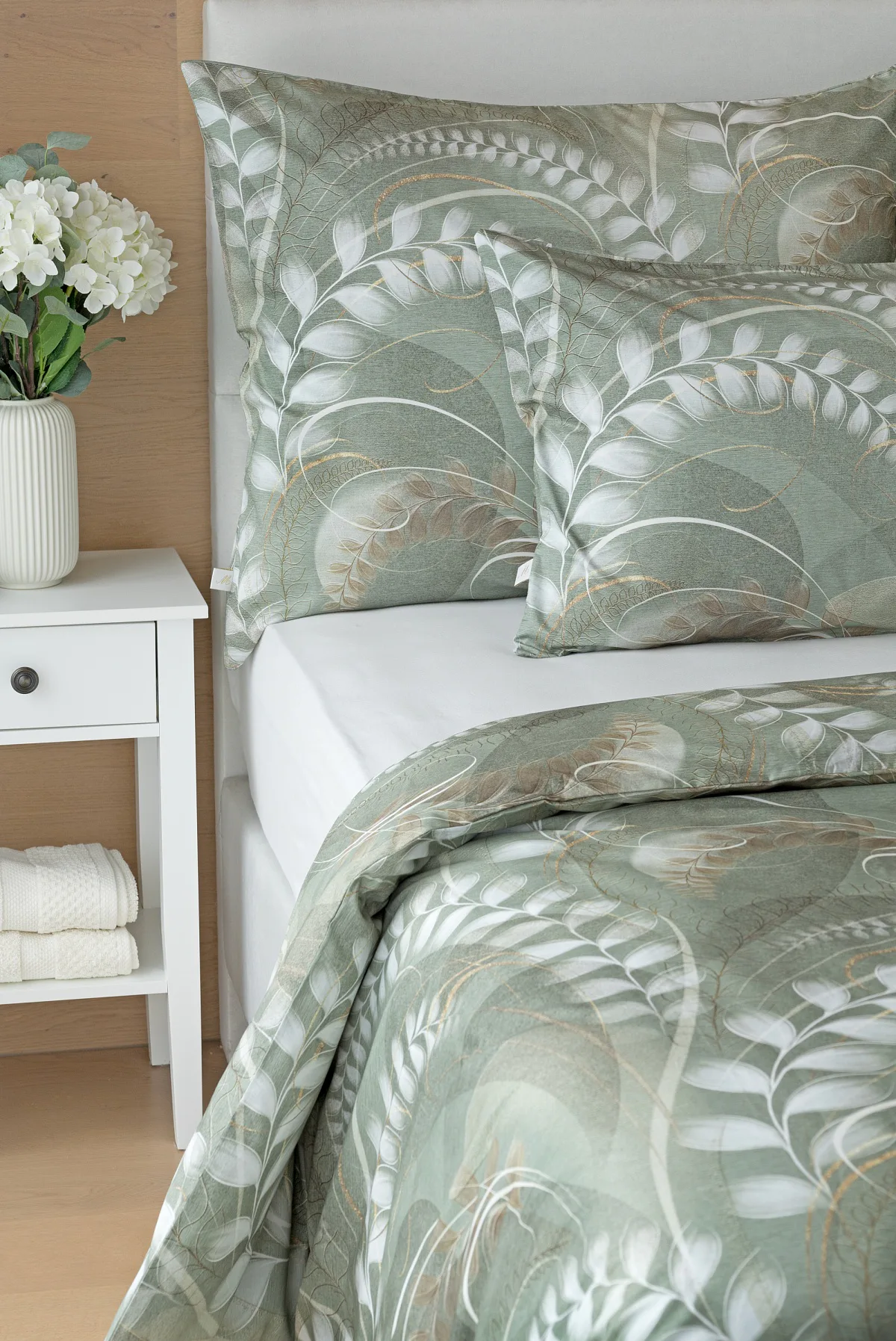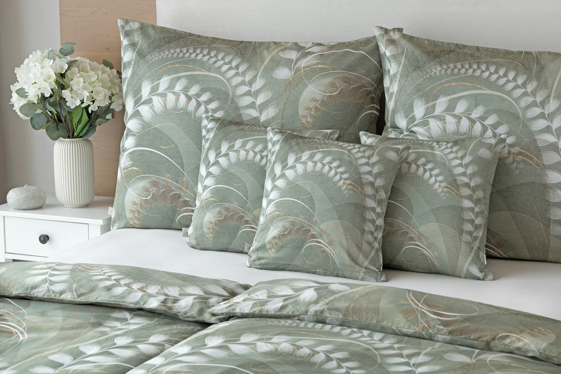 Vzor Ezra zdobí elegantní florální motiv v paletě krémových a zlatohnědých tónů na tlumeném zelenošedém podkladu. Povlak na polštář i na přikrývku je z obou stran stejný, povlečení je opatřeno komfortním zipovým uzávěrem.