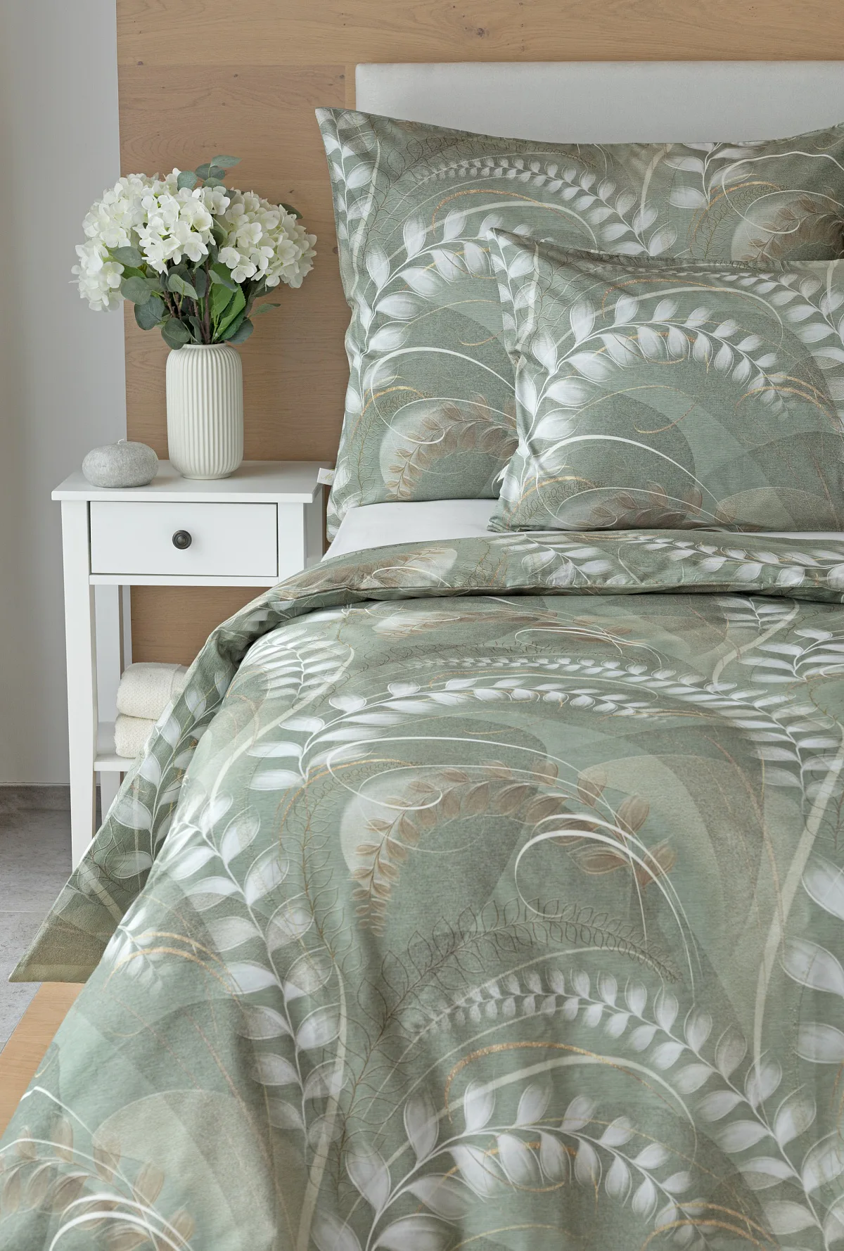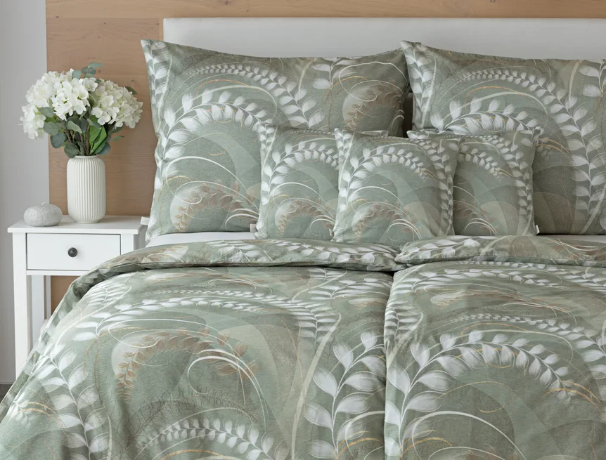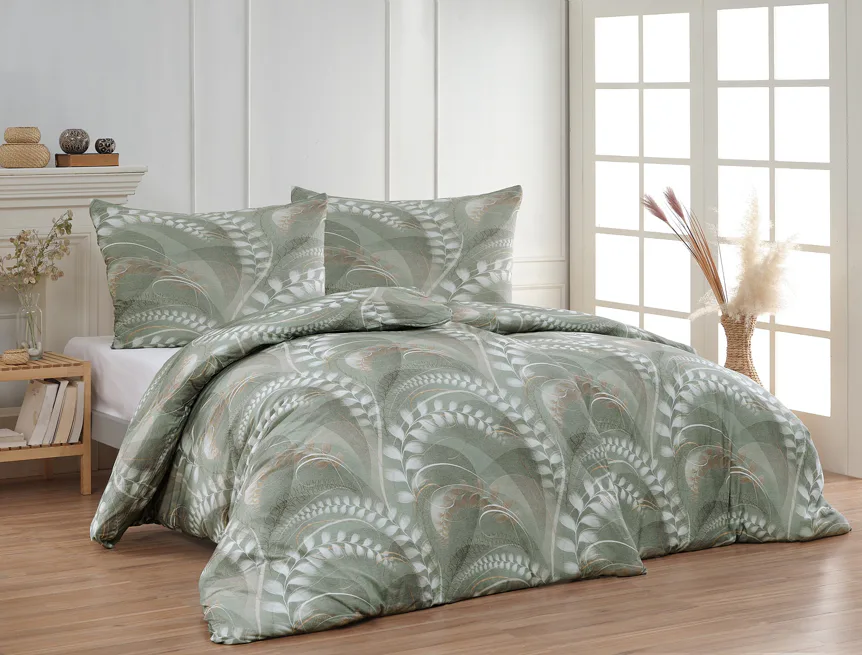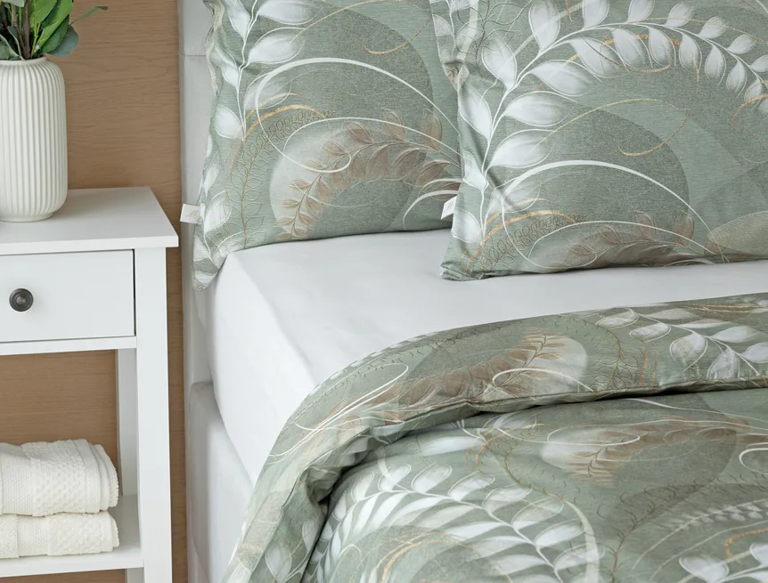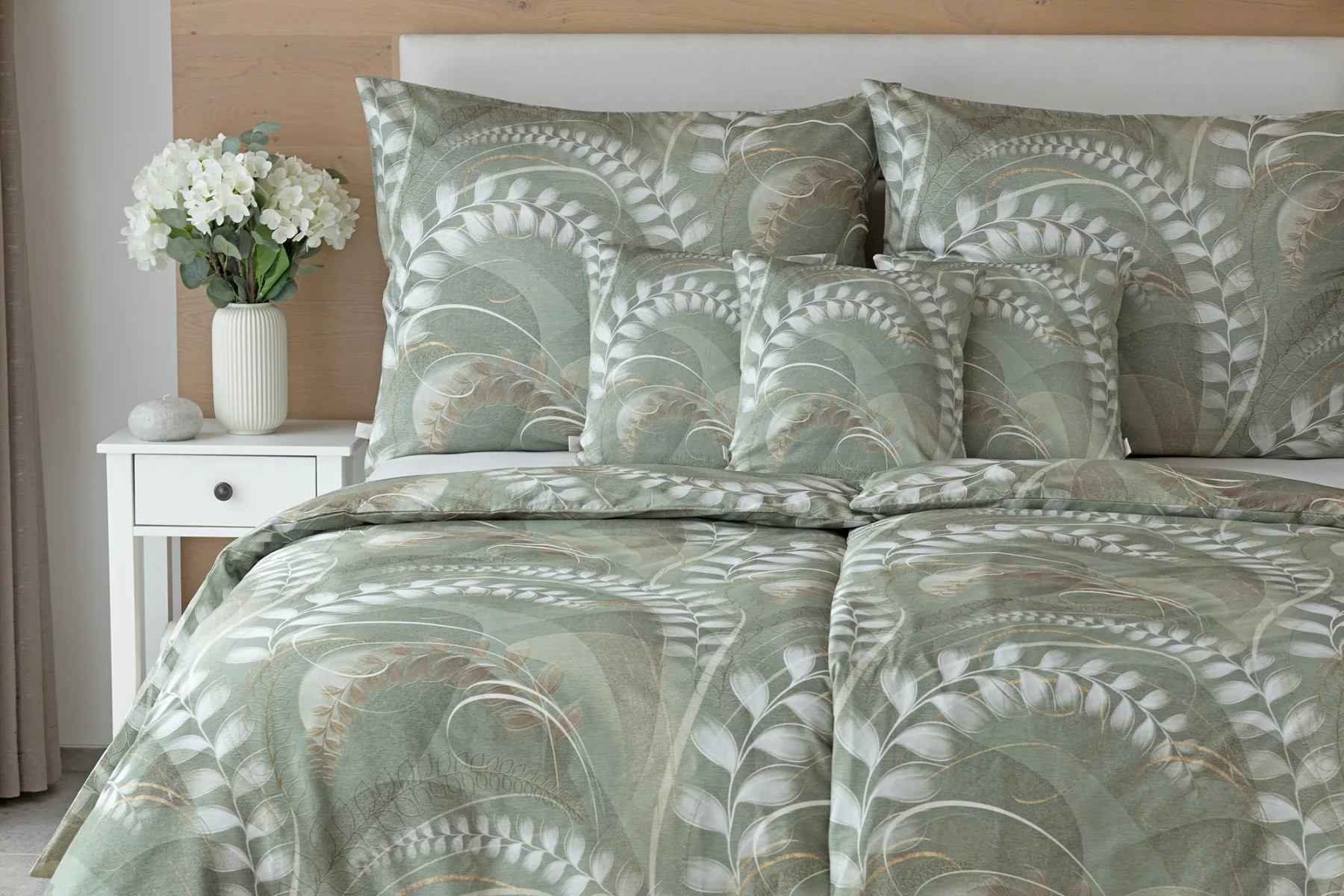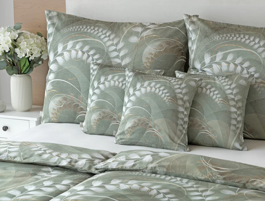 Vzor Ezra zdobí elegantní florální motiv v paletě krémových a zlatohnědých tónů na tlumeném zelenošedém podkladu. Povlak na polštář i na přikrývku je z obou stran stejný, povlečení je opatřeno komfortním zipovým uzávěrem.