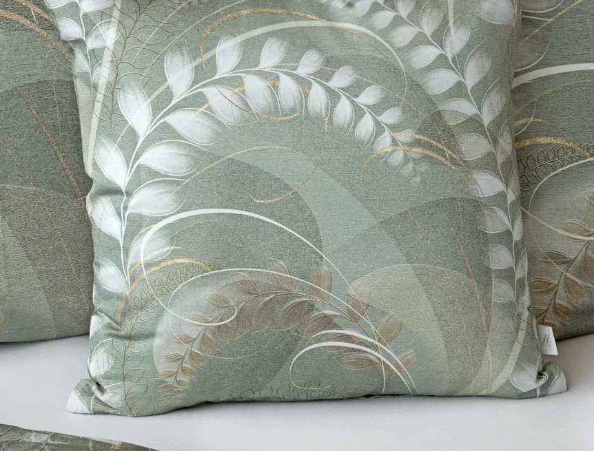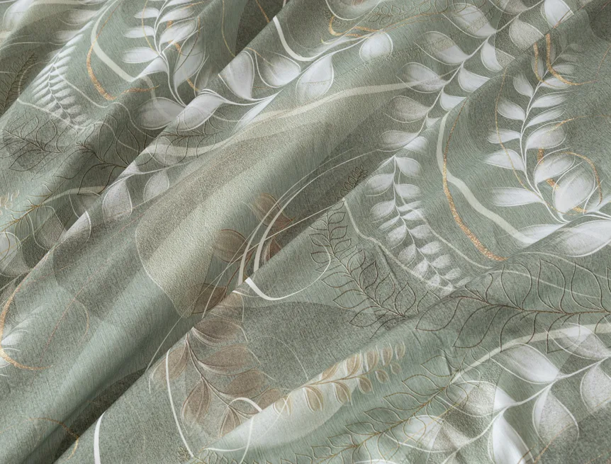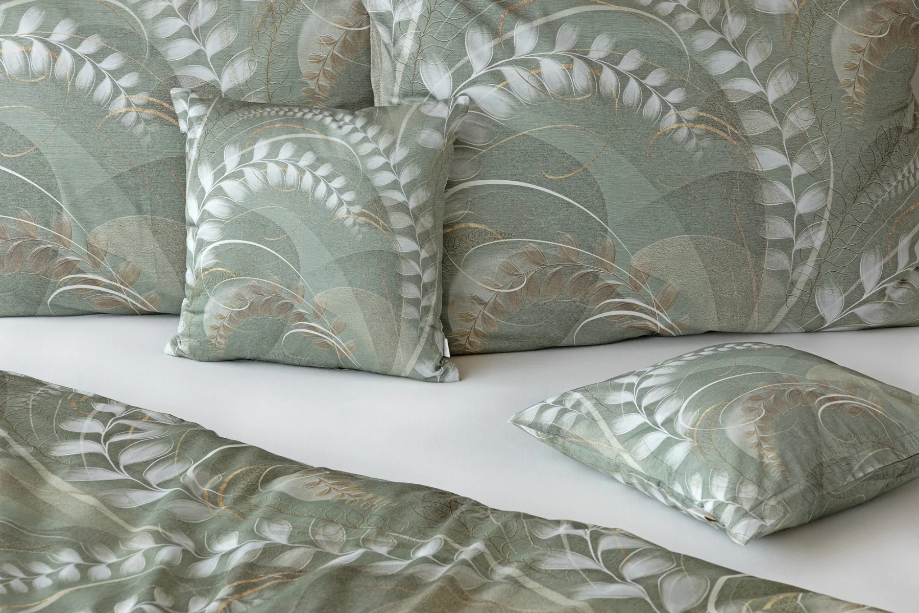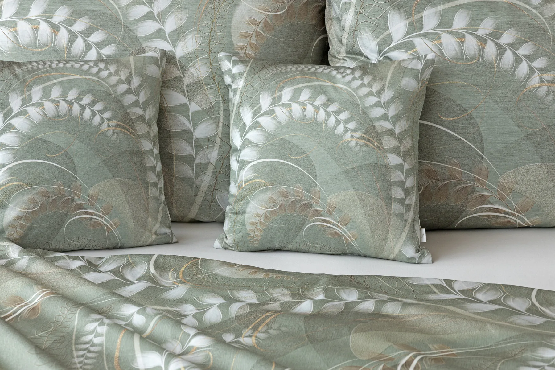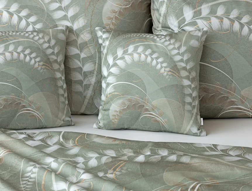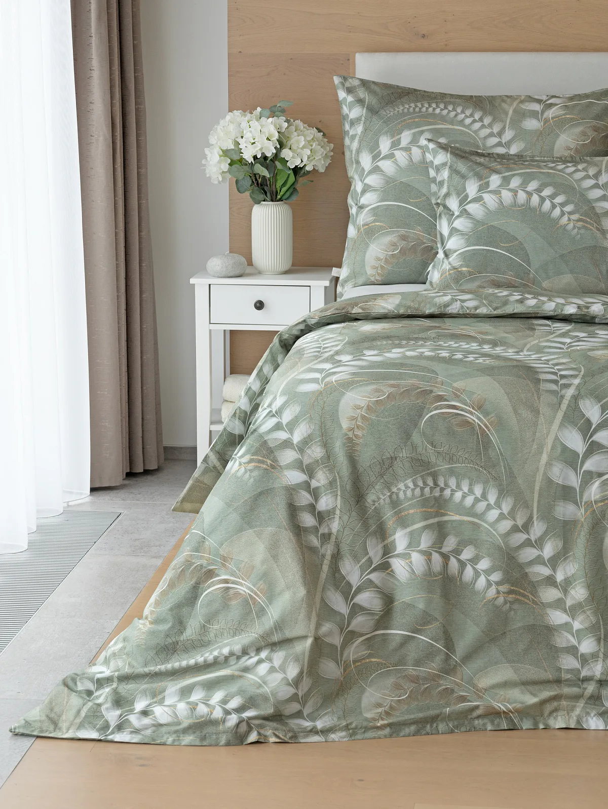 Vzor Ezra zdobí elegantní florální motiv v paletě krémových a zlatohnědých tónů na tlumeném zelenošedém podkladu. Povlak na polštář i na přikrývku je z obou stran stejný, povlečení je opatřeno komfortním zipovým uzávěrem.