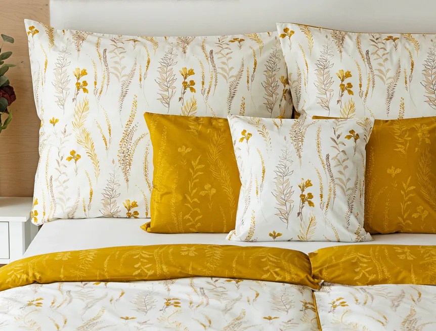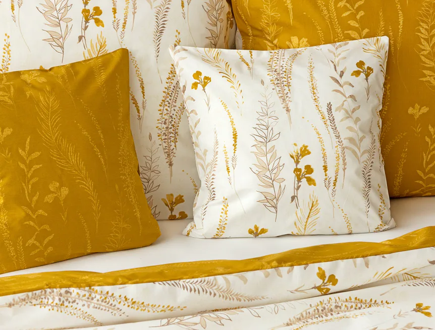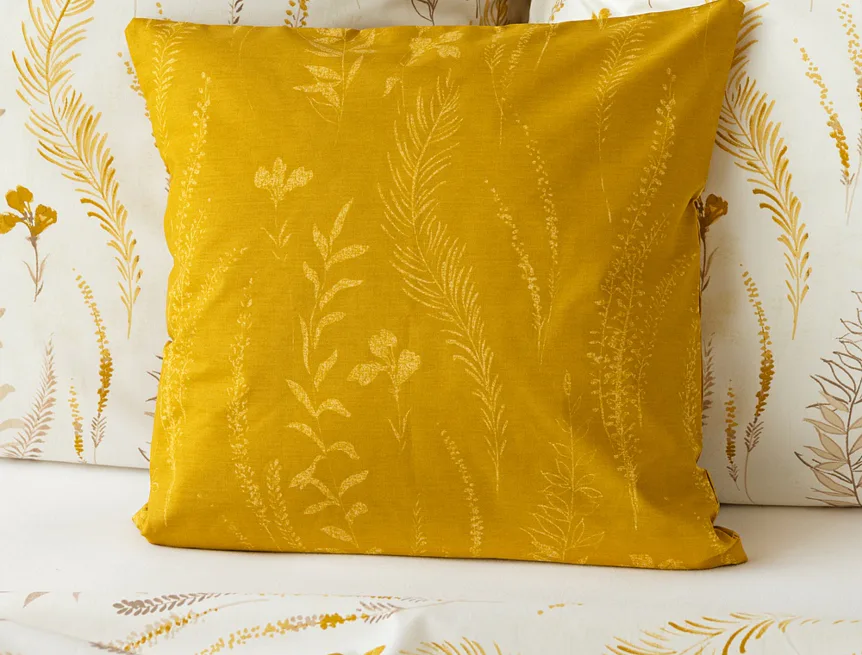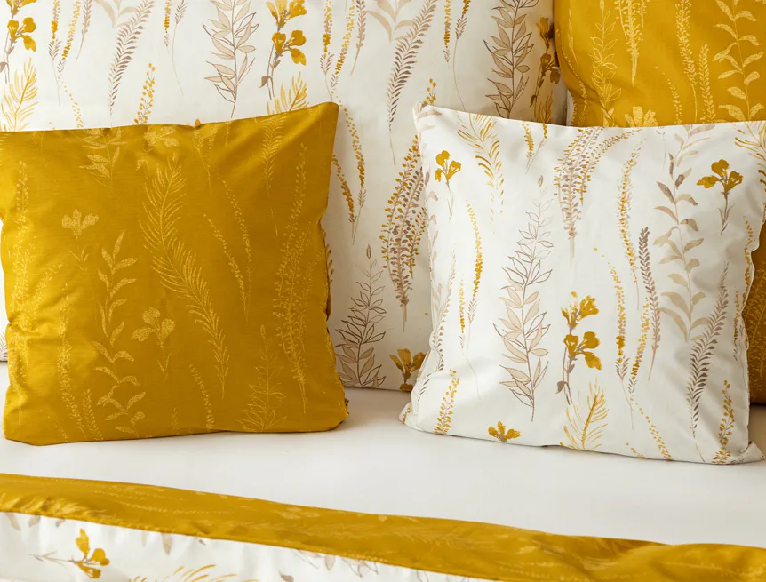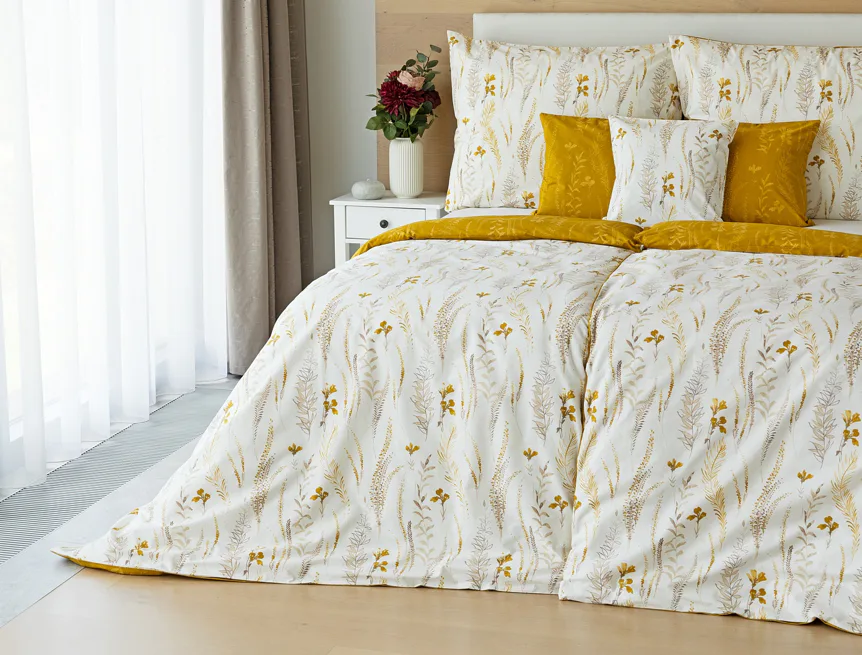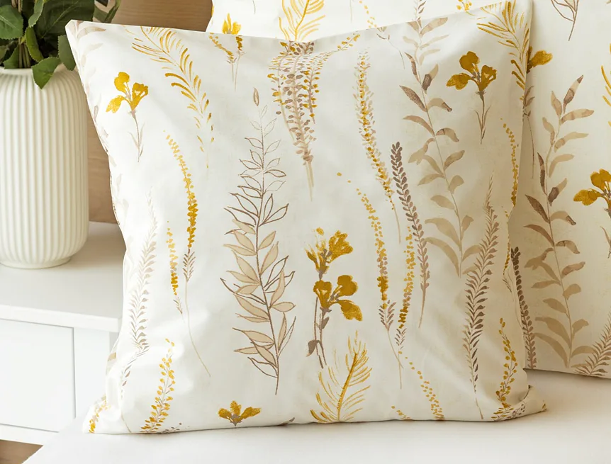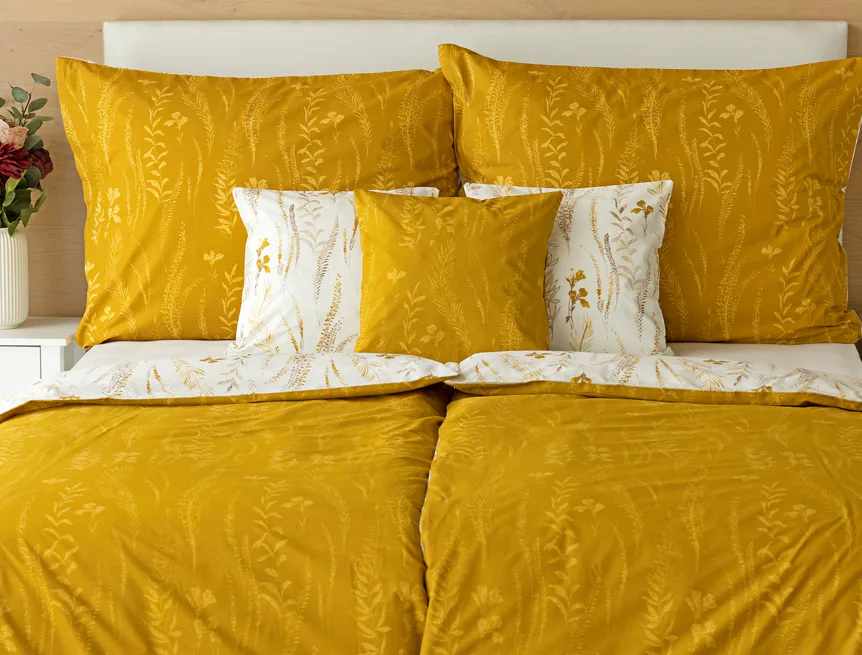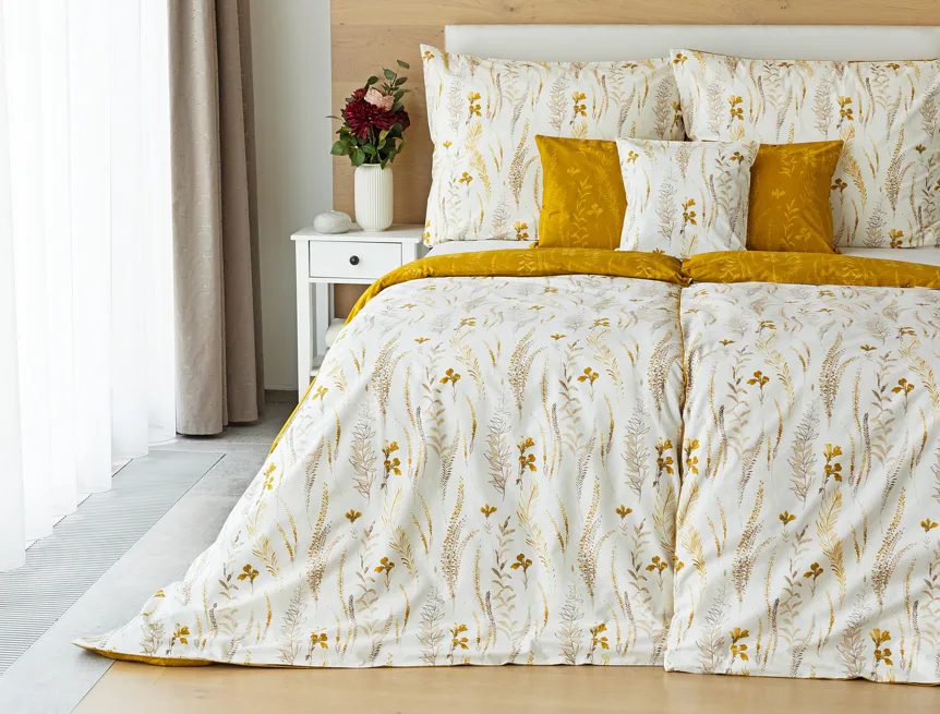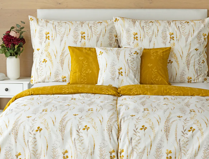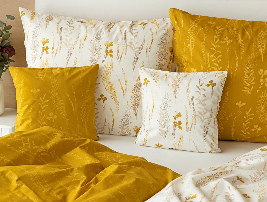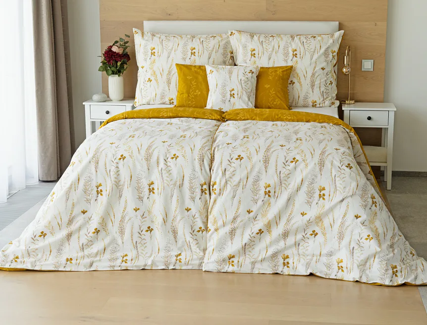 Nechte se okouzlit hřejivou souhrou barev v květinovém vzoru bavlněného povlečení Fabien. Jemný florální motiv v paletě hnědých a medově žlutých tónů se vyjímá z jedné strany na krémovém podkladu. Z druhé strany jsou světlé kontury květů zaneseny do medově žlutého podkladu. Díky tomuto oblíbenému oboustrannému provedení můžete při stlaní hravě experimentovat!