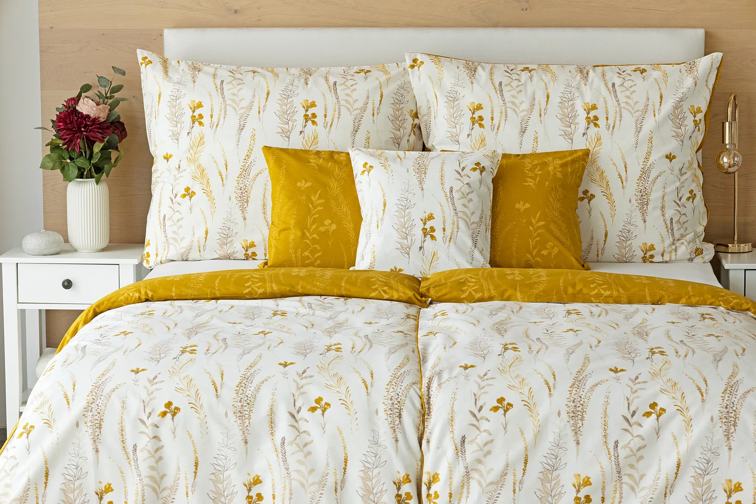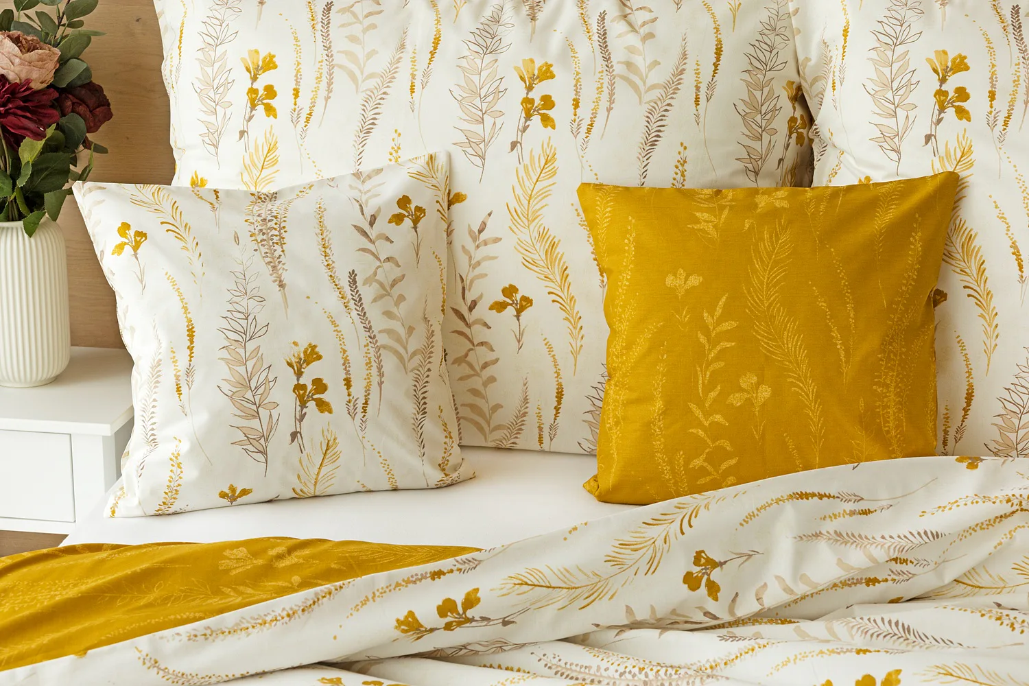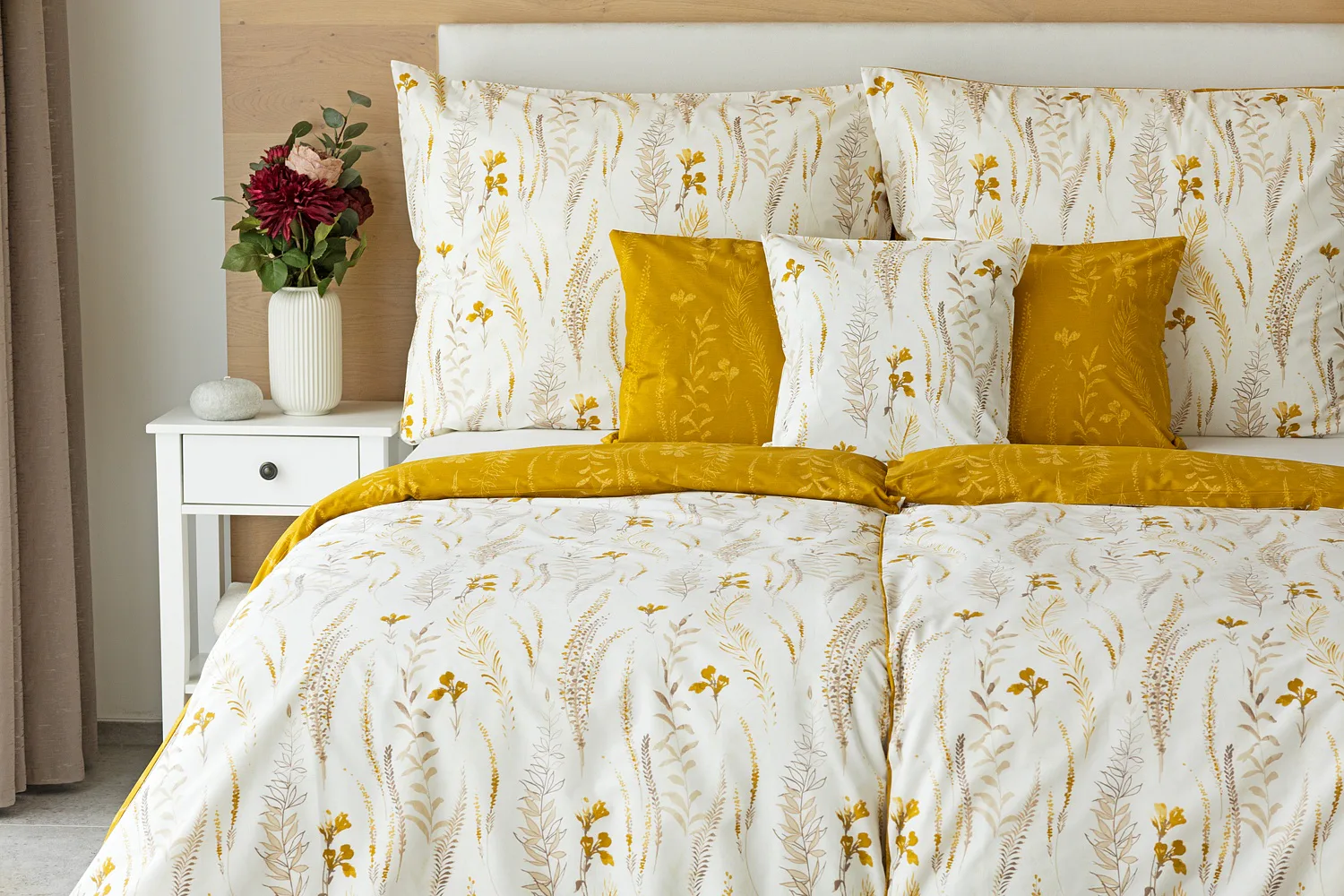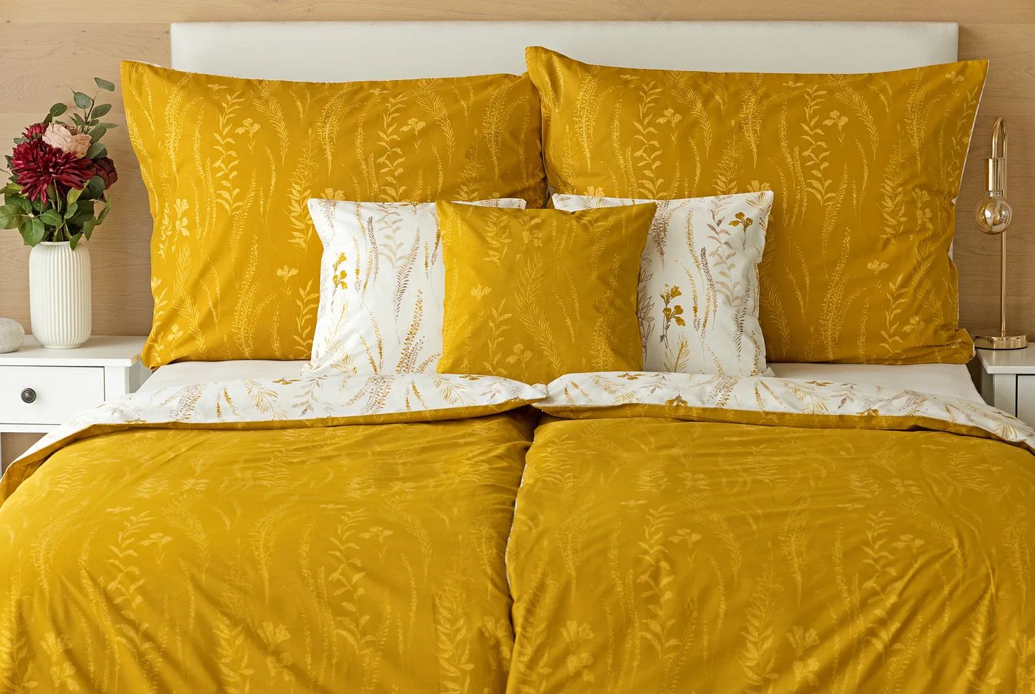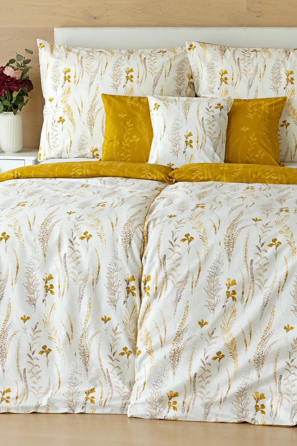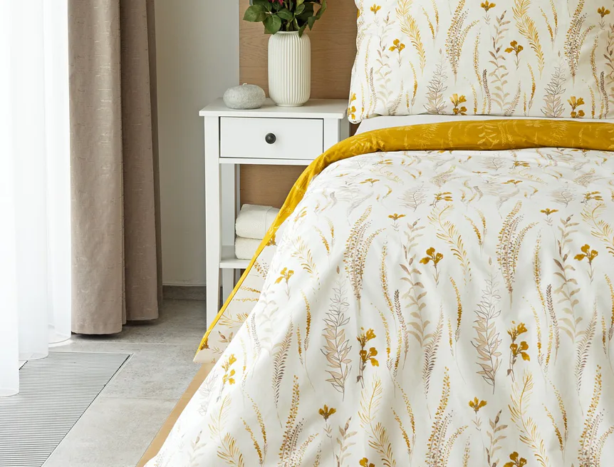 Nechte se okouzlit hřejivou souhrou barev v květinovém vzoru bavlněného povlečení Fabien. Jemný florální motiv v paletě hnědých a medově žlutých tónů se vyjímá z jedné strany na krémovém podkladu. Z druhé strany jsou světlé kontury květů zaneseny do medově žlutého podkladu. Díky tomuto oblíbenému oboustrannému provedení můžete při stlaní hravě experimentovat!