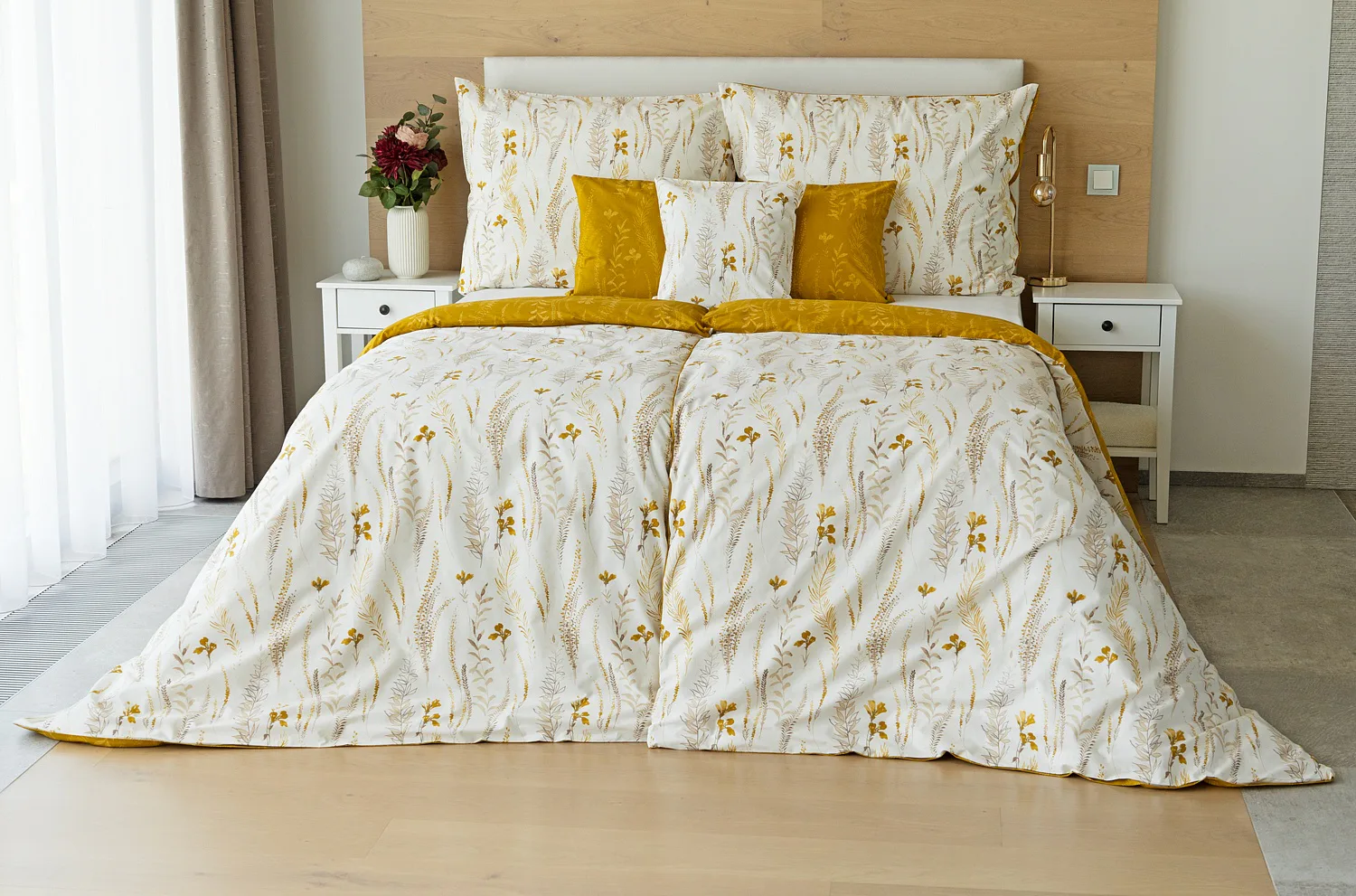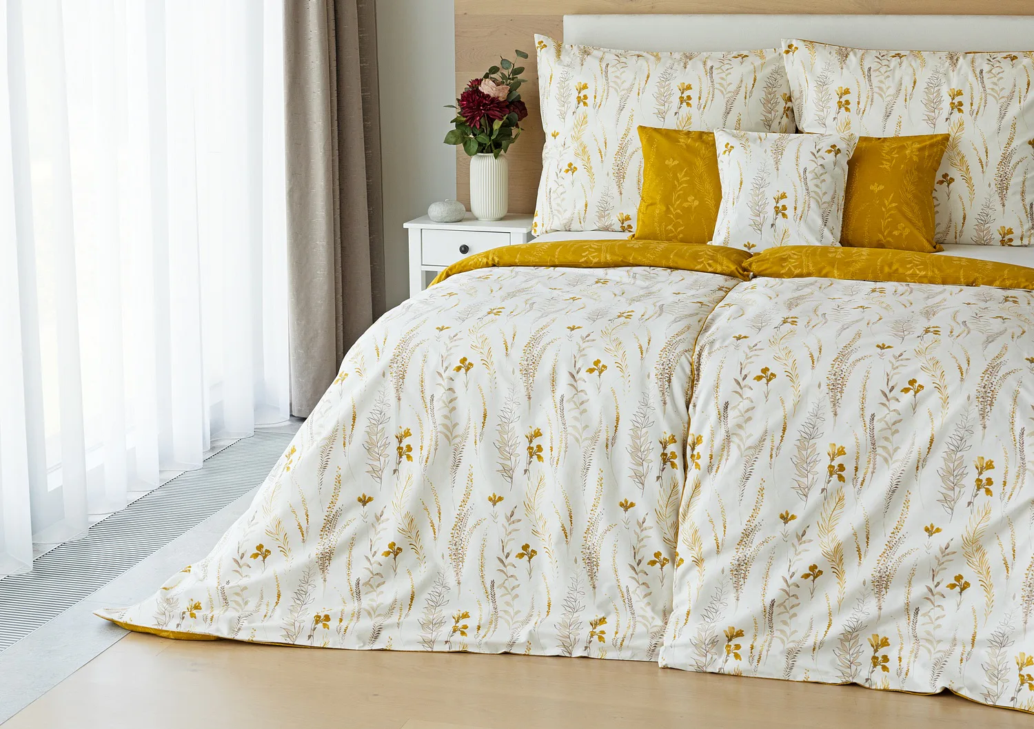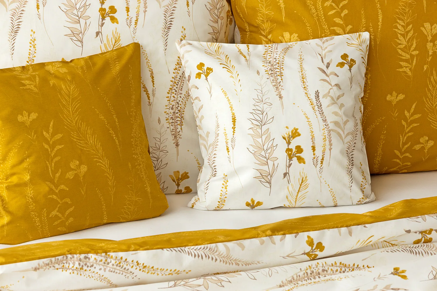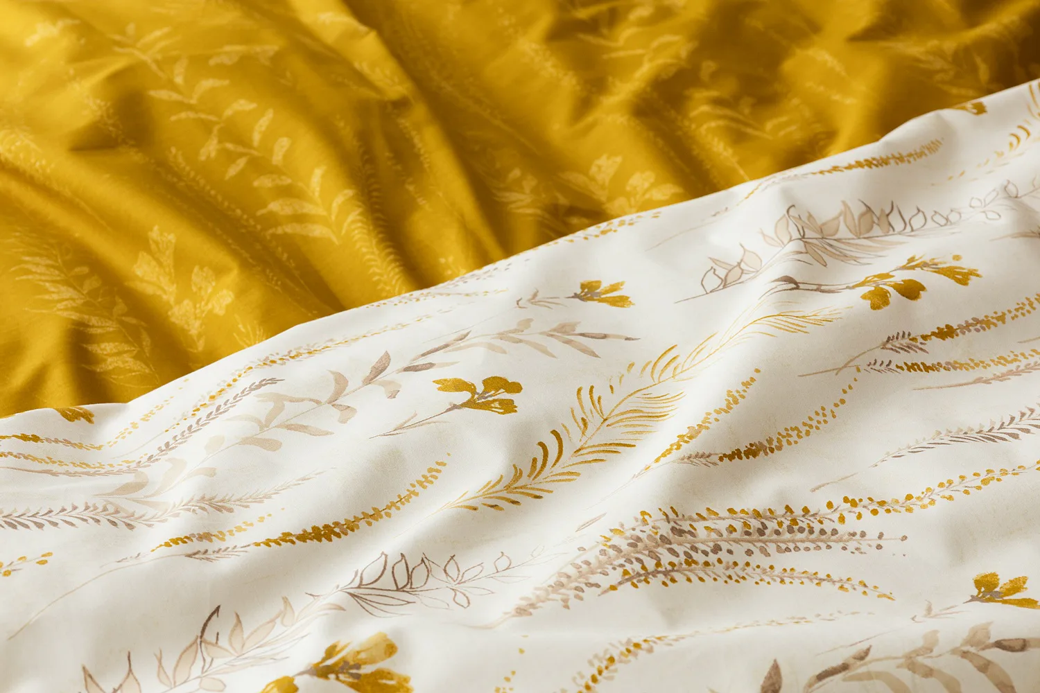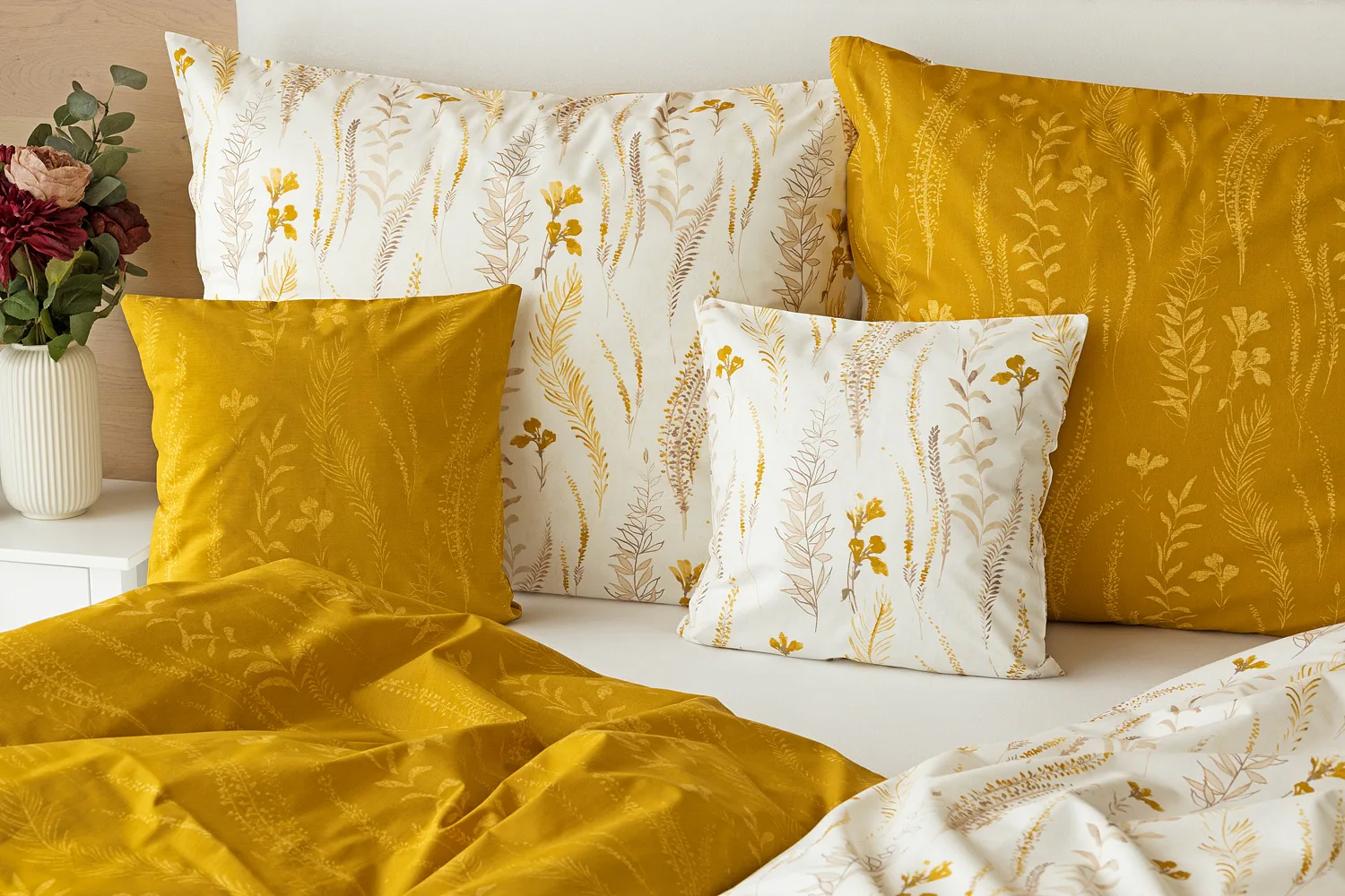 Nechte se okouzlit hřejivou souhrou barev v květinovém vzoru bavlněného povlečení Fabien. Jemný florální motiv v paletě hnědých a medově žlutých tónů se vyjímá z jedné strany na krémovém podkladu. Z druhé strany jsou světlé kontury květů zaneseny do medově žlutého podkladu. Díky tomuto oblíbenému oboustrannému provedení můžete při stlaní hravě experimentovat!