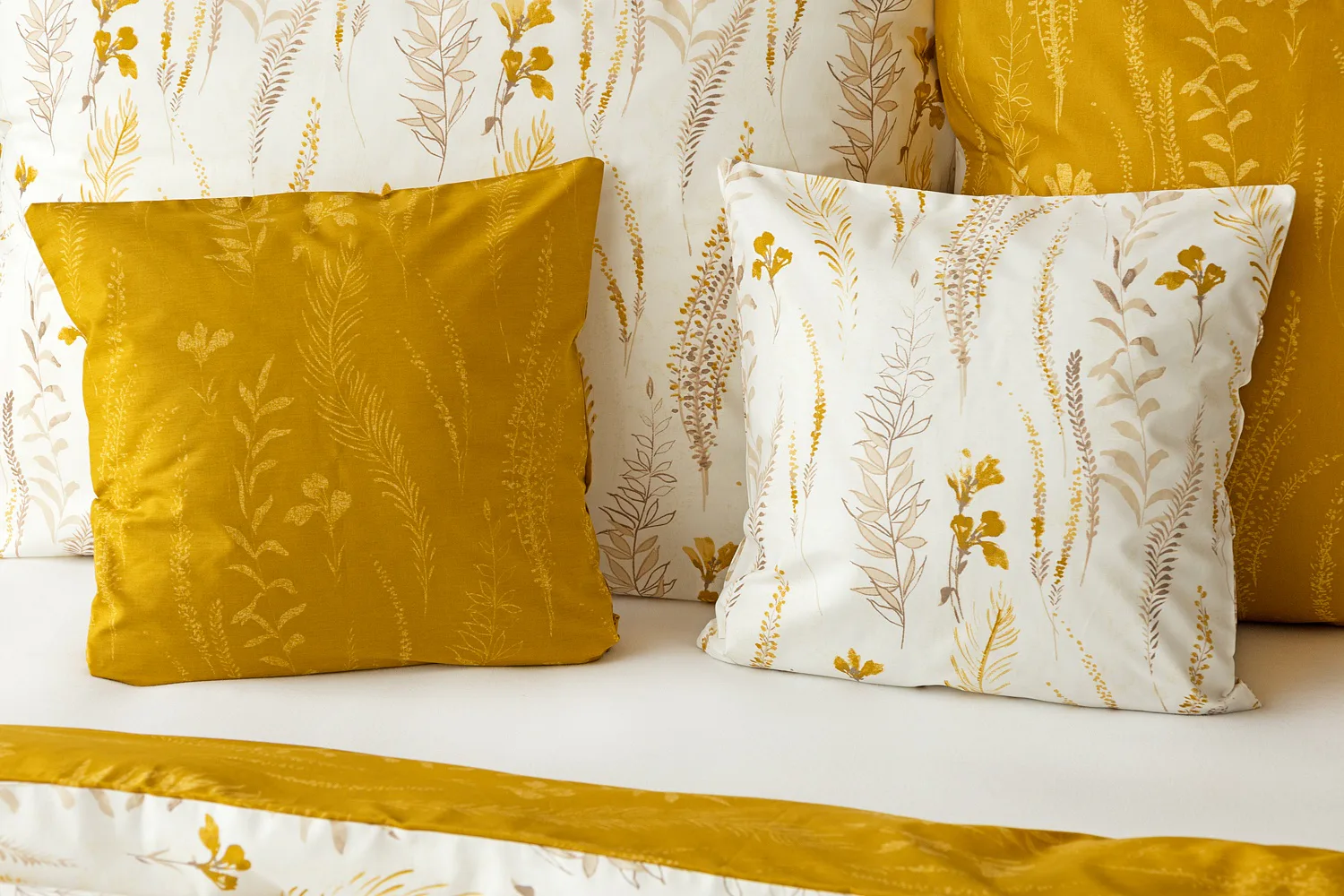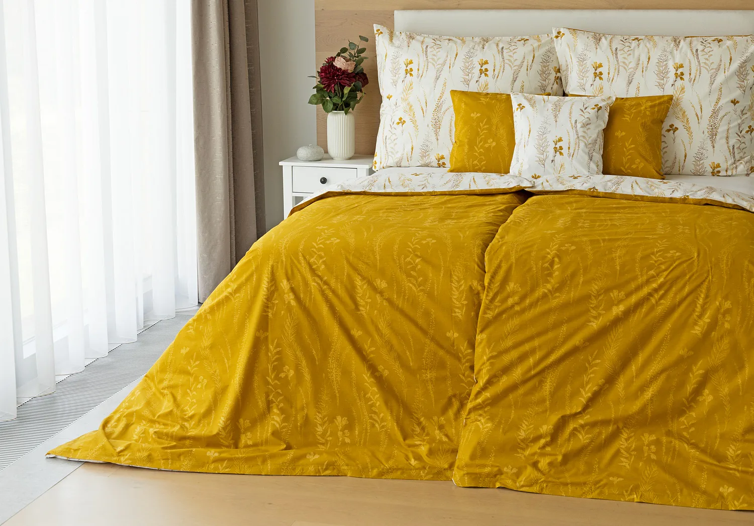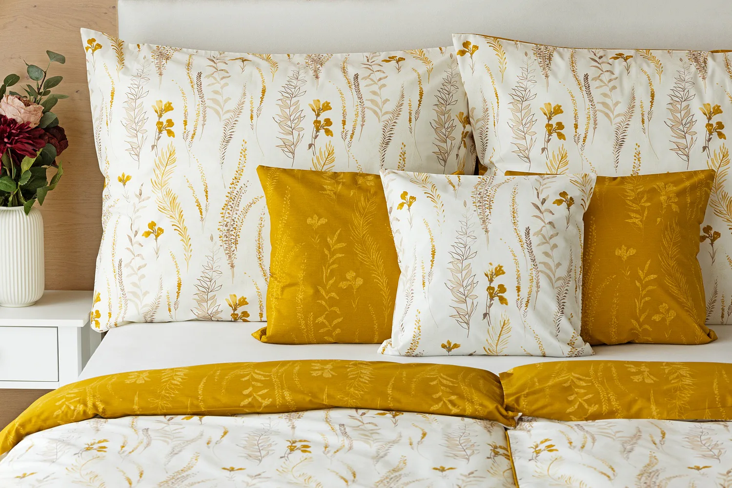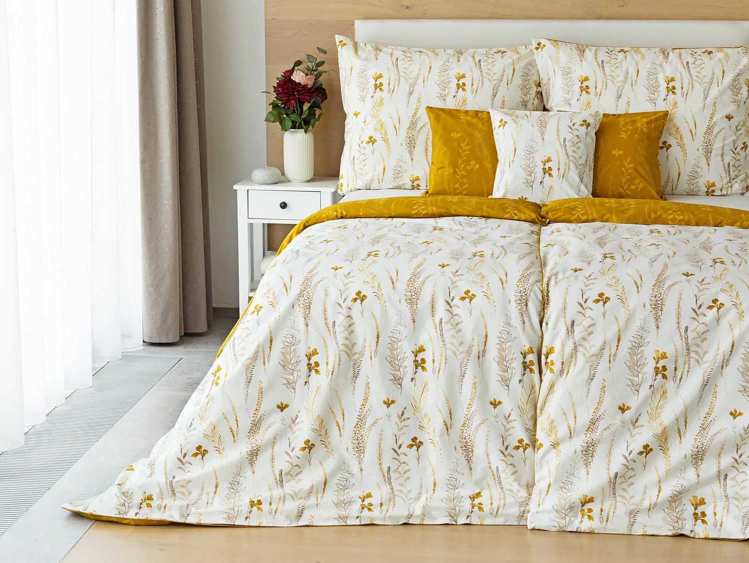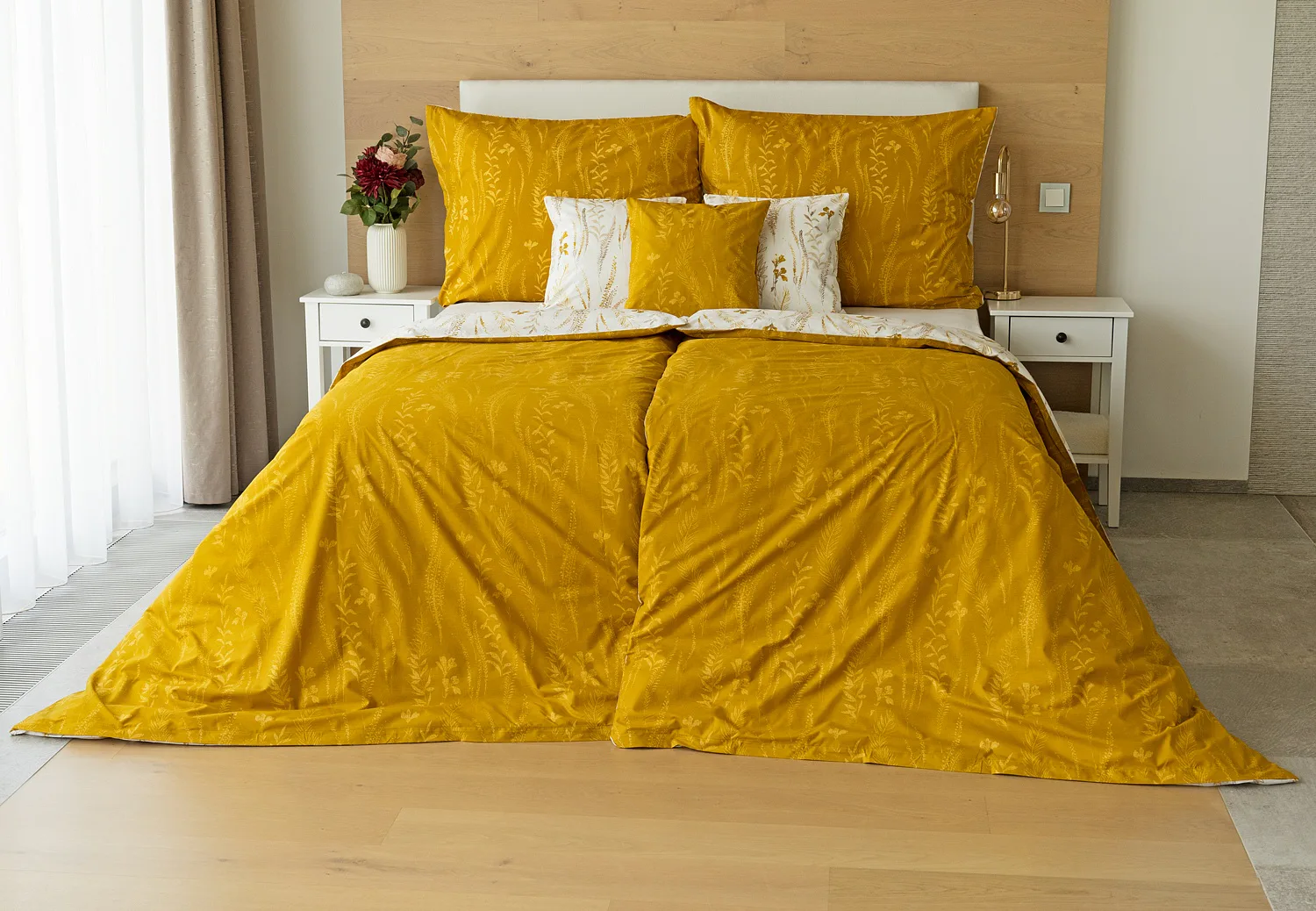 Nechte se okouzlit hřejivou souhrou barev v květinovém vzoru bavlněného povlečení Fabien. Jemný florální motiv v paletě hnědých a medově žlutých tónů se vyjímá z jedné strany na krémovém podkladu. Z druhé strany jsou světlé kontury květů zaneseny do medově žlutého podkladu. Díky tomuto oblíbenému oboustrannému provedení můžete při stlaní hravě experimentovat!