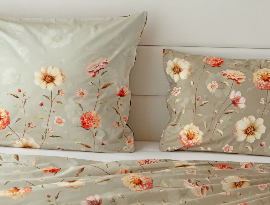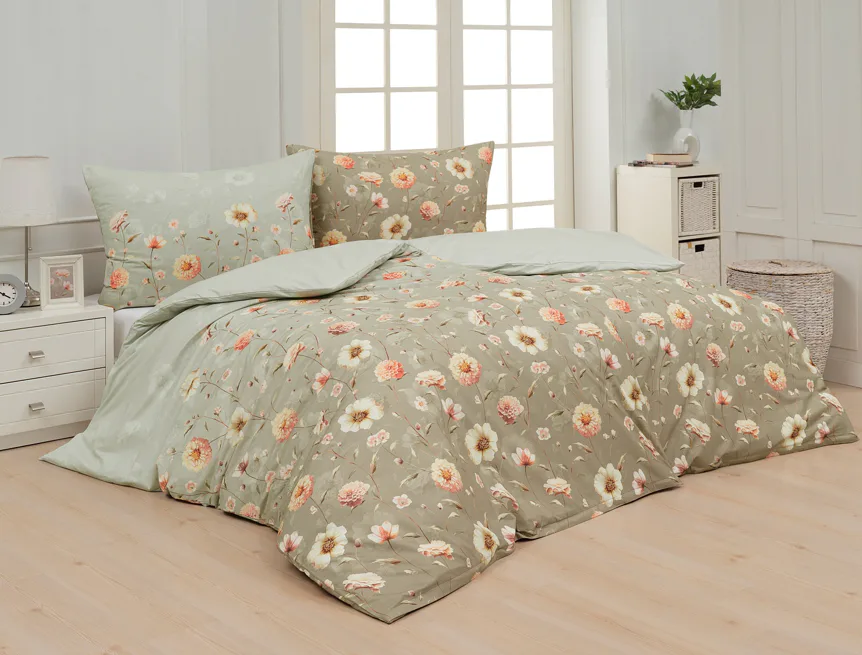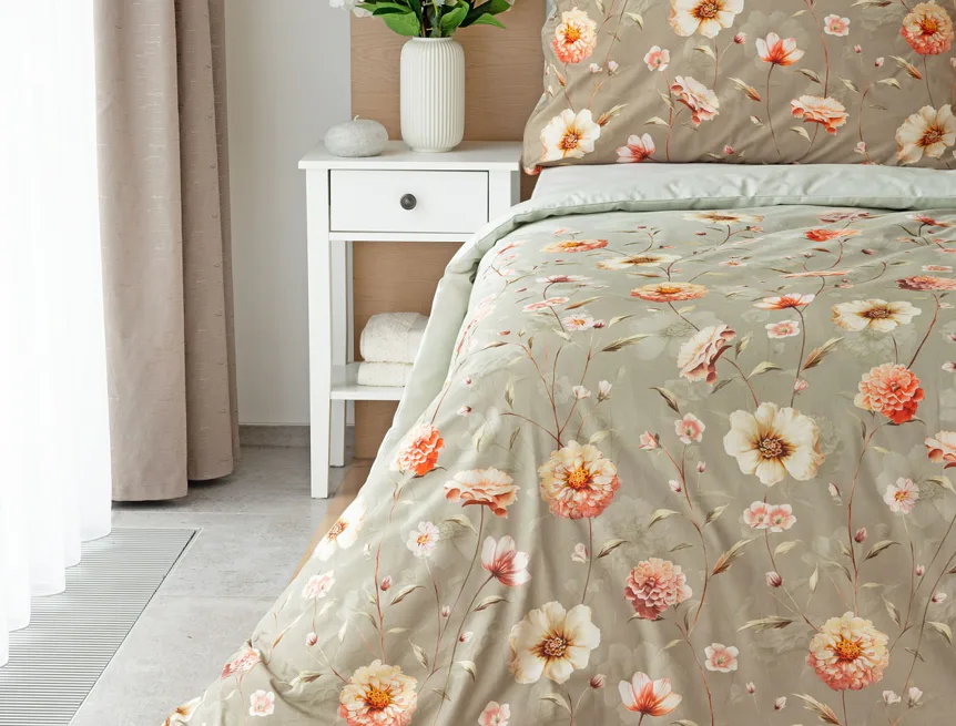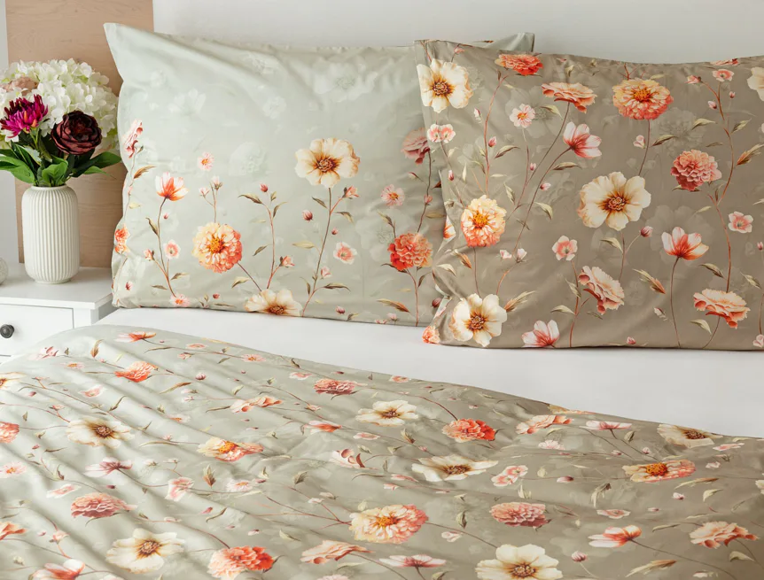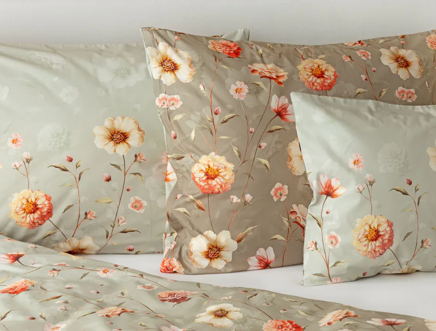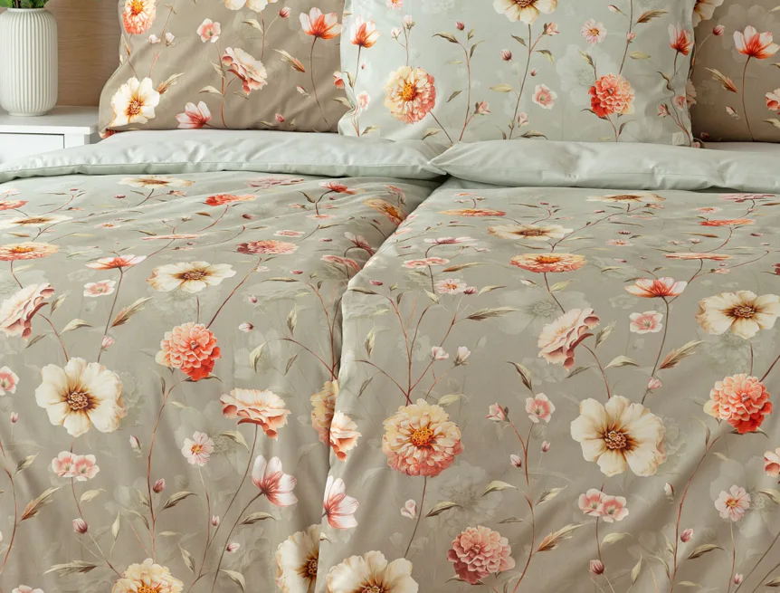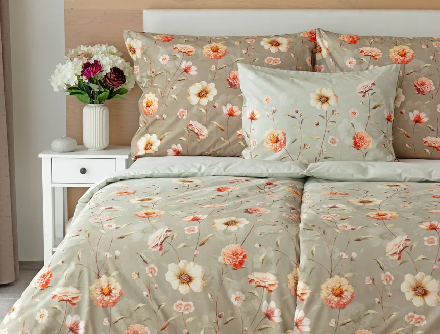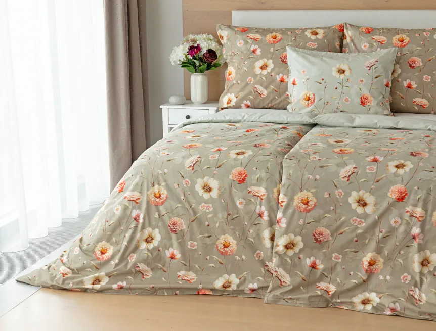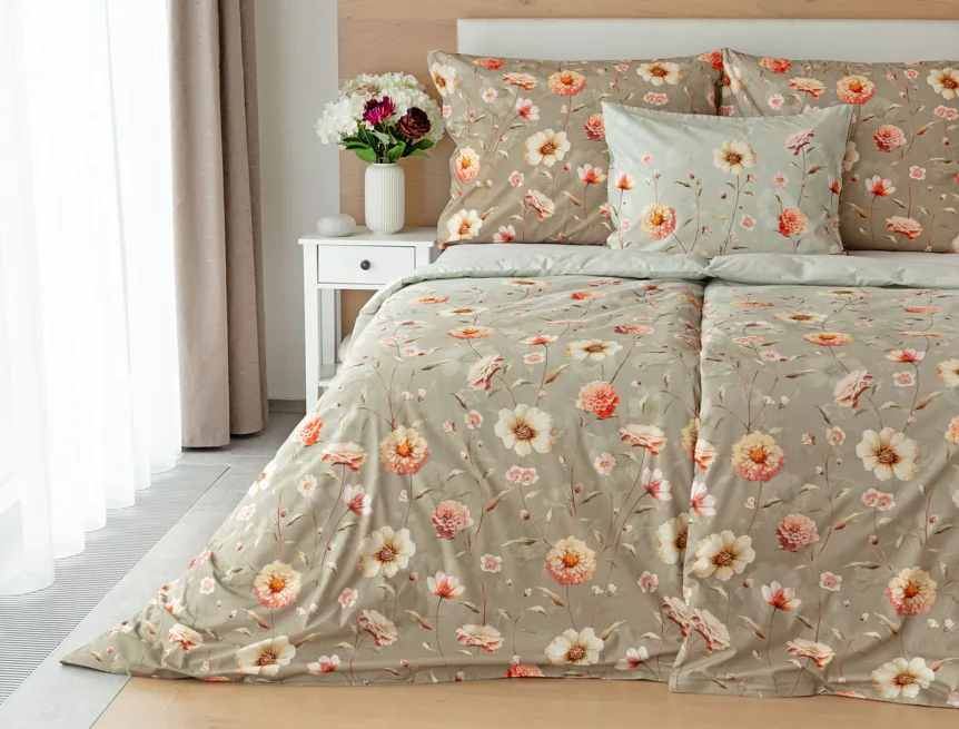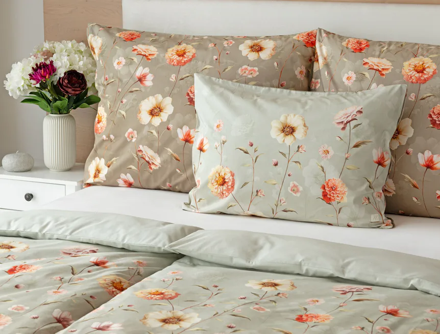 Okouzlující květinovou souhru v hřejivých barvách přináší bavlněné ložní povlečení Floral. Dominantní jiřiny s korálově růžovými květy doplňuje luční kvítí v přírodních tónech. Podkladová barva ložního povlečení přechází od spodní šedozelené po světlounce šedou.