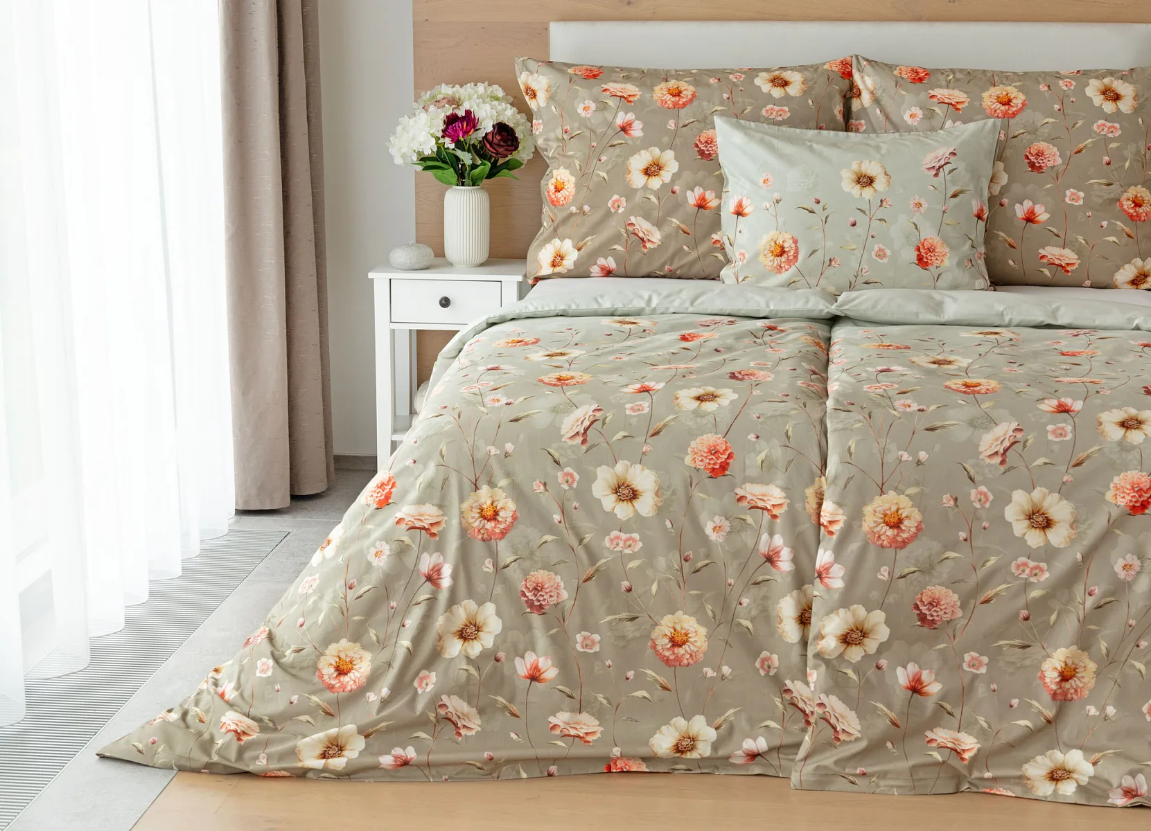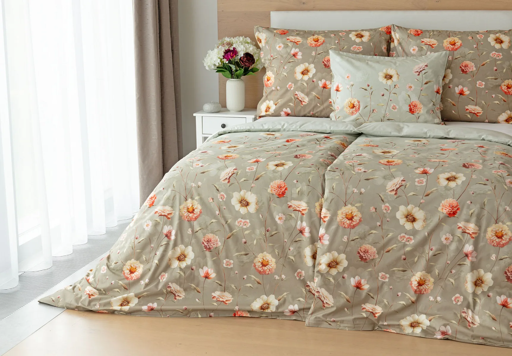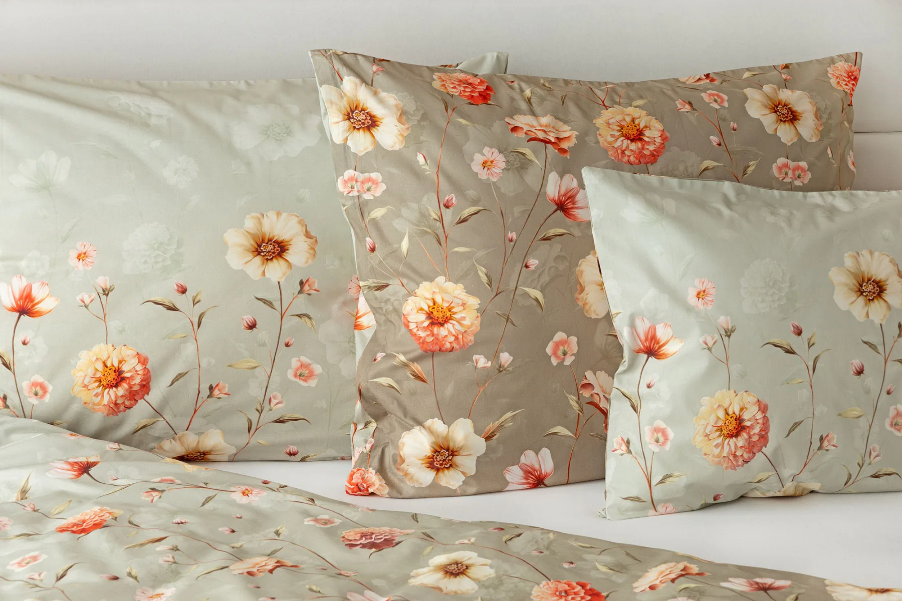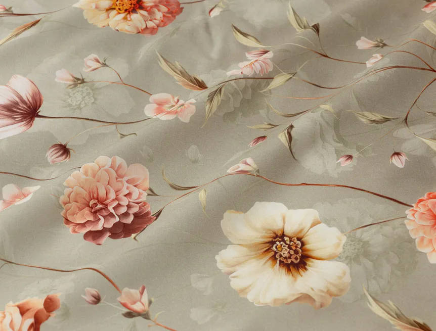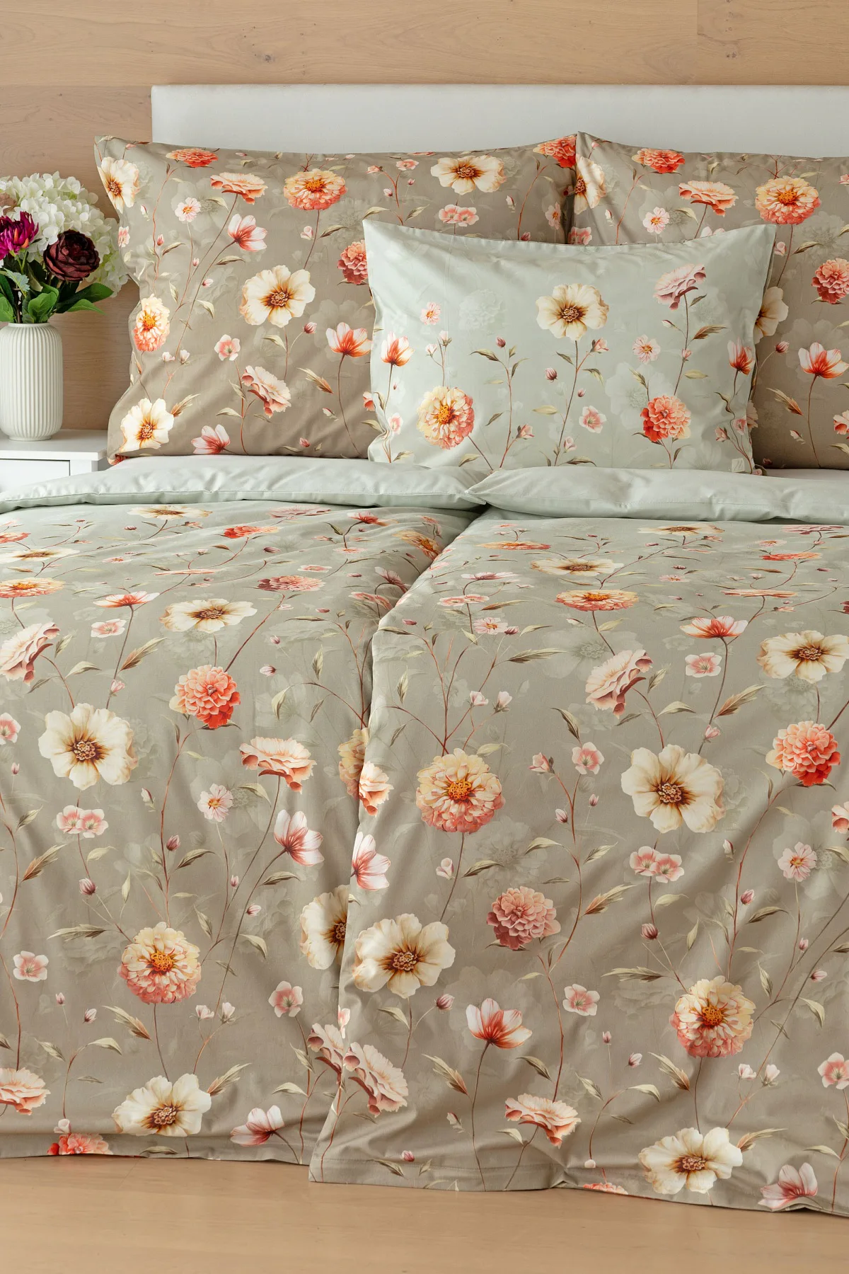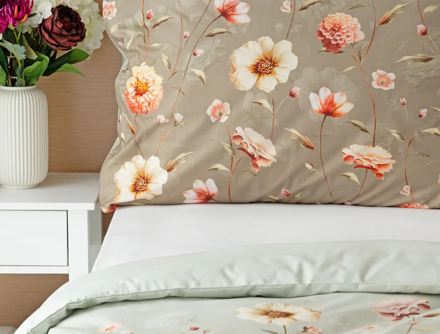 Okouzlující květinovou souhru v hřejivých barvách přináší bavlněné ložní povlečení Floral. Dominantní jiřiny s korálově růžovými květy doplňuje luční kvítí v přírodních tónech. Podkladová barva ložního povlečení přechází od spodní šedozelené po světlounce šedou.