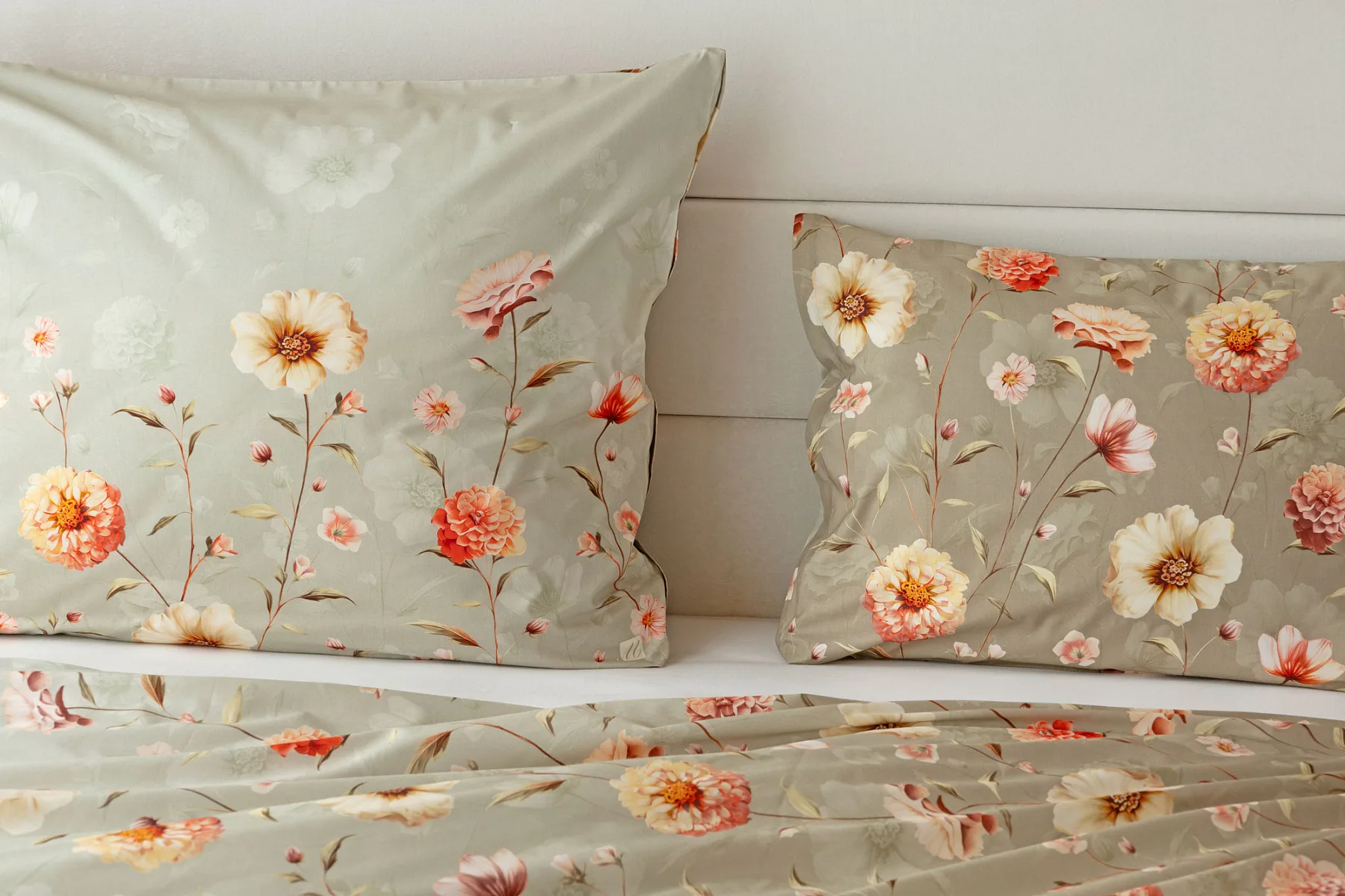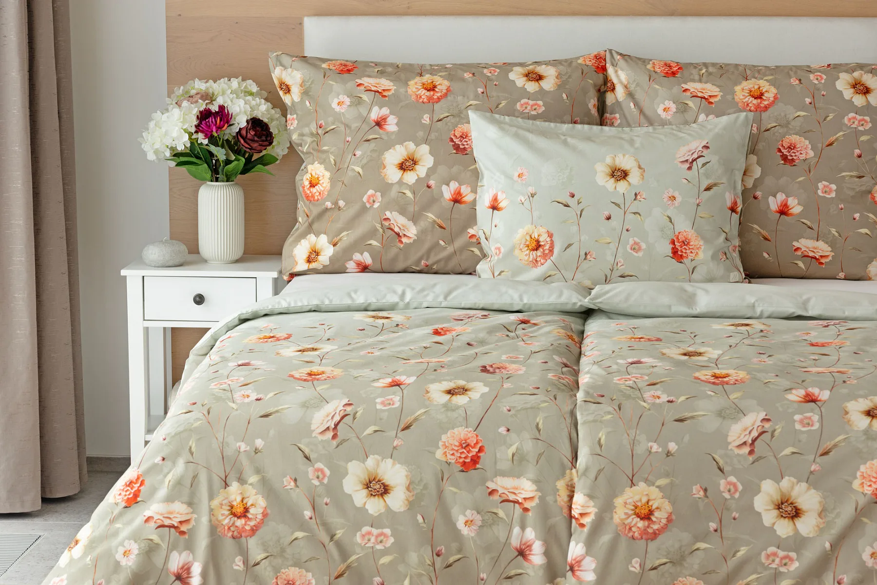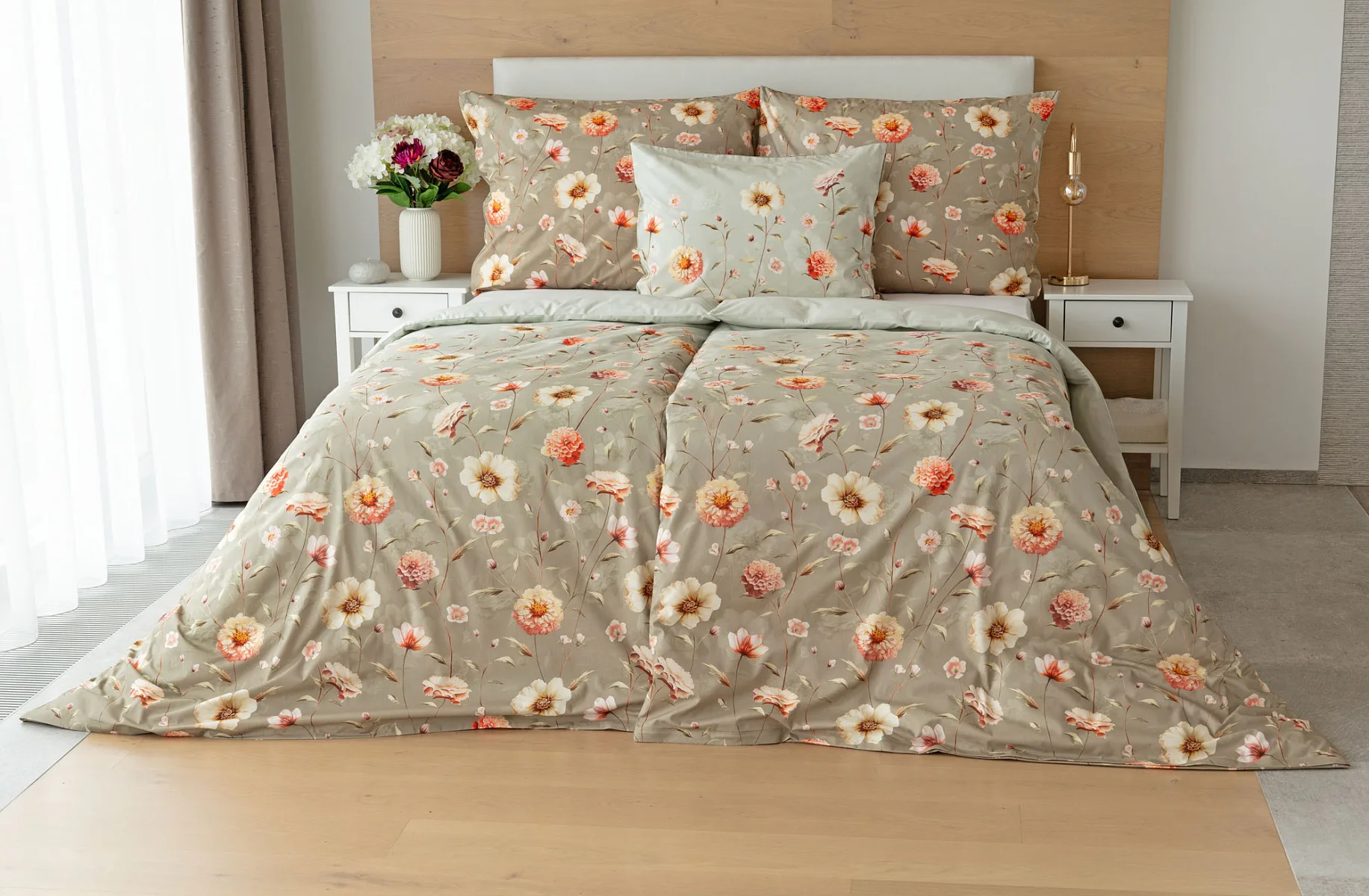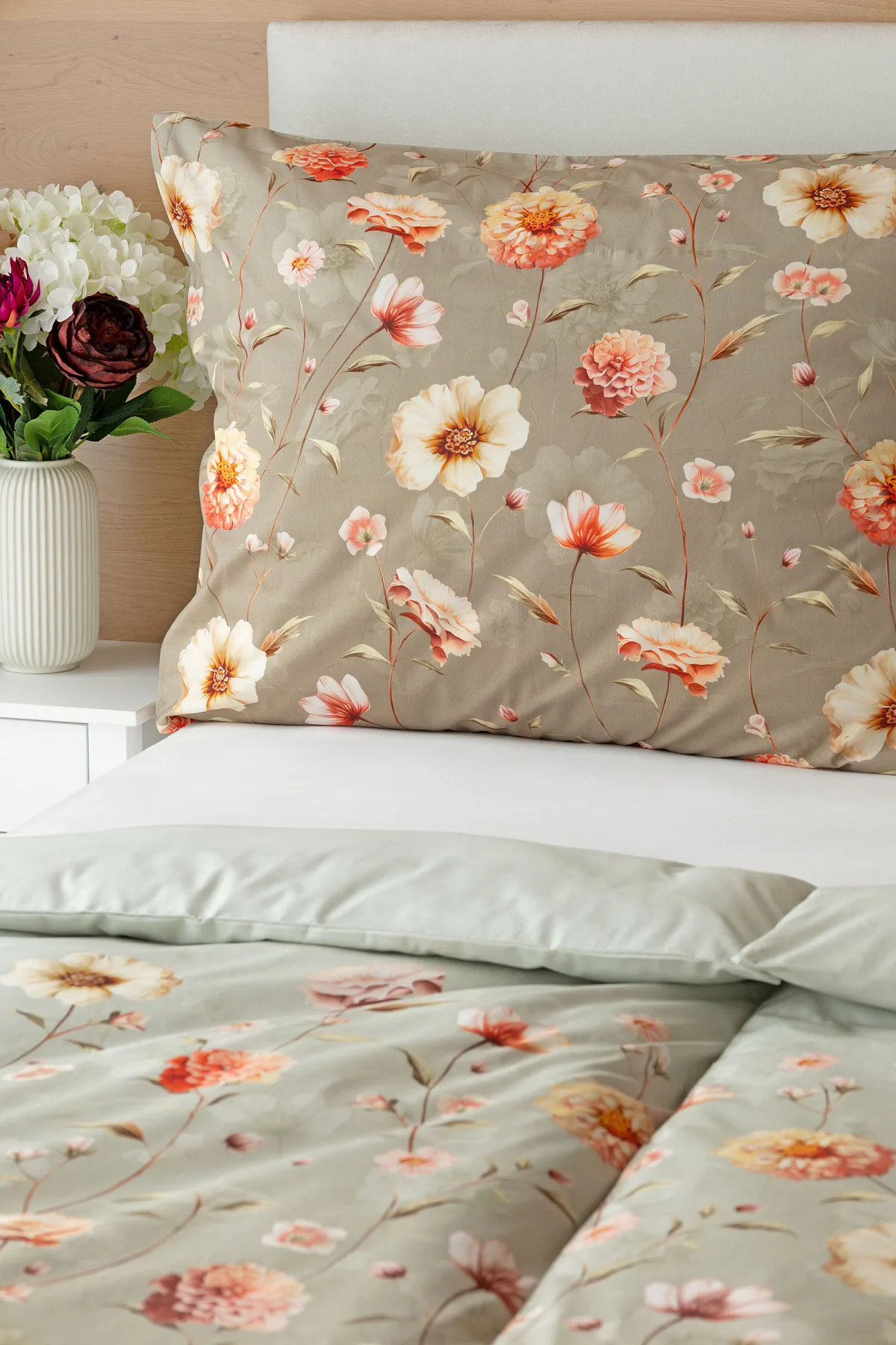 Okouzlující květinovou souhru v hřejivých barvách přináší bavlněné ložní povlečení Floral. Dominantní jiřiny s korálově růžovými květy doplňuje luční kvítí v přírodních tónech. Podkladová barva ložního povlečení přechází od spodní šedozelené po světlounce šedou.