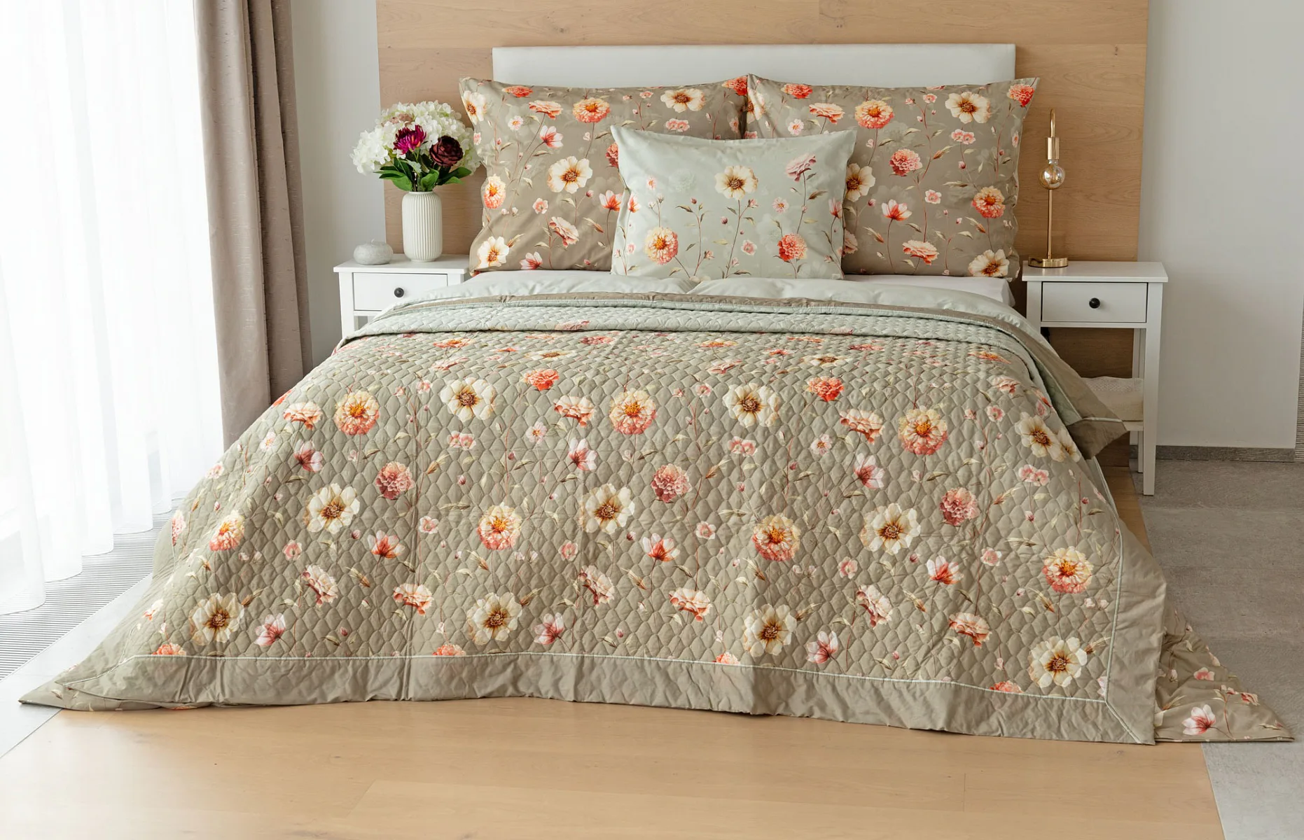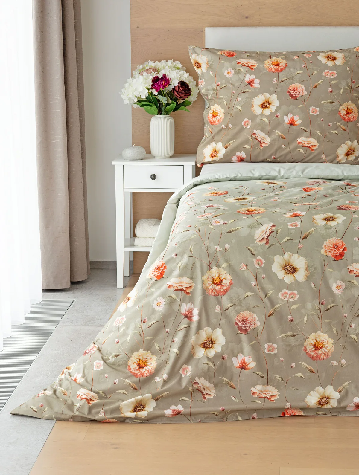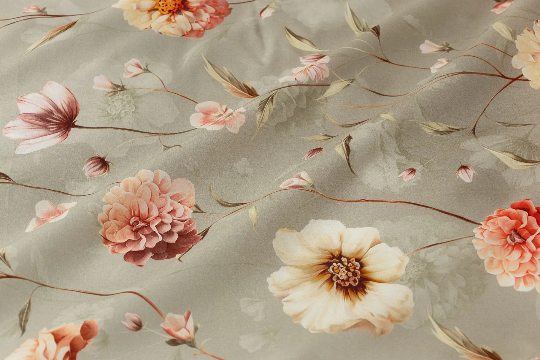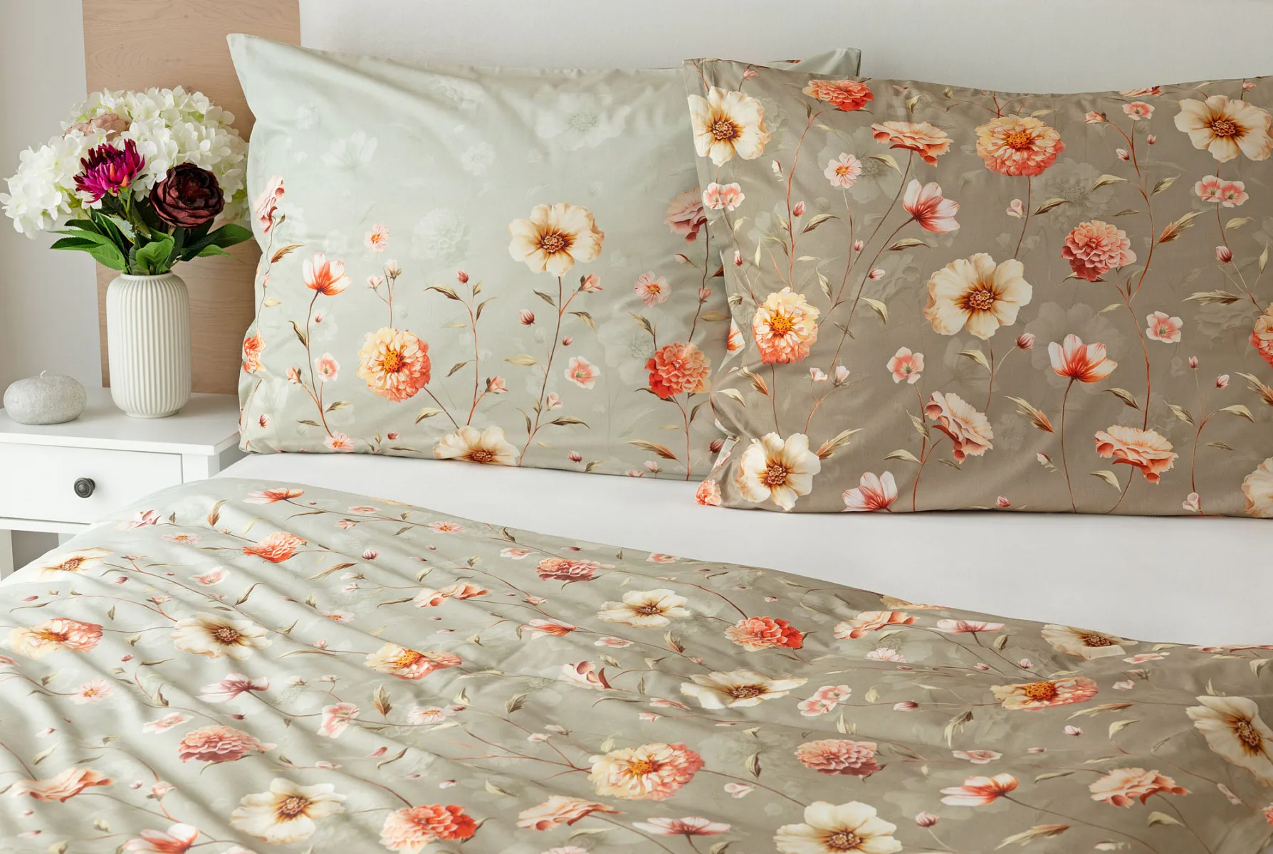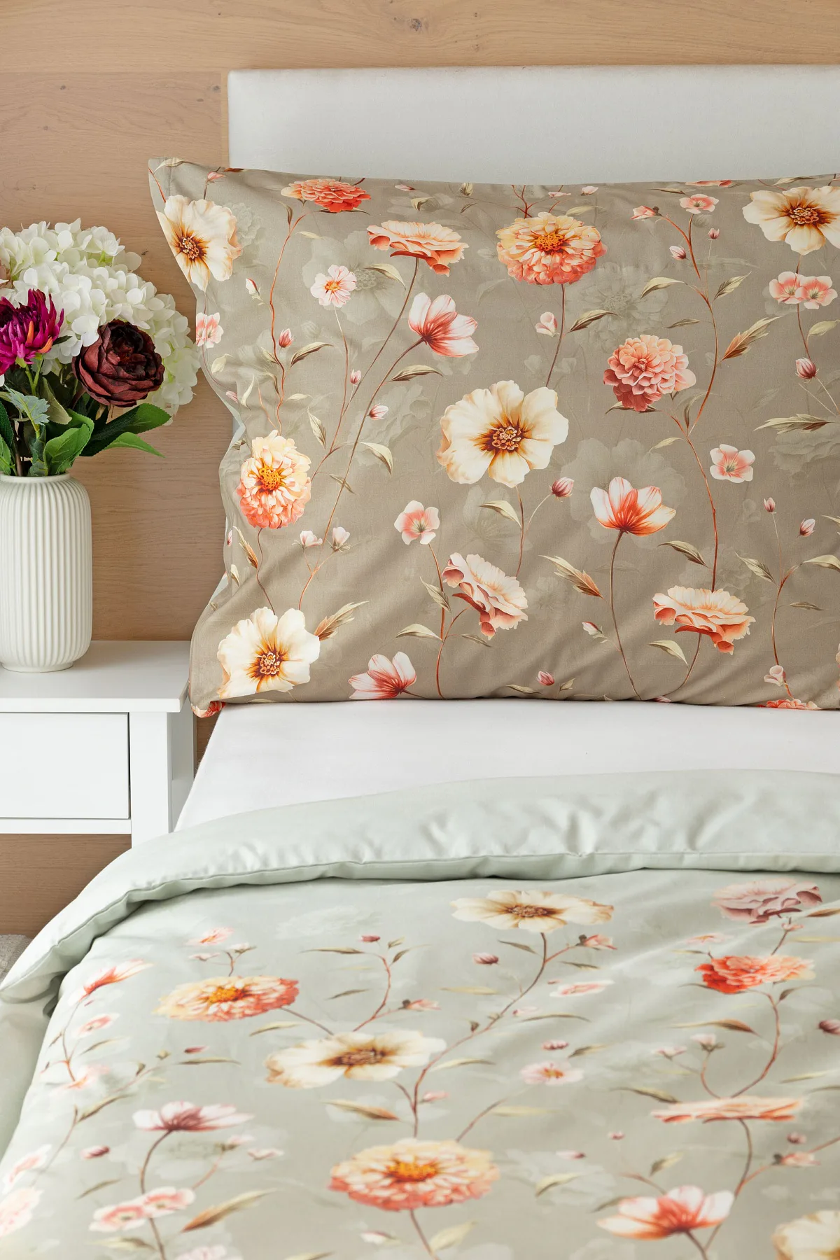 Okouzlující květinovou souhru v hřejivých barvách přináší bavlněné ložní povlečení Floral. Dominantní jiřiny s korálově růžovými květy doplňuje luční kvítí v přírodních tónech. Podkladová barva ložního povlečení přechází od spodní šedozelené po světlounce šedou.