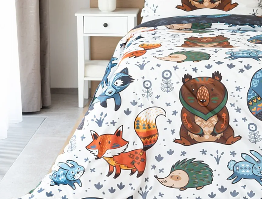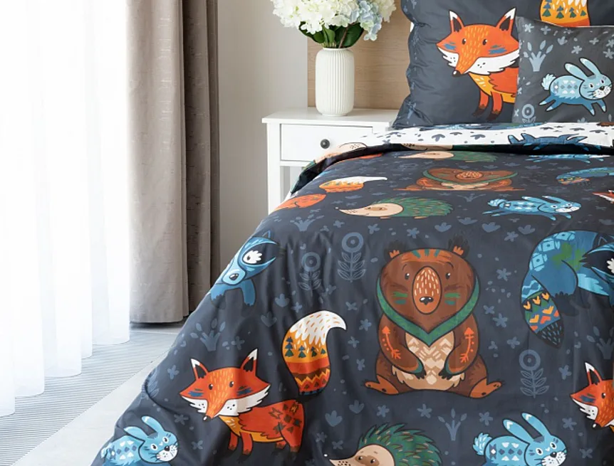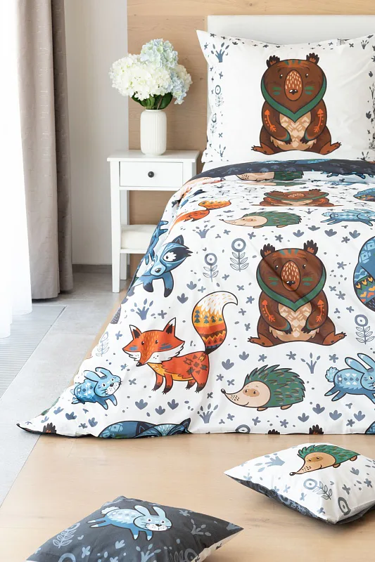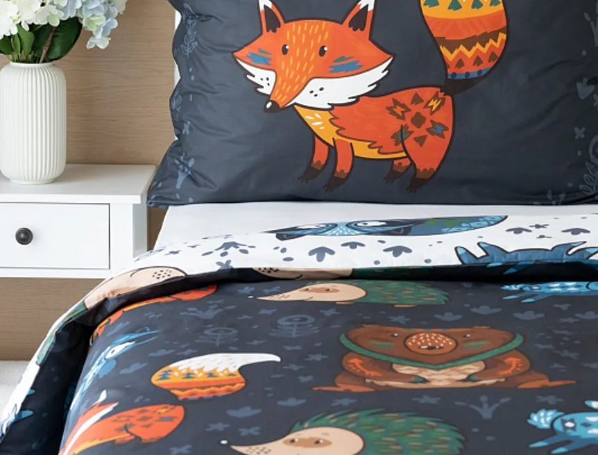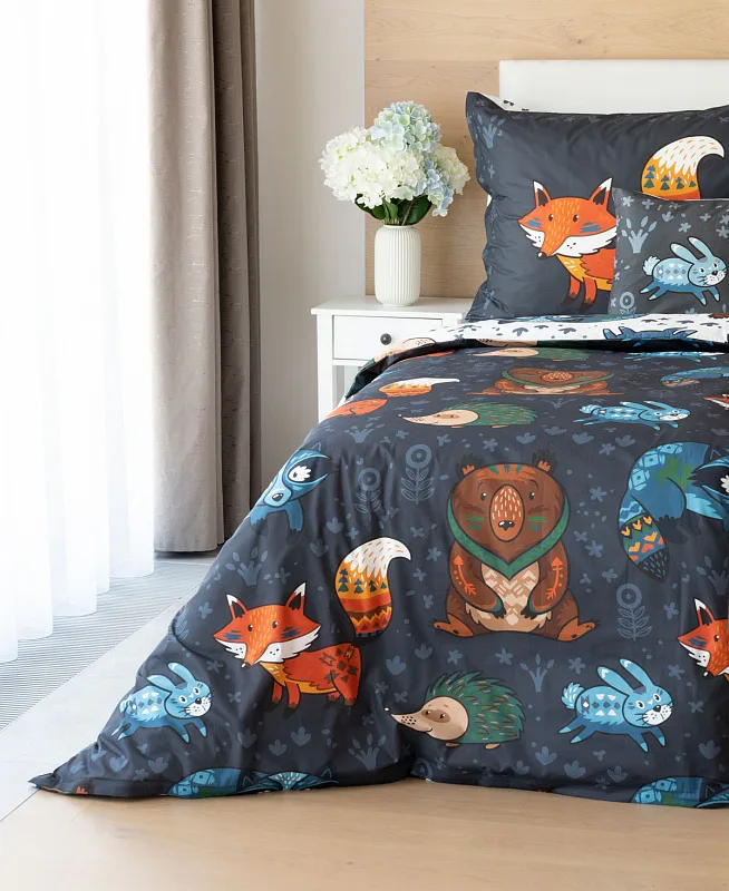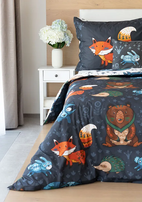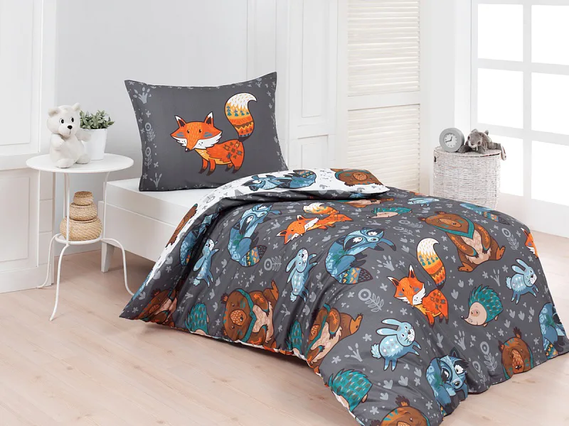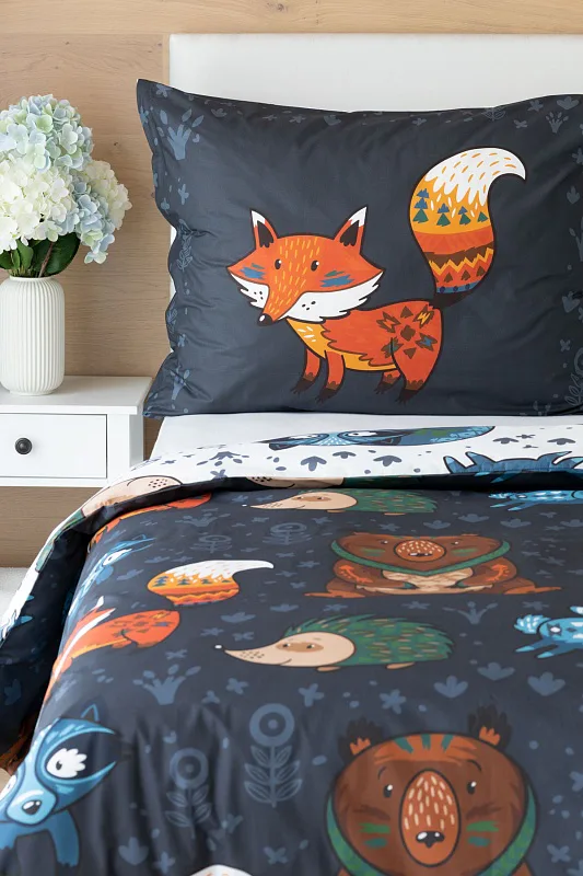 Originální povlečení Foxie s motivem lesních zvířátek se stane ozdobou každého dětského pokojíčku. Na vrchní straně přikrývky je motiv zasazen do tmavě šedého podkladu, spodní strana povlaku na přikrývku obsahuje stejný motiv na bílém podkladu. Povlak na polštář je z každé strany jiný.