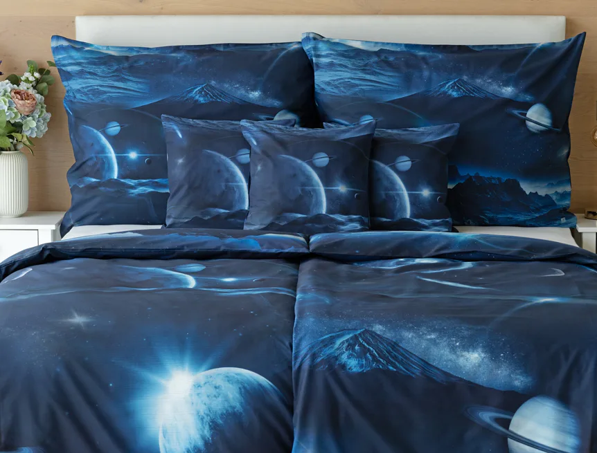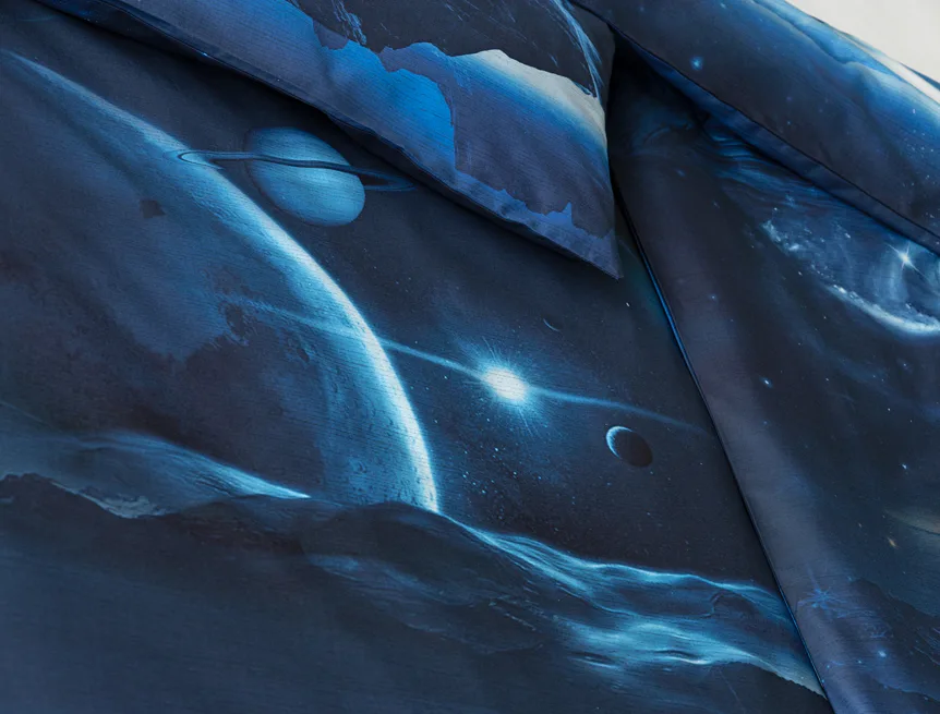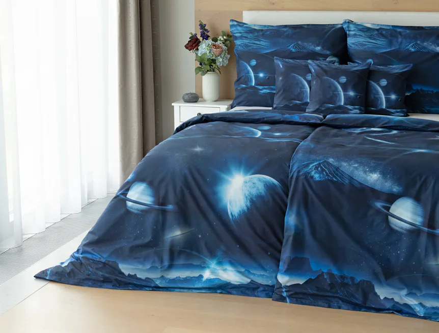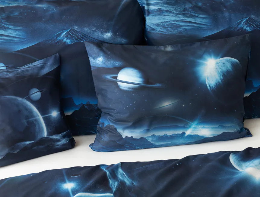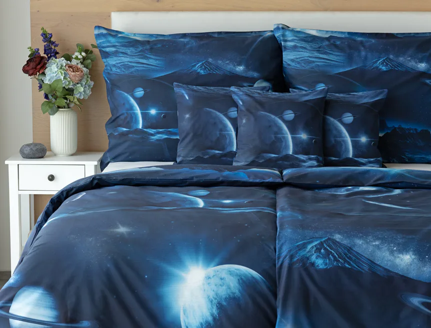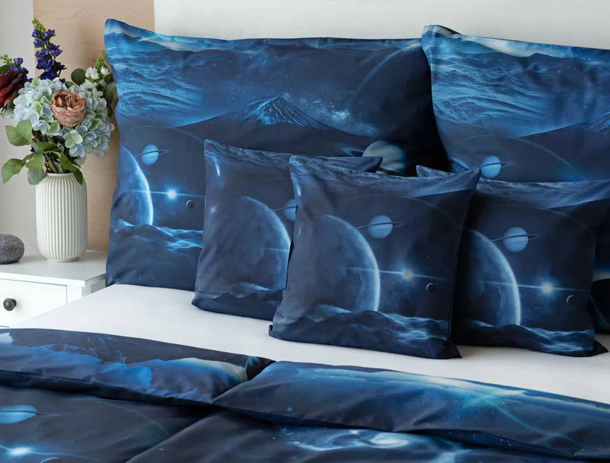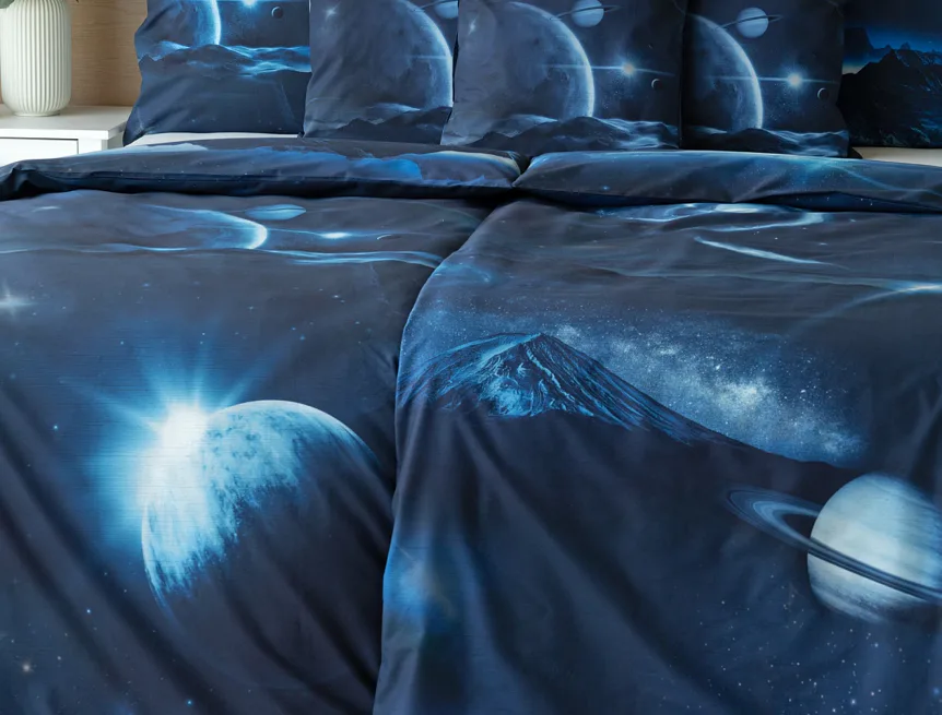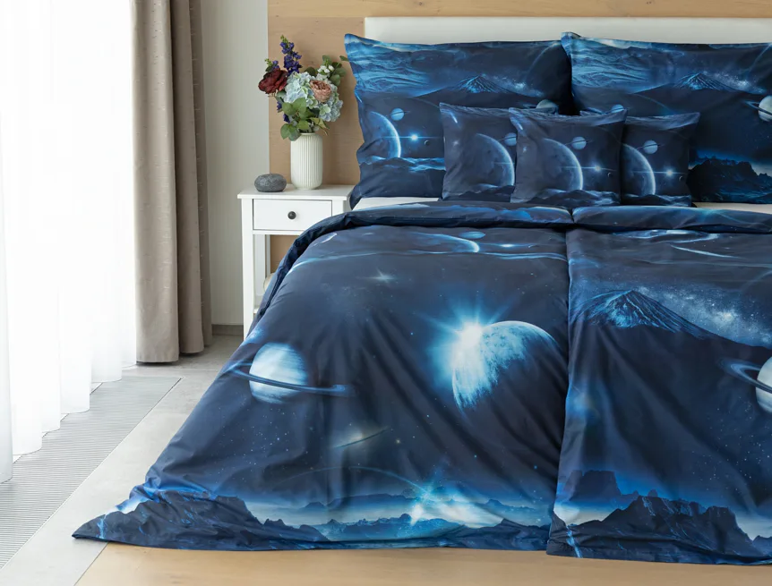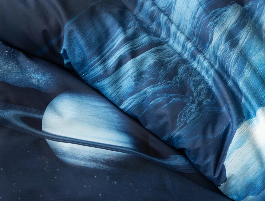 Objevte tajemství vesmíru přímo z vaší ložnice s hebkým bavlněným povlečením Galaxie. Tmavě modrý podklad zdobí motivy planet. Díky nejmodernějšímu digitálním tisku vyniká vzor v precizním detailu. Přeneste se do vesmíru každou noc a nechte své sny volně plynout mezi hvězdami.