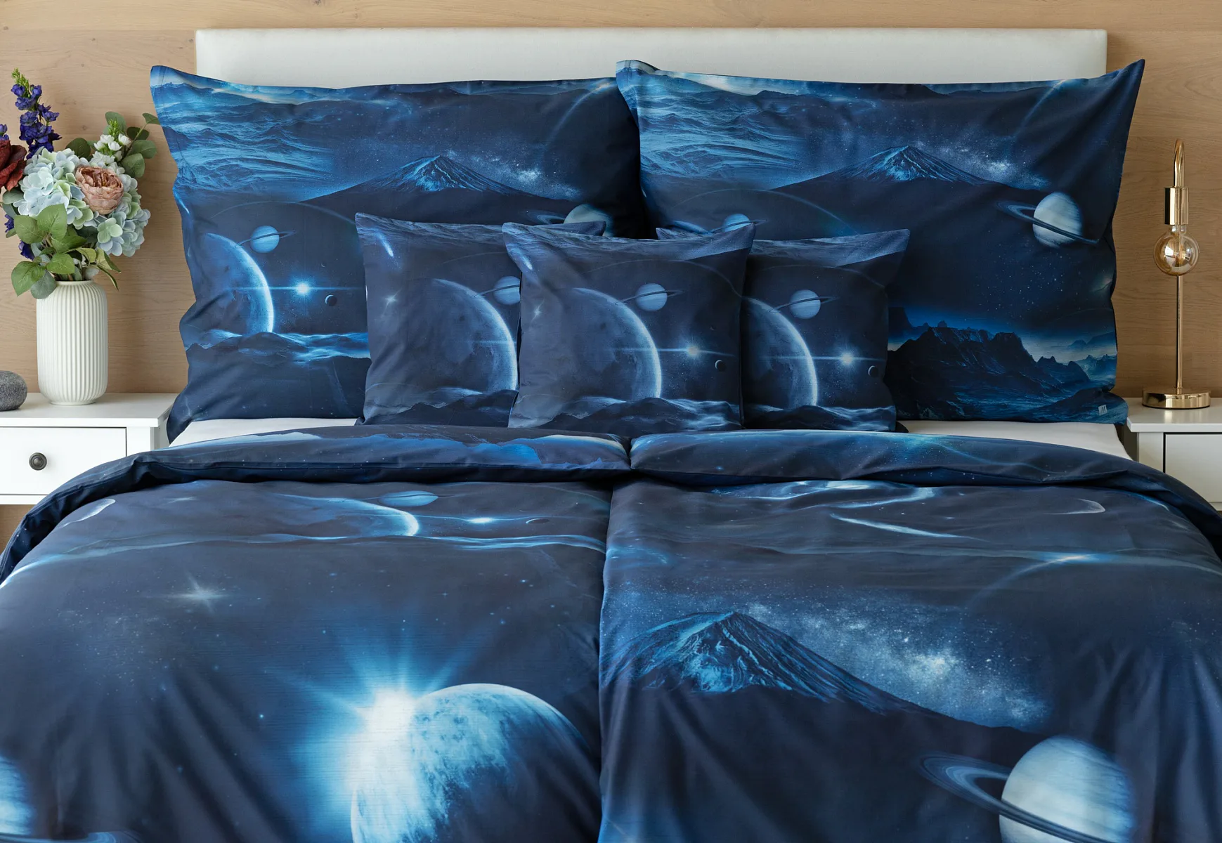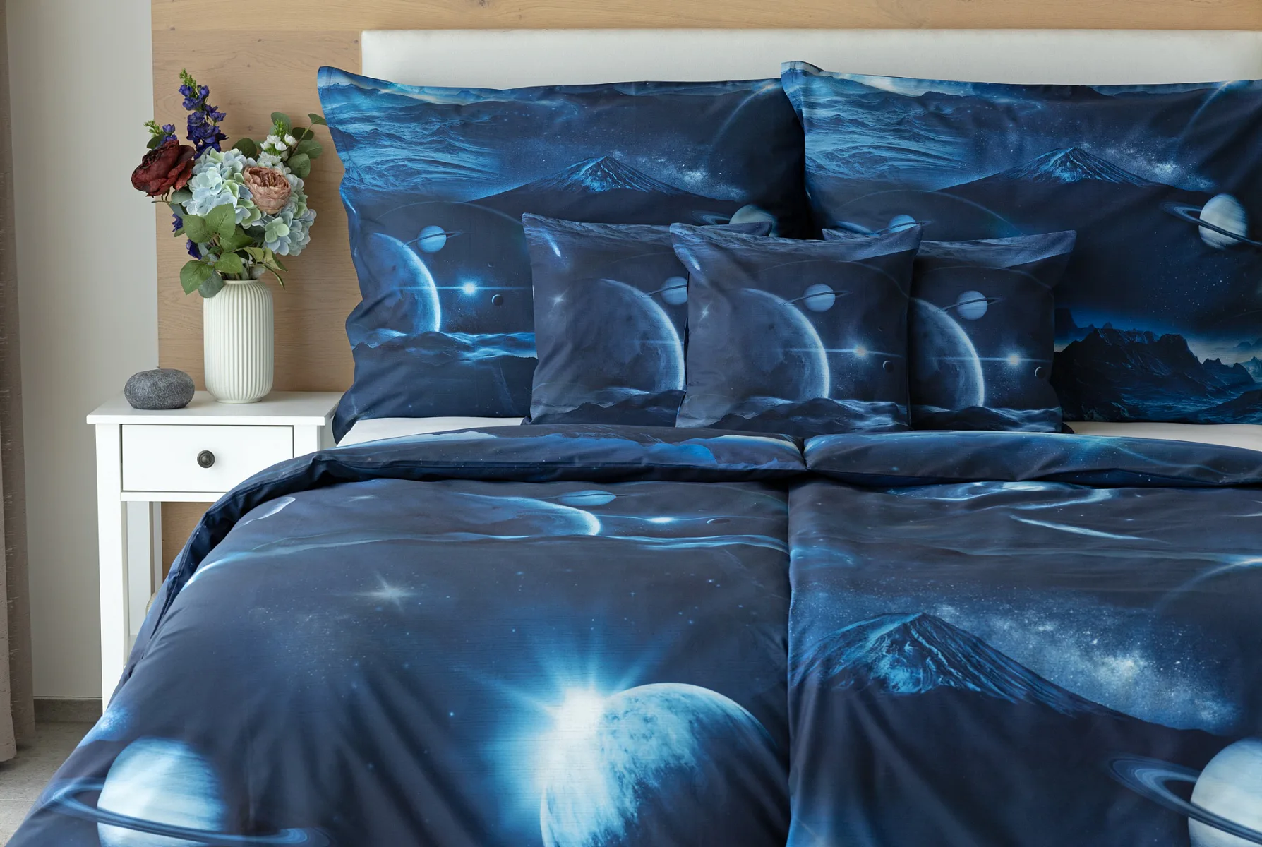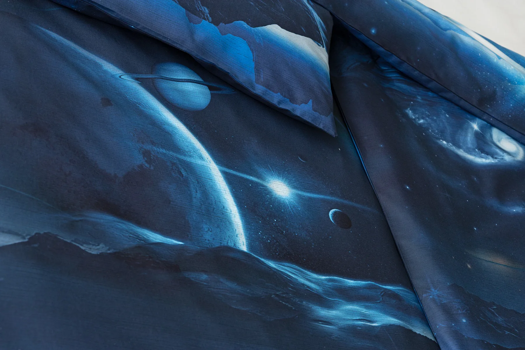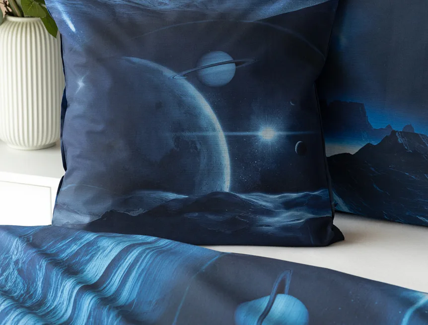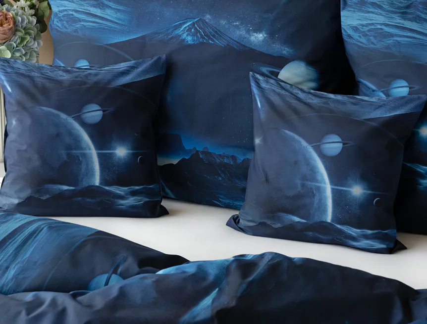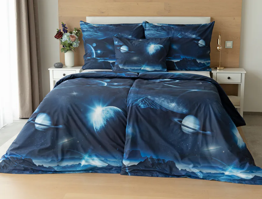 Objevte tajemství vesmíru přímo z vaší ložnice s hebkým bavlněným povlečením Galaxie. Tmavě modrý podklad zdobí motivy planet. Díky nejmodernějšímu digitálním tisku vyniká vzor v precizním detailu. Přeneste se do vesmíru každou noc a nechte své sny volně plynout mezi hvězdami.