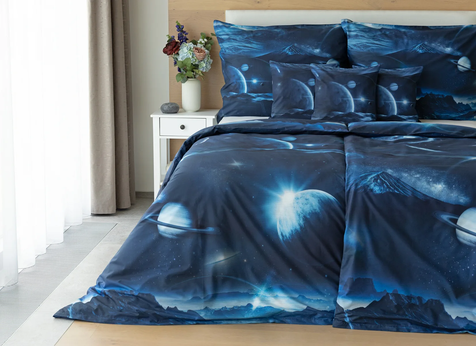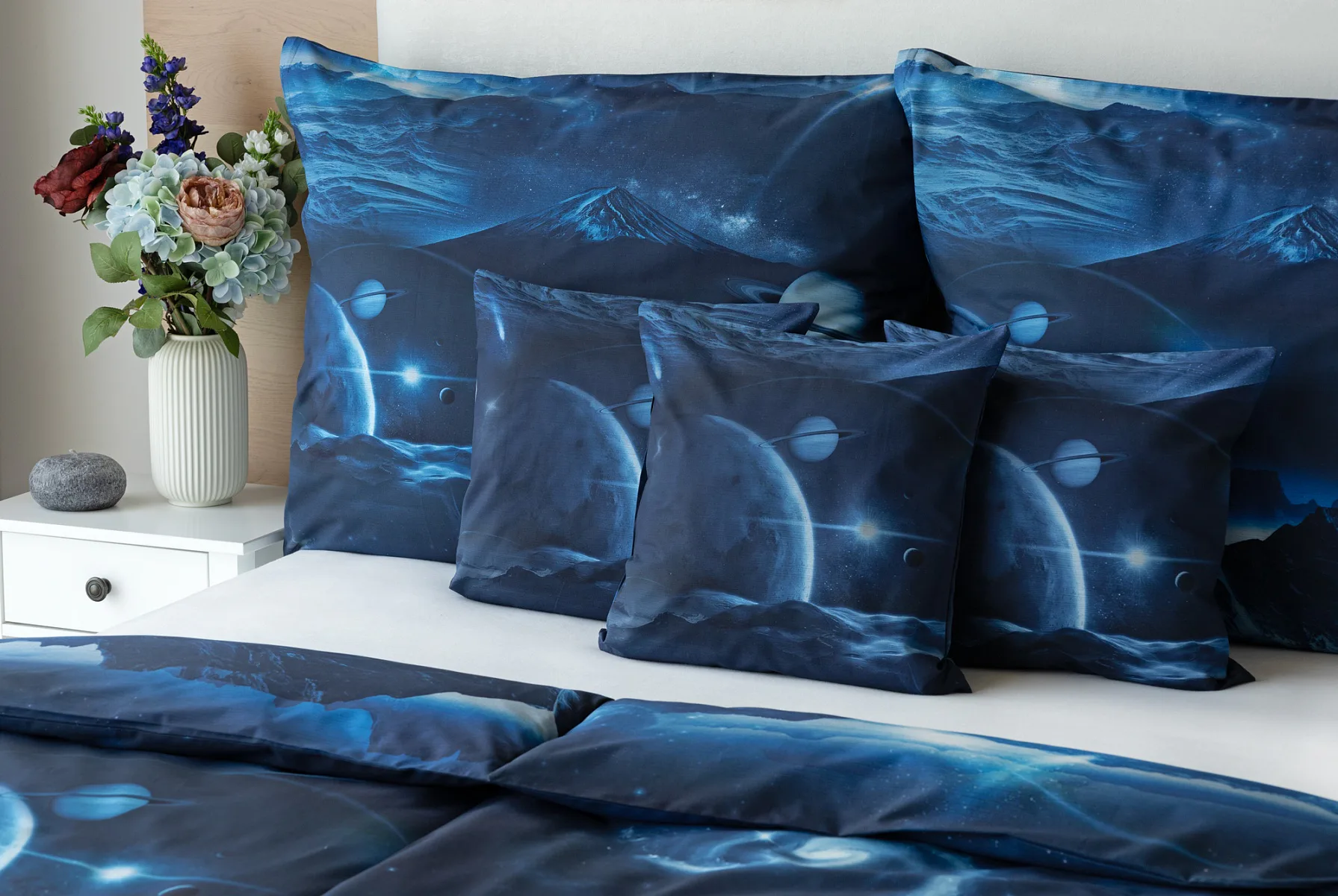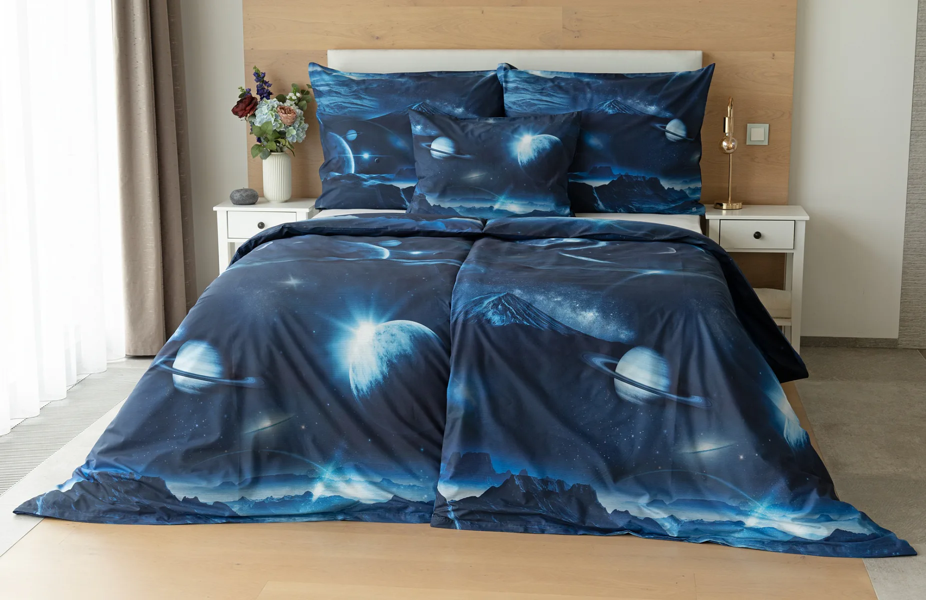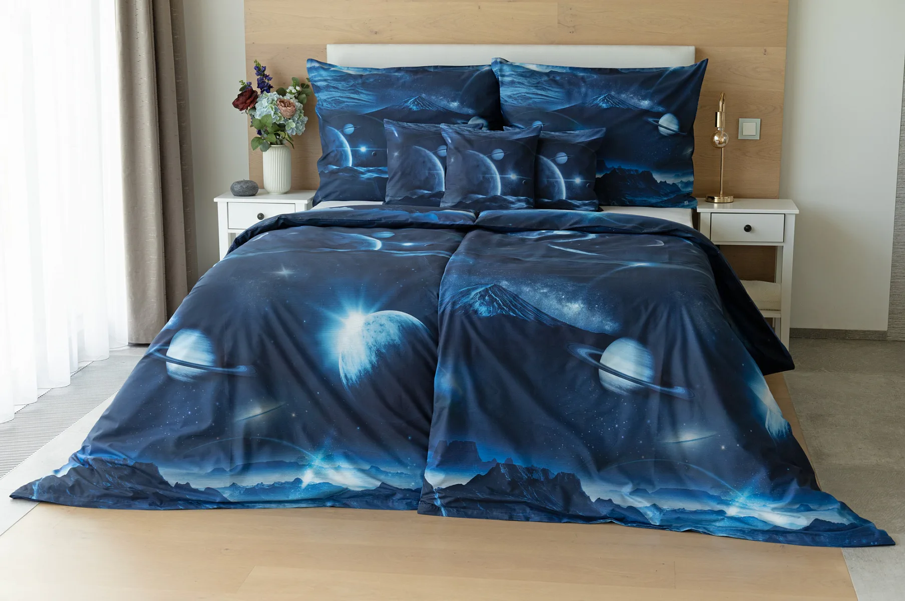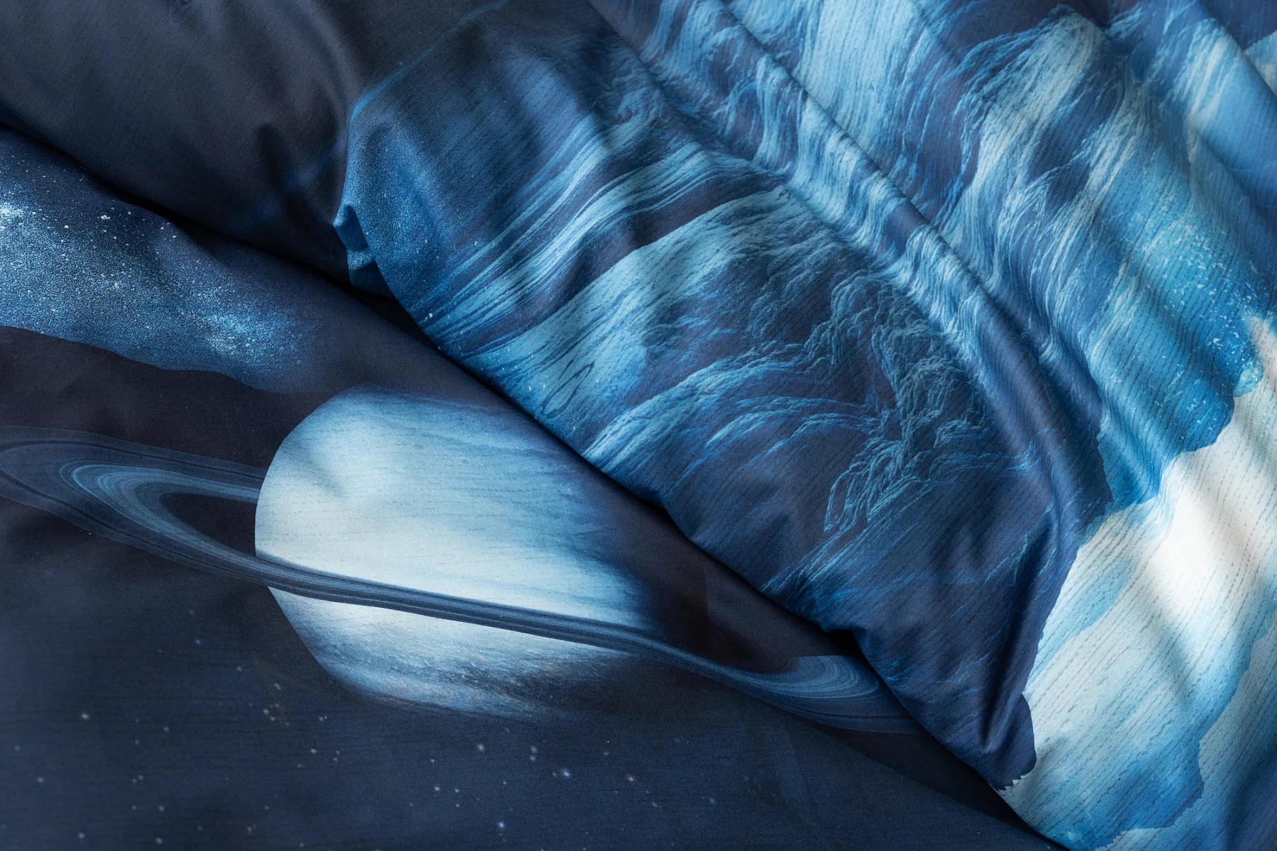 Objevte tajemství vesmíru přímo z vaší ložnice s hebkým bavlněným povlečením Galaxie. Tmavě modrý podklad zdobí motivy planet. Díky nejmodernějšímu digitálním tisku vyniká vzor v precizním detailu. Přeneste se do vesmíru každou noc a nechte své sny volně plynout mezi hvězdami.