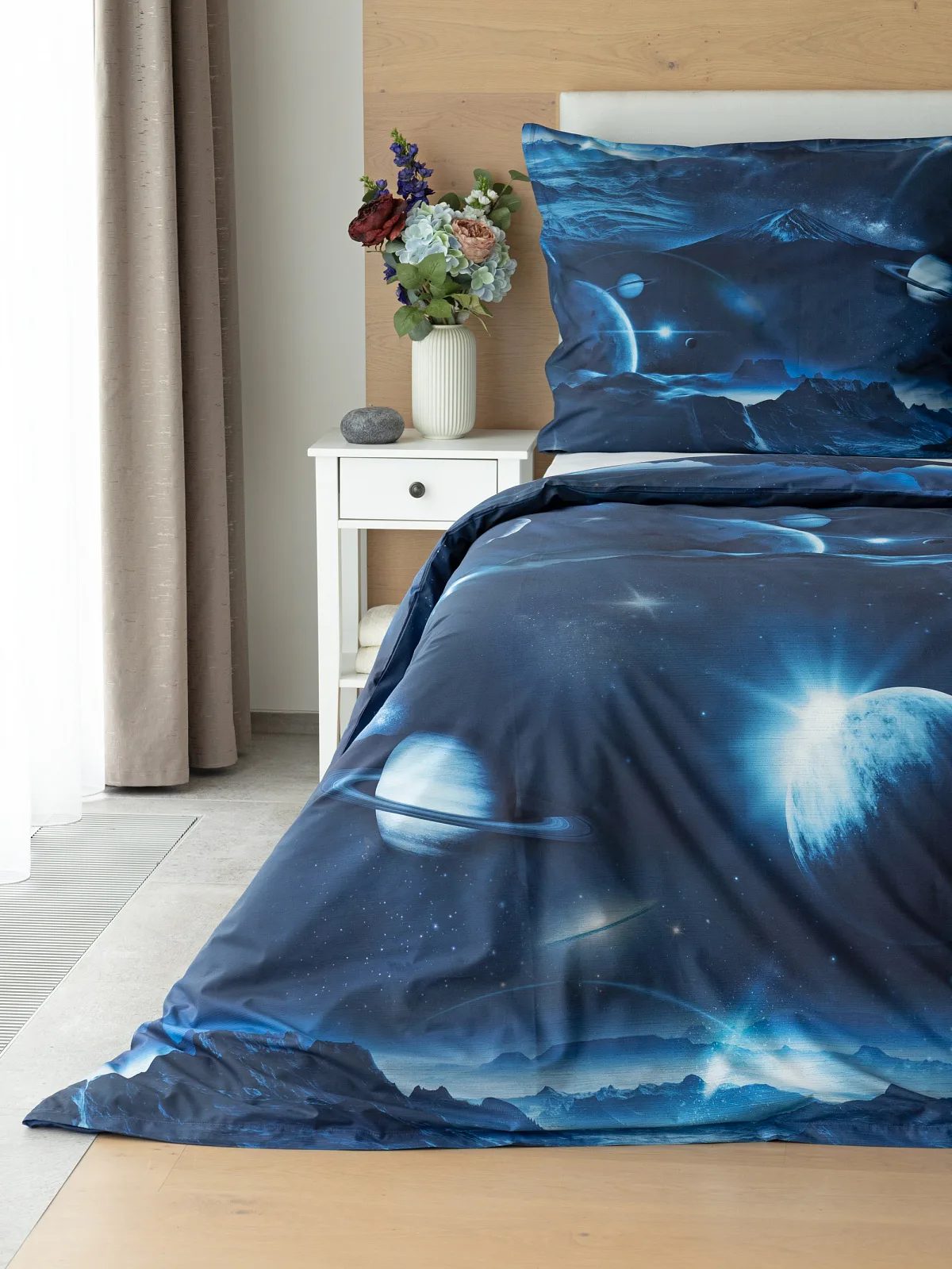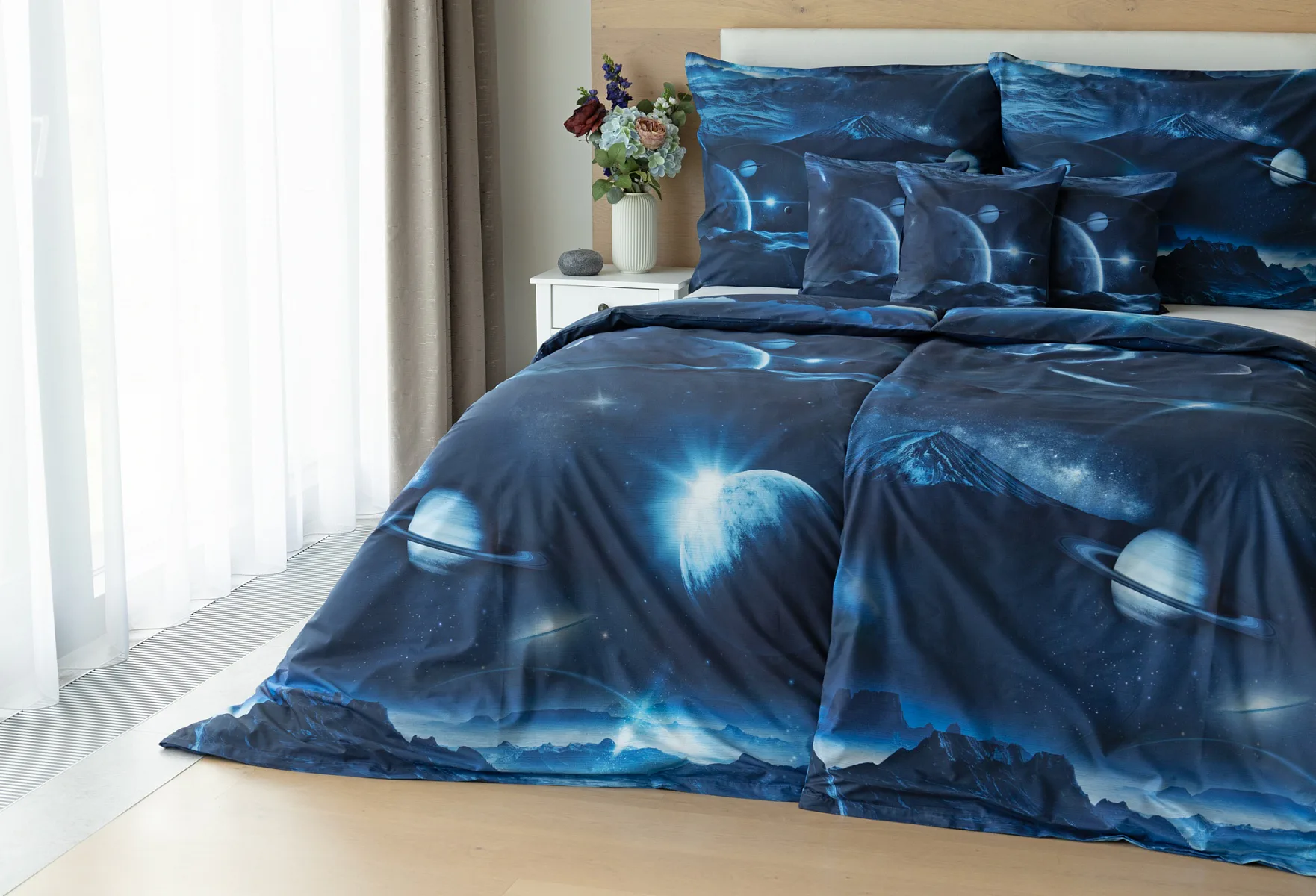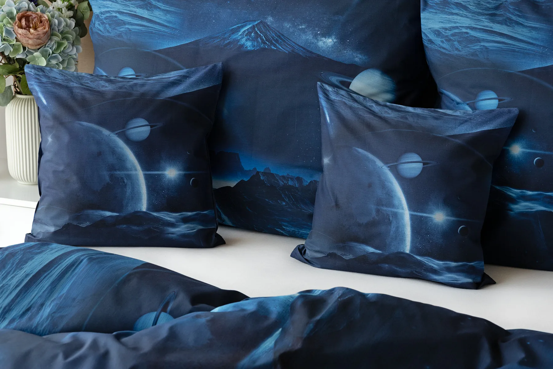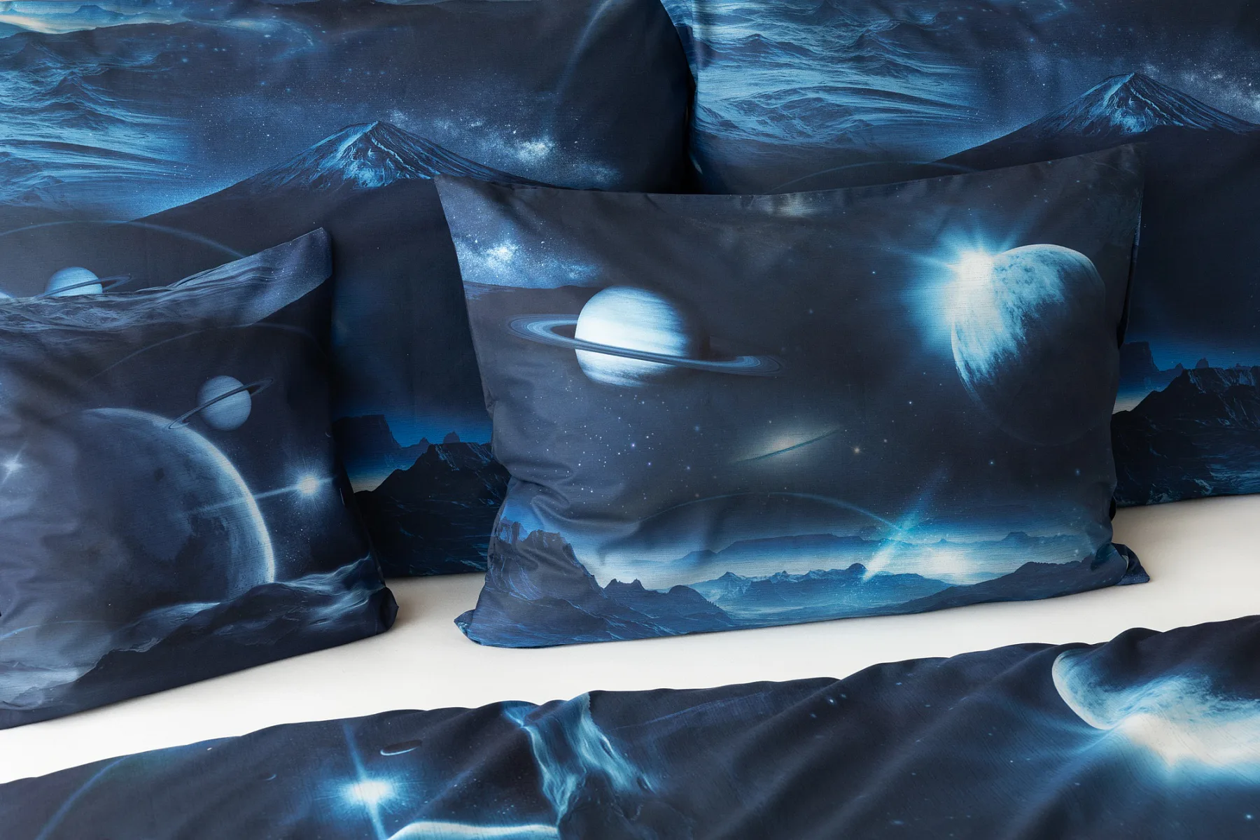 Objevte tajemství vesmíru přímo z vaší ložnice s hebkým bavlněným povlečením Galaxie. Tmavě modrý podklad zdobí motivy planet. Díky nejmodernějšímu digitálním tisku vyniká vzor v precizním detailu. Přeneste se do vesmíru každou noc a nechte své sny volně plynout mezi hvězdami.