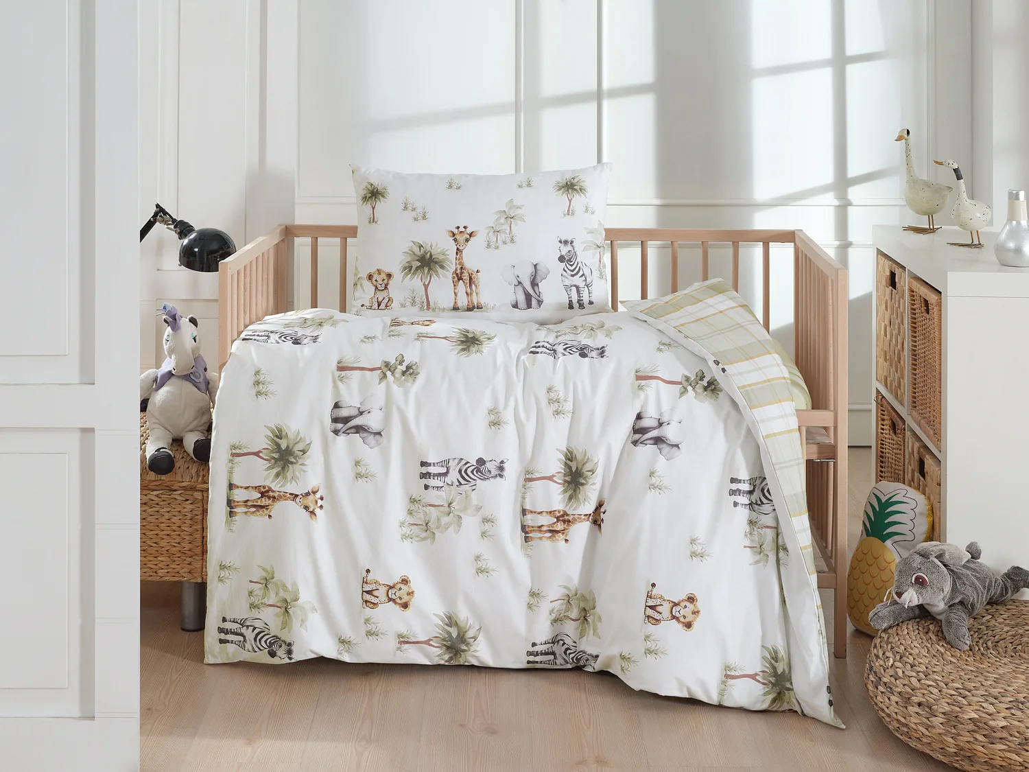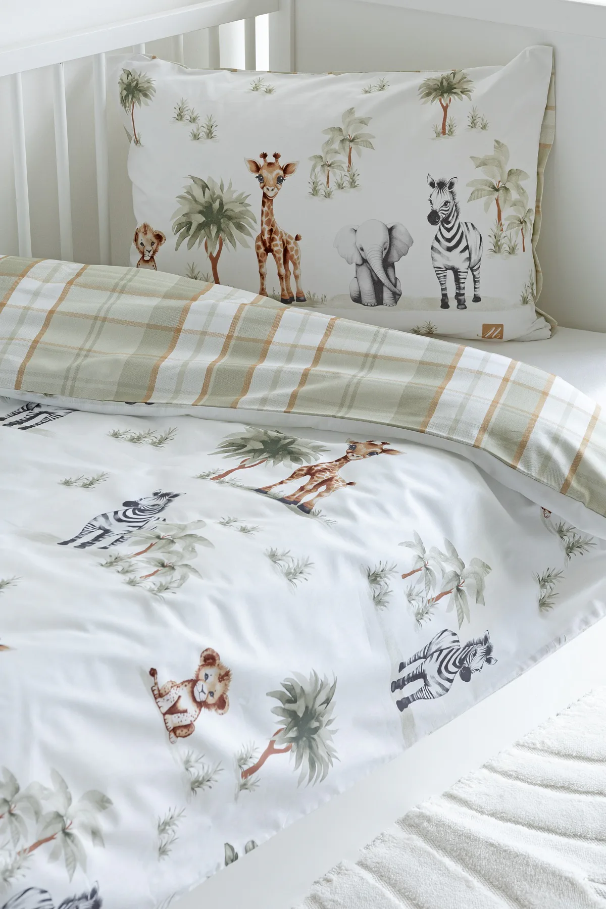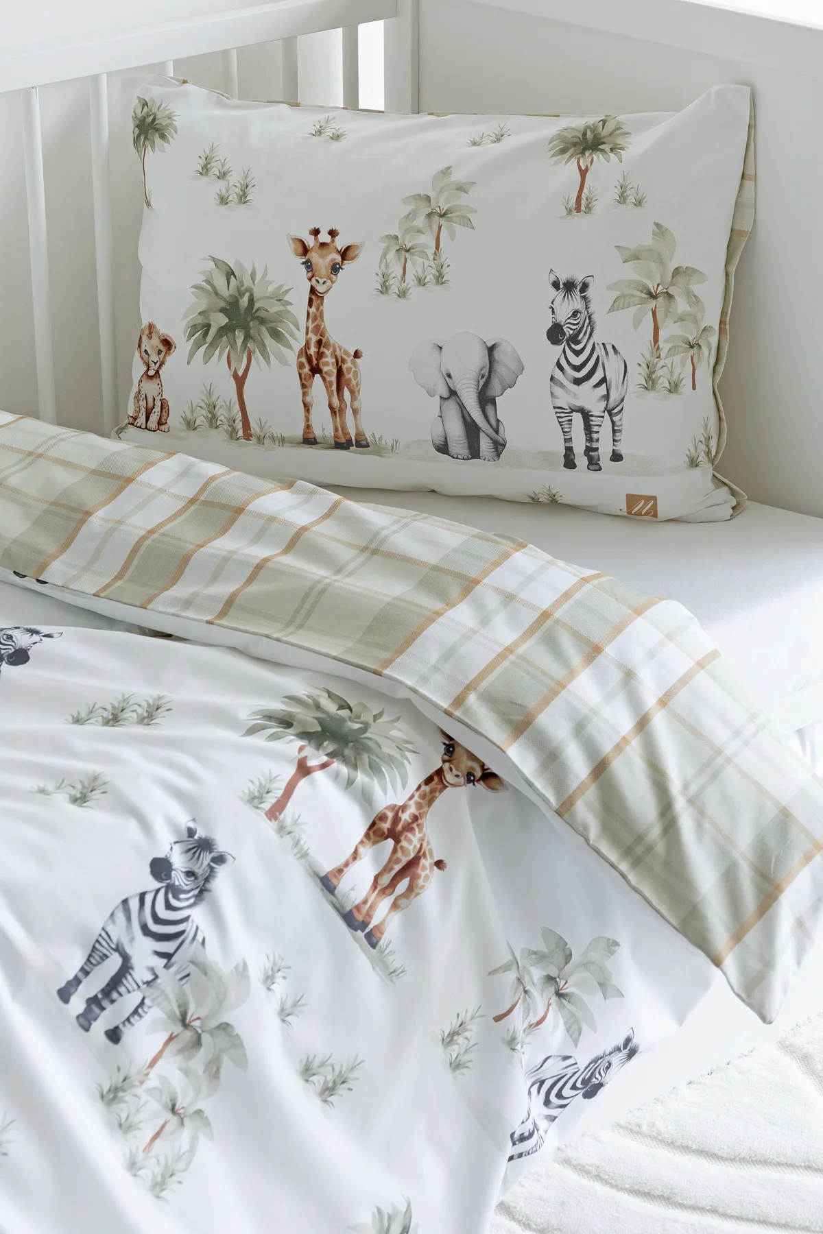 Povlak na polštář i na přikrývku zachycuje na vrchní straně motiv zvířátek, spodní stranu tvoří jemné zelenohnědé káro. Povlečení je vyrobeno ze 100% bavlny a je opatřeno praktickým zipovým uzávěrem.