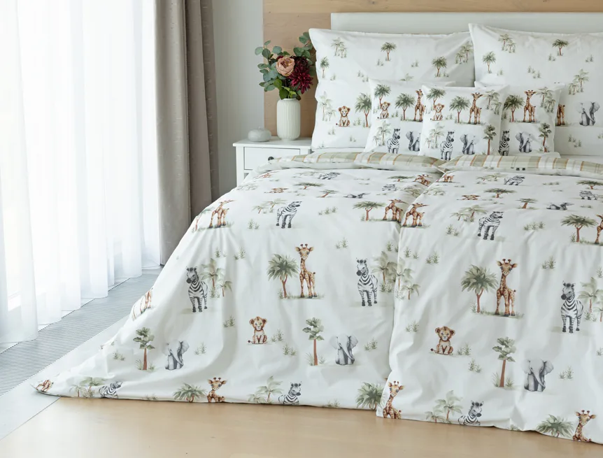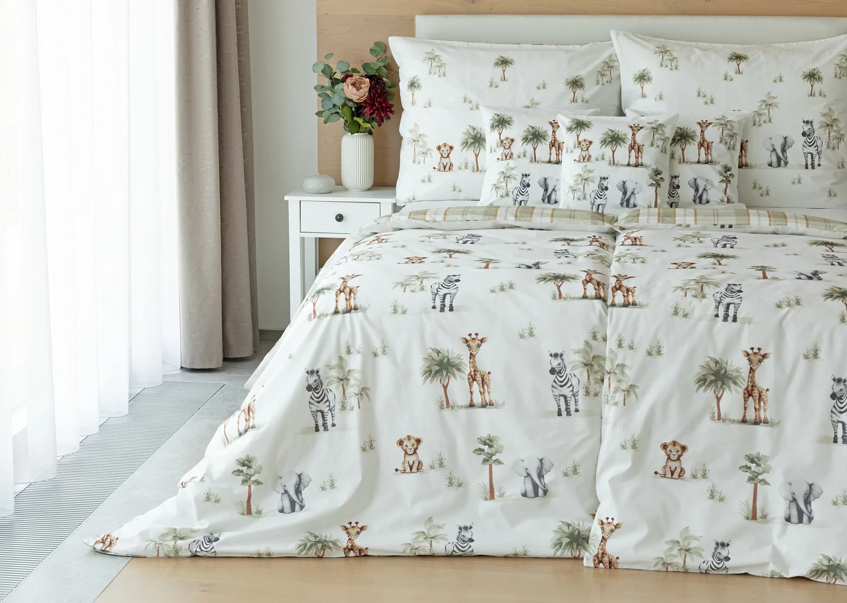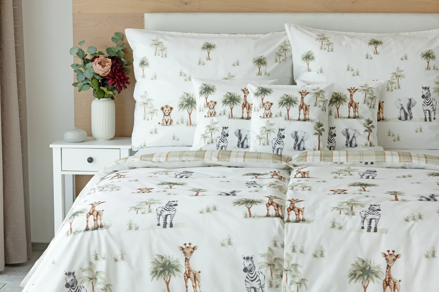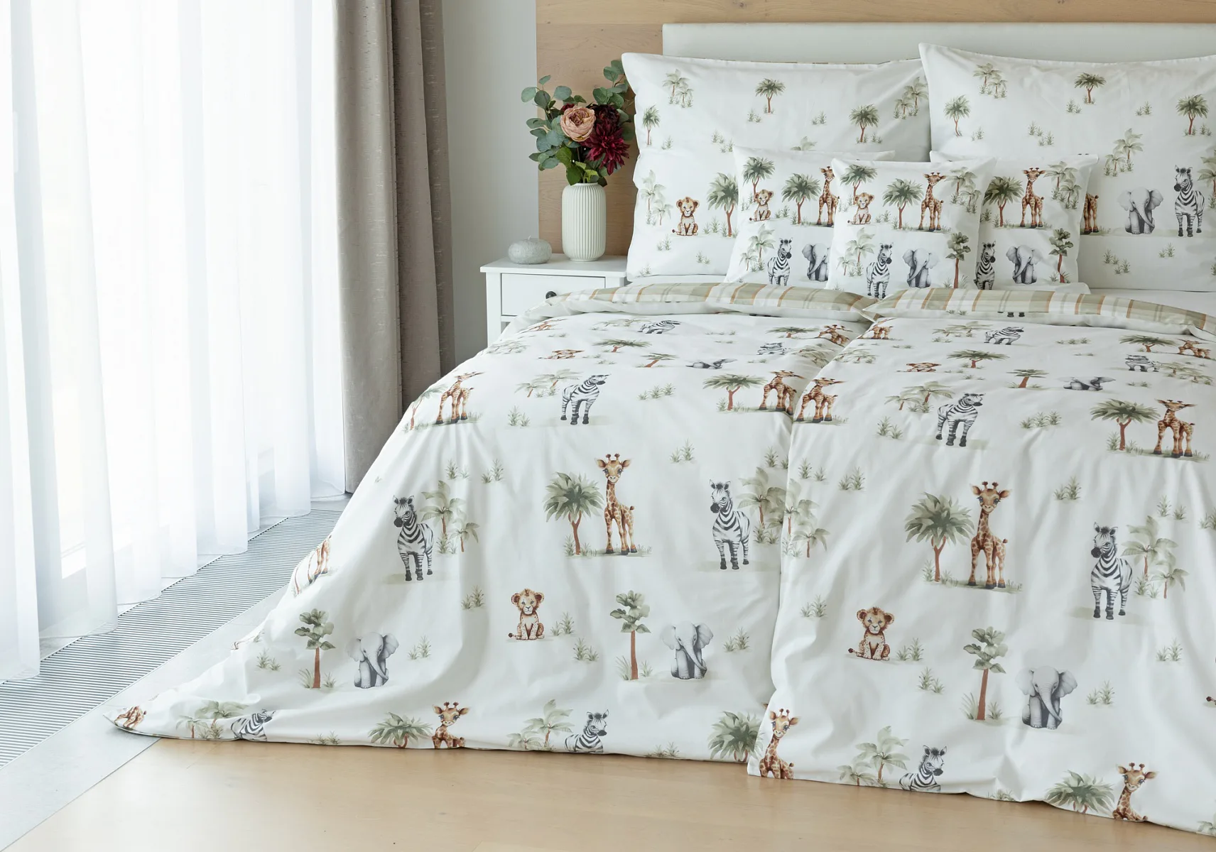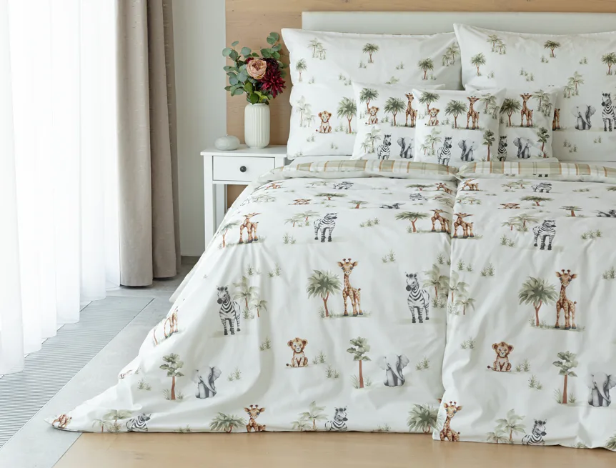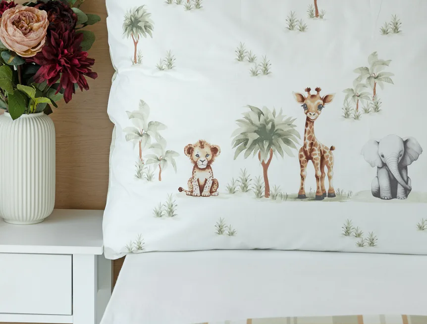 Proměňte dětský pokojíček v zábavné safari s bavlněným povlečením Happy! Roztomilý a hravý design je díky neutrální kombinaci barev vhodný pro děvčátka i chlapce. O jejich spokojený spánek se už postará hebká prvotřídní bavlna.