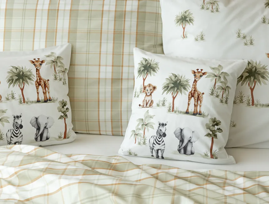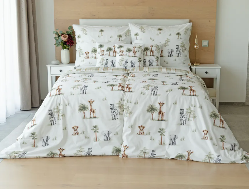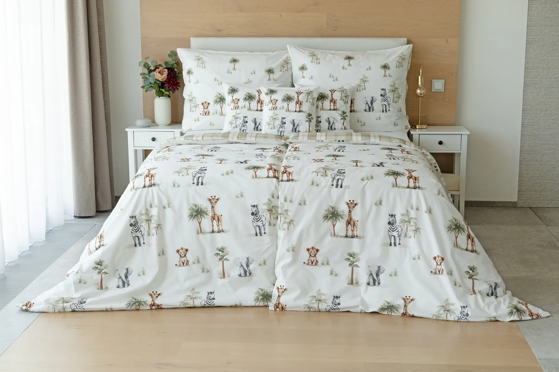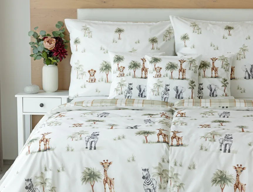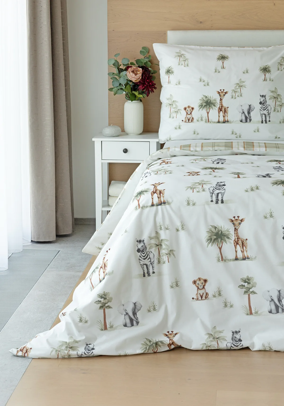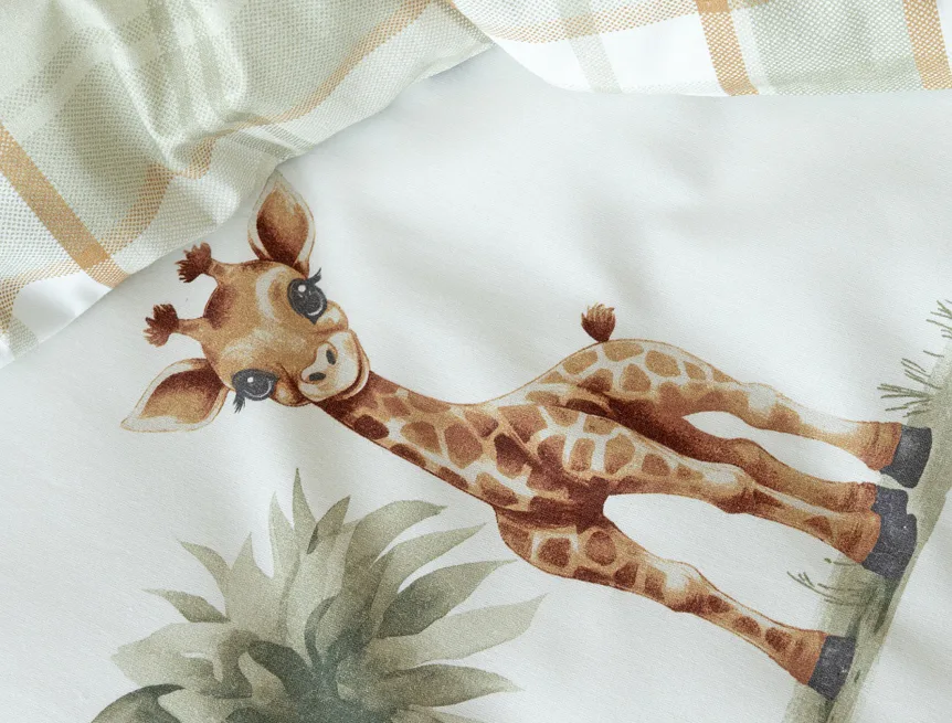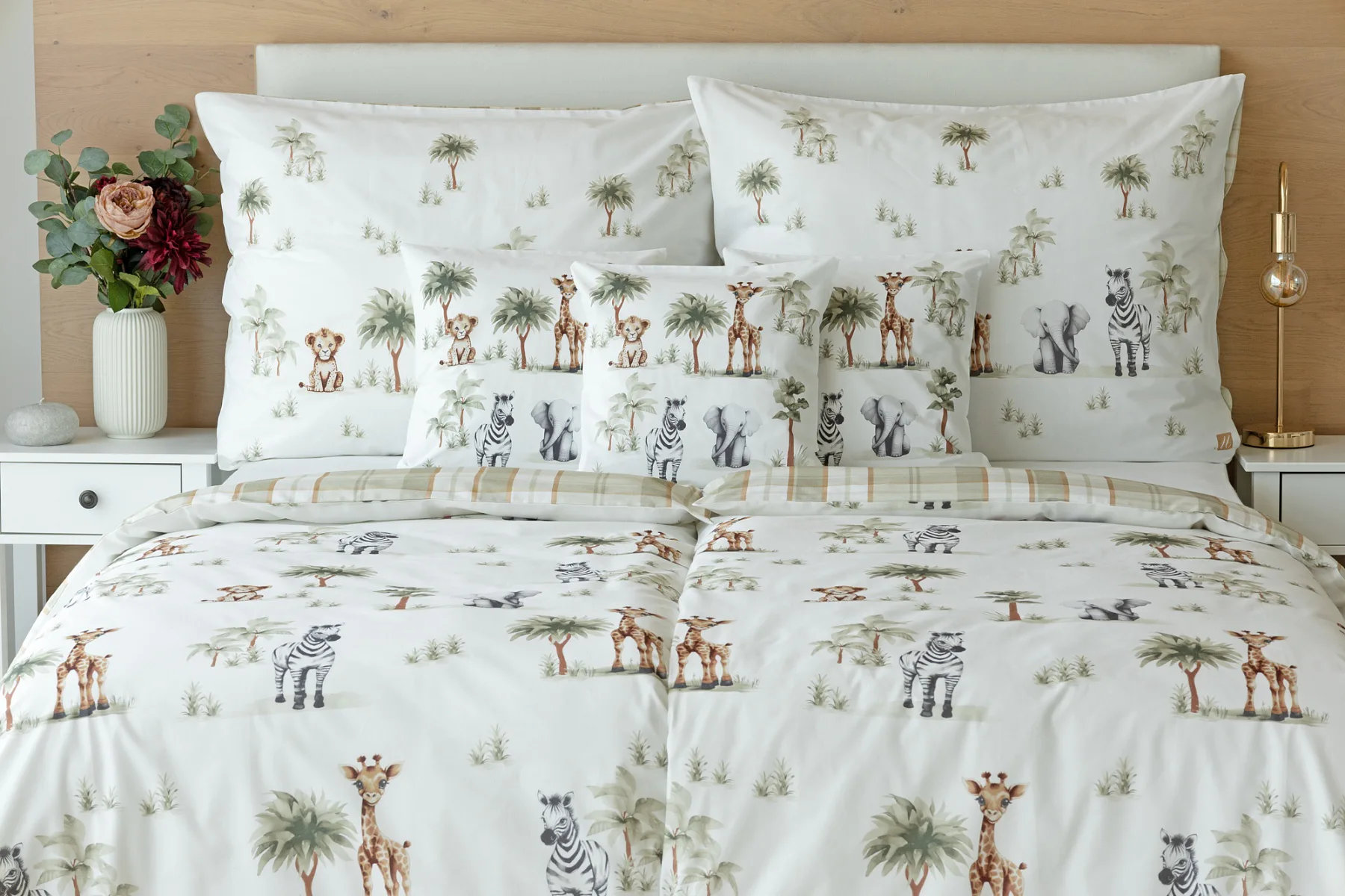 Proměňte dětský pokojíček v zábavné safari s bavlněným povlečením Happy! Roztomilý a hravý design je díky neutrální kombinaci barev vhodný pro děvčátka i chlapce. O jejich spokojený spánek se už postará hebká prvotřídní bavlna.