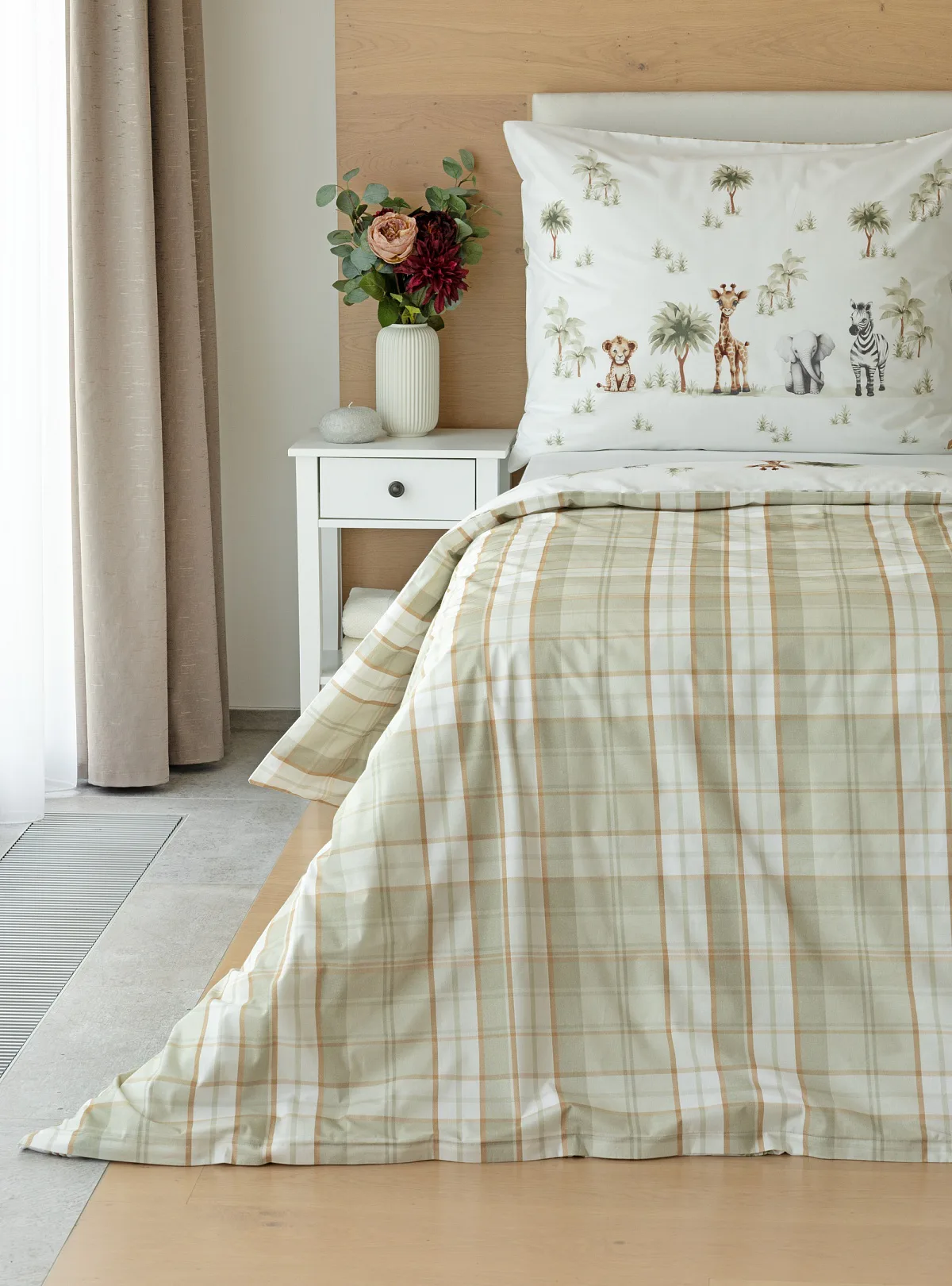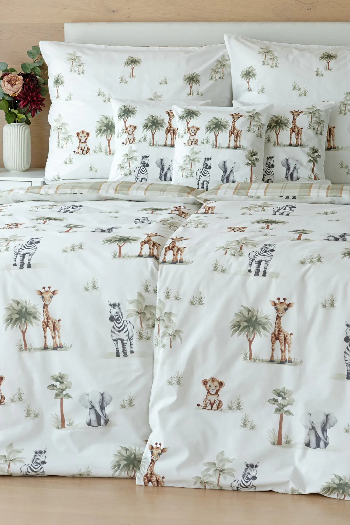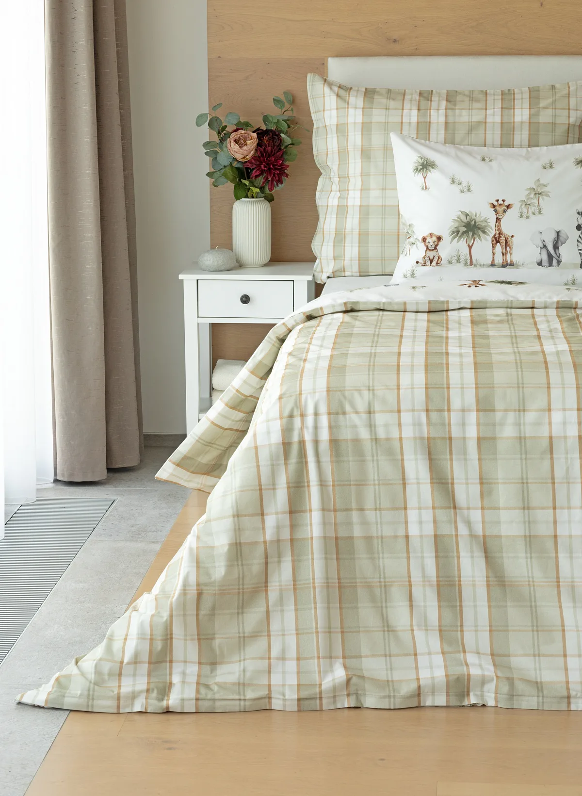 Povlak na polštář i na přikrývku zachycuje na vrchní straně motiv zvířátek, spodní stranu tvoří jemné zelenohnědé káro. Povlečení je vyrobeno ze 100% bavlny a je opatřeno praktickým zipovým uzávěrem.