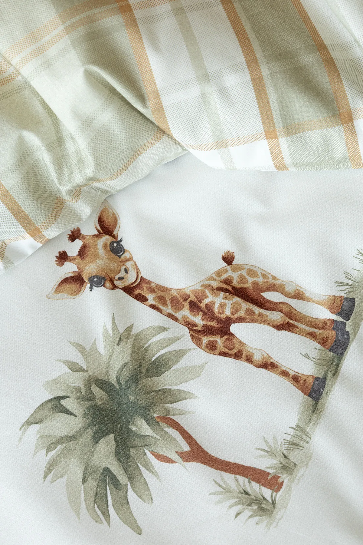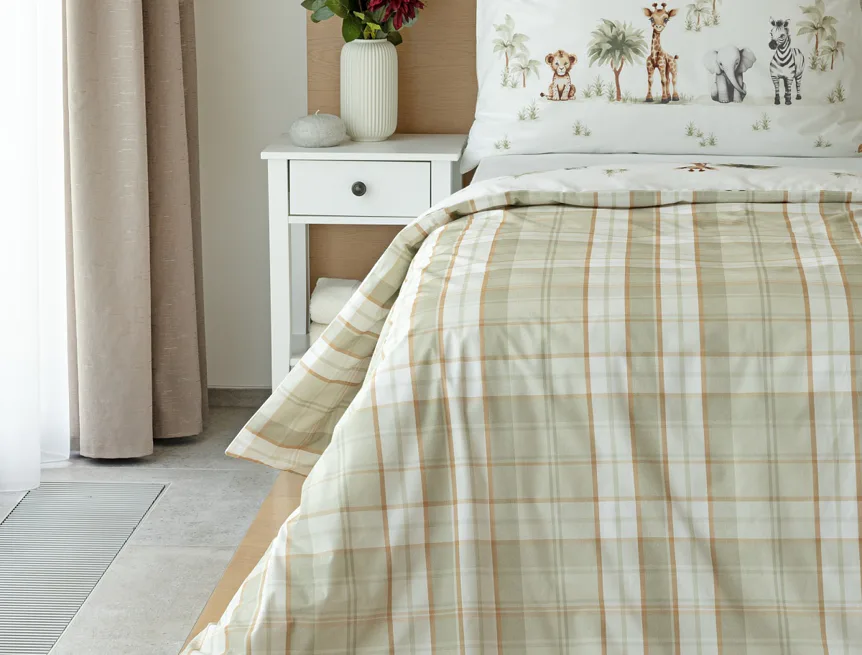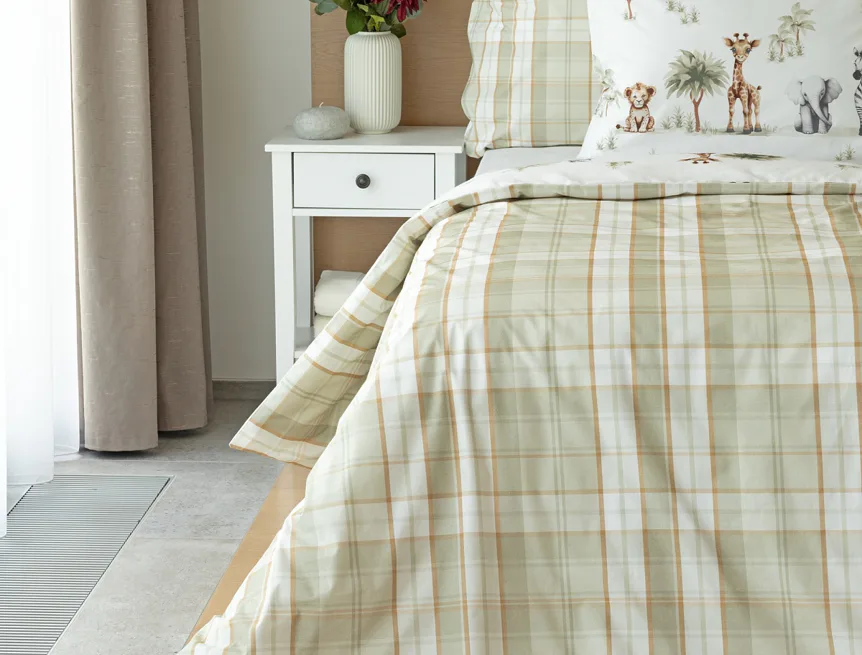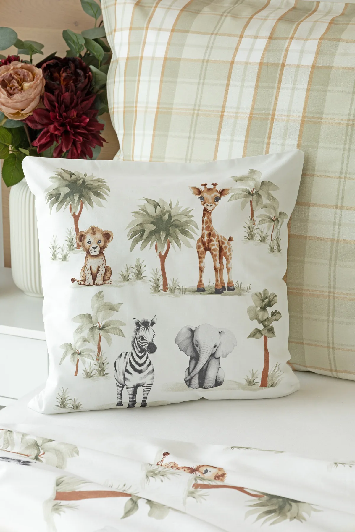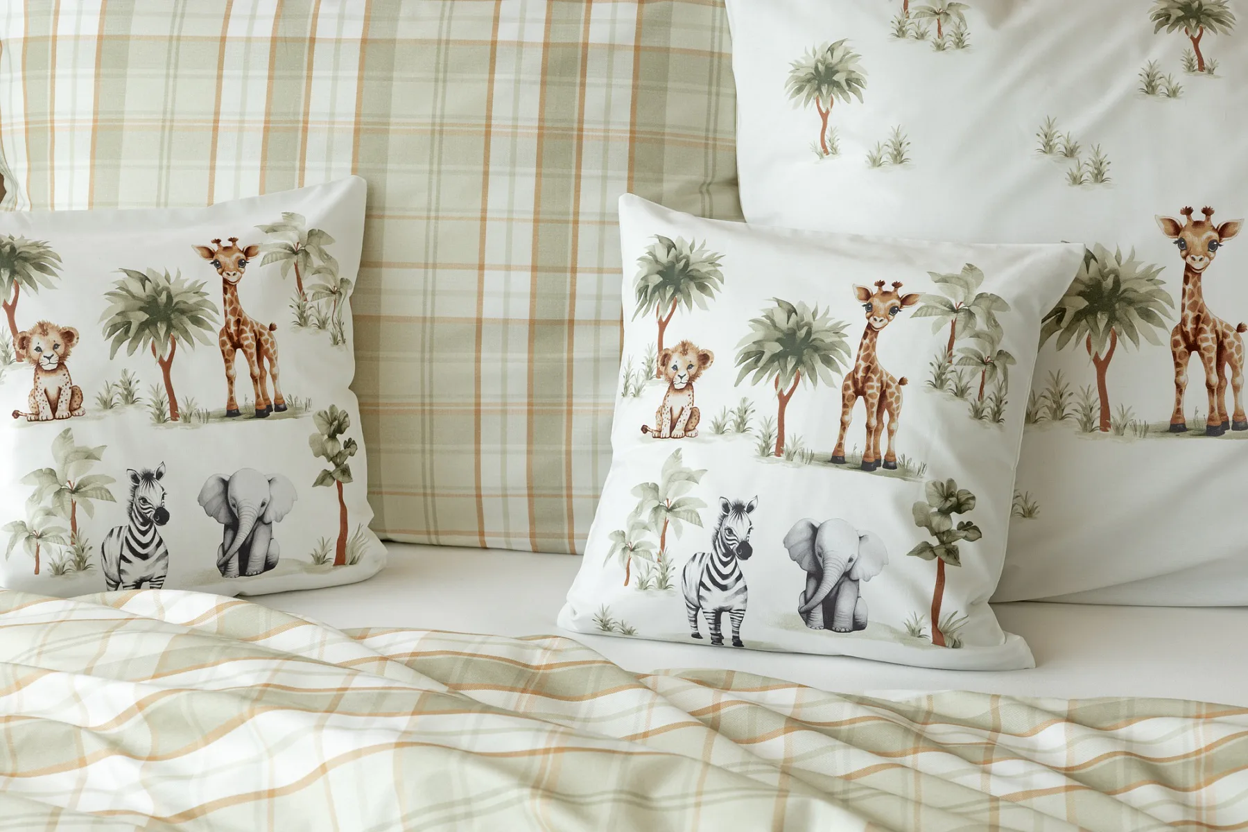 Povlak na polštář i na přikrývku zachycuje na vrchní straně motiv zvířátek, spodní stranu tvoří jemné zelenohnědé káro. Povlečení je vyrobeno ze 100% bavlny a je opatřeno praktickým zipovým uzávěrem.
