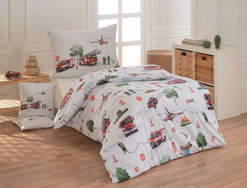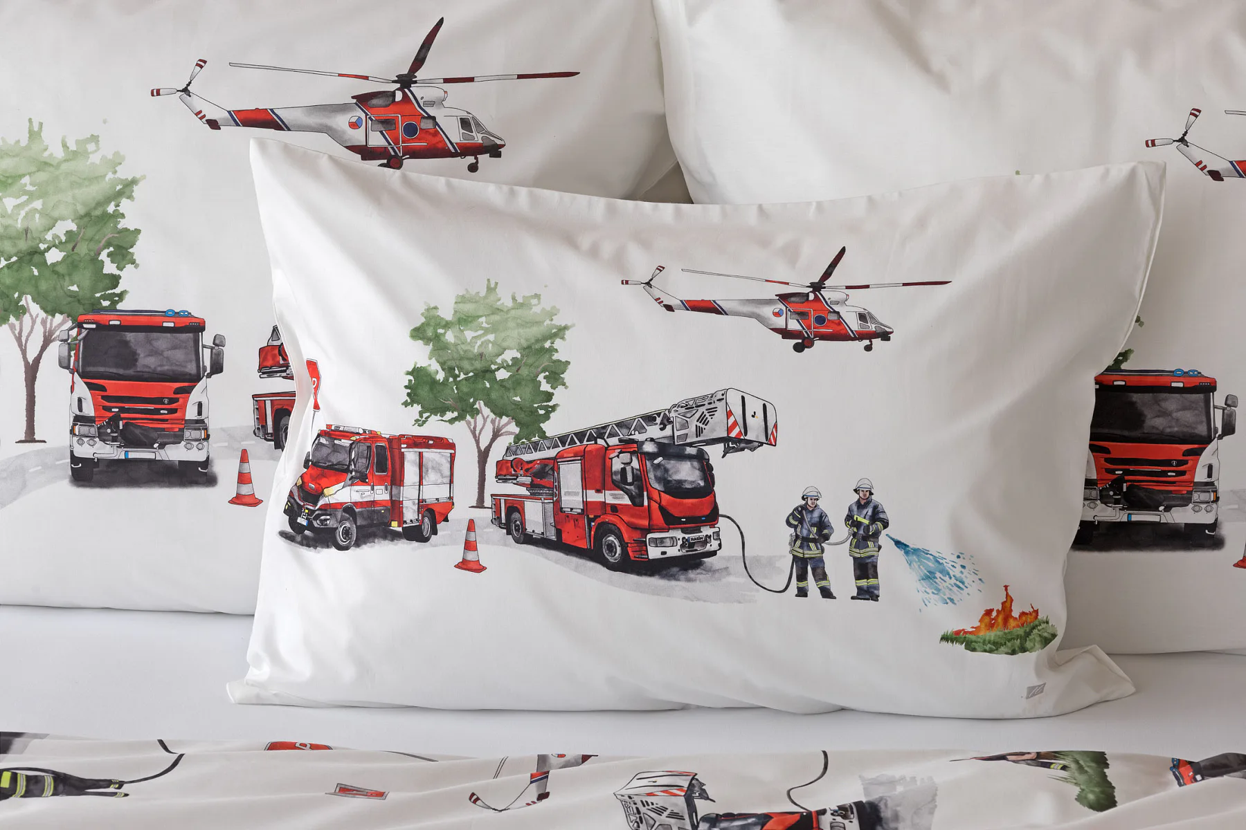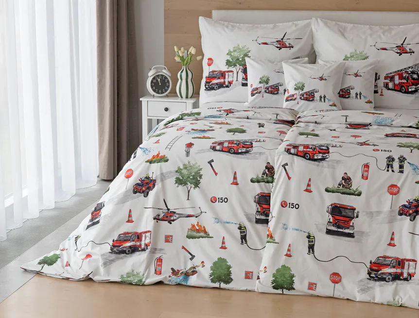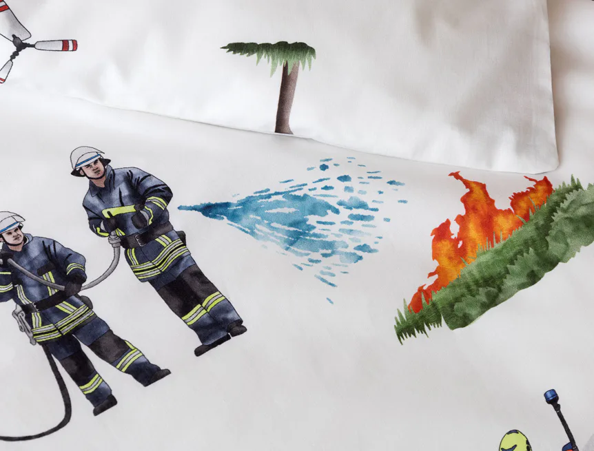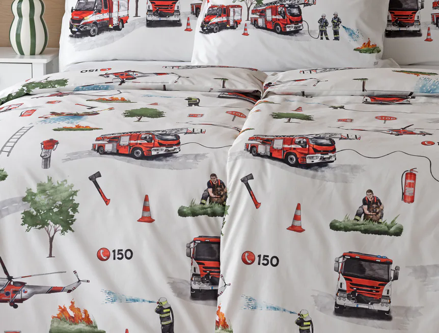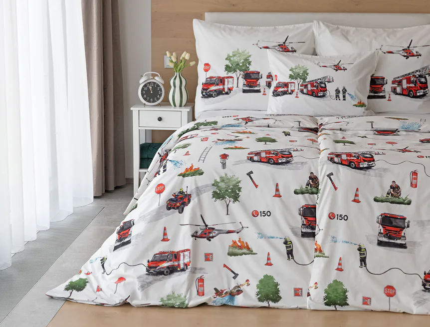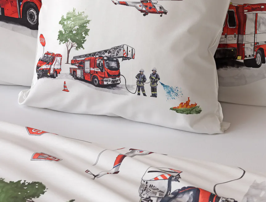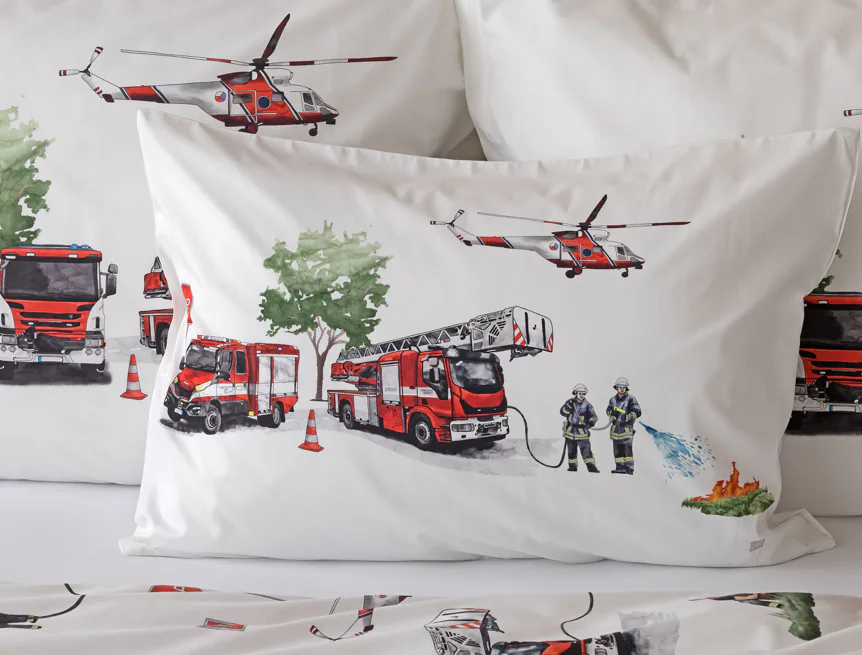Dětské povlečení Hasiči s motivy hasičské techniky potěší všechny malé milovníky záchranářských dobrodružství. Na bílém podkladu ožívají realistické ilustrace hasičských aut, vrtulníku, čtyřkolky i požárníků v akci. Dynamický motiv doplňují dopravní značky, kužely a další detaily, které vytvářejí hravou atmosféru. Zatímco malí záchranáři sní o dobrodružstvích, o jejich spokojený spánek se postará hebká prvotřídní bavlna.
