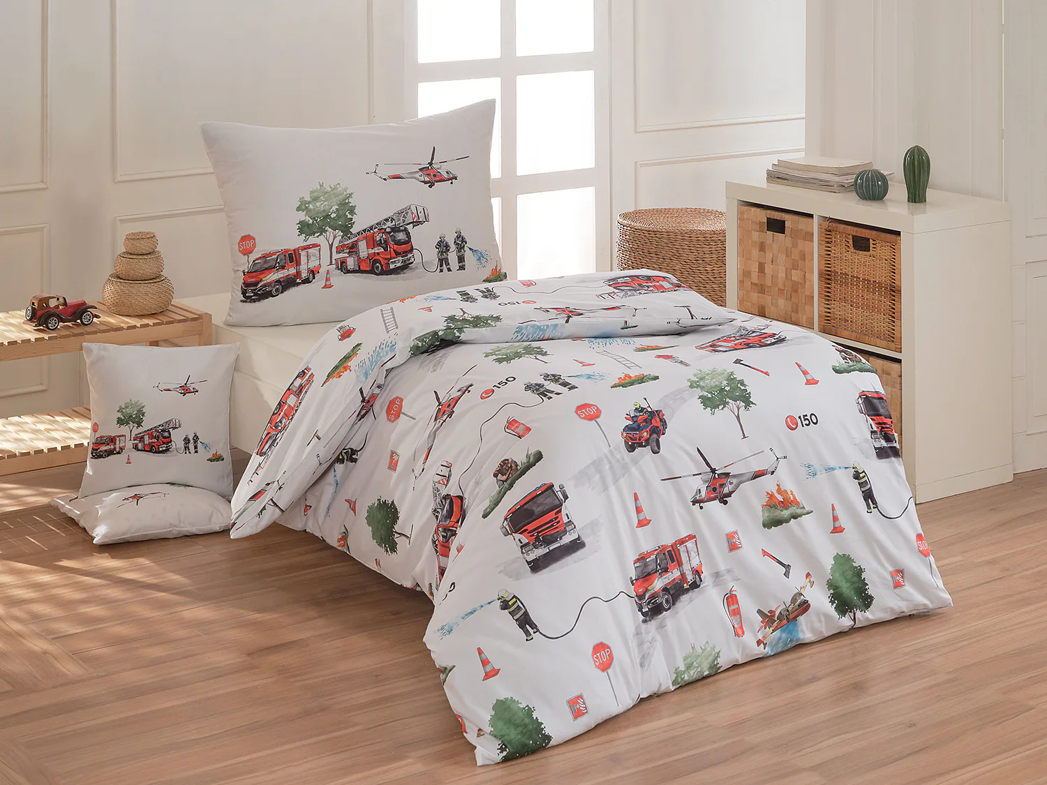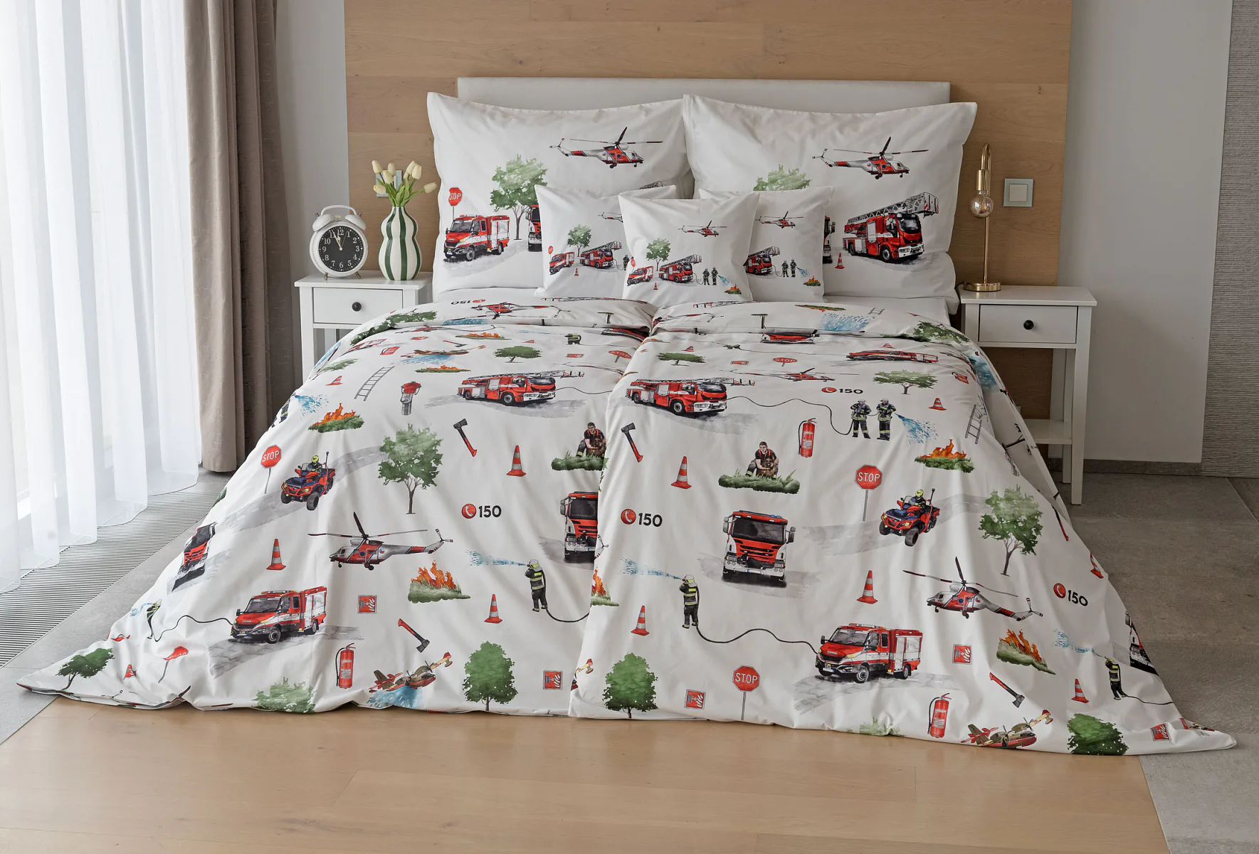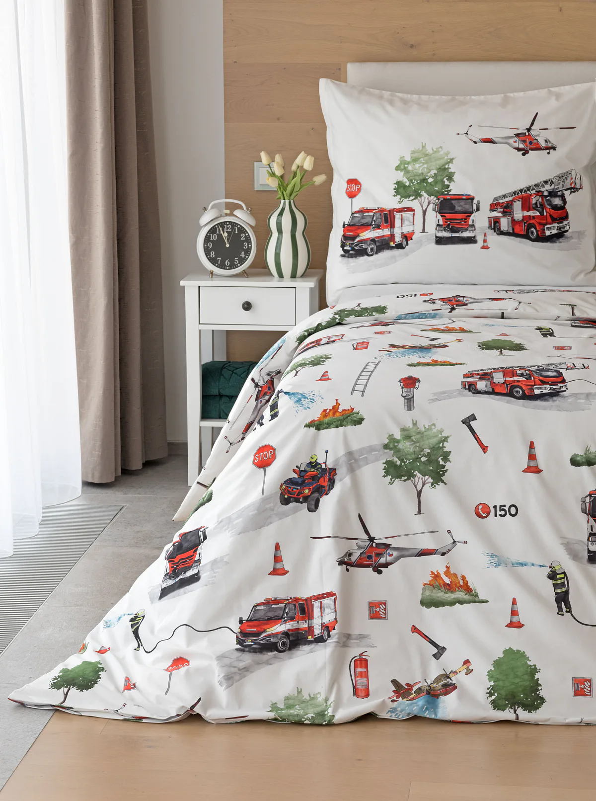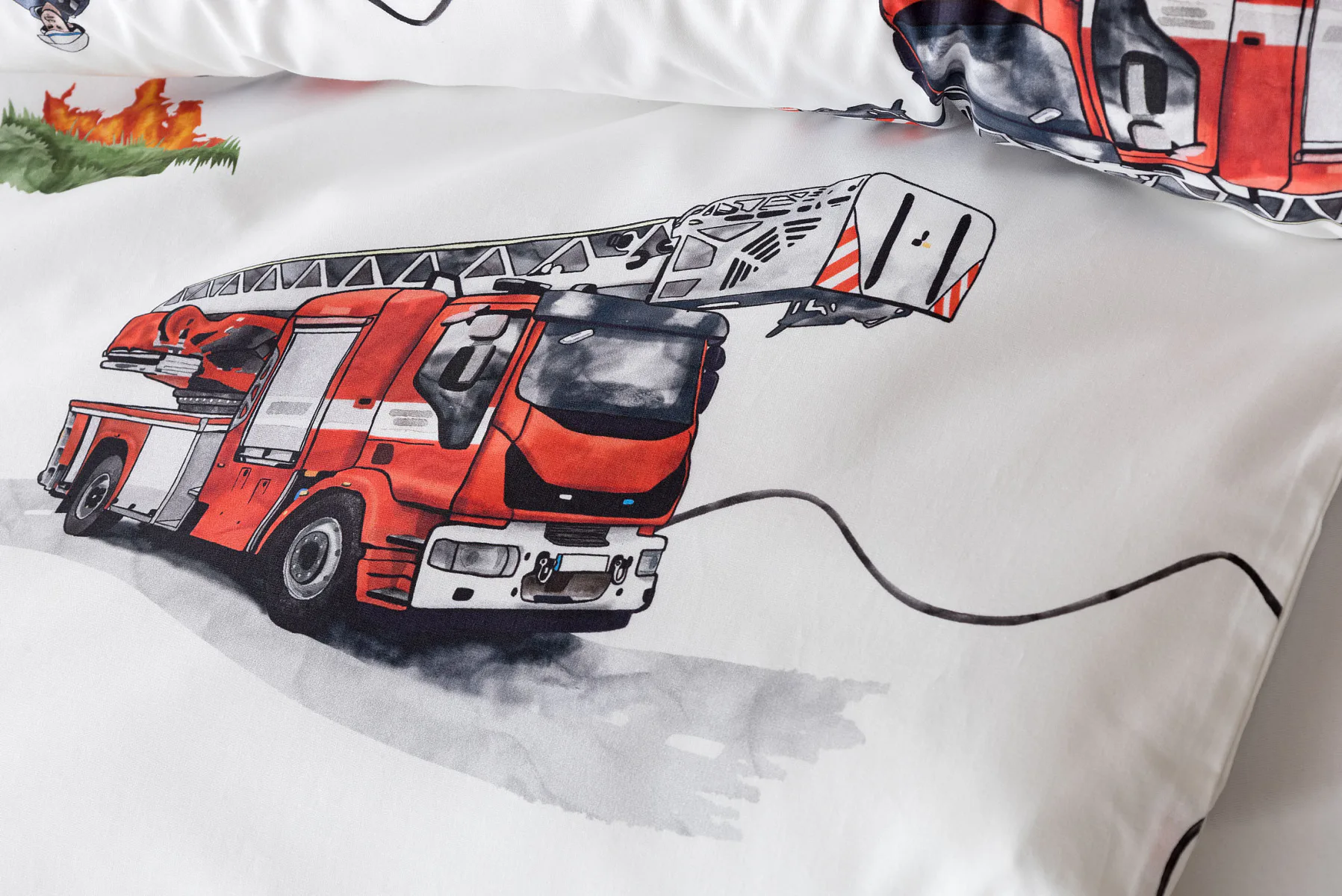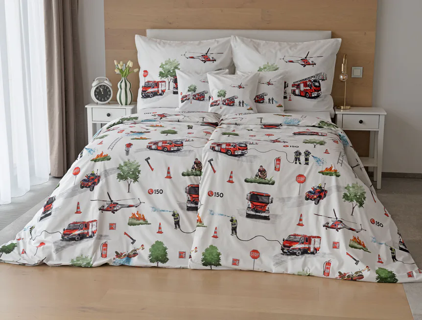 Dětské povlečení Hasiči s motivy hasičské techniky potěší všechny malé milovníky záchranářských dobrodružství. Na bílém podkladu ožívají realistické ilustrace hasičských aut, vrtulníku, čtyřkolky i požárníků v akci. Dynamický motiv doplňují dopravní značky, kužely a další detaily, které vytvářejí hravou atmosféru. Zatímco malí záchranáři sní o dobrodružstvích, o jejich spokojený spánek se postará hebká prvotřídní bavlna.