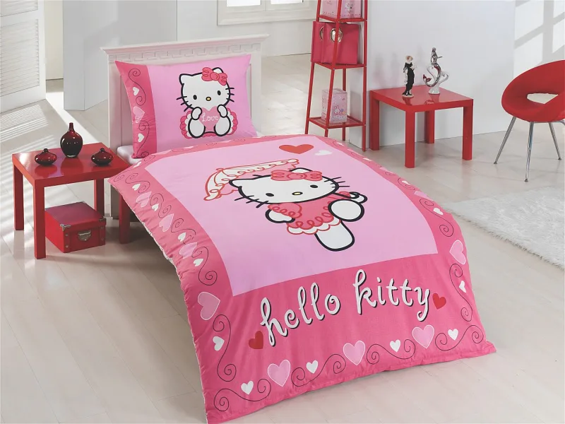 Roztomilé růžové dětské povlečení s obrázky kočičky Kitty a srdíček si vaše holčička zamiluje. Její oblíbená kočička ji bude každou noc uspávat a přinášet sladké sny.