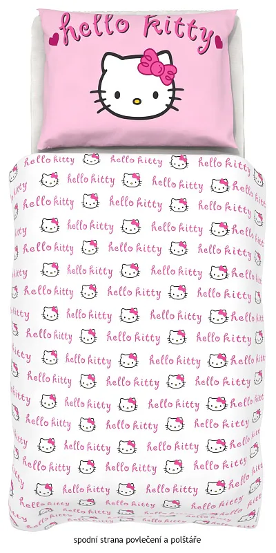 Vrchní strana povlaku na přikrývku odpovídá fotografii, spodní strana je pokryta růžovým textem "hello kitty" a hlavičkami kočičky na bílém podkladu. Povlak na polštář vyobrazuje z jedné strany celou Kitty a z druhé jen hlavu s nápisem.