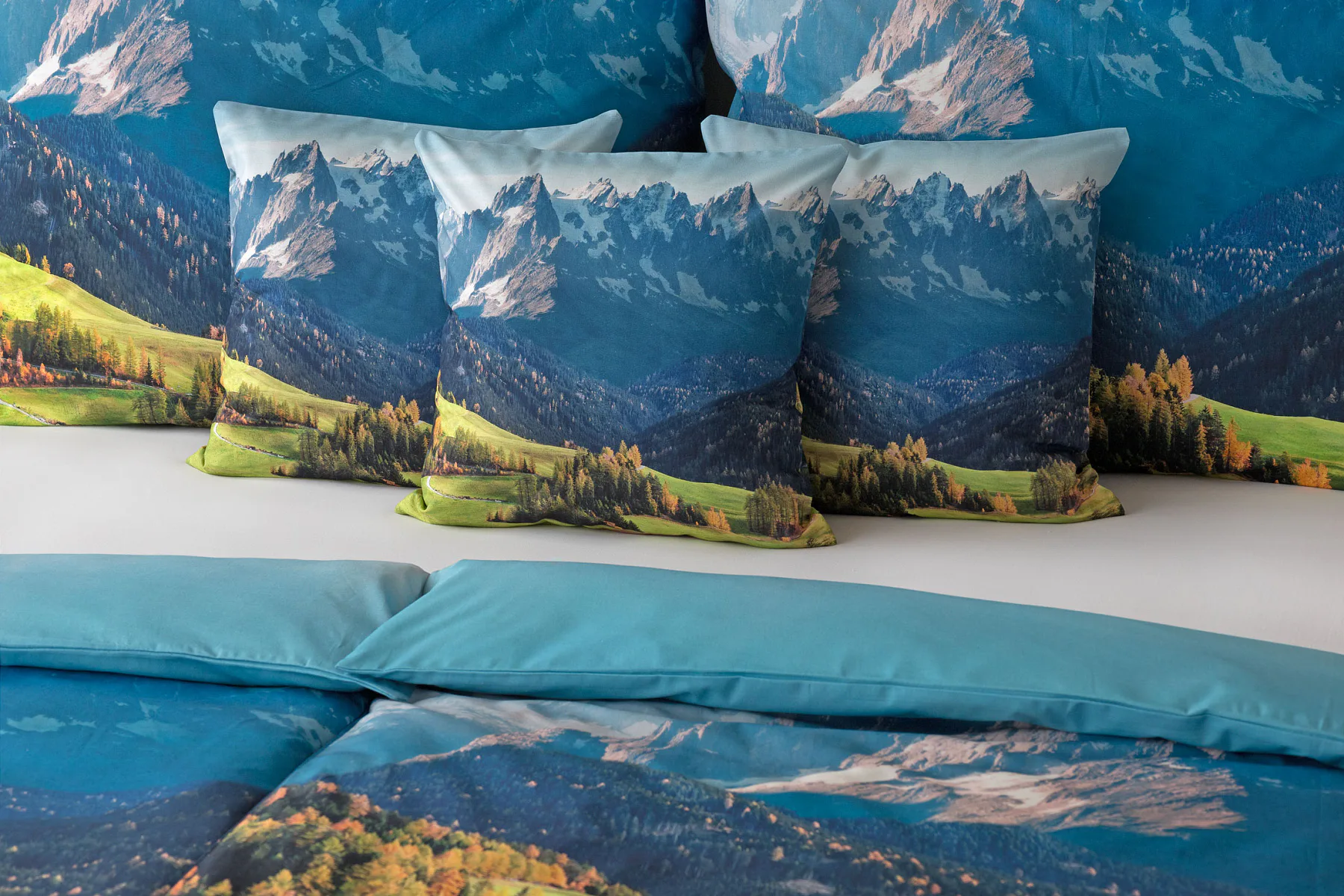 Ložní povlečení Hory s panoramatickým motivem horské krajiny vnese do vaší ložnice pocit svobody, klidu a propojení s přírodou. Rozkvetlé louky, zelené svahy a majestátní horské štíty vytvářejí harmonickou scenérii. Syté barvy a detailní tisk dodávají povlečení přirozený charakter, díky kterému se stane dominantou interiéru. Ideální volba pro milovníky přírody, hor a cestování. Dopřejte si každý večer pocit, jako byste usínali uprostřed rozkvetlé horské krajiny.
