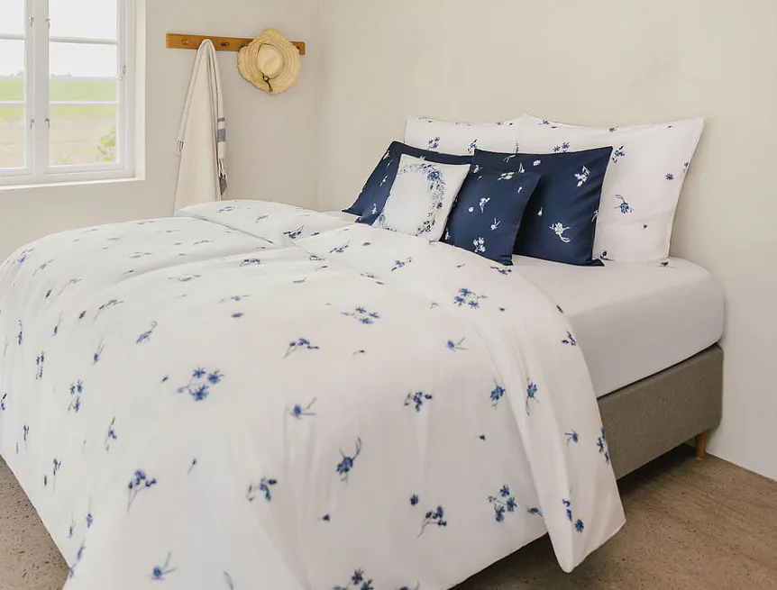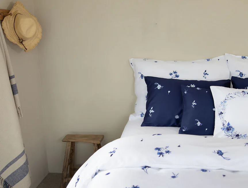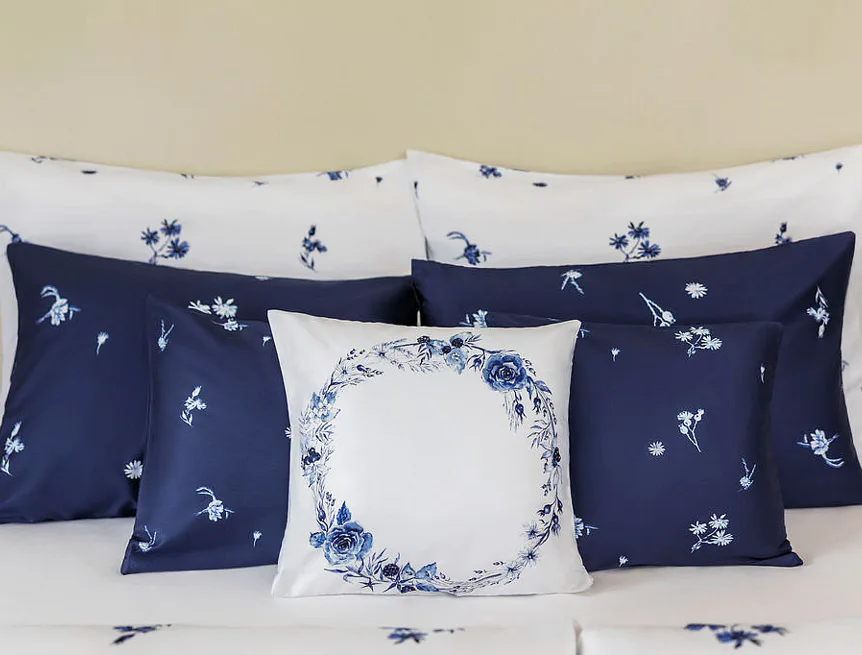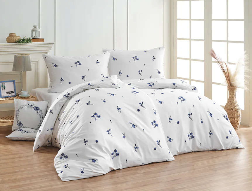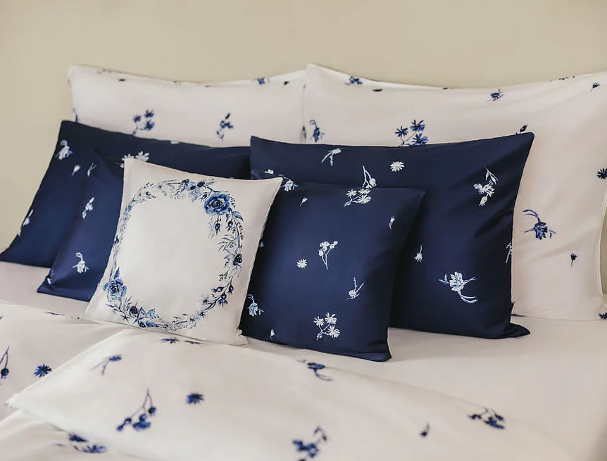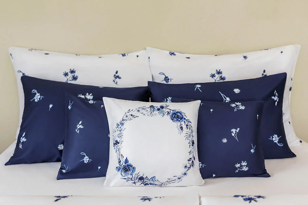 Perte naruby do 60 °C (bílé a modré povlaky zvlášť), sušte při nižší teplotě, žehlete po rubu.